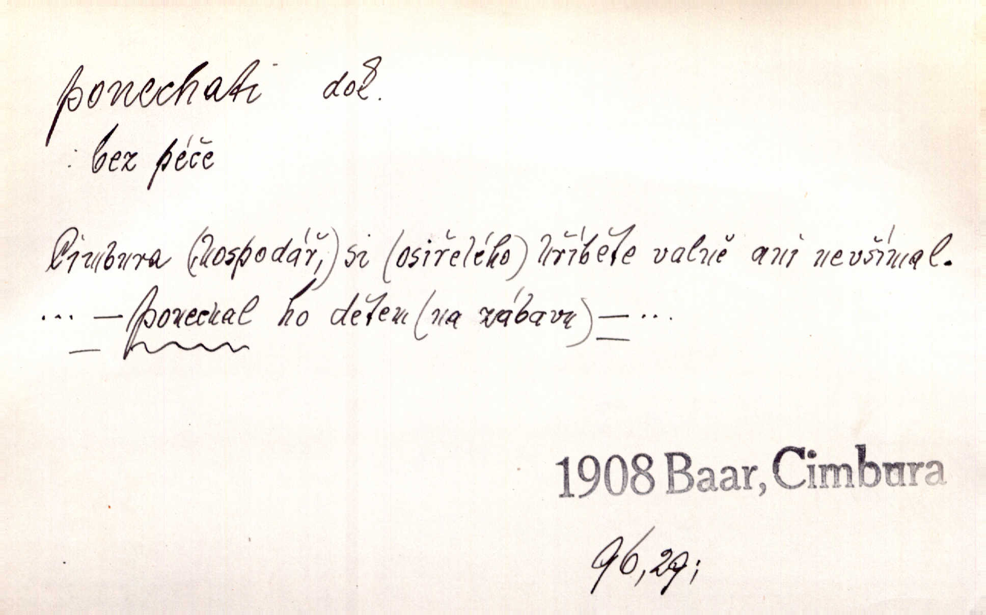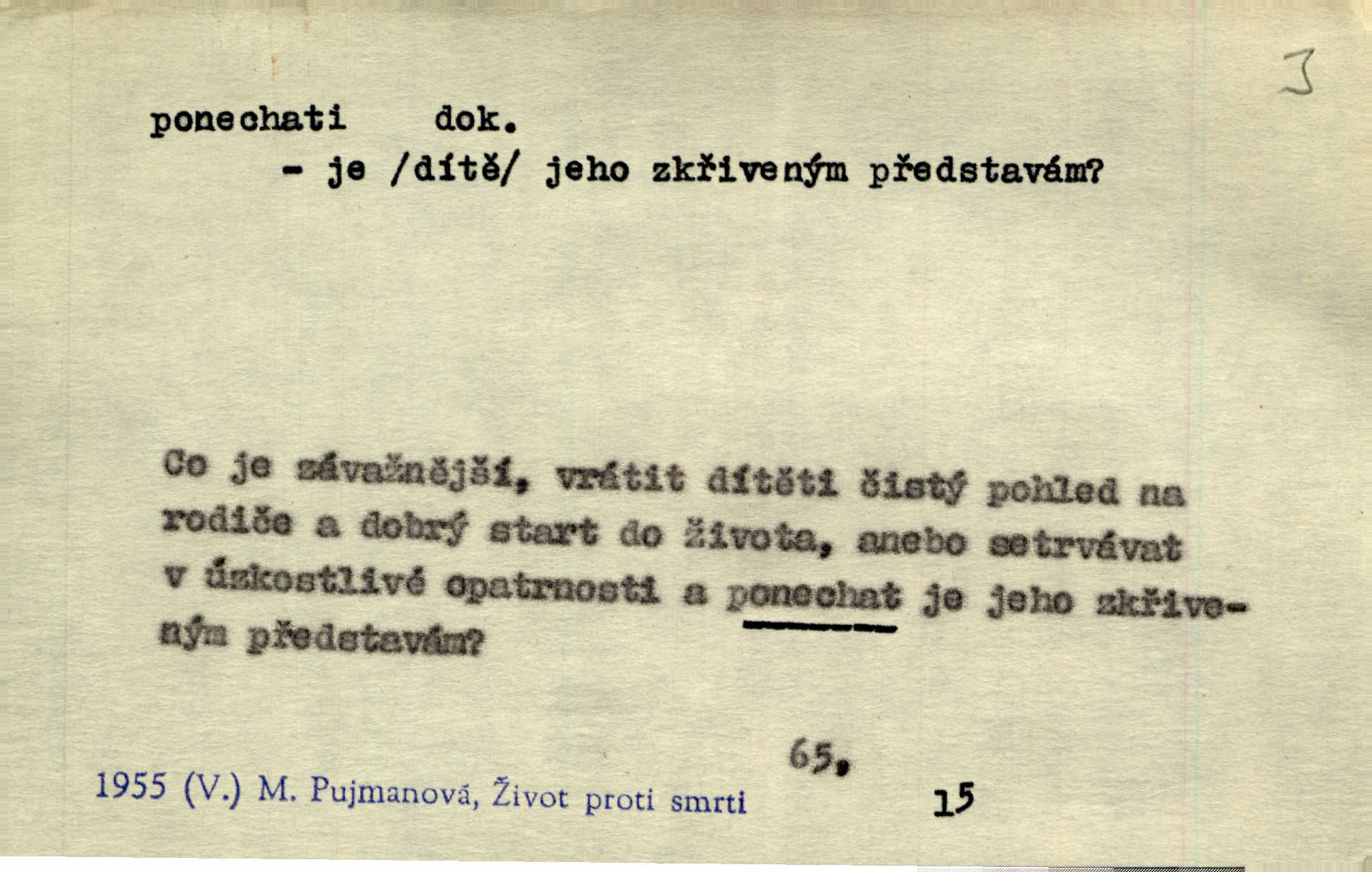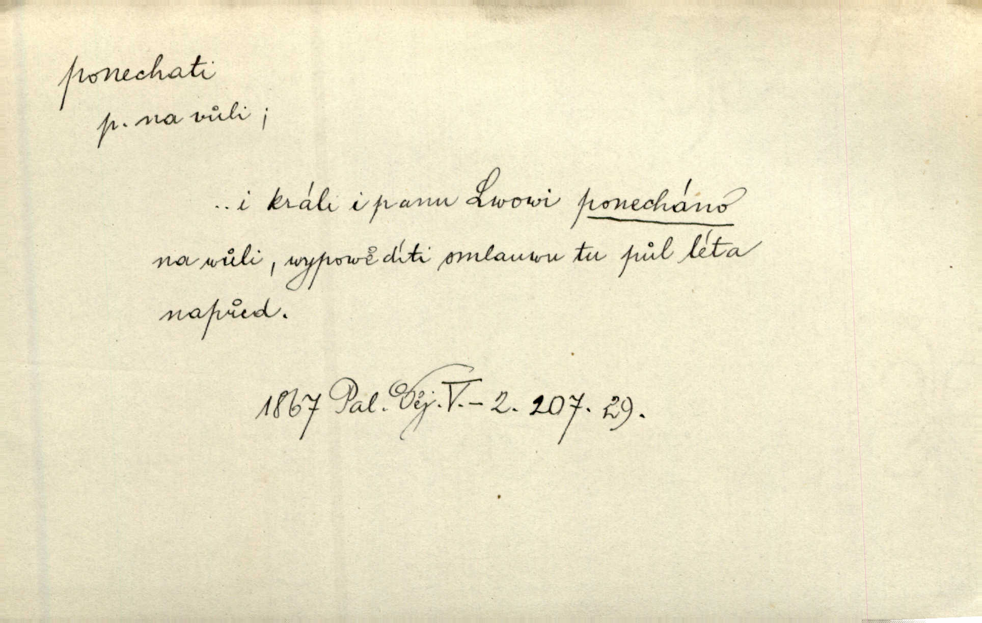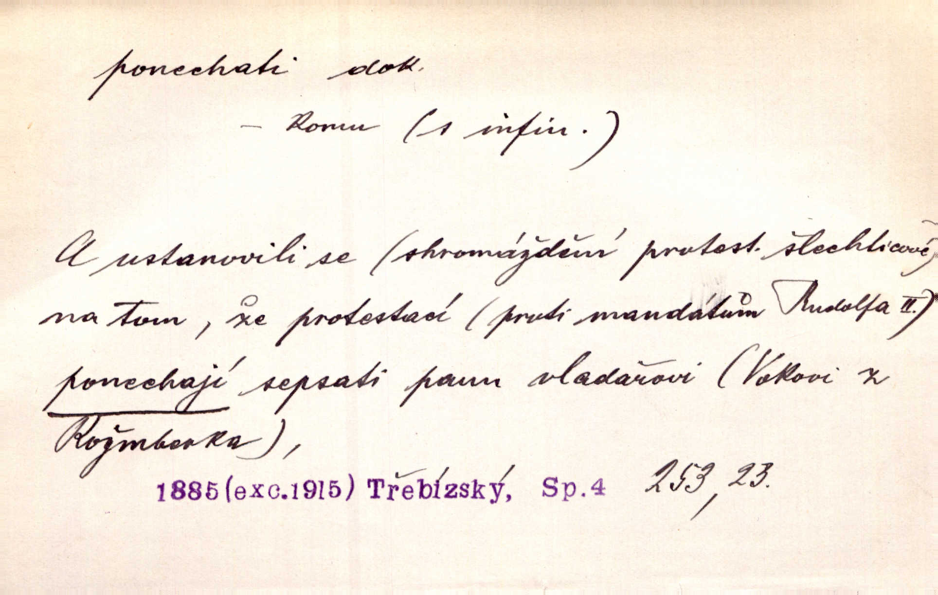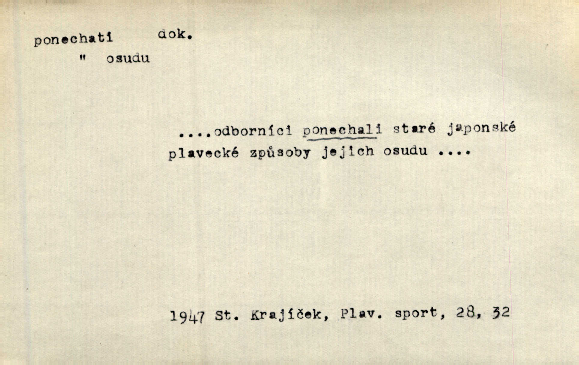 - ponechati dok. zůstaviti, dopustiti, nezabrániti. Zdálo se, že nás [teta] ponechala úplně našemu osudu. Obr. živ. Nejlépe bude, ponechají-li věcem průběh přirozený. Svět. Vyrval se z náruče její, ponechav ubohou žalu. Choch. Dospěv středu řeky, ponechal loďku proudu. Čap. Ch. Bylť nyní svoboden, nevázán, sám sobě ponechán. Pfleg. Dcerušku na chvíli ponechala samé sobě. Prav. Ostatní zatím ponecháni na pokoji. Hál. Ponechal jsem mu na vůli, zastaviti se, kde se mu bude líbiti. Prav. Dnes jen netrpělivě [matka] hlavu od něho odvrátila a ponechala mu slovo poslední. Svět. Když jí řekli, že ji nemohou ponechat na noc, div se nerozplakala. R. Svob. D (koho kde) podržeti někoho v dřívějším stavu, neodstraniti někoho odněkud. Jsem vám velmi povděčen, že jste mne ve službě ponechala. Pfleg. Synové ponecháni zatím ve službě. Jir. Pro zločin veřejného násilí ponechán ve vyšetřování. Herb. Nevíš, jak dlouho tě Pán Bůh zde na světě ponechá. Prav. Pertolta z Valdštejna má [král] také zajmouti, ale na živu jej ponechati. Pekárek. Vždycky užitek my větší máme, když v hlouposti ho [lid] trochu ponecháme. Ner. D (komu co, co kde) neodejmouti někomu něco, nezbaviti někoho něčeho, neodkliditi něco odněkud. Dar ponechám mu, nezruším svůj slib. Zey. Všecko, co jí dal, také jí ponechal. Mrš. Zapraven poplatek za další ponechání hrobu. Herrm. Ve slovech cizích ponechání orthografie cizí čtenáře českého másti mohlo. Pal. Ve svém stolku ponechati může práce ještě nezralé. V. Mrš. V ruce nesla vrbový proutek zcela hladký, pouze na konci s chvostem ponechaného listí. Svob. Velmistru ponechána moc, rozsudek umírniti. Choch. Ponechala se obci samé péče o její vlastní záležitosti. Tomíč. D zůstaviti, zanechati. Minuly žně, hrozné pro něj žně, nebo všecko musil ponechat cizím lidem. Jir. Tu knížku mi tu ponechte, za několik dní si sem přijďte. Pfleg. Petr ponechal své ženě dům i pole, peníze však určil k rozdání chudým. Goll. Pro nedostatek místa musíme úvahu o provedení ponechati pro číslo budoucí. Zl. Praha. Což snad zamýšlíte ponechati pana Josefa doma? Pfleg. Možno i, že je působivým trestem, ponechati někoho v místnosti tmavé. Ner. Svolil ponechati věc do svého návratu do Prahy. Podl. Ponechala podezření své u sebe. Paleč. D přenechati, přepustiti. Nesmí ji [sedlák žeň] na trzích prodati, nýbrž vrchnosti ji ponechati za cenu, kterou si sama určí. Svět. Markrabí zavřel se do pevného Znojma a ponechal otevřený kraj Čechům. Ritt. „Začni tedy a ponech úsudek nám,“ doložil doktor. Svob. To ponecháme učencům, jsou-li „kamna“ původní, naše jméno. Jir. Byla tak vůle bohů… Pomstu ponechte jim. Třeb. D ponechati si (co) podržeti u sebe něco, neodložiti něco, nevzdati se něčeho. Nemoha dohlížeti na hospodářství, ponechal si jen několik mír pole na setí. Herb. Mlynář si honitbu ponechal, ale sám stříleti neuměl. Svob. Dlouho vybírala [šátky] ptajíc se, který si má ponechati. Rais. Není mi třeba věna, ponechte si vše. R. Svob. Ponechal si svůj úsudek o této žádosti pro sebe. Svět. Rozhodnutí si ponechala na příští neděli. Svob. Na konec ponechali si stavové poslední, největší trumf. Rez.