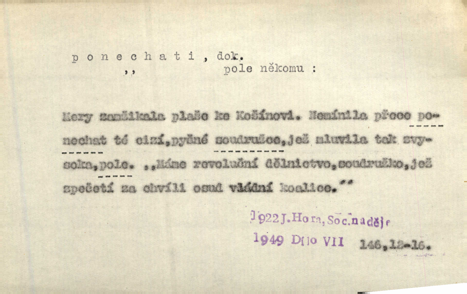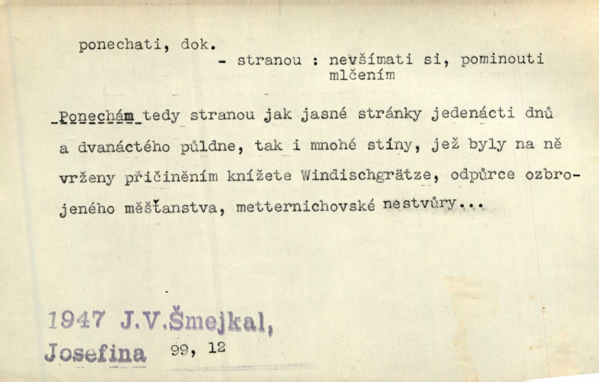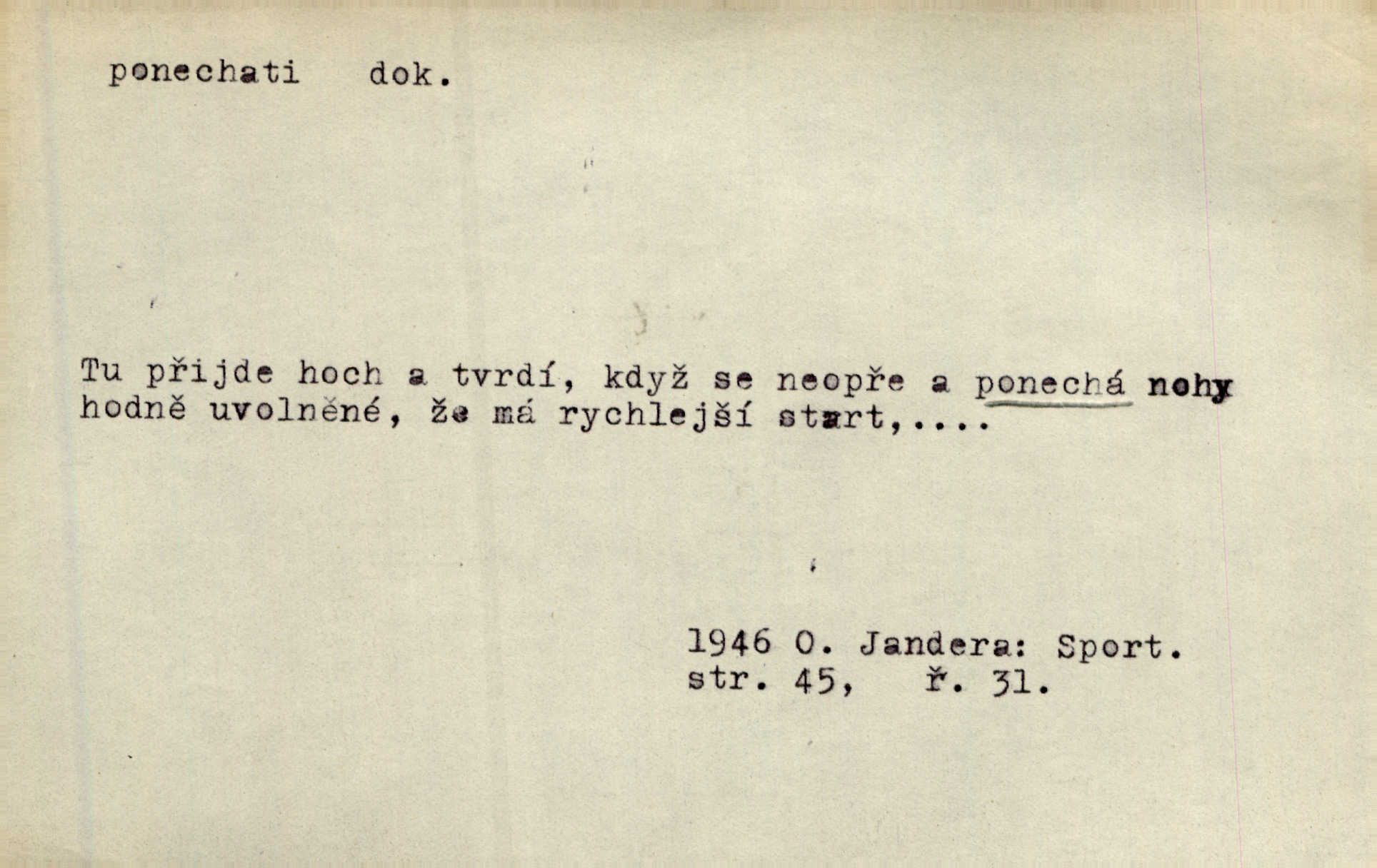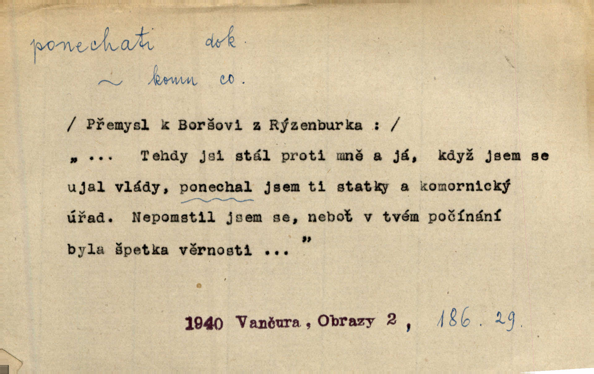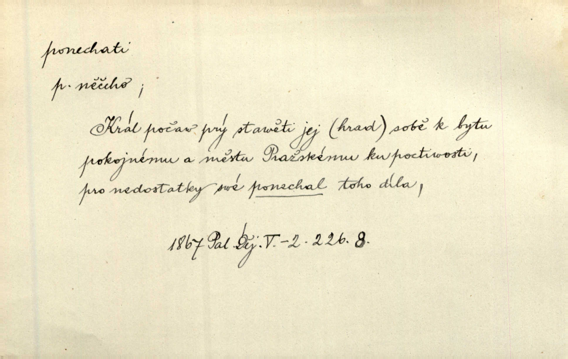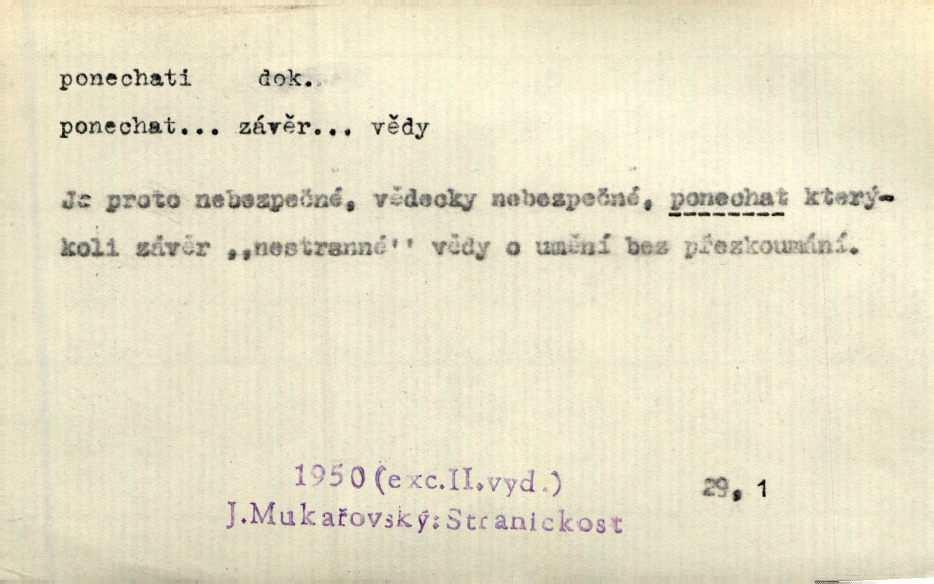- ponechati dok. zůstaviti, dopustiti, nezabrániti. Zdálo se, že nás [teta] ponechala úplně našemu osudu. Obr. živ. Nejlépe bude, ponechají-li věcem průběh přirozený. Svět. Vyrval se z náruče její, ponechav ubohou žalu. Choch. Dospěv středu řeky, ponechal loďku proudu. Čap. Ch. Bylť nyní svoboden, nevázán, sám sobě ponechán. Pfleg. Dcerušku na chvíli ponechala samé sobě. Prav. Ostatní zatím ponecháni na pokoji. Hál. Ponechal jsem mu na vůli, zastaviti se, kde se mu bude líbiti. Prav. Dnes jen netrpělivě [matka] hlavu od něho odvrátila a ponechala mu slovo poslední. Svět. Když jí řekli, že ji nemohou ponechat na noc, div se nerozplakala. R. Svob. D (koho kde) podržeti někoho v dřívějším stavu, neodstraniti někoho odněkud. Jsem vám velmi povděčen, že jste mne ve službě ponechala. Pfleg. Synové ponecháni zatím ve službě. Jir. Pro zločin veřejného násilí ponechán ve vyšetřování. Herb. Nevíš, jak dlouho tě Pán Bůh zde na světě ponechá. Prav. Pertolta z Valdštejna má [král] také zajmouti, ale na živu jej ponechati. Pekárek. Vždycky užitek my větší máme, když v hlouposti ho [lid] trochu ponecháme. Ner. D (komu co, co kde) neodejmouti někomu něco, nezbaviti někoho něčeho, neodkliditi něco odněkud. Dar ponechám mu, nezruším svůj slib. Zey. Všecko, co jí dal, také jí ponechal. Mrš. Zapraven poplatek za další ponechání hrobu. Herrm. Ve slovech cizích ponechání orthografie cizí čtenáře českého másti mohlo. Pal. Ve svém stolku ponechati může práce ještě nezralé. V. Mrš. V ruce nesla vrbový proutek zcela hladký, pouze na konci s chvostem ponechaného listí. Svob. Velmistru ponechána moc, rozsudek umírniti. Choch. Ponechala se obci samé péče o její vlastní záležitosti. Tomíč. D zůstaviti, zanechati. Minuly žně, hrozné pro něj žně, nebo všecko musil ponechat cizím lidem. Jir. Tu knížku mi tu ponechte, za několik dní si sem přijďte. Pfleg. Petr ponechal své ženě dům i pole, peníze však určil k rozdání chudým. Goll. Pro nedostatek místa musíme úvahu o provedení ponechati pro číslo budoucí. Zl. Praha. Což snad zamýšlíte ponechati pana Josefa doma? Pfleg. Možno i, že je působivým trestem, ponechati někoho v místnosti tmavé. Ner. Svolil ponechati věc do svého návratu do Prahy. Podl. Ponechala podezření své u sebe. Paleč. D přenechati, přepustiti. Nesmí ji [sedlák žeň] na trzích prodati, nýbrž vrchnosti ji ponechati za cenu, kterou si sama určí. Svět. Markrabí zavřel se do pevného Znojma a ponechal otevřený kraj Čechům. Ritt. „Začni tedy a ponech úsudek nám,“ doložil doktor. Svob. To ponecháme učencům, jsou-li „kamna“ původní, naše jméno. Jir. Byla tak vůle bohů… Pomstu ponechte jim. Třeb. D ponechati si (co) podržeti u sebe něco, neodložiti něco, nevzdati se něčeho. Nemoha dohlížeti na hospodářství, ponechal si jen několik mír pole na setí. Herb. Mlynář si honitbu ponechal, ale sám stříleti neuměl. Svob. Dlouho vybírala [šátky] ptajíc se, který si má ponechati. Rais. Není mi třeba věna, ponechte si vše. R. Svob. Ponechal si svůj úsudek o této žádosti pro sebe. Svět. Rozhodnutí si ponechala na příští neděli. Svob. Na konec ponechali si stavové poslední, největší trumf. Rez.