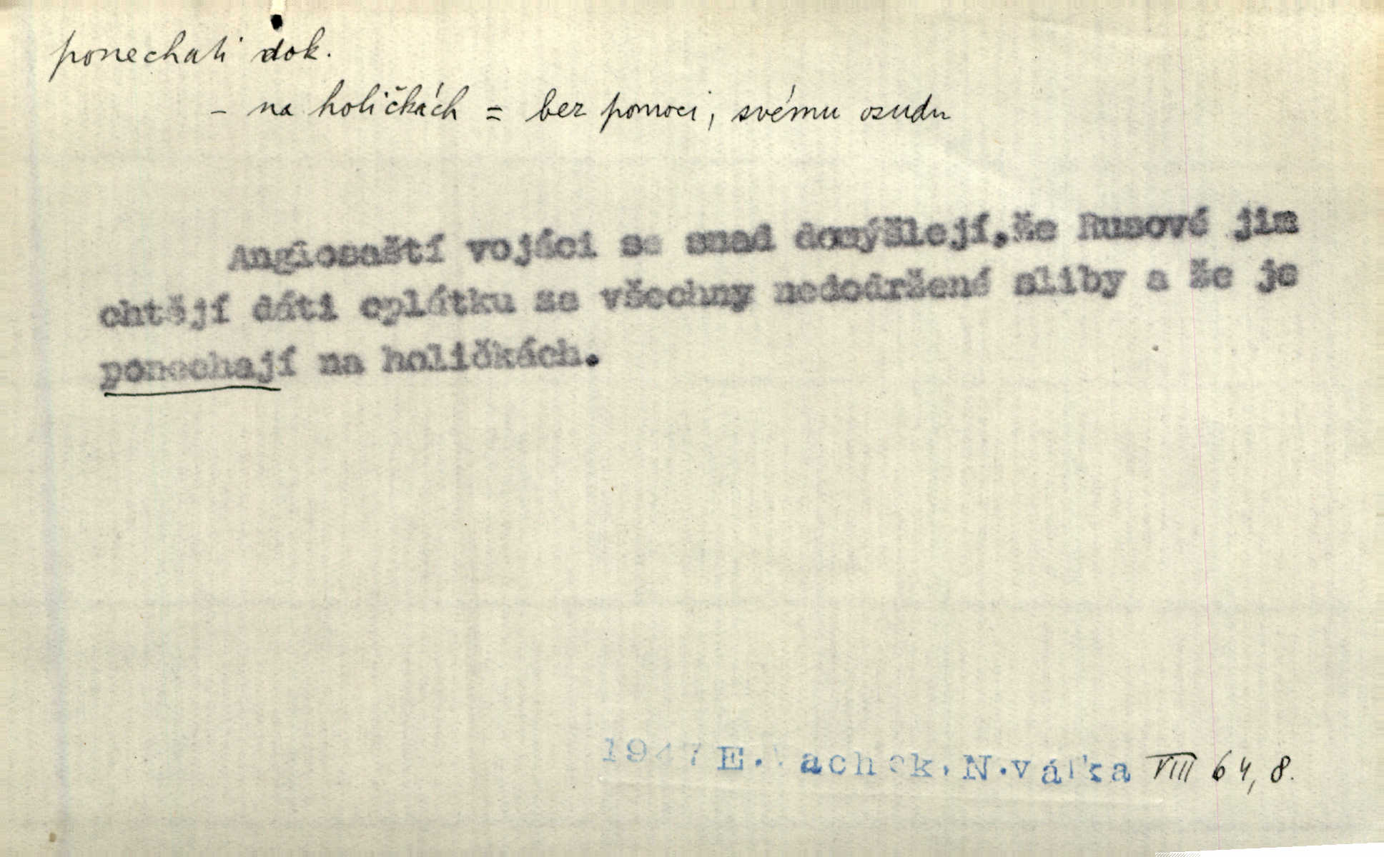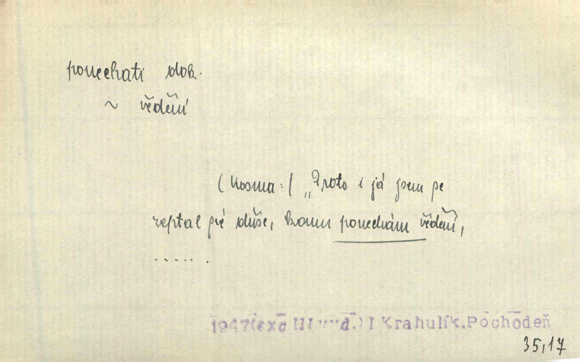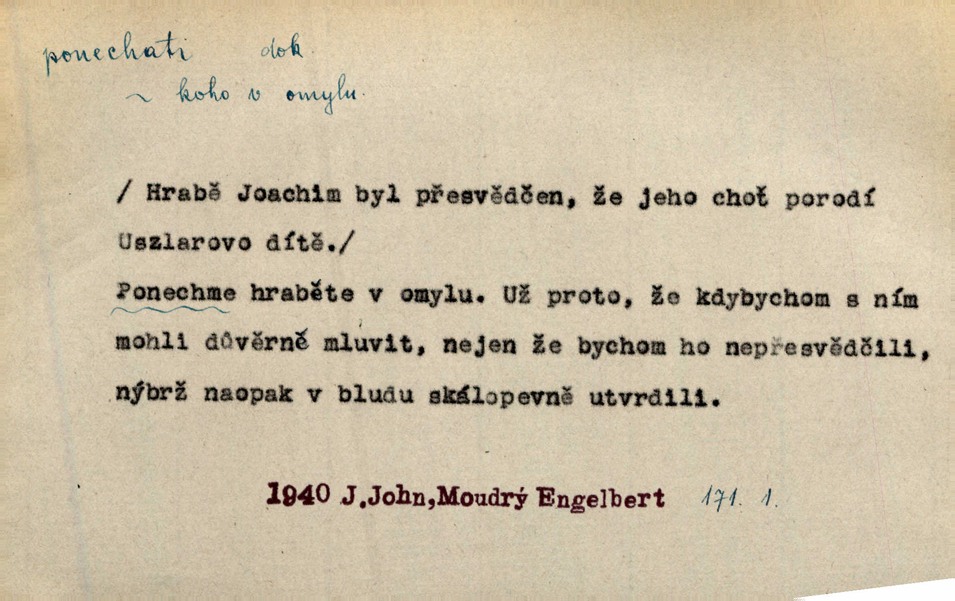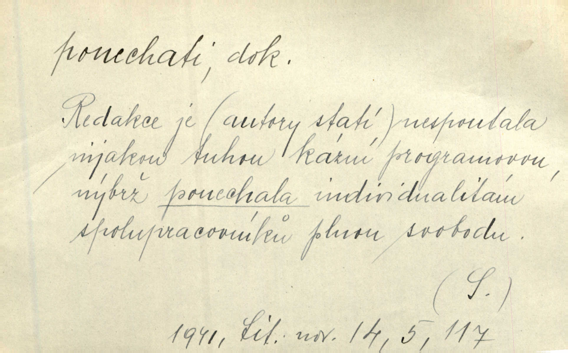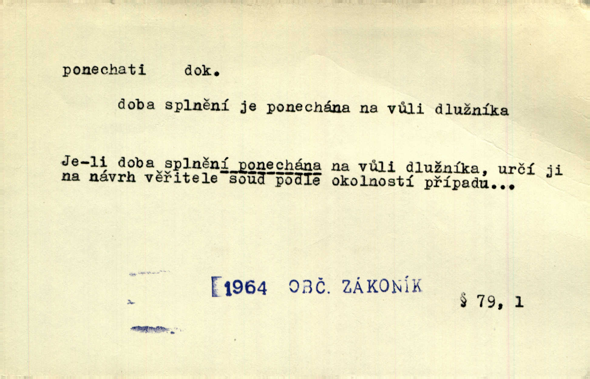 - ponechati dok. zůstaviti, dopustiti, nezabrániti. Zdálo se, že nás [teta] ponechala úplně našemu osudu. Obr. živ. Nejlépe bude, ponechají-li věcem průběh přirozený. Svět. Vyrval se z náruče její, ponechav ubohou žalu. Choch. Dospěv středu řeky, ponechal loďku proudu. Čap. Ch. Bylť nyní svoboden, nevázán, sám sobě ponechán. Pfleg. Dcerušku na chvíli ponechala samé sobě. Prav. Ostatní zatím ponecháni na pokoji. Hál. Ponechal jsem mu na vůli, zastaviti se, kde se mu bude líbiti. Prav. Dnes jen netrpělivě [matka] hlavu od něho odvrátila a ponechala mu slovo poslední. Svět. Když jí řekli, že ji nemohou ponechat na noc, div se nerozplakala. R. Svob. D (koho kde) podržeti někoho v dřívějším stavu, neodstraniti někoho odněkud. Jsem vám velmi povděčen, že jste mne ve službě ponechala. Pfleg. Synové ponecháni zatím ve službě. Jir. Pro zločin veřejného násilí ponechán ve vyšetřování. Herb. Nevíš, jak dlouho tě Pán Bůh zde na světě ponechá. Prav. Pertolta z Valdštejna má [král] také zajmouti, ale na živu jej ponechati. Pekárek. Vždycky užitek my větší máme, když v hlouposti ho [lid] trochu ponecháme. Ner. D (komu co, co kde) neodejmouti někomu něco, nezbaviti někoho něčeho, neodkliditi něco odněkud. Dar ponechám mu, nezruším svůj slib. Zey. Všecko, co jí dal, také jí ponechal. Mrš. Zapraven poplatek za další ponechání hrobu. Herrm. Ve slovech cizích ponechání orthografie cizí čtenáře českého másti mohlo. Pal. Ve svém stolku ponechati může práce ještě nezralé. V. Mrš. V ruce nesla vrbový proutek zcela hladký, pouze na konci s chvostem ponechaného listí. Svob. Velmistru ponechána moc, rozsudek umírniti. Choch. Ponechala se obci samé péče o její vlastní záležitosti. Tomíč. D zůstaviti, zanechati. Minuly žně, hrozné pro něj žně, nebo všecko musil ponechat cizím lidem. Jir. Tu knížku mi tu ponechte, za několik dní si sem přijďte. Pfleg. Petr ponechal své ženě dům i pole, peníze však určil k rozdání chudým. Goll. Pro nedostatek místa musíme úvahu o provedení ponechati pro číslo budoucí. Zl. Praha. Což snad zamýšlíte ponechati pana Josefa doma? Pfleg. Možno i, že je působivým trestem, ponechati někoho v místnosti tmavé. Ner. Svolil ponechati věc do svého návratu do Prahy. Podl. Ponechala podezření své u sebe. Paleč. D přenechati, přepustiti. Nesmí ji [sedlák žeň] na trzích prodati, nýbrž vrchnosti ji ponechati za cenu, kterou si sama určí. Svět. Markrabí zavřel se do pevného Znojma a ponechal otevřený kraj Čechům. Ritt. „Začni tedy a ponech úsudek nám,“ doložil doktor. Svob. To ponecháme učencům, jsou-li „kamna“ původní, naše jméno. Jir. Byla tak vůle bohů… Pomstu ponechte jim. Třeb. D ponechati si (co) podržeti u sebe něco, neodložiti něco, nevzdati se něčeho. Nemoha dohlížeti na hospodářství, ponechal si jen několik mír pole na setí. Herb. Mlynář si honitbu ponechal, ale sám stříleti neuměl. Svob. Dlouho vybírala [šátky] ptajíc se, který si má ponechati. Rais. Není mi třeba věna, ponechte si vše. R. Svob. Ponechal si svůj úsudek o této žádosti pro sebe. Svět. Rozhodnutí si ponechala na příští neděli. Svob. Na konec ponechali si stavové poslední, největší trumf. Rez.