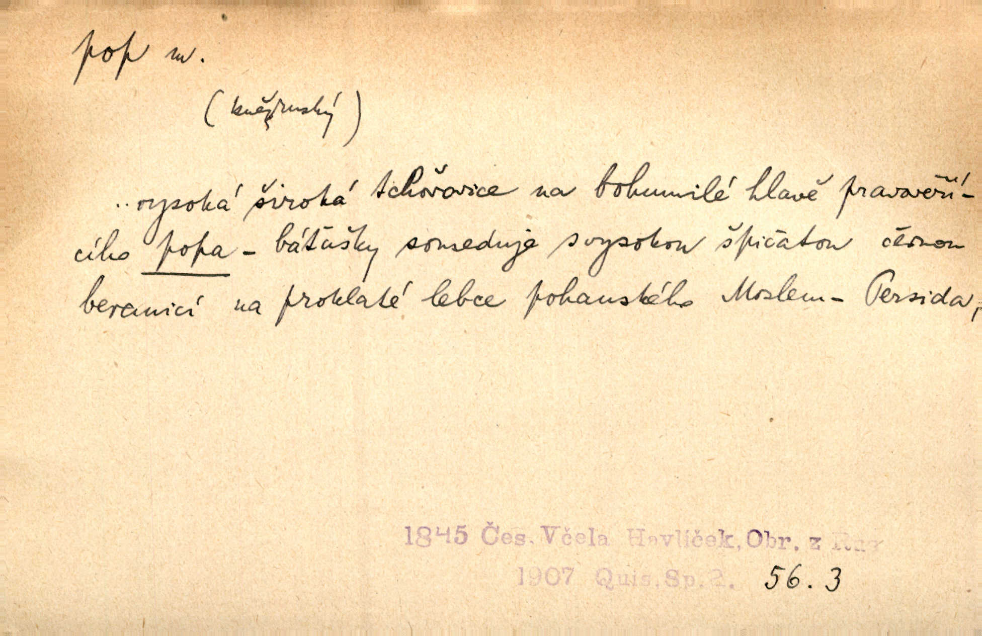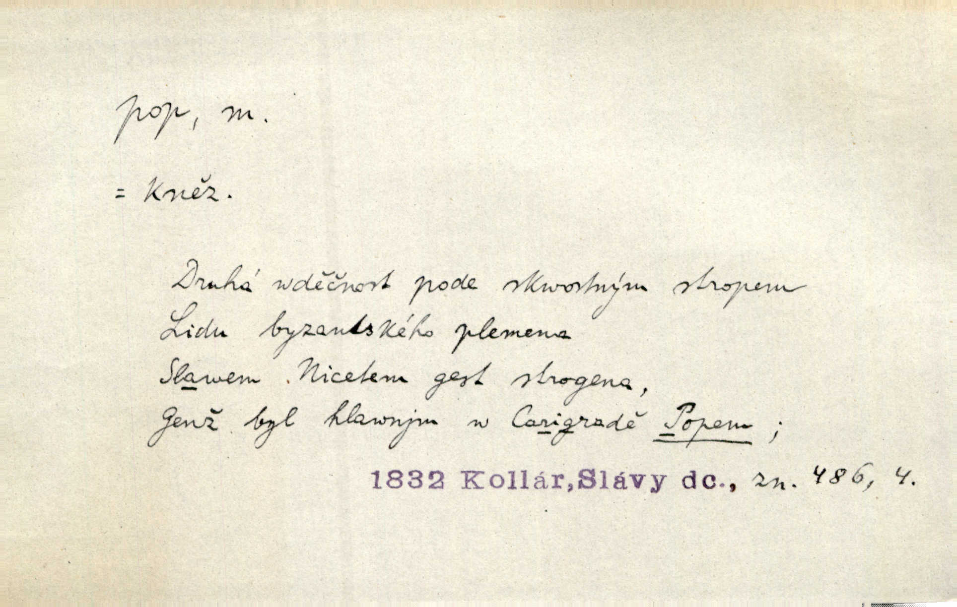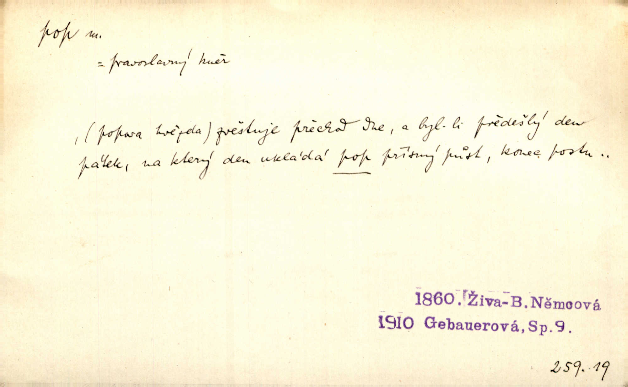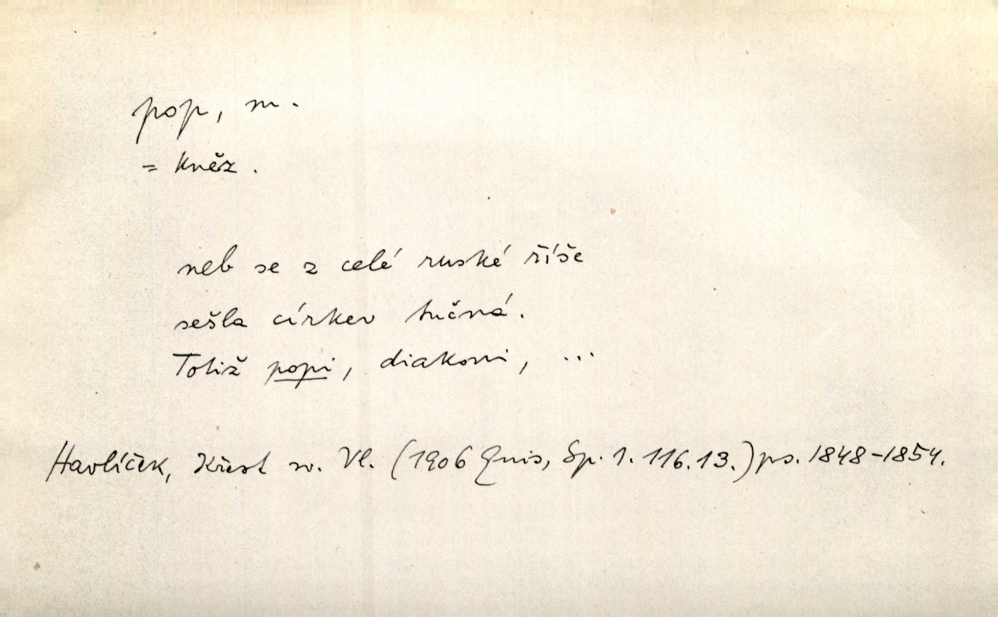 - pop, -a m. pravoslavný kněz. Mnohý pop čili ruský kněz pro neznámost starého slovanského jazyka ani sám neví, co říká. Ehrenb. Rusínští vousatí popové. Dyk. D Pejor. katolický kněz, kněz vůbec. Výsměchem omezených popů byla zavržena věda. Mach. Je to vychytralý pop — snáze bylo by s ďáblem kupčiti. Vlč. D Zast. kněz. Kněží čili popů bylo málo. Pal. D šachová figura střelec, běhoun. My jej [běhouna] popem zovem; sudím také slove. Čech.