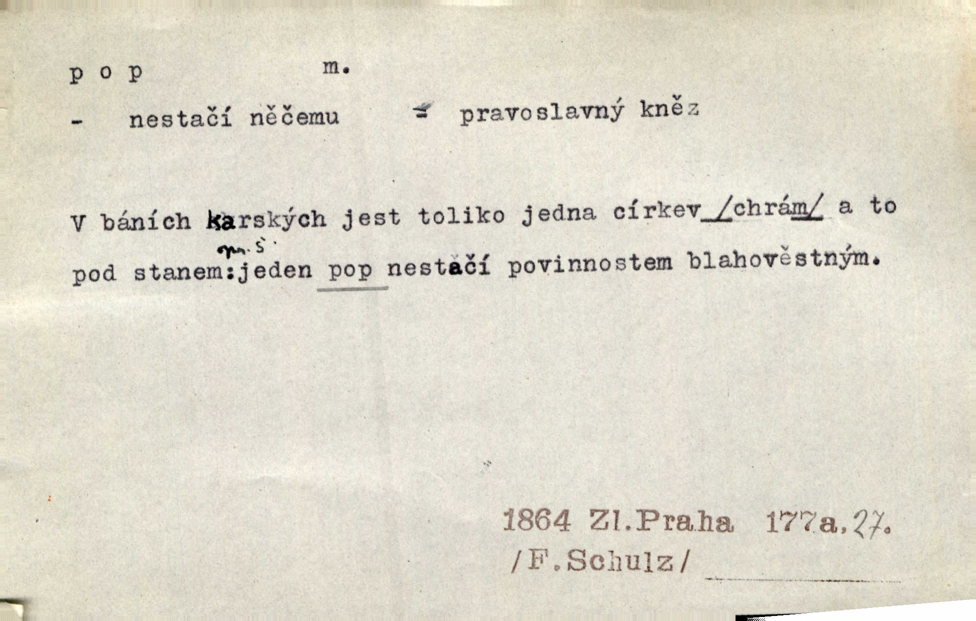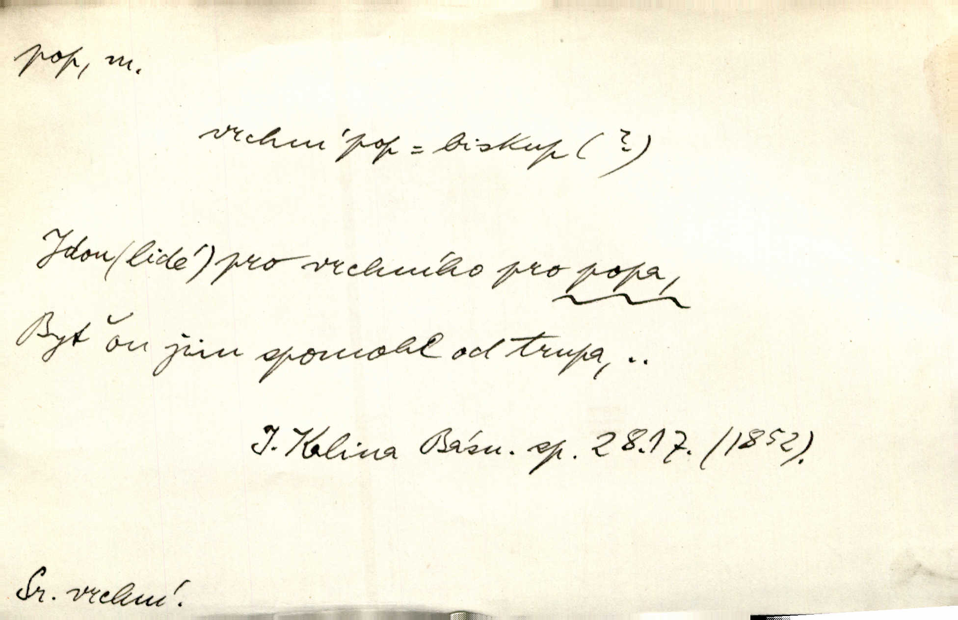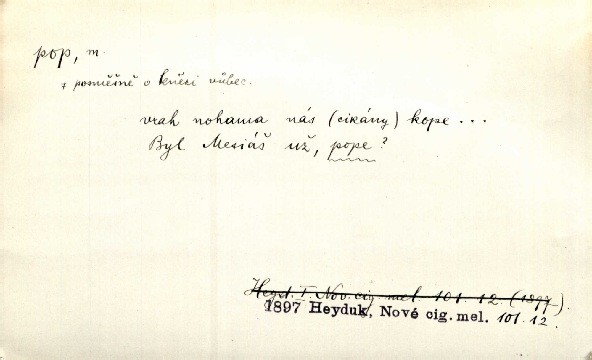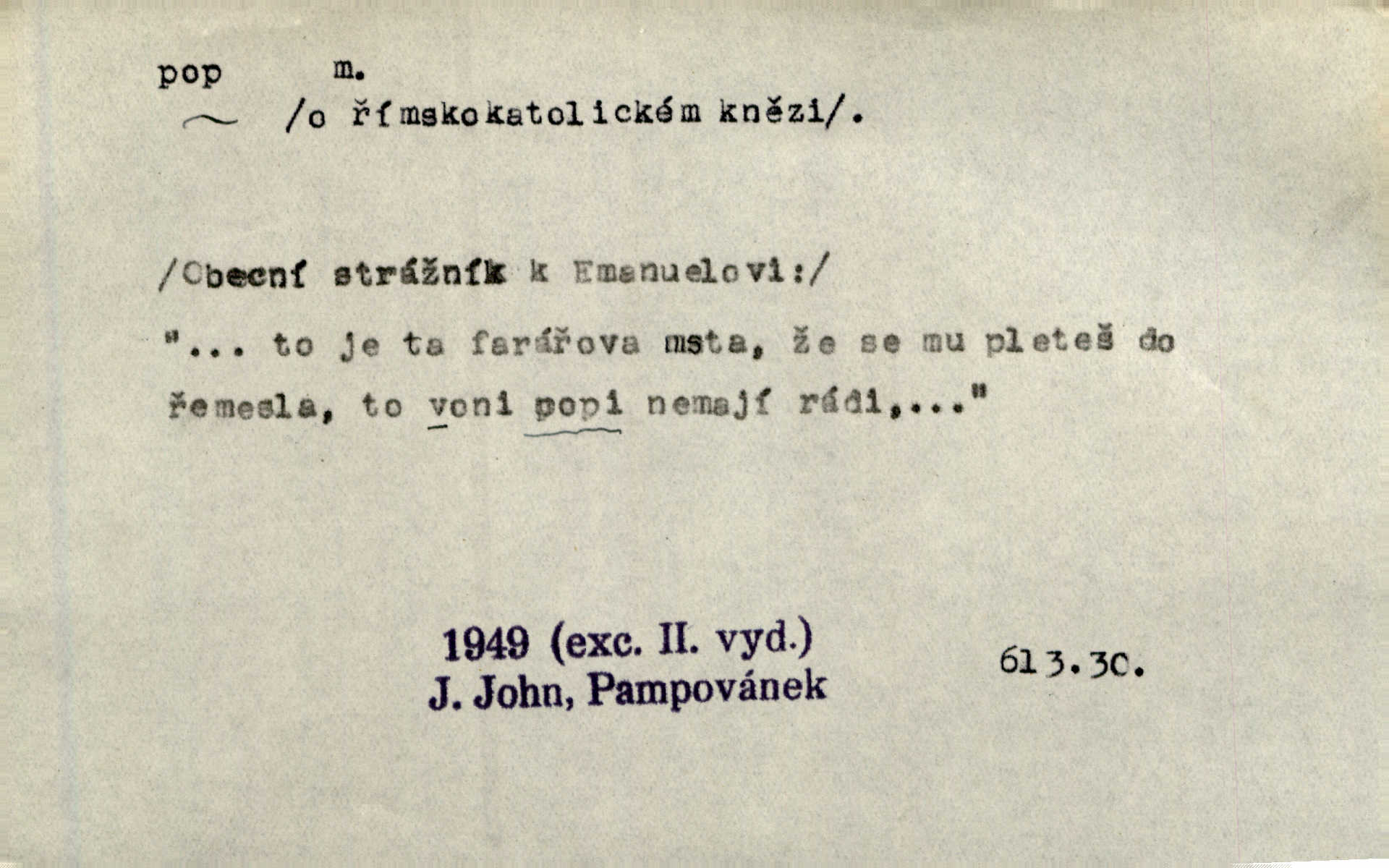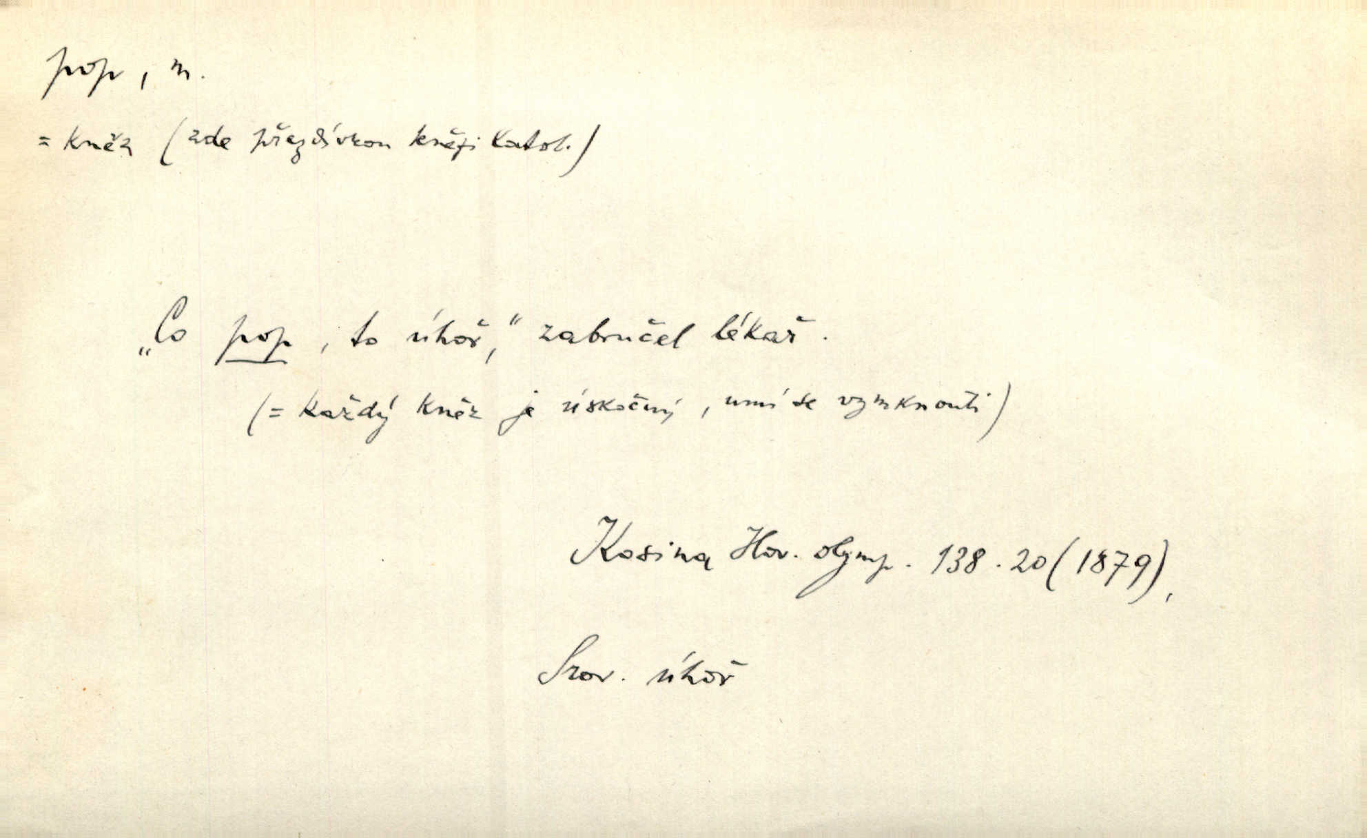 - pop, -a m. pravoslavný kněz. Mnohý pop čili ruský kněz pro neznámost starého slovanského jazyka ani sám neví, co říká. Ehrenb. Rusínští vousatí popové. Dyk. D Pejor. katolický kněz, kněz vůbec. Výsměchem omezených popů byla zavržena věda. Mach. Je to vychytralý pop — snáze bylo by s ďáblem kupčiti. Vlč. D Zast. kněz. Kněží čili popů bylo málo. Pal. D šachová figura střelec, běhoun. My jej [běhouna] popem zovem; sudím také slove. Čech.