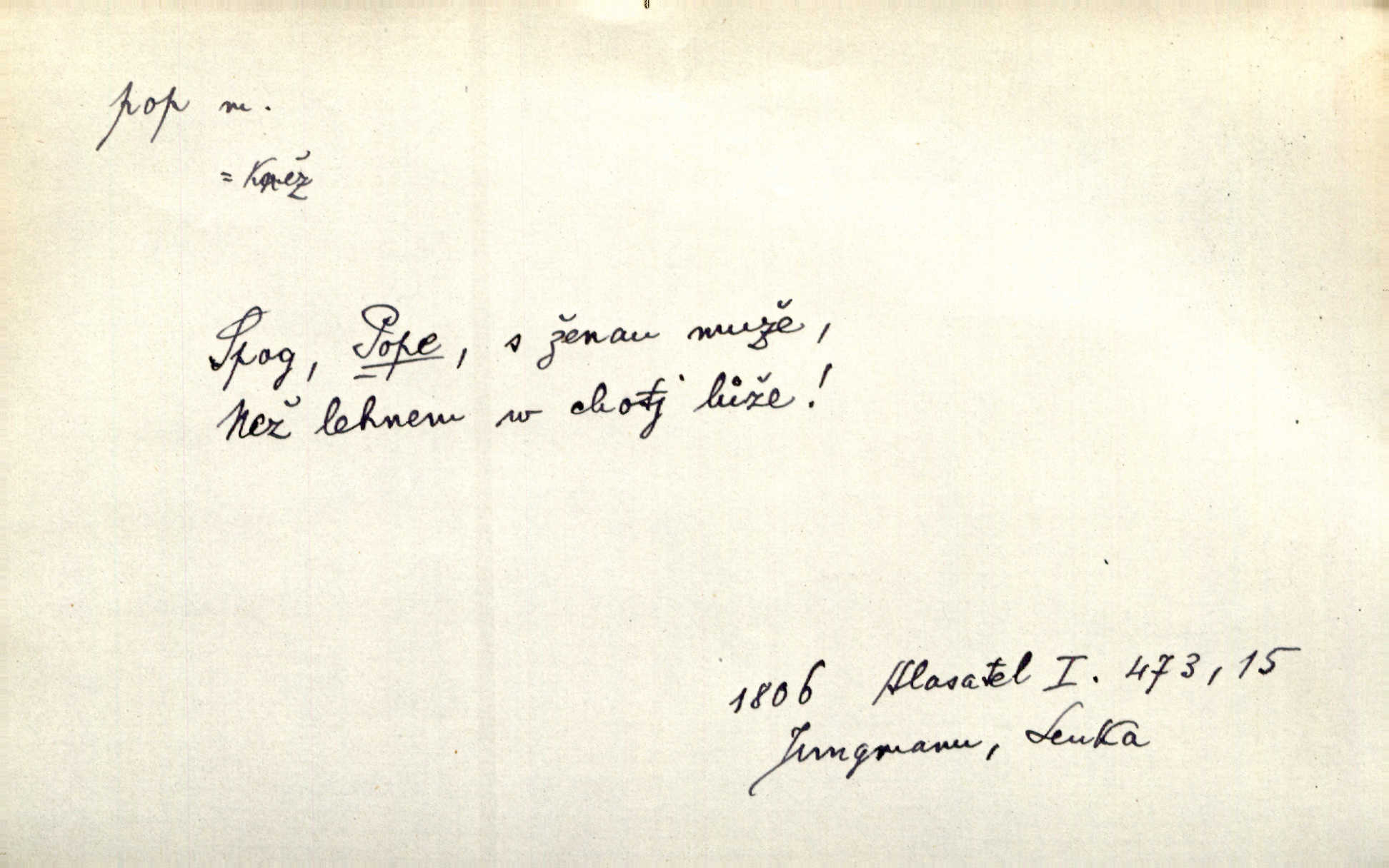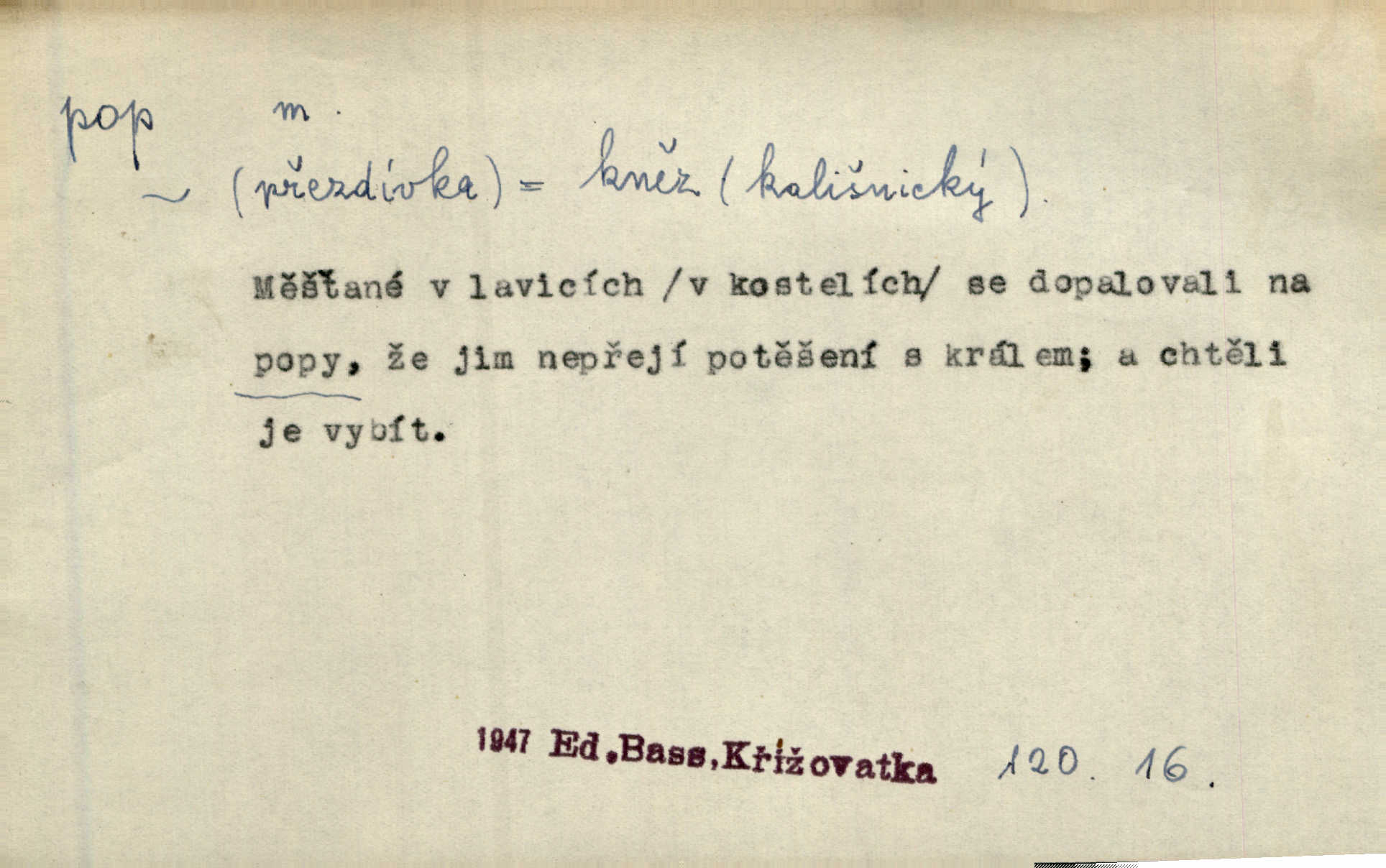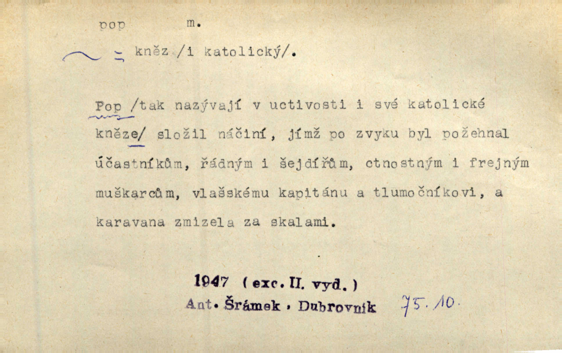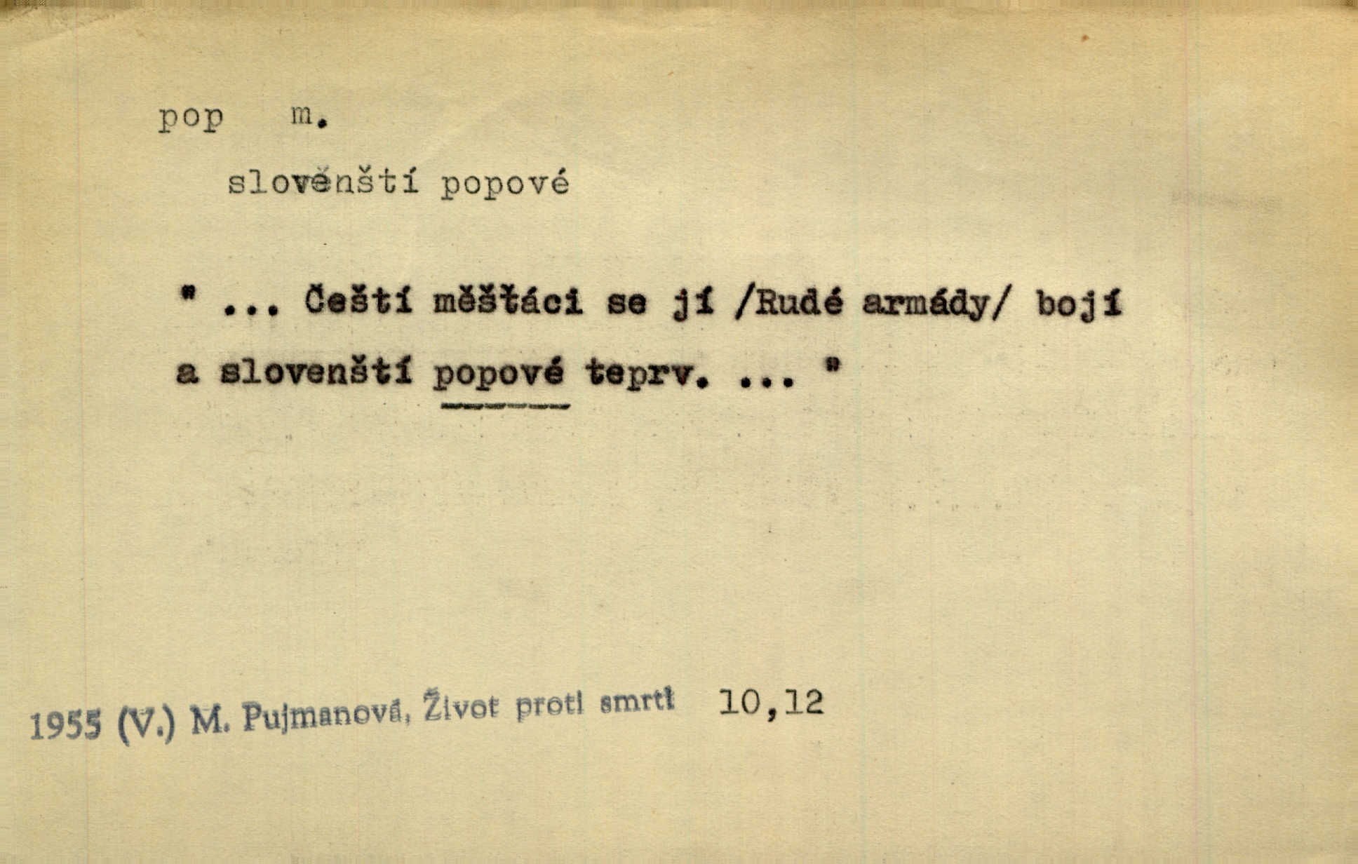 - pop, -a m. pravoslavný kněz. Mnohý pop čili ruský kněz pro neznámost starého slovanského jazyka ani sám neví, co říká. Ehrenb. Rusínští vousatí popové. Dyk. D Pejor. katolický kněz, kněz vůbec. Výsměchem omezených popů byla zavržena věda. Mach. Je to vychytralý pop — snáze bylo by s ďáblem kupčiti. Vlč. D Zast. kněz. Kněží čili popů bylo málo. Pal. D šachová figura střelec, běhoun. My jej [běhouna] popem zovem; sudím také slove. Čech.