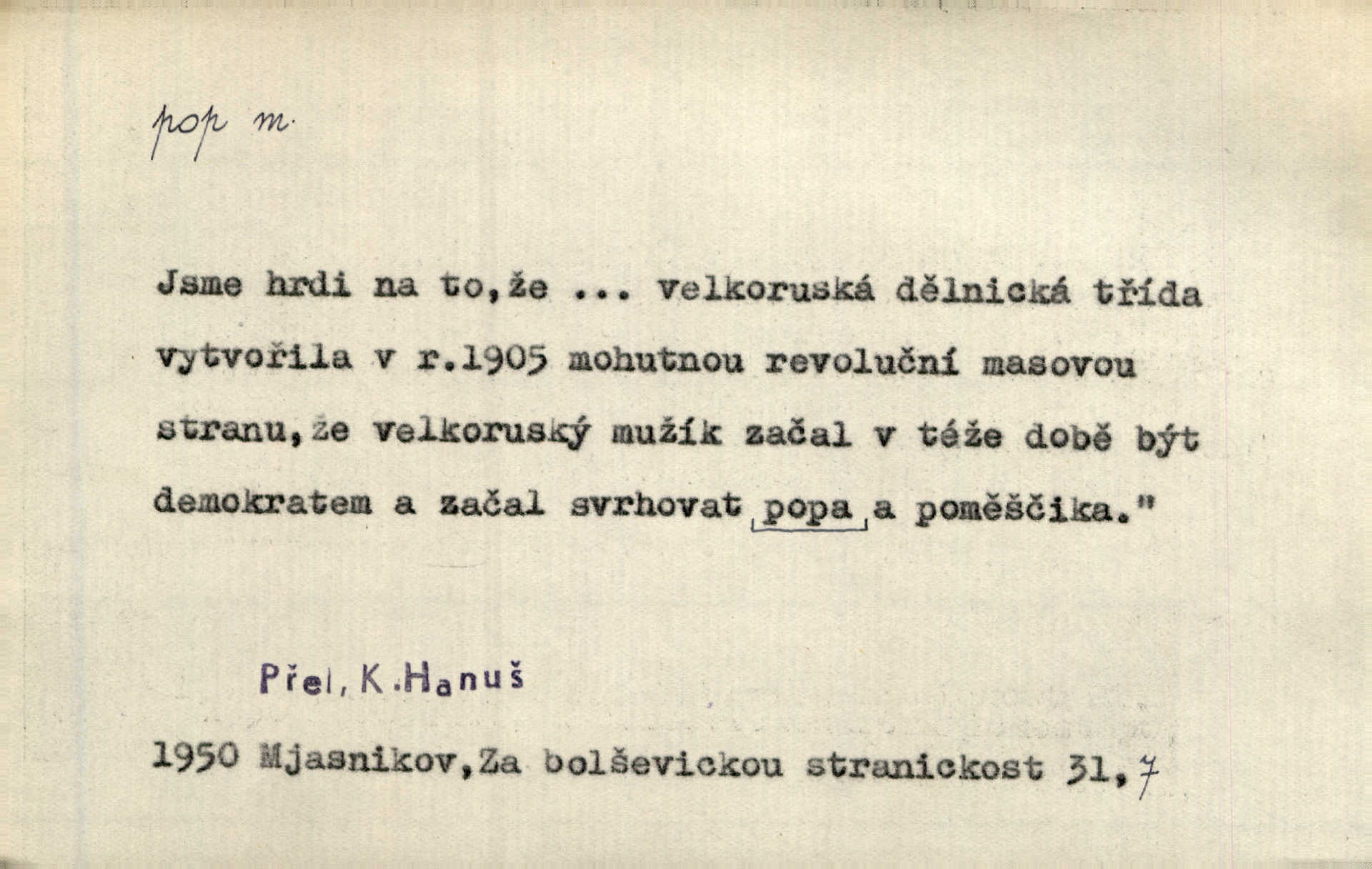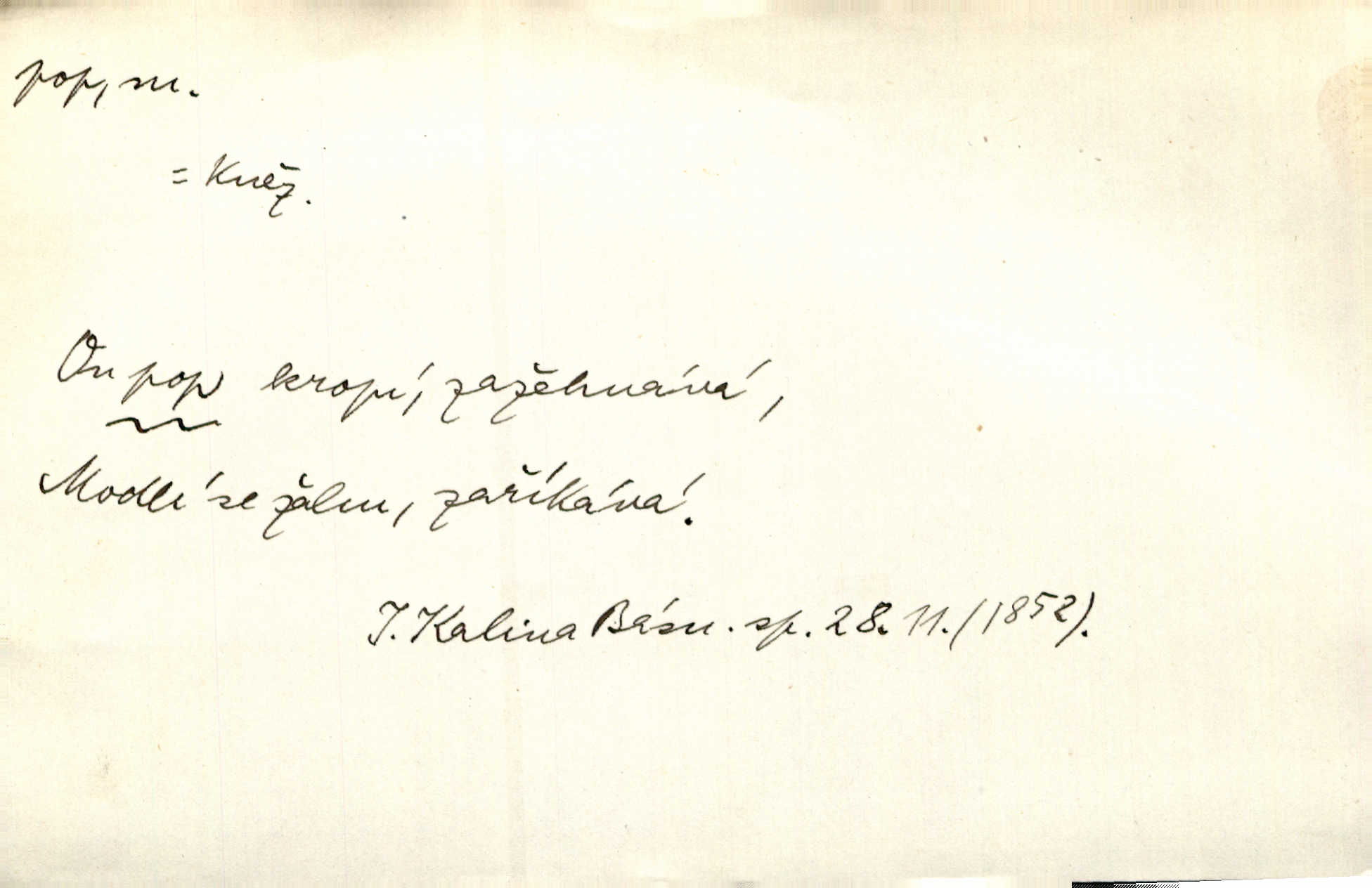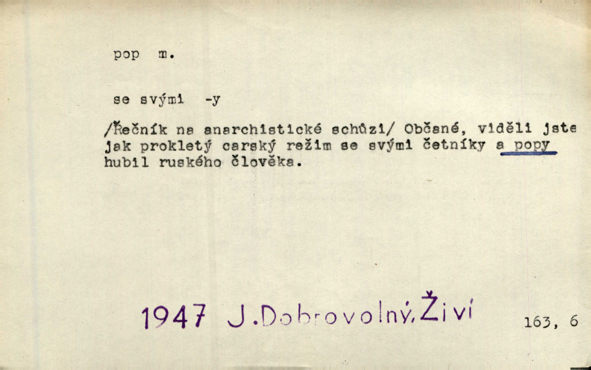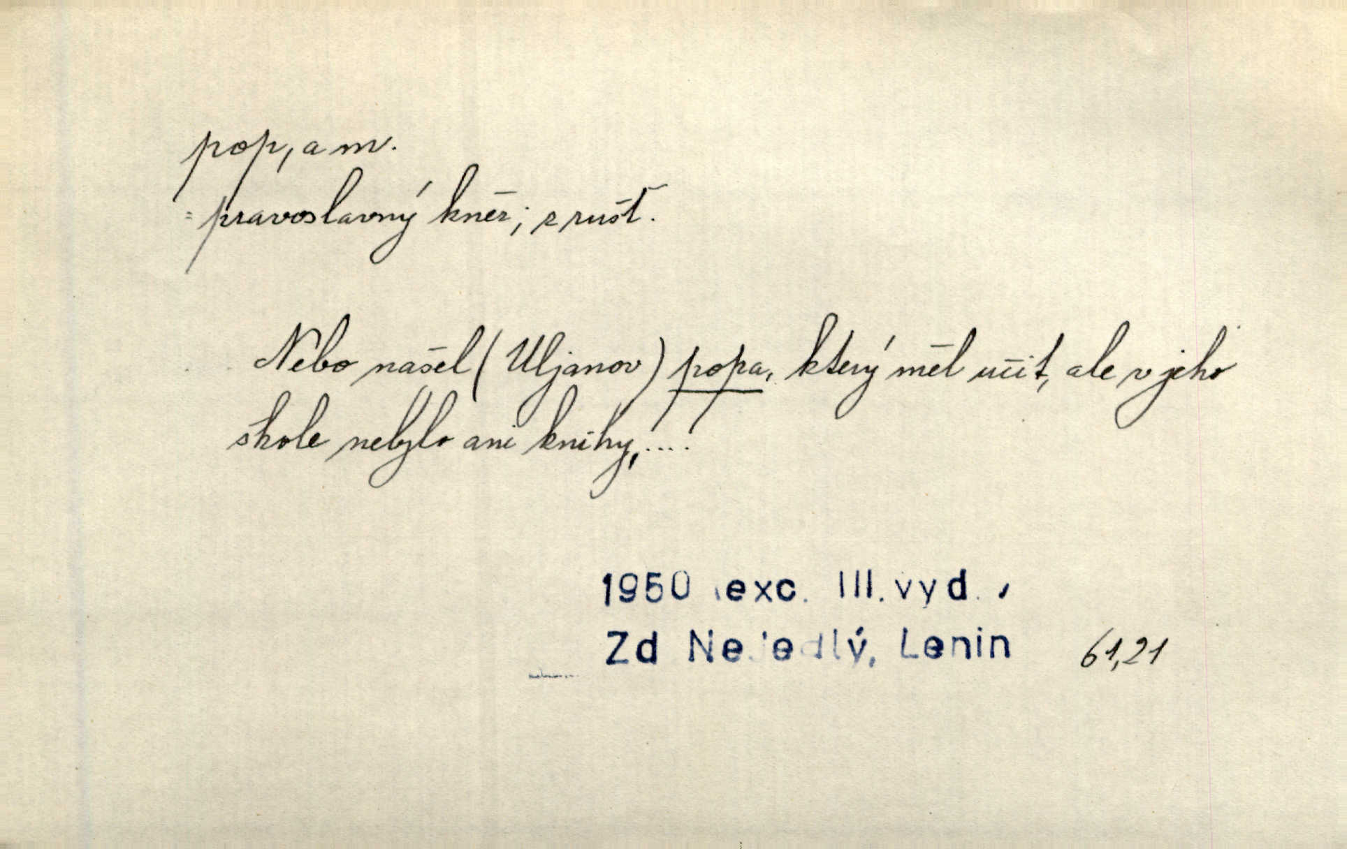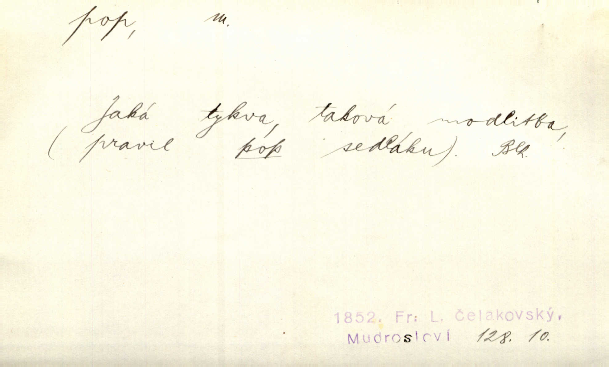 - pop, -a m. pravoslavný kněz. Mnohý pop čili ruský kněz pro neznámost starého slovanského jazyka ani sám neví, co říká. Ehrenb. Rusínští vousatí popové. Dyk. D Pejor. katolický kněz, kněz vůbec. Výsměchem omezených popů byla zavržena věda. Mach. Je to vychytralý pop — snáze bylo by s ďáblem kupčiti. Vlč. D Zast. kněz. Kněží čili popů bylo málo. Pal. D šachová figura střelec, běhoun. My jej [běhouna] popem zovem; sudím také slove. Čech.