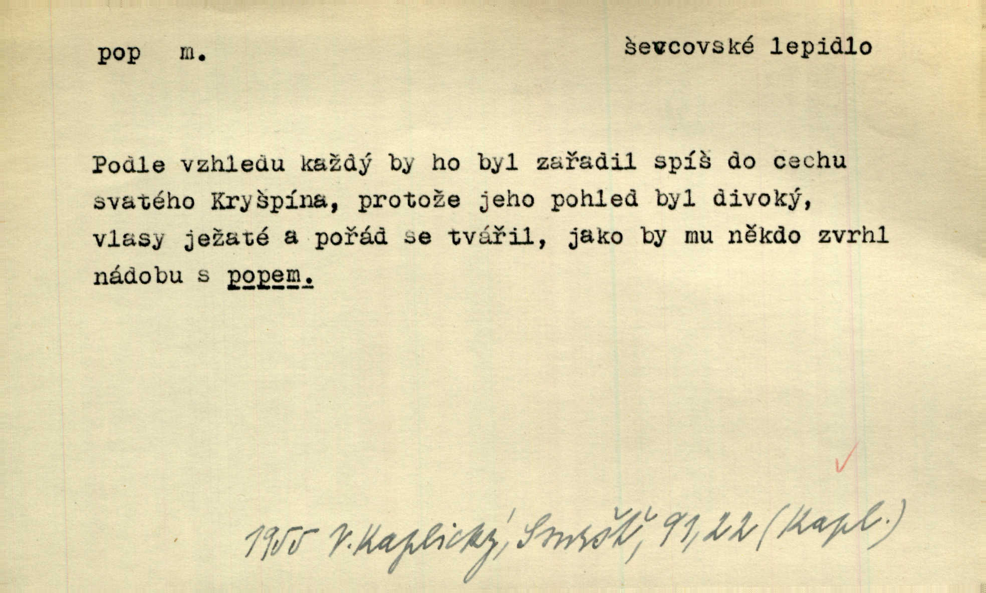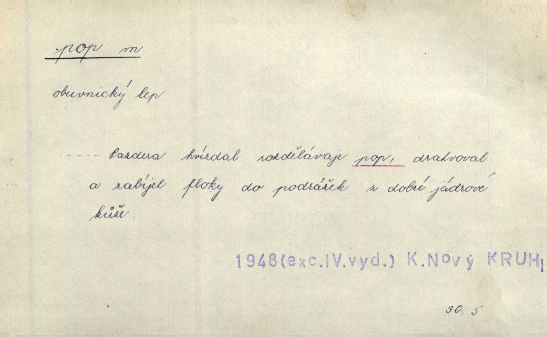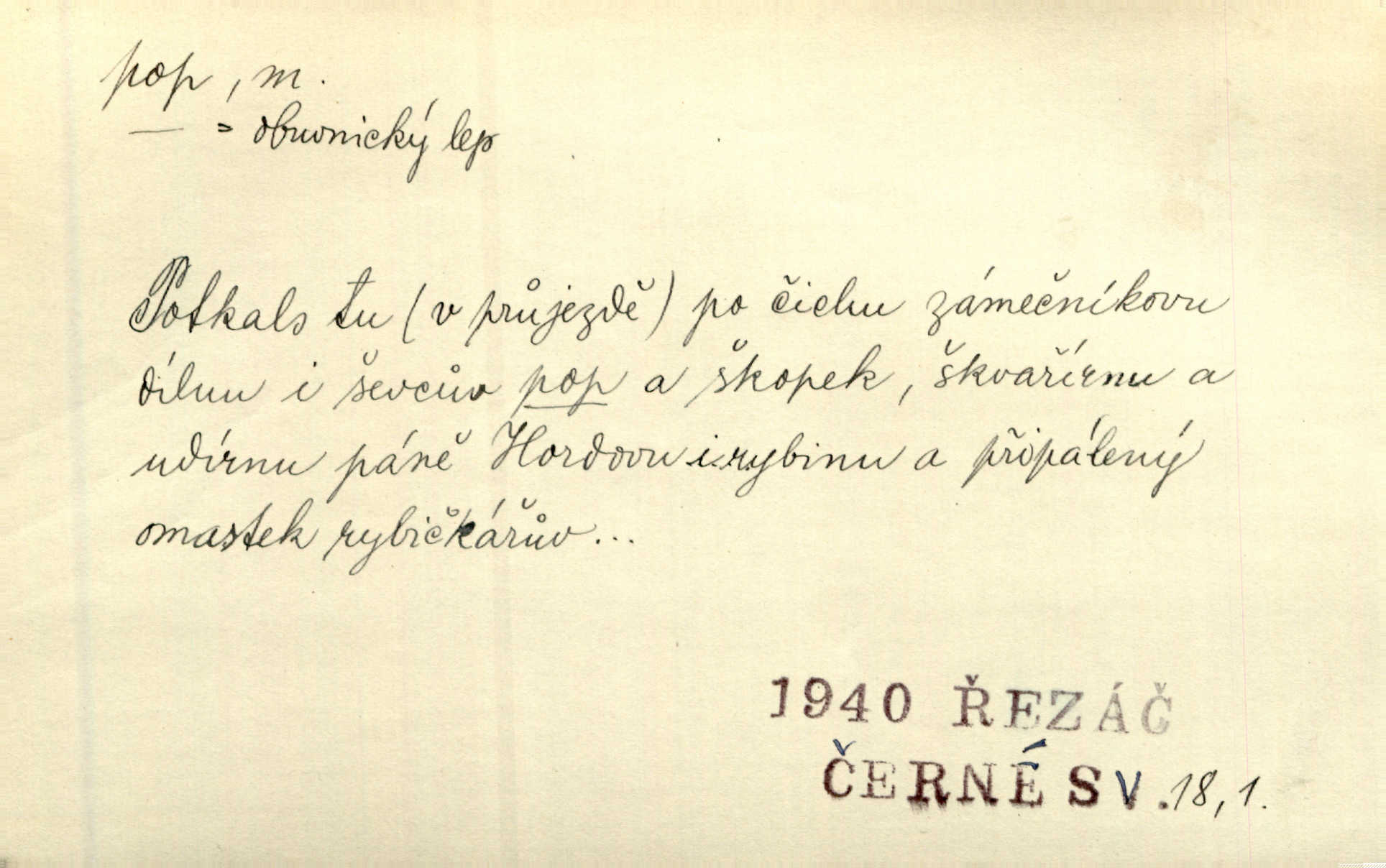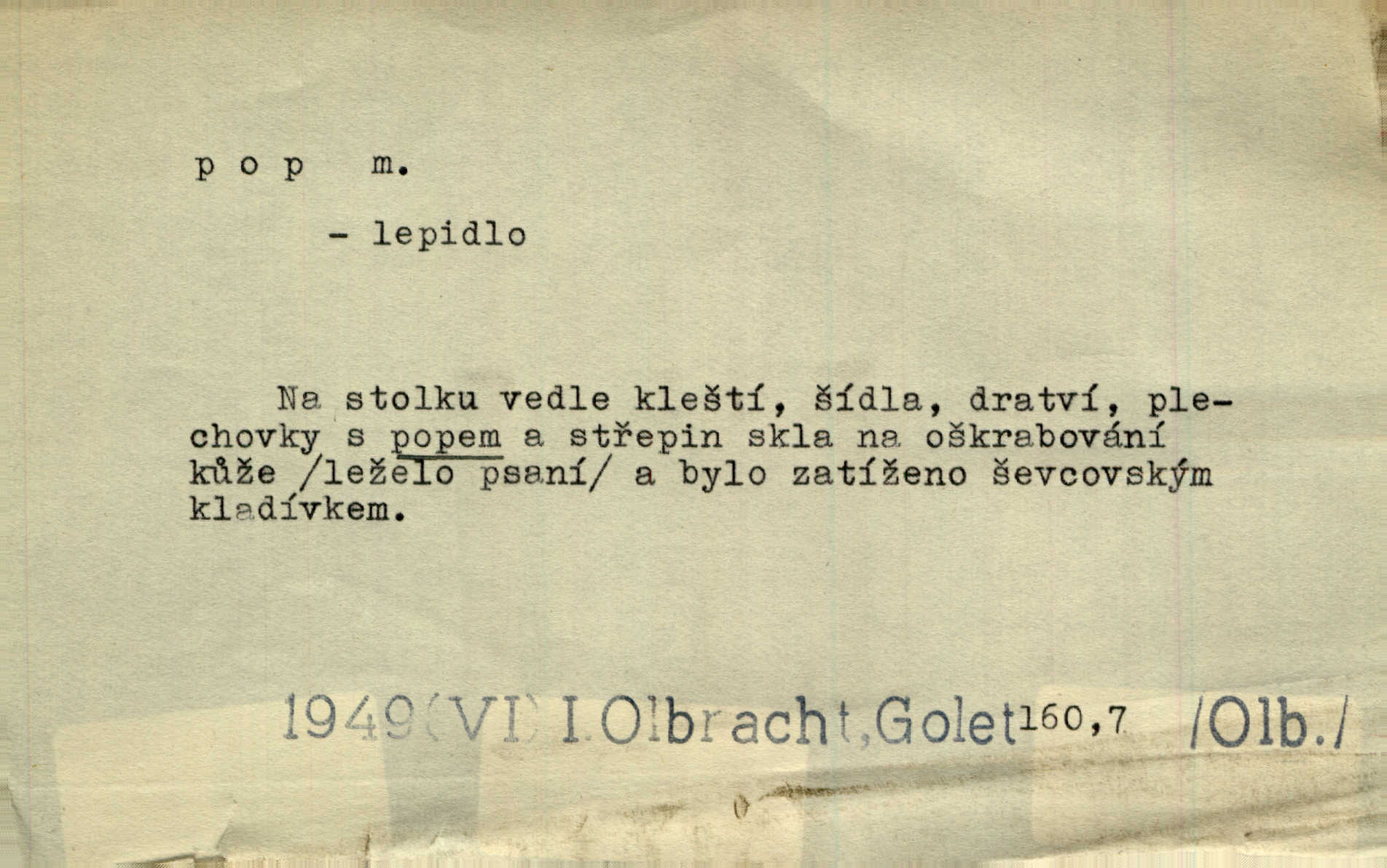 - pop, -u m. druh lepidla. V sousední jizbičce klepalo ševcovské kladivo, páchl zakyslý pop. A. Mrš.