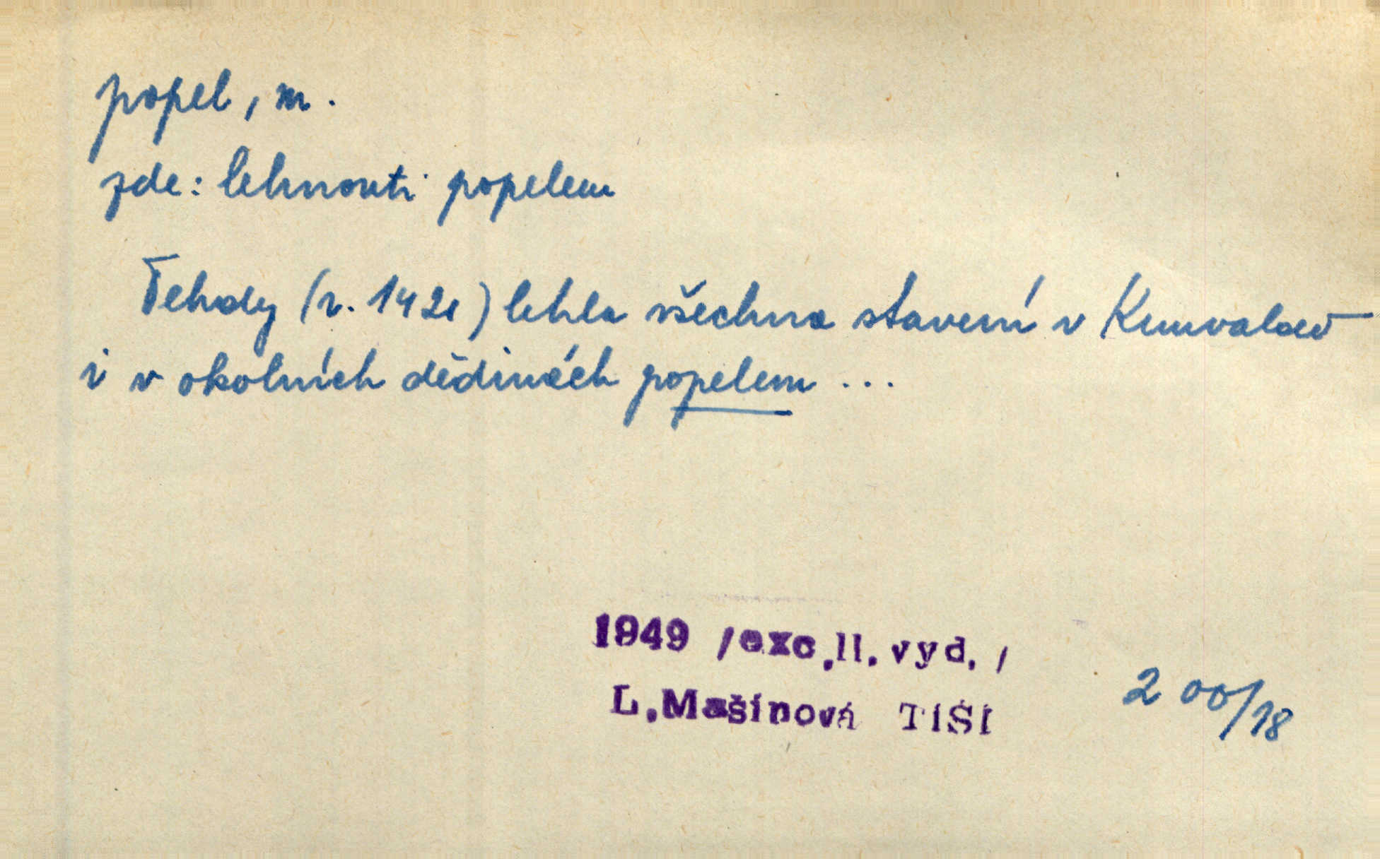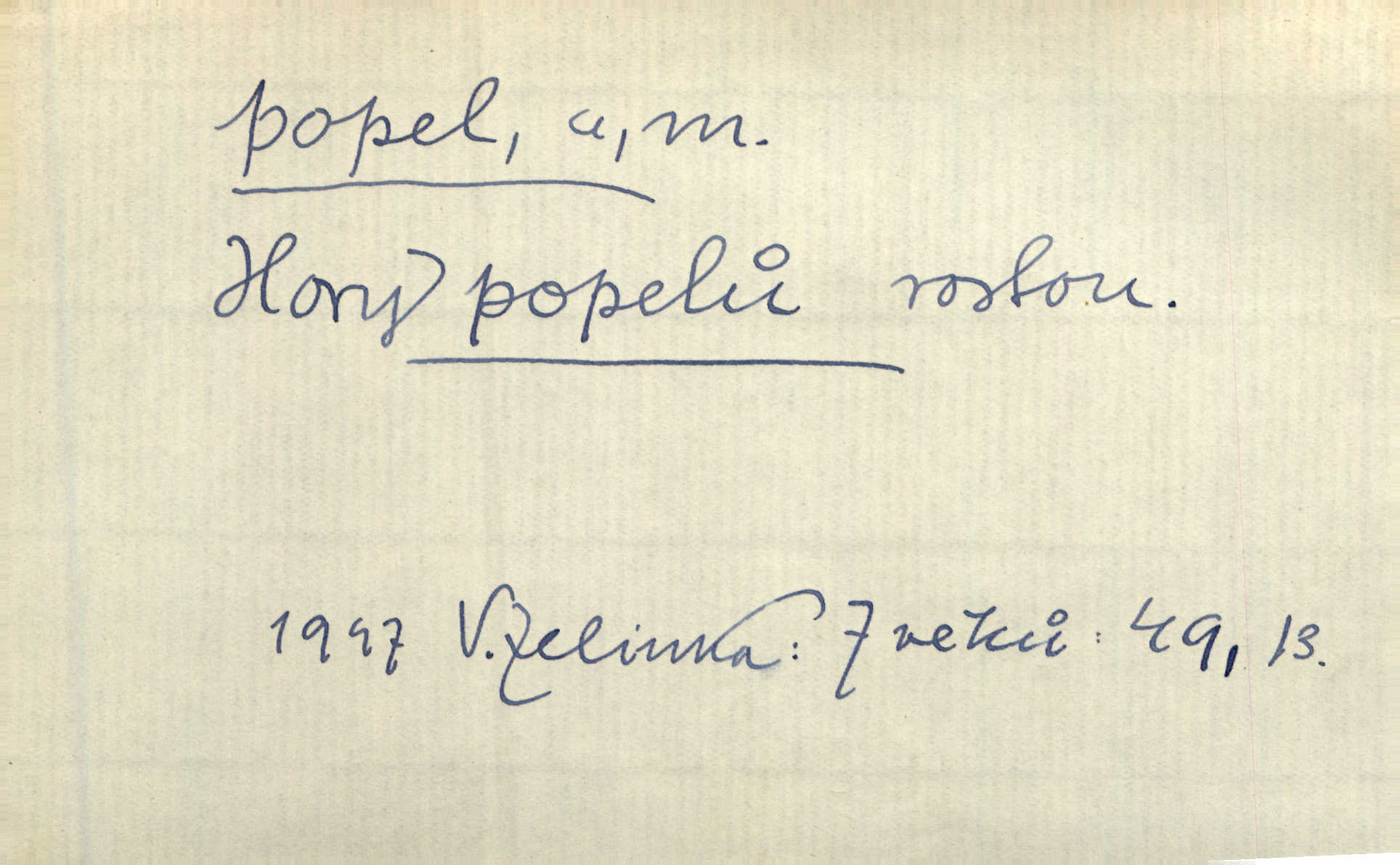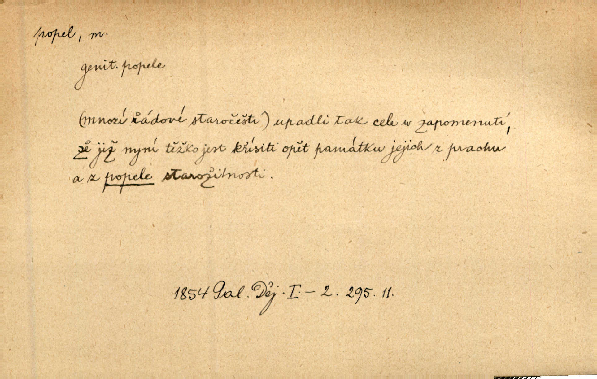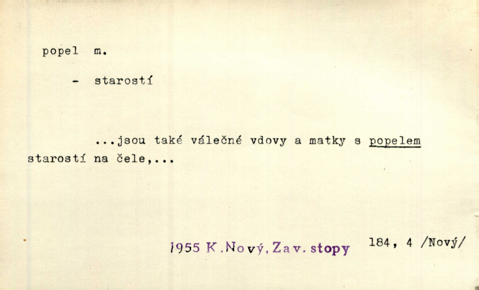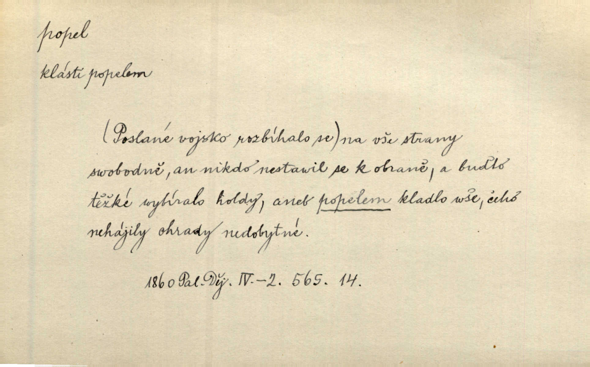 - popel, -a n. -u, arch. -e (lok. -u, arch. -e, -i) m. šedý práškovitý zbytek po spálení. Na dvoře kupily se ohořelé a ještě doutnající trámy, popel, uhlí a hromady rumu. Jir. Hrabali lidé v popele a v oharkách, aby našli škváry svého jmění. Jir. Otřepával popel s doutníku. Kosm. Spálila jsem večeři na popel. Zey. Sem se vyhazuje smetí a vynáší popel. Ner. [Babička] šťourá pohrabáčem v popeli. Něm. Záští [v Hrabcovi] doutnalo jen jako žížlavý uhel pod popelem. Herb. Oni se tam [v Praze] ztratí jako zrnko máku v popelu. Jir. Obloha byla jako popel. Rais. Ustál. sp. Měl kovář popel na jazyku chuť popelu. Vrch. Skloněnou hlavu měl [kněz] popelem posypanou na znamení pokory a pokání. Jir. Na hlavách popel, na prsou roztrhané černé šaty jsme prosili. Vrch. Obrátiti v popel, položiti popelem spáliti; lehnouti popelem shořeti. V sakristii skoro všecko v popel obráceno, ornáty a všecka kostelní roucha. Jir. Vítězové střechy poražených položí prachem a popelem. Hol. Celá usedlost lehla popelem. Baar. Přen. Nakládání Verunčino vrhlo do mrtvého popela duše jeho jiskru živou, novou. Šmil. Nehrab déle v popeli mé duše. Vrch. Chem. neústrojný zbytek vzniklý pálením n. pražením rud a p. Popel antimonový, cínový, zinkový, popel kostní, dřevní a j. D Bás. šedá, šedavá barva, šedavé zabarvení. [Měsíc] byl jako oheň dohořívající a hynul v popeli šedých mraků. Jir. S nebe padal studený popel úsvitu. Šrám. Popely soumraku zachmuřují a stísňují oddech kraje. Mod. r. D zetlelé pozůstatky zemřelých. Maminka je jistě dávno prach a popel. Rais. Pokoj jejich [mrtvých přátel] popelům. Jir. To slibuji vam při svatém popeli zesnulé matky své. Jedl. Pokoj popeli jeho! Tyl.