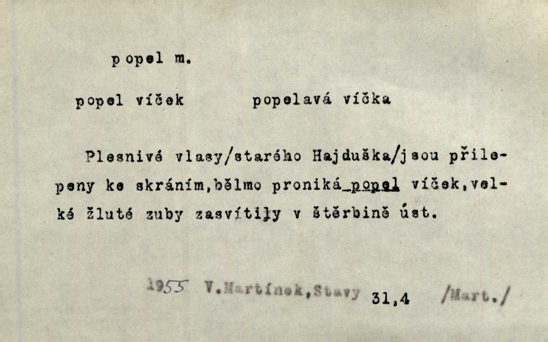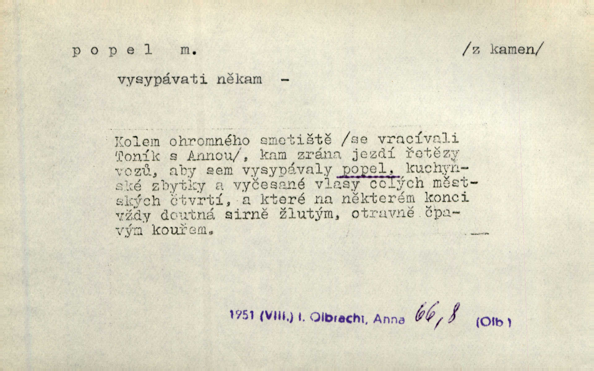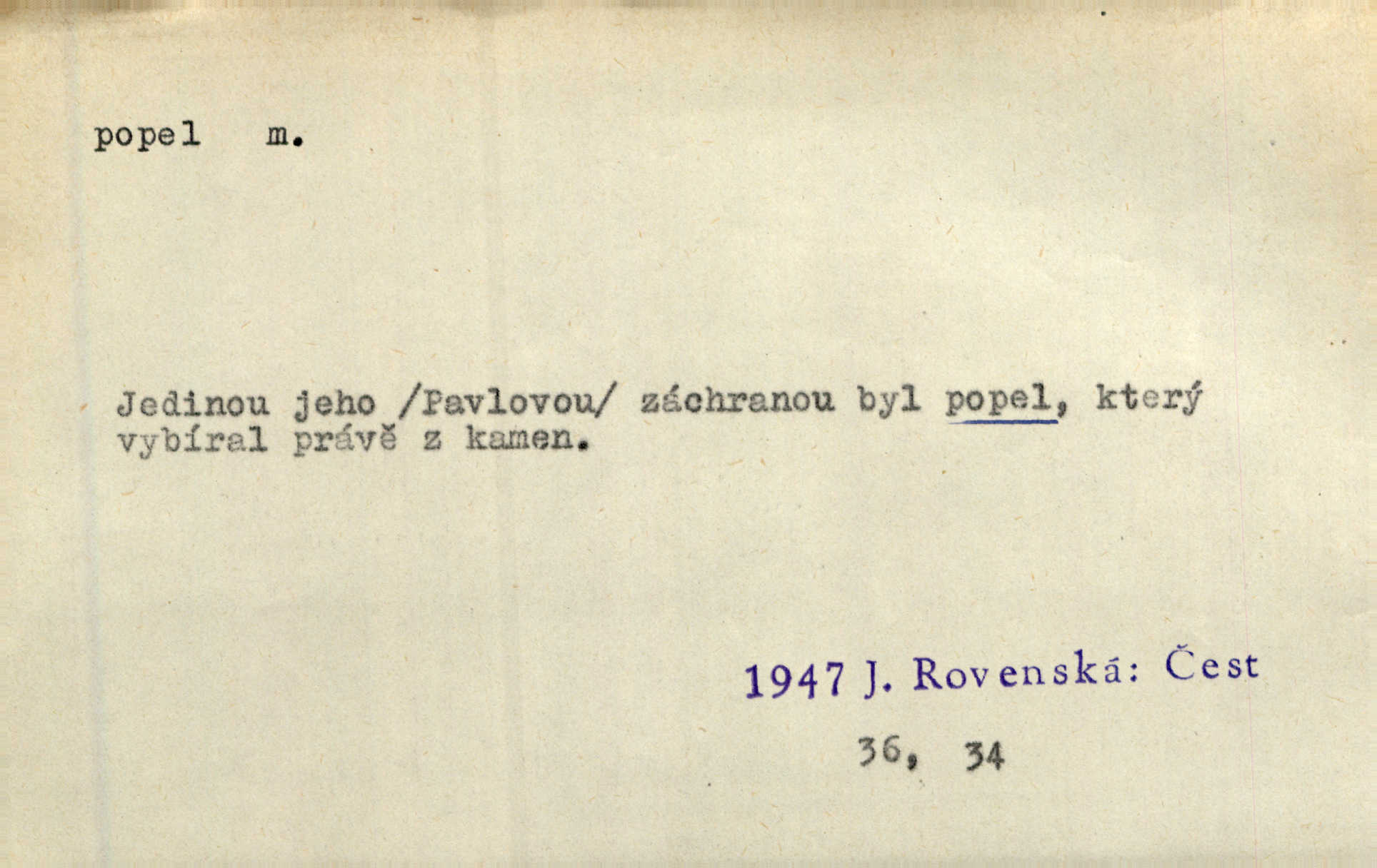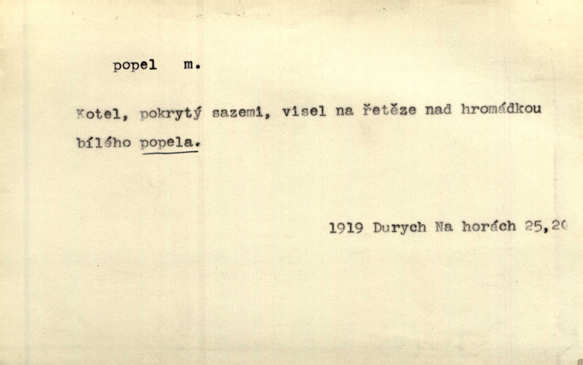 - popel, -a n. -u, arch. -e (lok. -u, arch. -e, -i) m. šedý práškovitý zbytek po spálení. Na dvoře kupily se ohořelé a ještě doutnající trámy, popel, uhlí a hromady rumu. Jir. Hrabali lidé v popele a v oharkách, aby našli škváry svého jmění. Jir. Otřepával popel s doutníku. Kosm. Spálila jsem večeři na popel. Zey. Sem se vyhazuje smetí a vynáší popel. Ner. [Babička] šťourá pohrabáčem v popeli. Něm. Záští [v Hrabcovi] doutnalo jen jako žížlavý uhel pod popelem. Herb. Oni se tam [v Praze] ztratí jako zrnko máku v popelu. Jir. Obloha byla jako popel. Rais. Ustál. sp. Měl kovář popel na jazyku chuť popelu. Vrch. Skloněnou hlavu měl [kněz] popelem posypanou na znamení pokory a pokání. Jir. Na hlavách popel, na prsou roztrhané černé šaty jsme prosili. Vrch. Obrátiti v popel, položiti popelem spáliti; lehnouti popelem shořeti. V sakristii skoro všecko v popel obráceno, ornáty a všecka kostelní roucha. Jir. Vítězové střechy poražených položí prachem a popelem. Hol. Celá usedlost lehla popelem. Baar. Přen. Nakládání Verunčino vrhlo do mrtvého popela duše jeho jiskru živou, novou. Šmil. Nehrab déle v popeli mé duše. Vrch. Chem. neústrojný zbytek vzniklý pálením n. pražením rud a p. Popel antimonový, cínový, zinkový, popel kostní, dřevní a j. D Bás. šedá, šedavá barva, šedavé zabarvení. [Měsíc] byl jako oheň dohořívající a hynul v popeli šedých mraků. Jir. S nebe padal studený popel úsvitu. Šrám. Popely soumraku zachmuřují a stísňují oddech kraje. Mod. r. D zetlelé pozůstatky zemřelých. Maminka je jistě dávno prach a popel. Rais. Pokoj jejich [mrtvých přátel] popelům. Jir. To slibuji vam při svatém popeli zesnulé matky své. Jedl. Pokoj popeli jeho! Tyl.