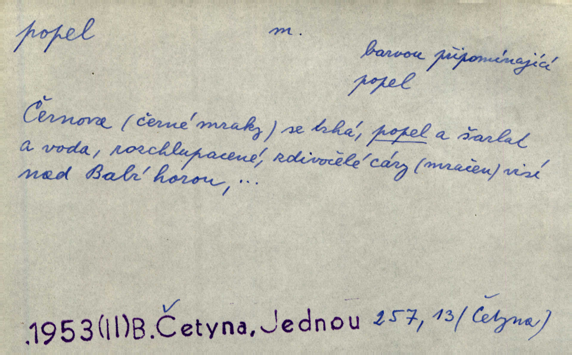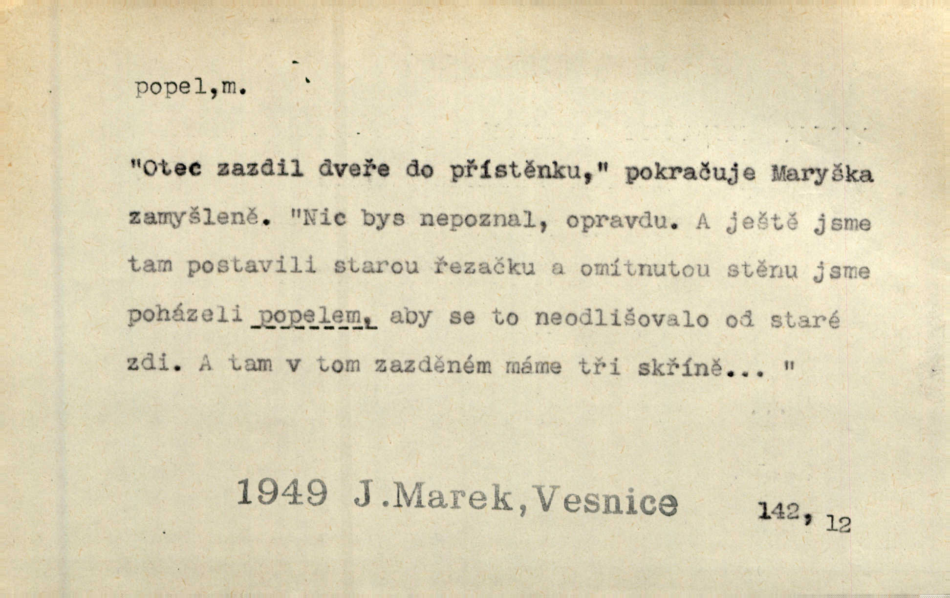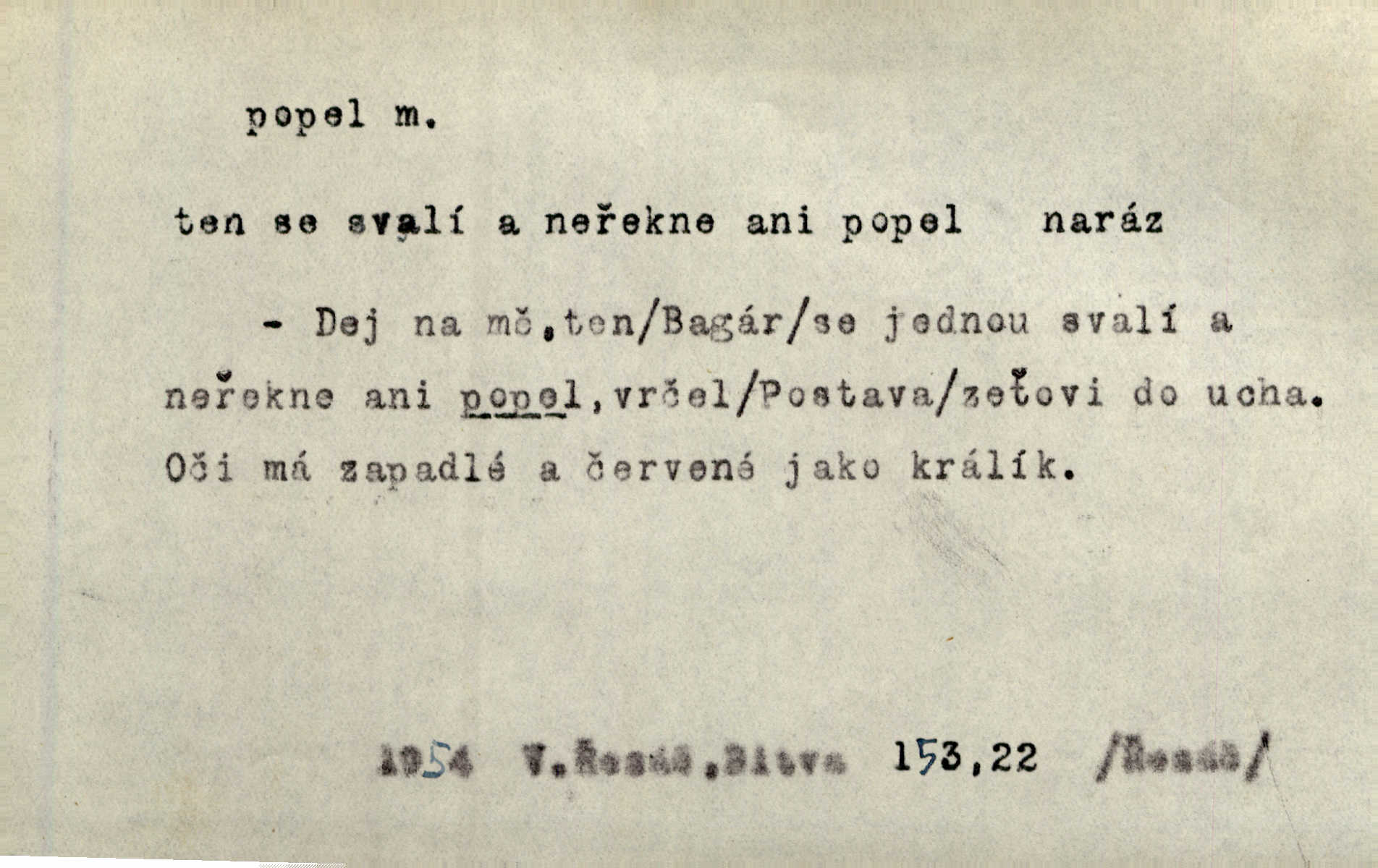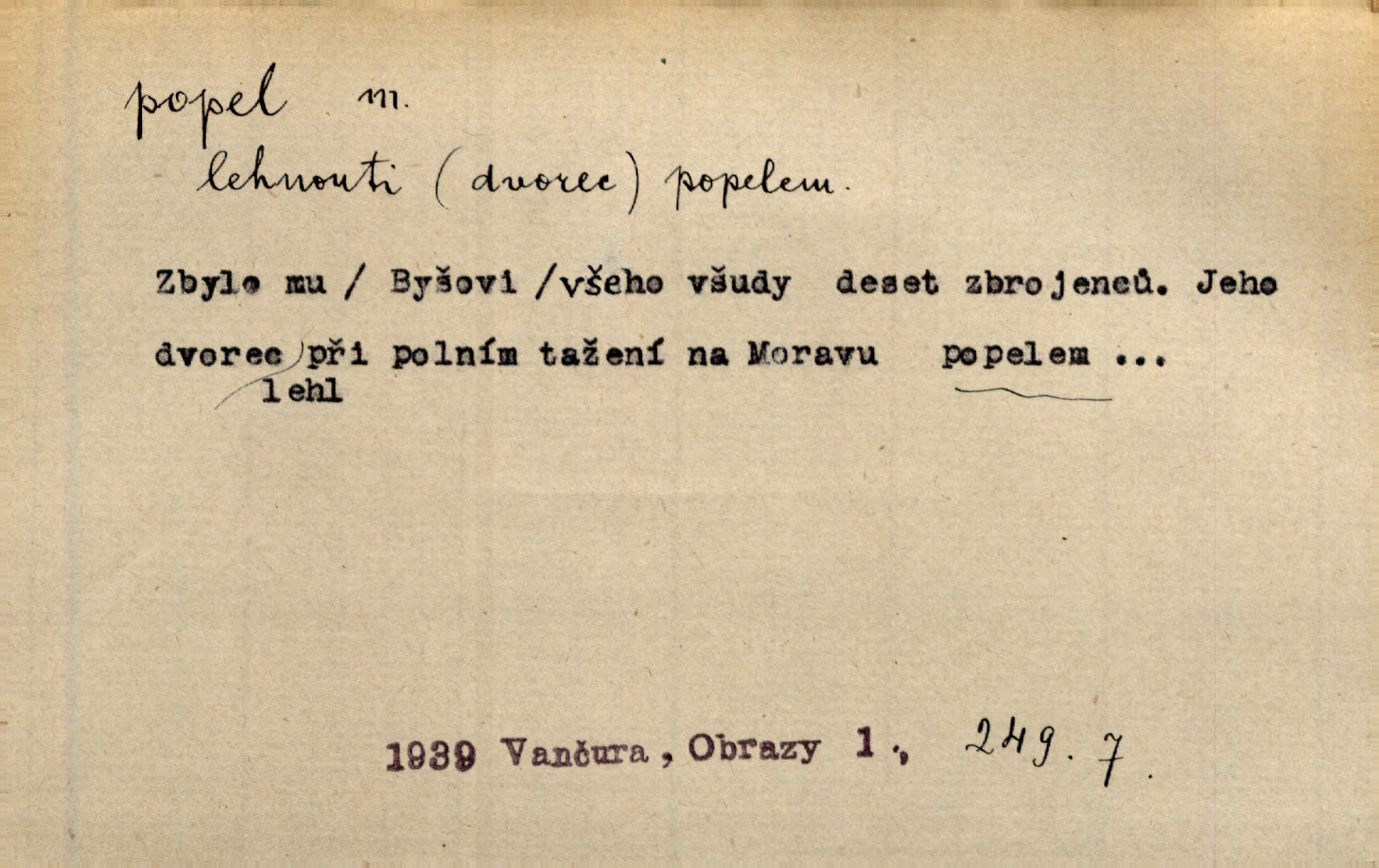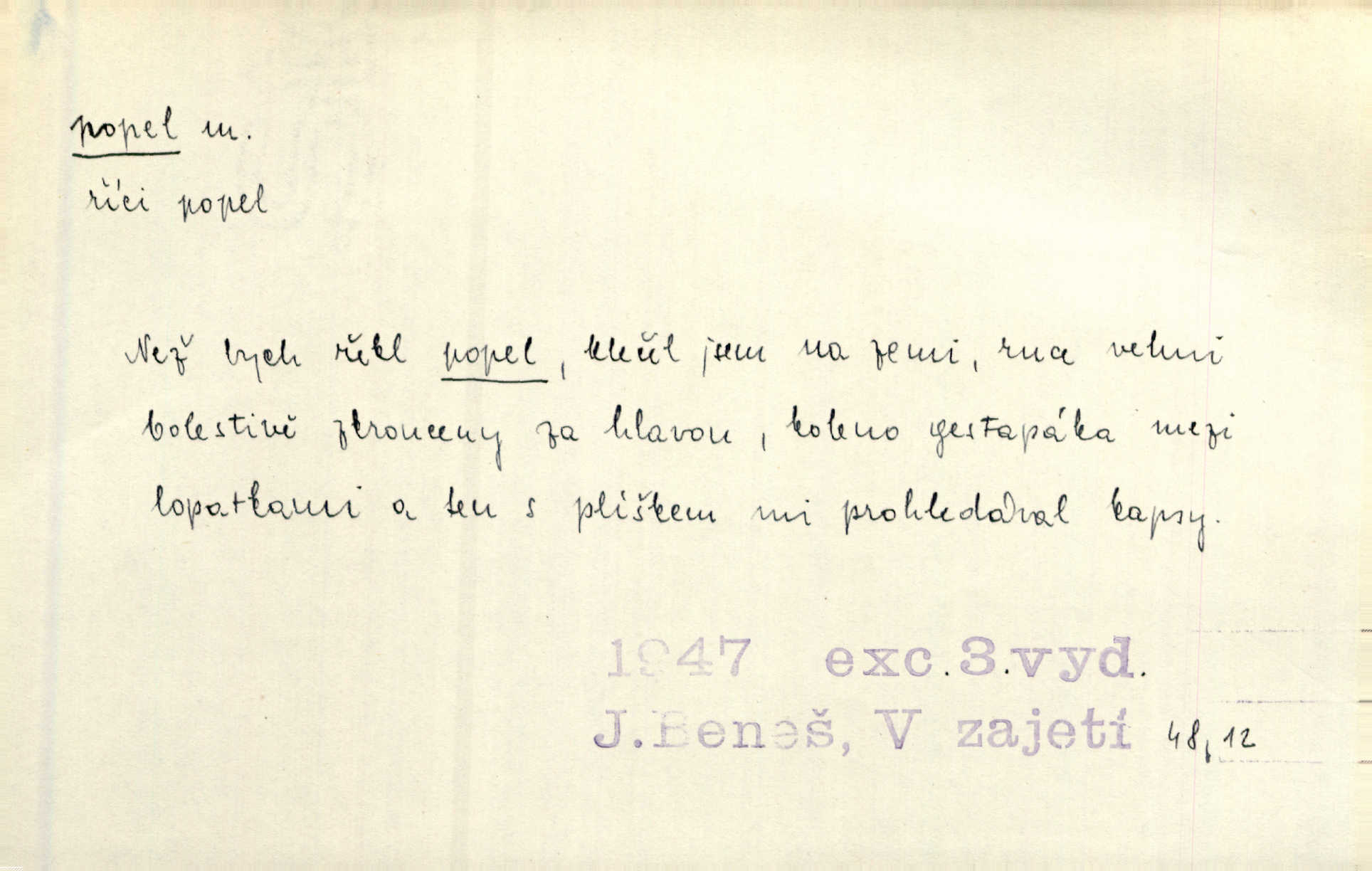 - popel, -a n. -u, arch. -e (lok. -u, arch. -e, -i) m. šedý práškovitý zbytek po spálení. Na dvoře kupily se ohořelé a ještě doutnající trámy, popel, uhlí a hromady rumu. Jir. Hrabali lidé v popele a v oharkách, aby našli škváry svého jmění. Jir. Otřepával popel s doutníku. Kosm. Spálila jsem večeři na popel. Zey. Sem se vyhazuje smetí a vynáší popel. Ner. [Babička] šťourá pohrabáčem v popeli. Něm. Záští [v Hrabcovi] doutnalo jen jako žížlavý uhel pod popelem. Herb. Oni se tam [v Praze] ztratí jako zrnko máku v popelu. Jir. Obloha byla jako popel. Rais. Ustál. sp. Měl kovář popel na jazyku chuť popelu. Vrch. Skloněnou hlavu měl [kněz] popelem posypanou na znamení pokory a pokání. Jir. Na hlavách popel, na prsou roztrhané černé šaty jsme prosili. Vrch. Obrátiti v popel, položiti popelem spáliti; lehnouti popelem shořeti. V sakristii skoro všecko v popel obráceno, ornáty a všecka kostelní roucha. Jir. Vítězové střechy poražených položí prachem a popelem. Hol. Celá usedlost lehla popelem. Baar. Přen. Nakládání Verunčino vrhlo do mrtvého popela duše jeho jiskru živou, novou. Šmil. Nehrab déle v popeli mé duše. Vrch. Chem. neústrojný zbytek vzniklý pálením n. pražením rud a p. Popel antimonový, cínový, zinkový, popel kostní, dřevní a j. D Bás. šedá, šedavá barva, šedavé zabarvení. [Měsíc] byl jako oheň dohořívající a hynul v popeli šedých mraků. Jir. S nebe padal studený popel úsvitu. Šrám. Popely soumraku zachmuřují a stísňují oddech kraje. Mod. r. D zetlelé pozůstatky zemřelých. Maminka je jistě dávno prach a popel. Rais. Pokoj jejich [mrtvých přátel] popelům. Jir. To slibuji vam při svatém popeli zesnulé matky své. Jedl. Pokoj popeli jeho! Tyl.