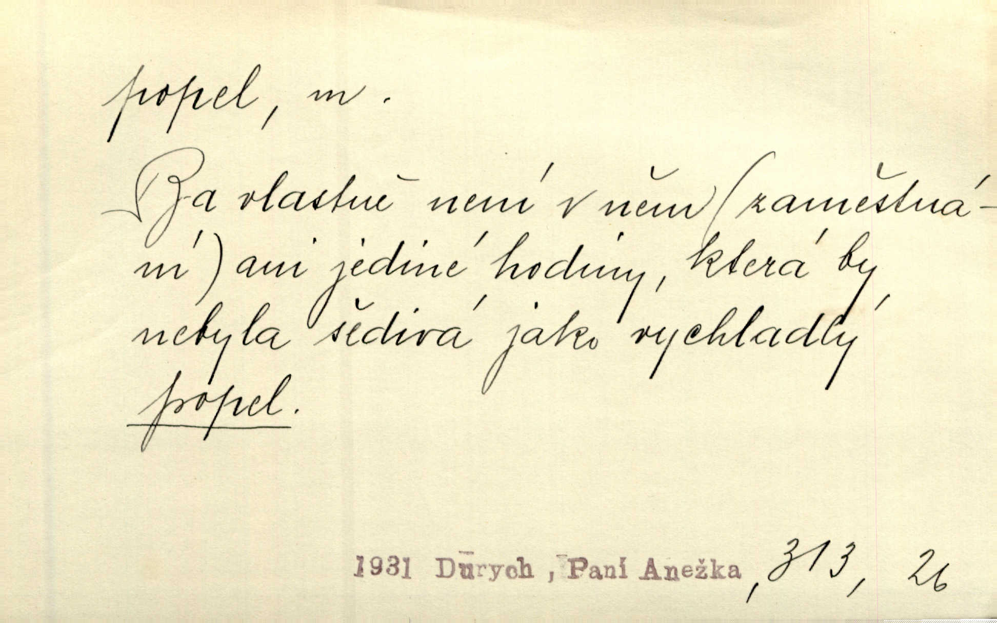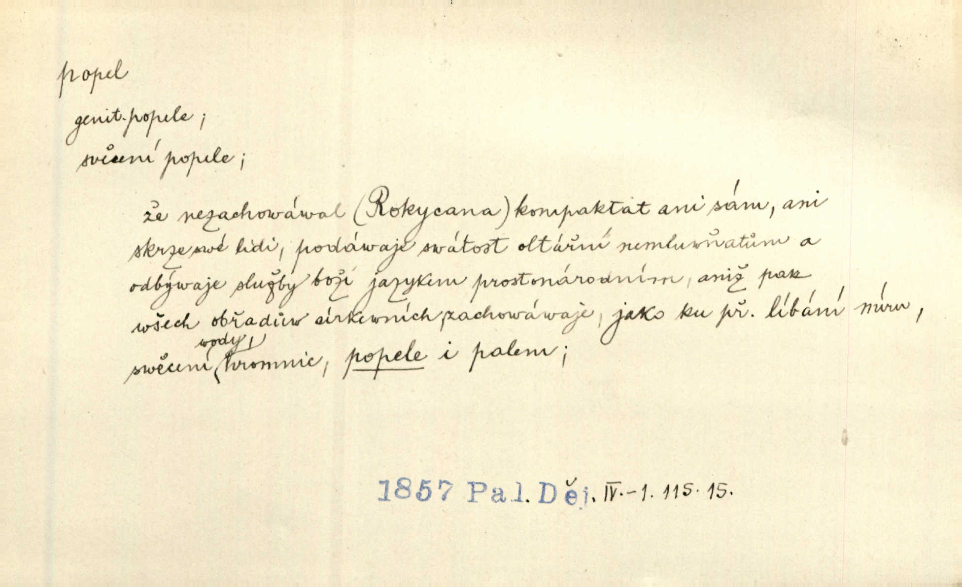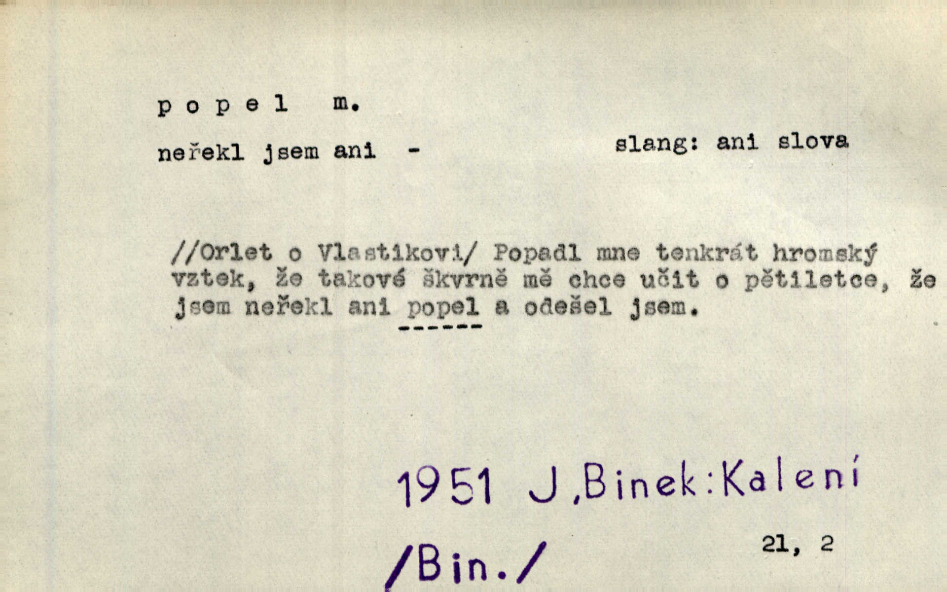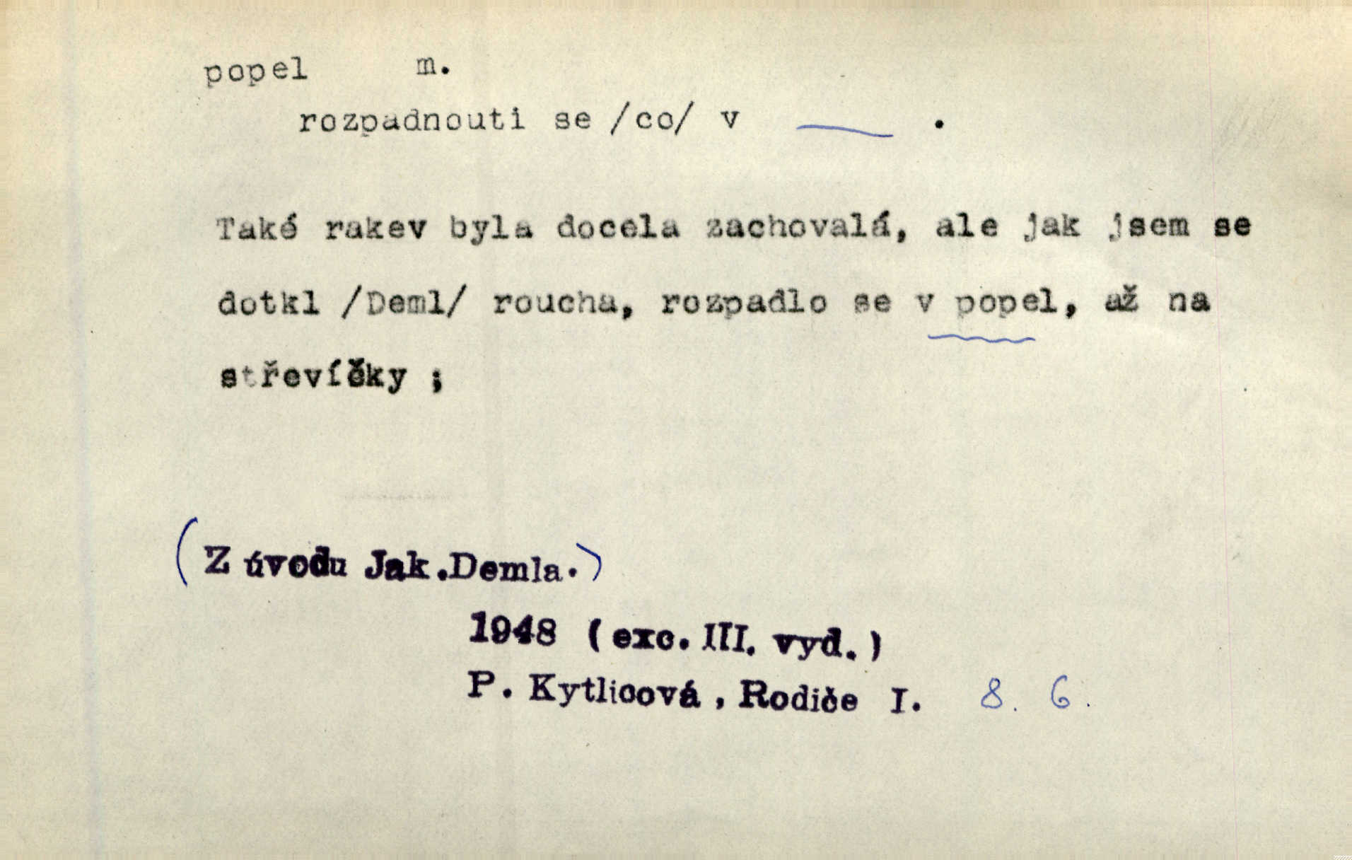 - popel, -a n. -u, arch. -e (lok. -u, arch. -e, -i) m. šedý práškovitý zbytek po spálení. Na dvoře kupily se ohořelé a ještě doutnající trámy, popel, uhlí a hromady rumu. Jir. Hrabali lidé v popele a v oharkách, aby našli škváry svého jmění. Jir. Otřepával popel s doutníku. Kosm. Spálila jsem večeři na popel. Zey. Sem se vyhazuje smetí a vynáší popel. Ner. [Babička] šťourá pohrabáčem v popeli. Něm. Záští [v Hrabcovi] doutnalo jen jako žížlavý uhel pod popelem. Herb. Oni se tam [v Praze] ztratí jako zrnko máku v popelu. Jir. Obloha byla jako popel. Rais. Ustál. sp. Měl kovář popel na jazyku chuť popelu. Vrch. Skloněnou hlavu měl [kněz] popelem posypanou na znamení pokory a pokání. Jir. Na hlavách popel, na prsou roztrhané černé šaty jsme prosili. Vrch. Obrátiti v popel, položiti popelem spáliti; lehnouti popelem shořeti. V sakristii skoro všecko v popel obráceno, ornáty a všecka kostelní roucha. Jir. Vítězové střechy poražených položí prachem a popelem. Hol. Celá usedlost lehla popelem. Baar. Přen. Nakládání Verunčino vrhlo do mrtvého popela duše jeho jiskru živou, novou. Šmil. Nehrab déle v popeli mé duše. Vrch. Chem. neústrojný zbytek vzniklý pálením n. pražením rud a p. Popel antimonový, cínový, zinkový, popel kostní, dřevní a j. D Bás. šedá, šedavá barva, šedavé zabarvení. [Měsíc] byl jako oheň dohořívající a hynul v popeli šedých mraků. Jir. S nebe padal studený popel úsvitu. Šrám. Popely soumraku zachmuřují a stísňují oddech kraje. Mod. r. D zetlelé pozůstatky zemřelých. Maminka je jistě dávno prach a popel. Rais. Pokoj jejich [mrtvých přátel] popelům. Jir. To slibuji vam při svatém popeli zesnulé matky své. Jedl. Pokoj popeli jeho! Tyl.