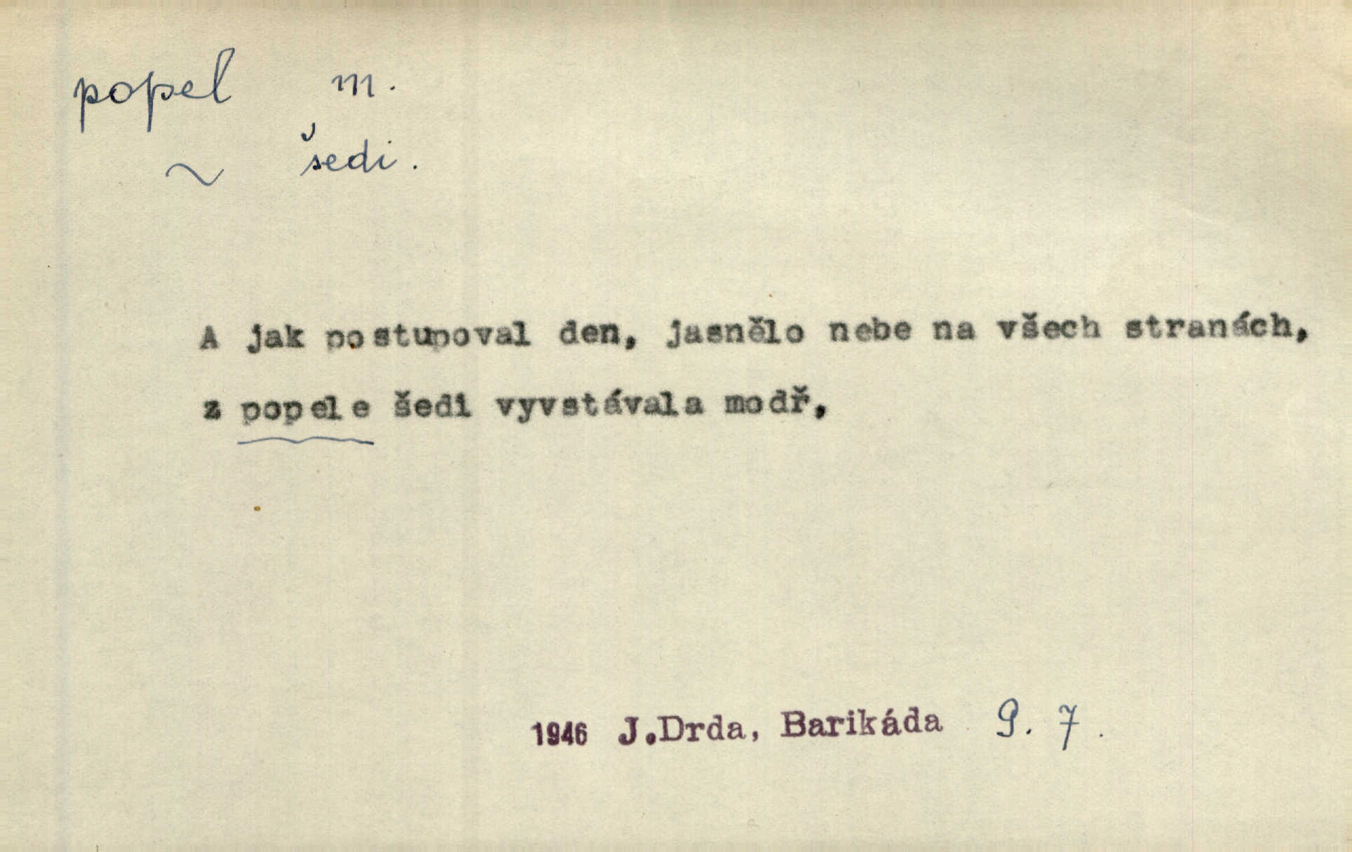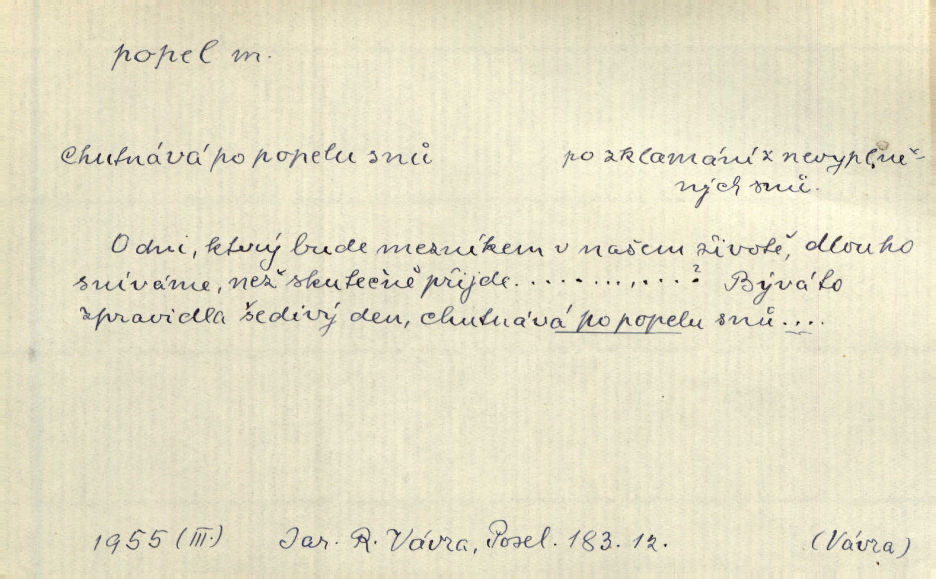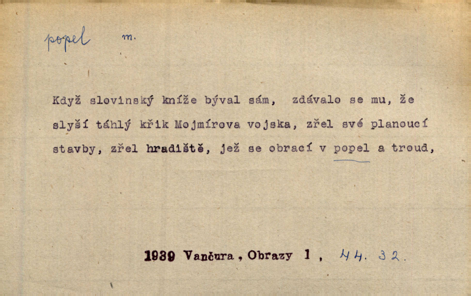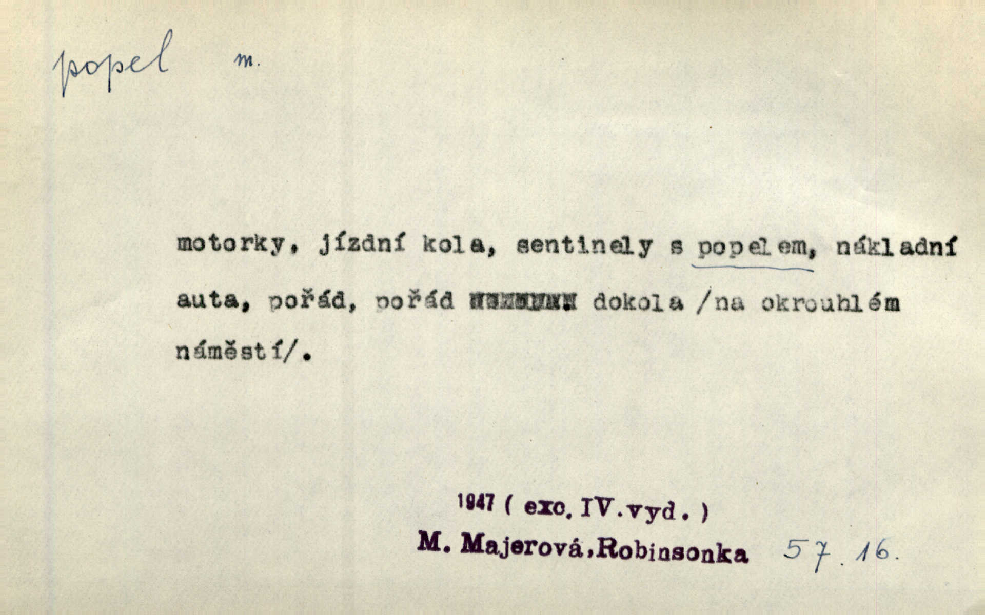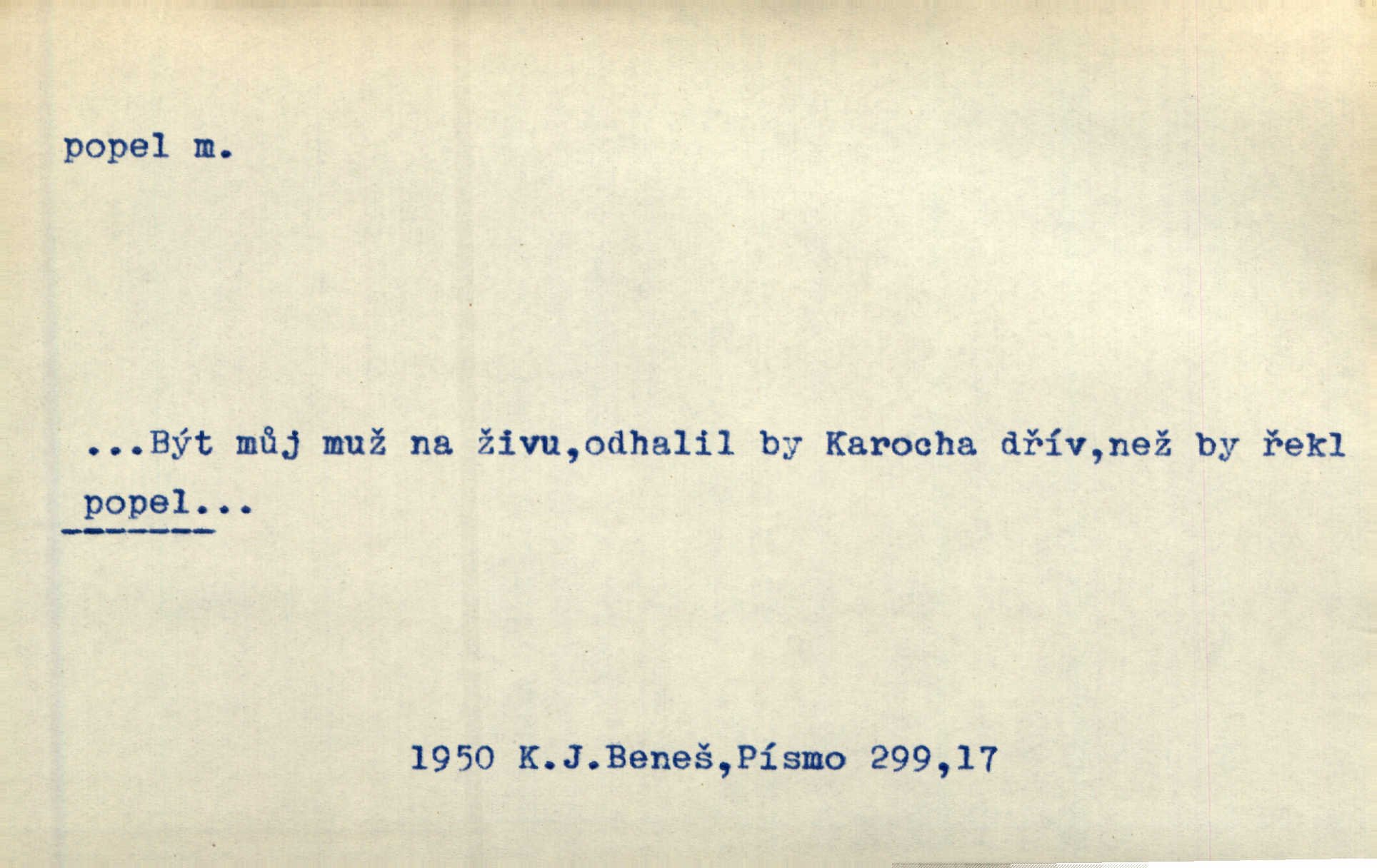- popel, -a n. -u, arch. -e (lok. -u, arch. -e, -i) m. šedý práškovitý zbytek po spálení. Na dvoře kupily se ohořelé a ještě doutnající trámy, popel, uhlí a hromady rumu. Jir. Hrabali lidé v popele a v oharkách, aby našli škváry svého jmění. Jir. Otřepával popel s doutníku. Kosm. Spálila jsem večeři na popel. Zey. Sem se vyhazuje smetí a vynáší popel. Ner. [Babička] šťourá pohrabáčem v popeli. Něm. Záští [v Hrabcovi] doutnalo jen jako žížlavý uhel pod popelem. Herb. Oni se tam [v Praze] ztratí jako zrnko máku v popelu. Jir. Obloha byla jako popel. Rais. Ustál. sp. Měl kovář popel na jazyku chuť popelu. Vrch. Skloněnou hlavu měl [kněz] popelem posypanou na znamení pokory a pokání. Jir. Na hlavách popel, na prsou roztrhané černé šaty jsme prosili. Vrch. Obrátiti v popel, položiti popelem spáliti; lehnouti popelem shořeti. V sakristii skoro všecko v popel obráceno, ornáty a všecka kostelní roucha. Jir. Vítězové střechy poražených položí prachem a popelem. Hol. Celá usedlost lehla popelem. Baar. Přen. Nakládání Verunčino vrhlo do mrtvého popela duše jeho jiskru živou, novou. Šmil. Nehrab déle v popeli mé duše. Vrch. Chem. neústrojný zbytek vzniklý pálením n. pražením rud a p. Popel antimonový, cínový, zinkový, popel kostní, dřevní a j. D Bás. šedá, šedavá barva, šedavé zabarvení. [Měsíc] byl jako oheň dohořívající a hynul v popeli šedých mraků. Jir. S nebe padal studený popel úsvitu. Šrám. Popely soumraku zachmuřují a stísňují oddech kraje. Mod. r. D zetlelé pozůstatky zemřelých. Maminka je jistě dávno prach a popel. Rais. Pokoj jejich [mrtvých přátel] popelům. Jir. To slibuji vam při svatém popeli zesnulé matky své. Jedl. Pokoj popeli jeho! Tyl.