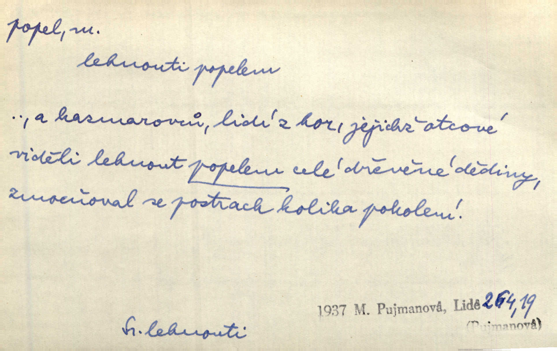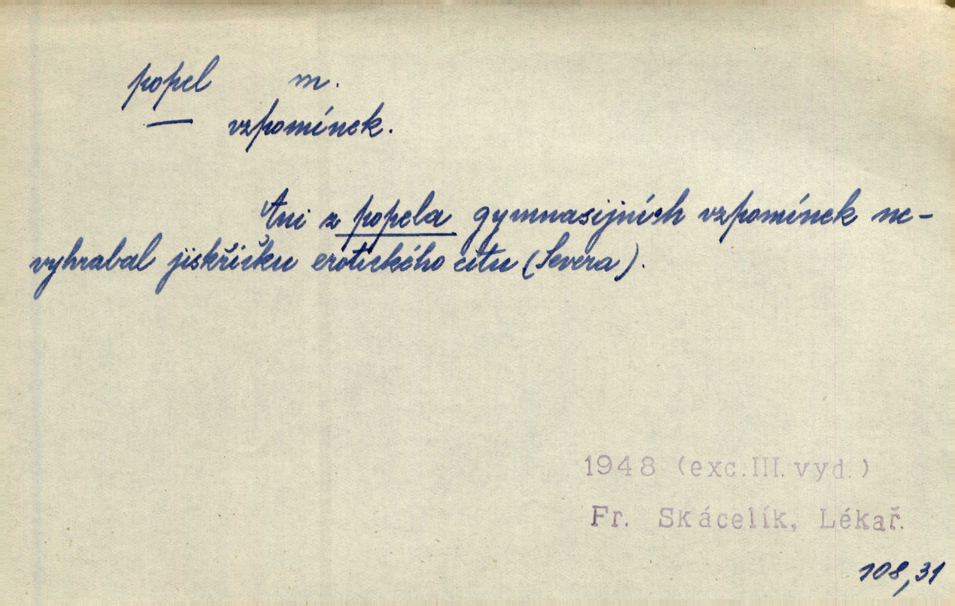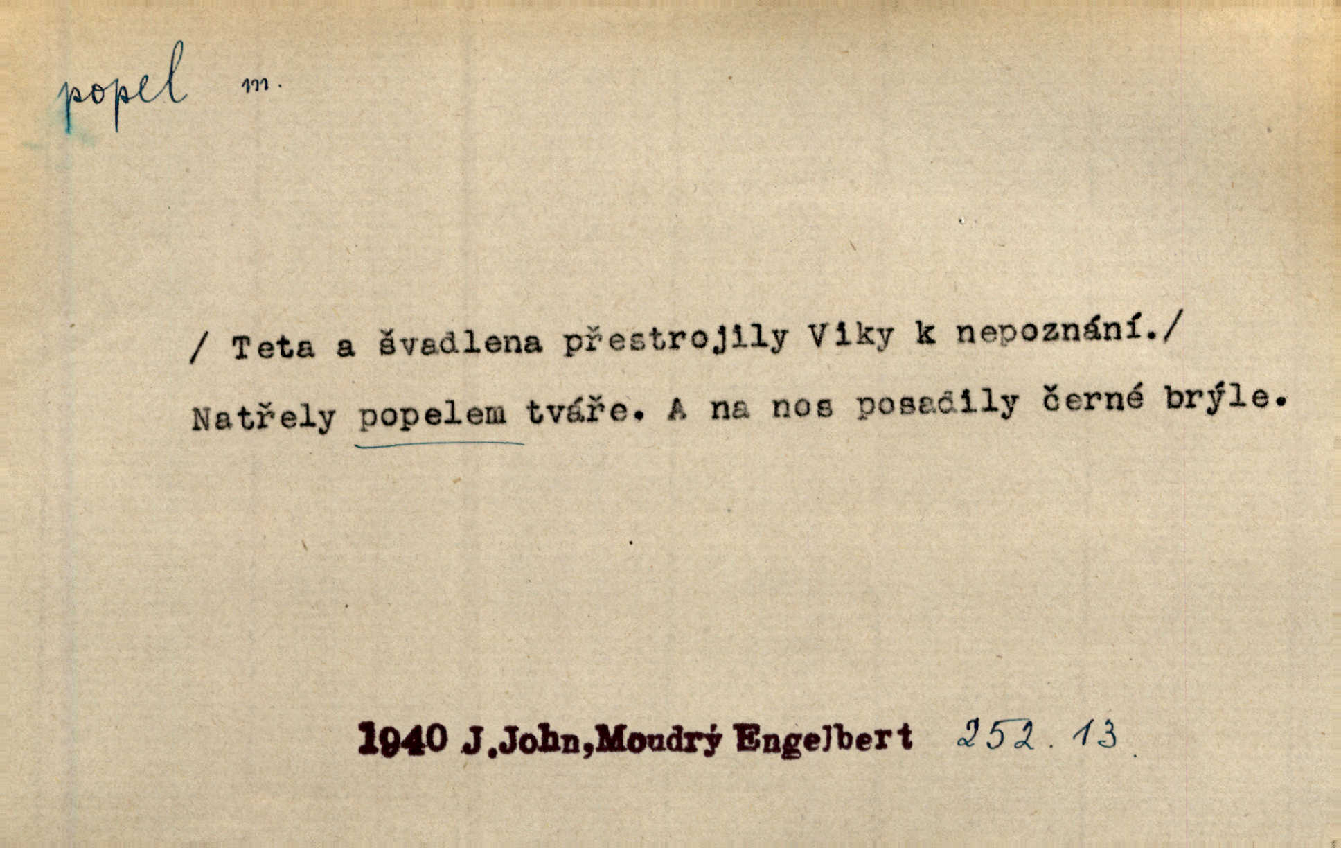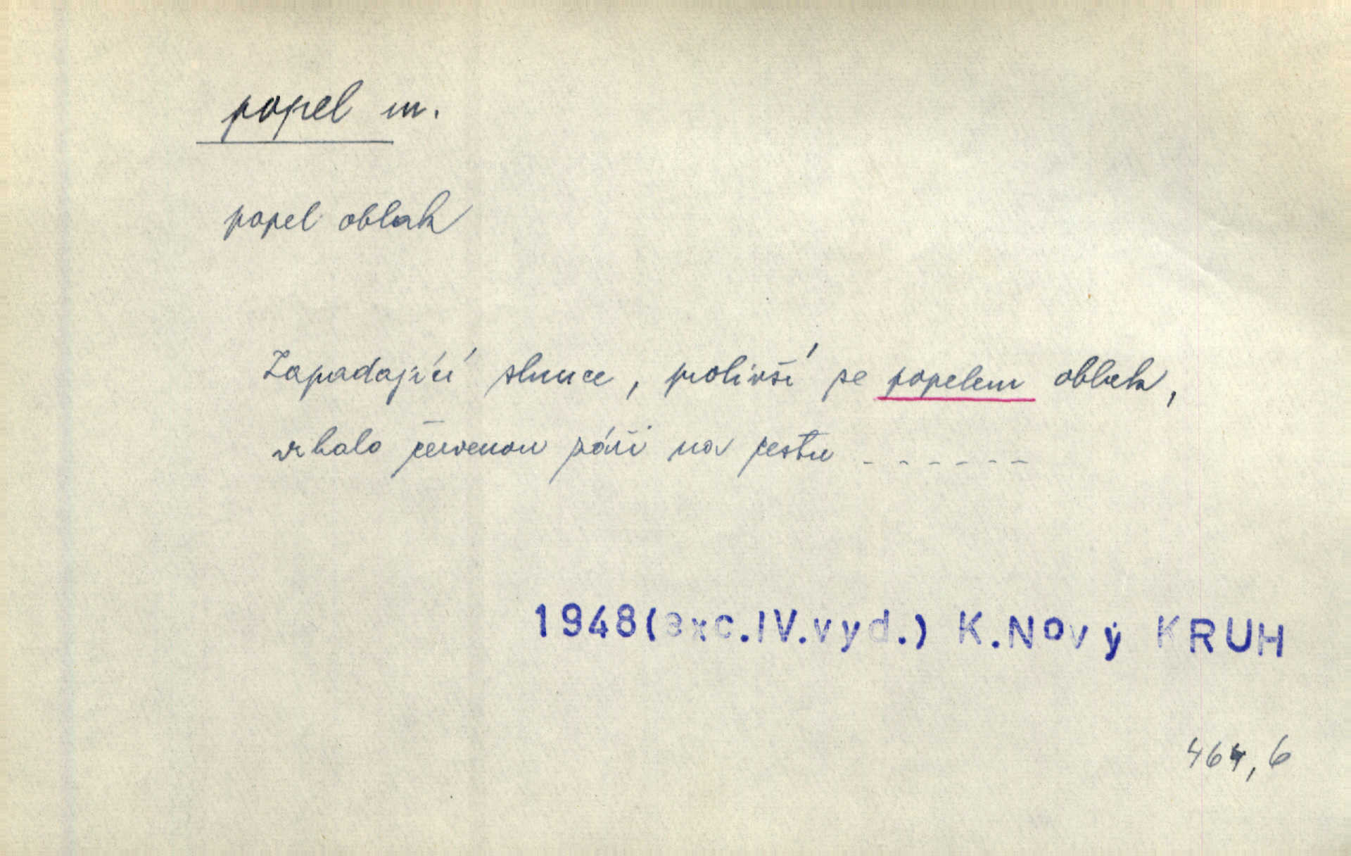 - popel, -a n. -u, arch. -e (lok. -u, arch. -e, -i) m. šedý práškovitý zbytek po spálení. Na dvoře kupily se ohořelé a ještě doutnající trámy, popel, uhlí a hromady rumu. Jir. Hrabali lidé v popele a v oharkách, aby našli škváry svého jmění. Jir. Otřepával popel s doutníku. Kosm. Spálila jsem večeři na popel. Zey. Sem se vyhazuje smetí a vynáší popel. Ner. [Babička] šťourá pohrabáčem v popeli. Něm. Záští [v Hrabcovi] doutnalo jen jako žížlavý uhel pod popelem. Herb. Oni se tam [v Praze] ztratí jako zrnko máku v popelu. Jir. Obloha byla jako popel. Rais. Ustál. sp. Měl kovář popel na jazyku chuť popelu. Vrch. Skloněnou hlavu měl [kněz] popelem posypanou na znamení pokory a pokání. Jir. Na hlavách popel, na prsou roztrhané černé šaty jsme prosili. Vrch. Obrátiti v popel, položiti popelem spáliti; lehnouti popelem shořeti. V sakristii skoro všecko v popel obráceno, ornáty a všecka kostelní roucha. Jir. Vítězové střechy poražených položí prachem a popelem. Hol. Celá usedlost lehla popelem. Baar. Přen. Nakládání Verunčino vrhlo do mrtvého popela duše jeho jiskru živou, novou. Šmil. Nehrab déle v popeli mé duše. Vrch. Chem. neústrojný zbytek vzniklý pálením n. pražením rud a p. Popel antimonový, cínový, zinkový, popel kostní, dřevní a j. D Bás. šedá, šedavá barva, šedavé zabarvení. [Měsíc] byl jako oheň dohořívající a hynul v popeli šedých mraků. Jir. S nebe padal studený popel úsvitu. Šrám. Popely soumraku zachmuřují a stísňují oddech kraje. Mod. r. D zetlelé pozůstatky zemřelých. Maminka je jistě dávno prach a popel. Rais. Pokoj jejich [mrtvých přátel] popelům. Jir. To slibuji vam při svatém popeli zesnulé matky své. Jedl. Pokoj popeli jeho! Tyl.