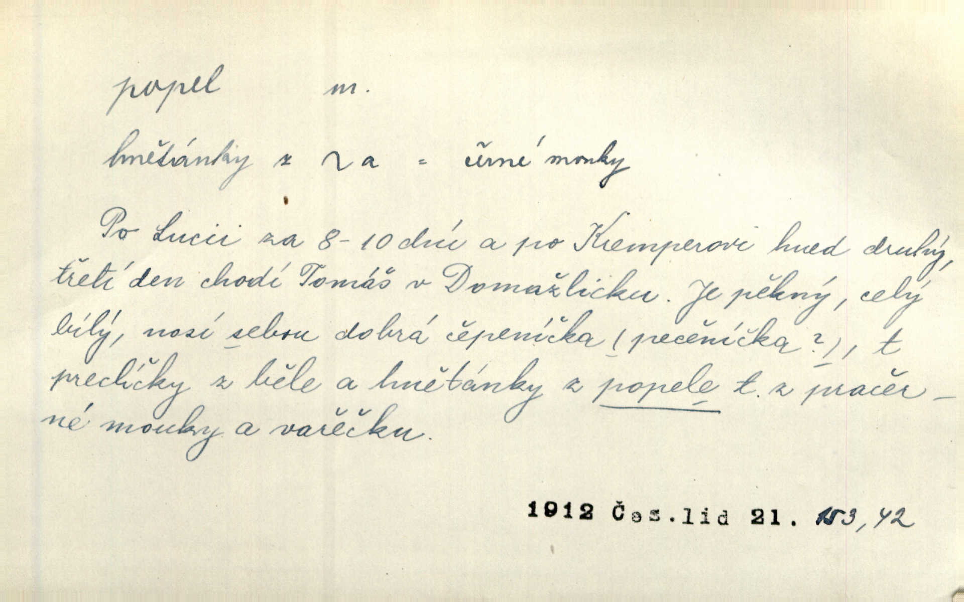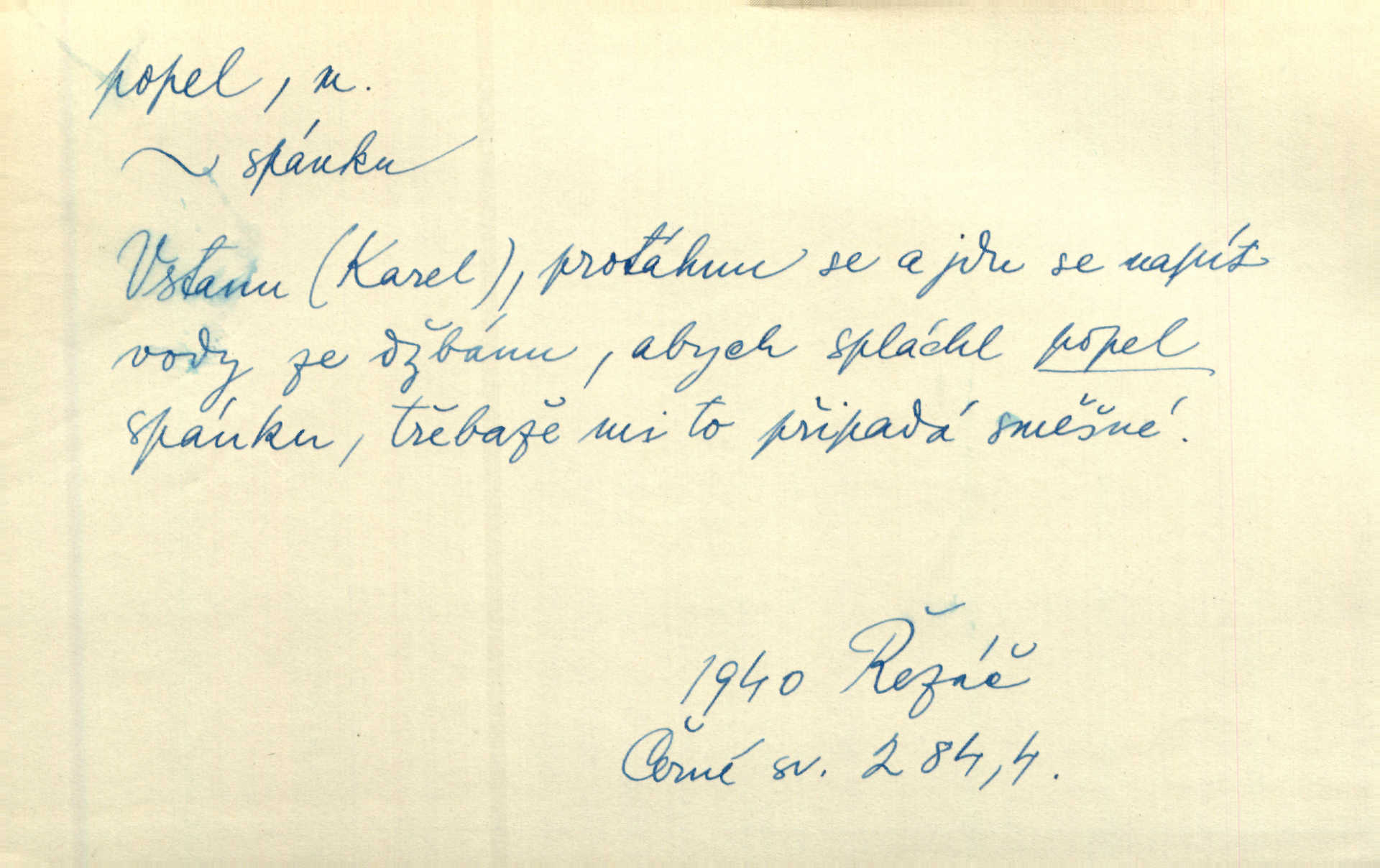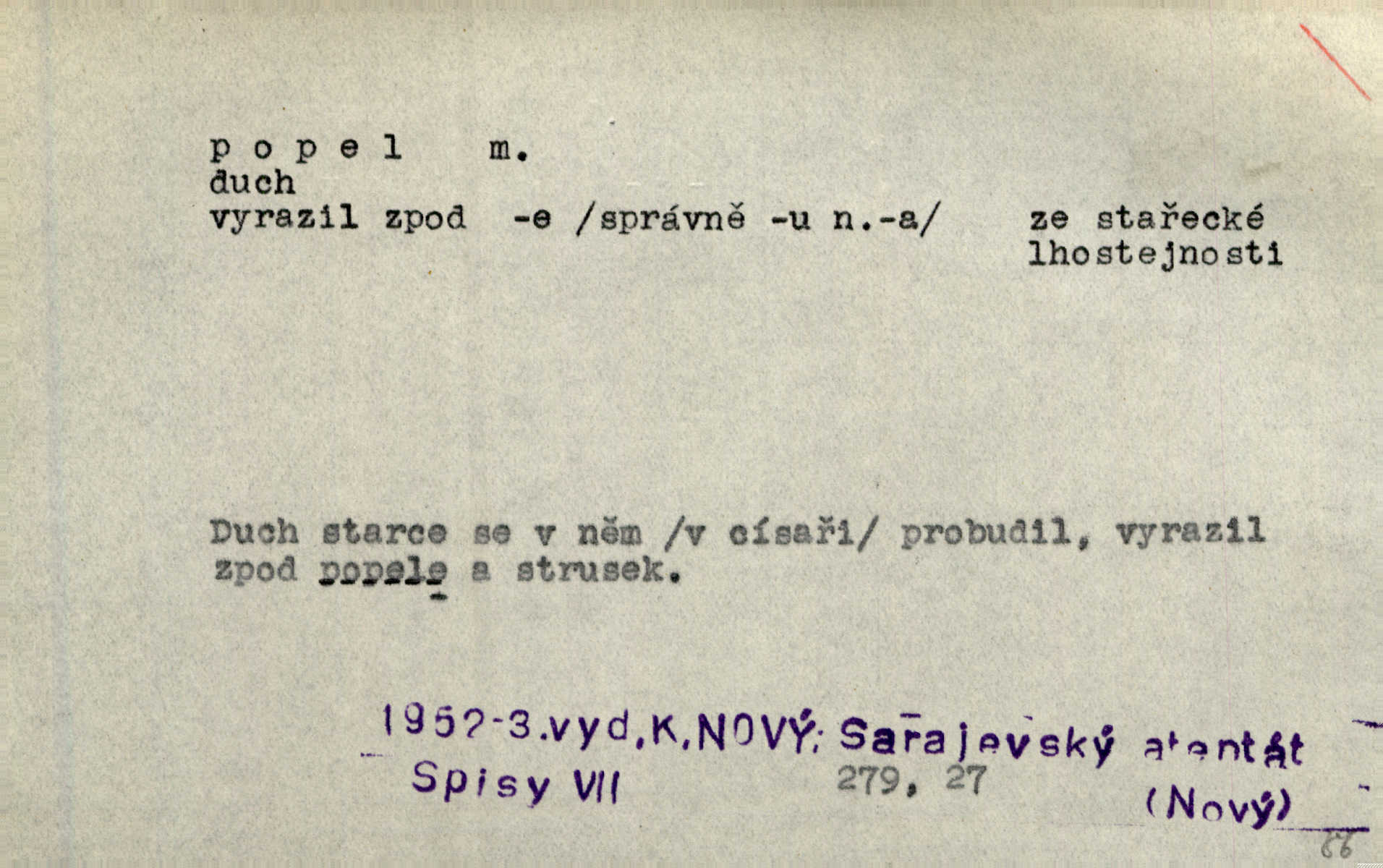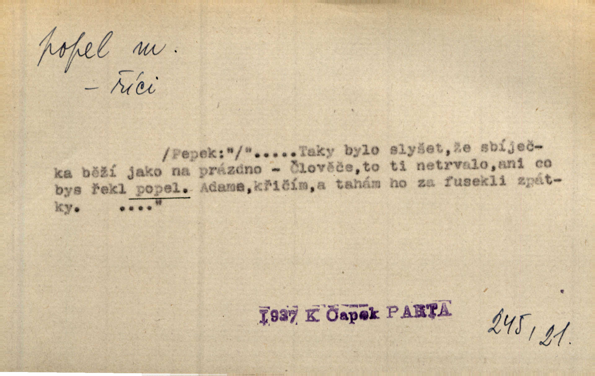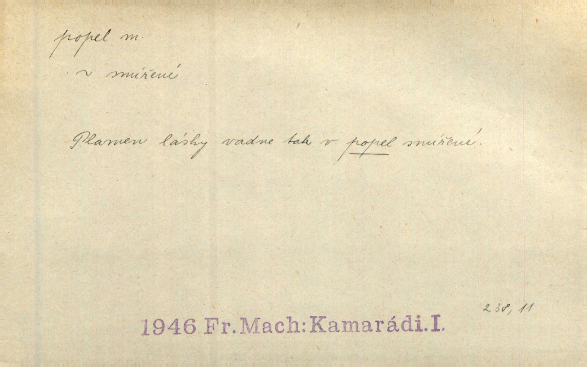 - popel, -a n. -u, arch. -e (lok. -u, arch. -e, -i) m. šedý práškovitý zbytek po spálení. Na dvoře kupily se ohořelé a ještě doutnající trámy, popel, uhlí a hromady rumu. Jir. Hrabali lidé v popele a v oharkách, aby našli škváry svého jmění. Jir. Otřepával popel s doutníku. Kosm. Spálila jsem večeři na popel. Zey. Sem se vyhazuje smetí a vynáší popel. Ner. [Babička] šťourá pohrabáčem v popeli. Něm. Záští [v Hrabcovi] doutnalo jen jako žížlavý uhel pod popelem. Herb. Oni se tam [v Praze] ztratí jako zrnko máku v popelu. Jir. Obloha byla jako popel. Rais. Ustál. sp. Měl kovář popel na jazyku chuť popelu. Vrch. Skloněnou hlavu měl [kněz] popelem posypanou na znamení pokory a pokání. Jir. Na hlavách popel, na prsou roztrhané černé šaty jsme prosili. Vrch. Obrátiti v popel, položiti popelem spáliti; lehnouti popelem shořeti. V sakristii skoro všecko v popel obráceno, ornáty a všecka kostelní roucha. Jir. Vítězové střechy poražených položí prachem a popelem. Hol. Celá usedlost lehla popelem. Baar. Přen. Nakládání Verunčino vrhlo do mrtvého popela duše jeho jiskru živou, novou. Šmil. Nehrab déle v popeli mé duše. Vrch. Chem. neústrojný zbytek vzniklý pálením n. pražením rud a p. Popel antimonový, cínový, zinkový, popel kostní, dřevní a j. D Bás. šedá, šedavá barva, šedavé zabarvení. [Měsíc] byl jako oheň dohořívající a hynul v popeli šedých mraků. Jir. S nebe padal studený popel úsvitu. Šrám. Popely soumraku zachmuřují a stísňují oddech kraje. Mod. r. D zetlelé pozůstatky zemřelých. Maminka je jistě dávno prach a popel. Rais. Pokoj jejich [mrtvých přátel] popelům. Jir. To slibuji vam při svatém popeli zesnulé matky své. Jedl. Pokoj popeli jeho! Tyl.