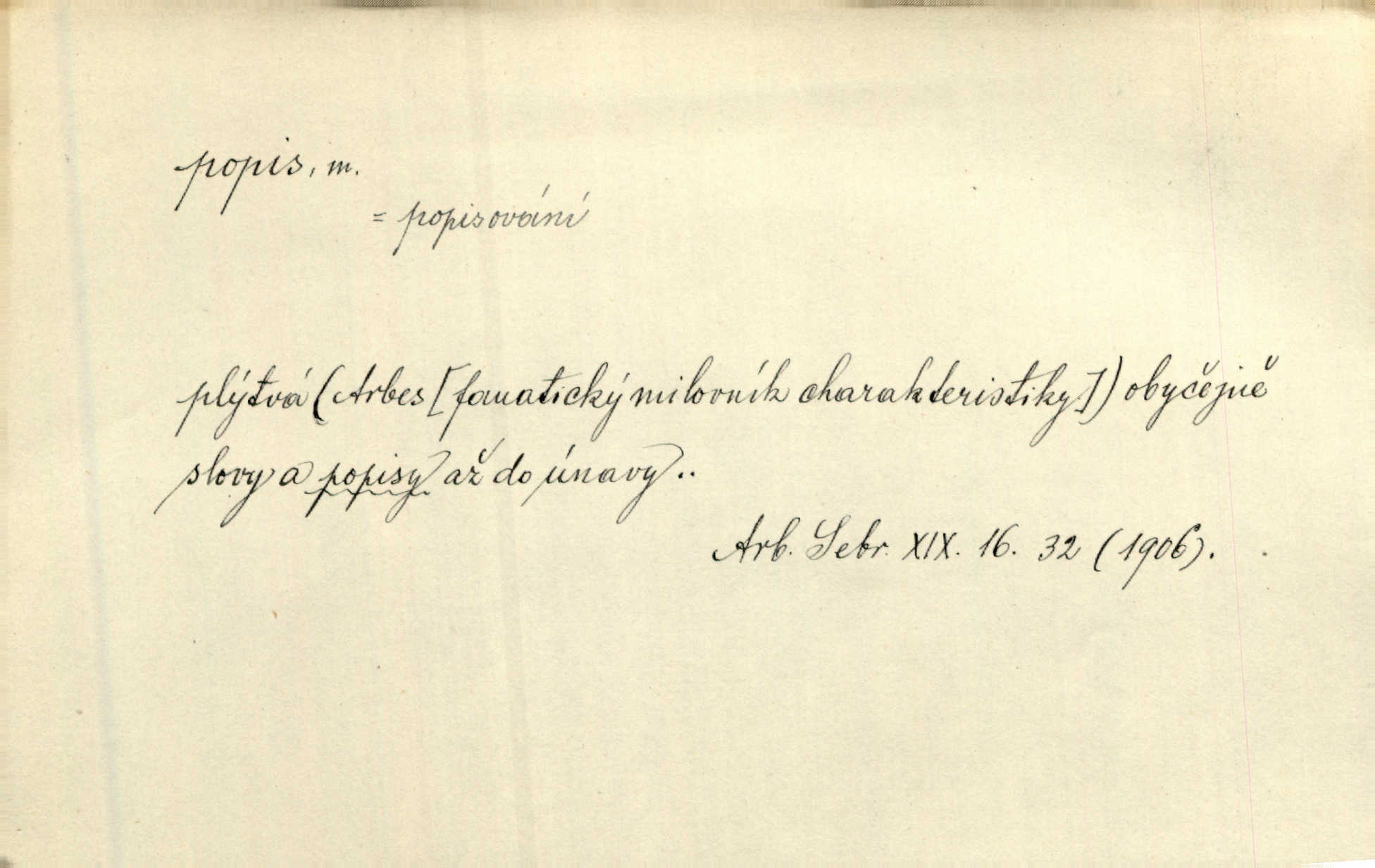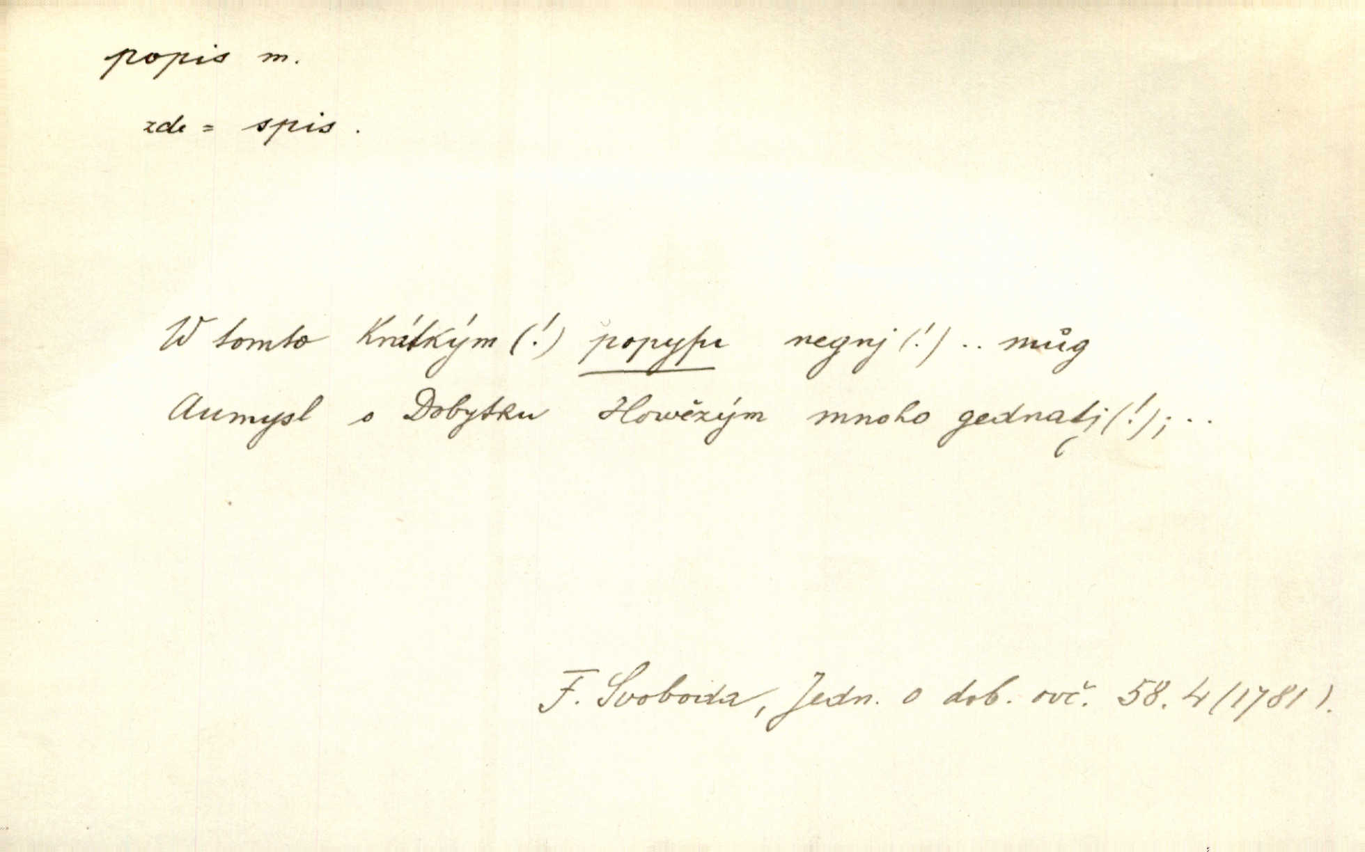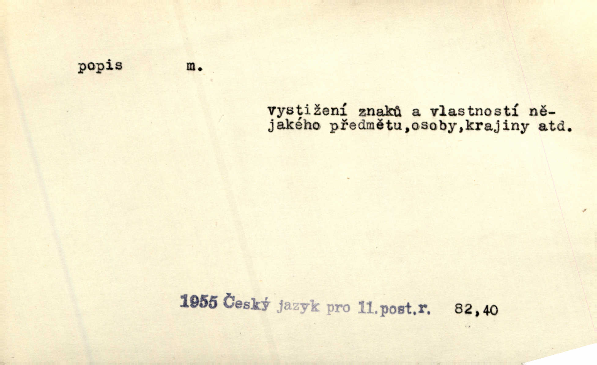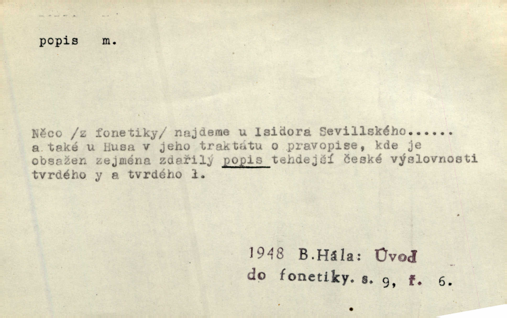 - popis, -u m. souvislá charakteristika podoby někoho n. něčeho. Přikročíme k popisu osad, které na Dyji leží. Bran. Následuje obšírný, dosti básnický a ozdobný popis celé slavnosti. Havl. O pohádku se [Wilde] více zajímá než o přesný popis každodennosti. Kar. Dle tvého popisu jsem chatu našel. Vrch. [Pojezdná] každý týden podrobný popis o tom, co se ve dvoře dělo, zaslati měla. Svět. Střih i s popisy provedení. Hvězda. Villemain vycítil nedostatek methody věd přírodních, která usiluje jen o klassifikaci a popis. Tille. Popis jest až dosud nejrozšířenější formou sociologické literatury. Chalup. D výčet charakteristických znaků osoby, který slouží k zjišťování. [Soudní komise] dala si dívku popsati; ale když souhlasný popis svědkyň porovnán s popisem v čelední knížce, shledáno, že popisy — nesouhlasí. Arb. [Hrabal] musil udati, jak [Josef] vyhlíží, co na sobě měl a co s sebou vzal, když mu utekl. Popis ten se vsadil do novin. Prav. Telegrafujeme, aby byl zadržen cestující na lůžku číslo 14. Můžete nám dát jeho přesný popis? Lid. nov. Malíř ho ihned poznal dle popisu Kalinova. Jir. Zool., bot., fys. a j. odborný výčet znaků něčeho. Úř. kvalifikační popis ocenění osobních vlastností veřejných zaměstnanců, důstojníků a p. Knihovn. část zpracování knihy v knihovně. D soupis, sčítání. Petrohradský mezinárodní kongres statistický z r. 1872 zařadil „La langue parlée“ mezi skutečnosti, jež obligatorně mají býti při všeobecném popisu lidu zjišťovány. Čes. pol. D Tech. popis výkresu, rysu, náčrtku a p. číslice, písmena a nápisy. Zem. popis mapy jména měst, hor, řek a p.