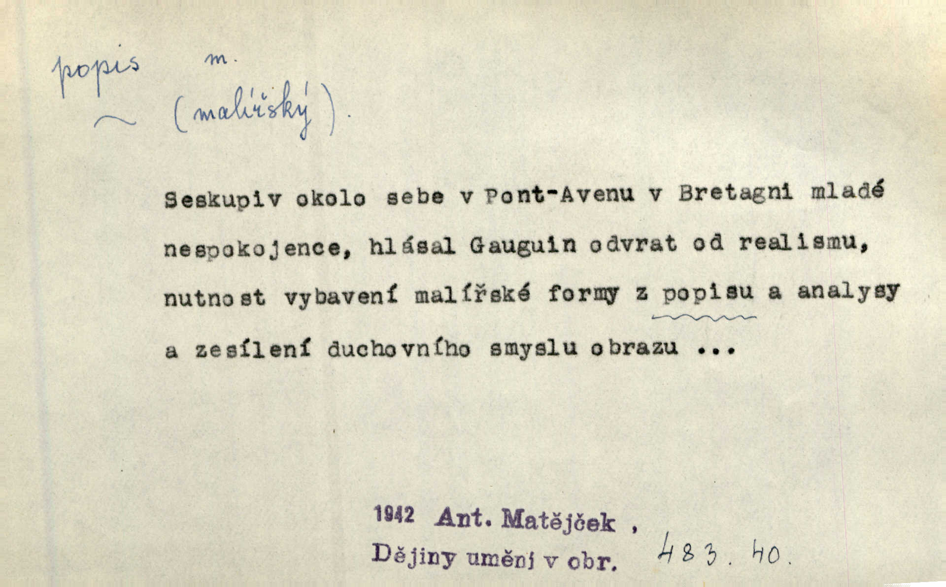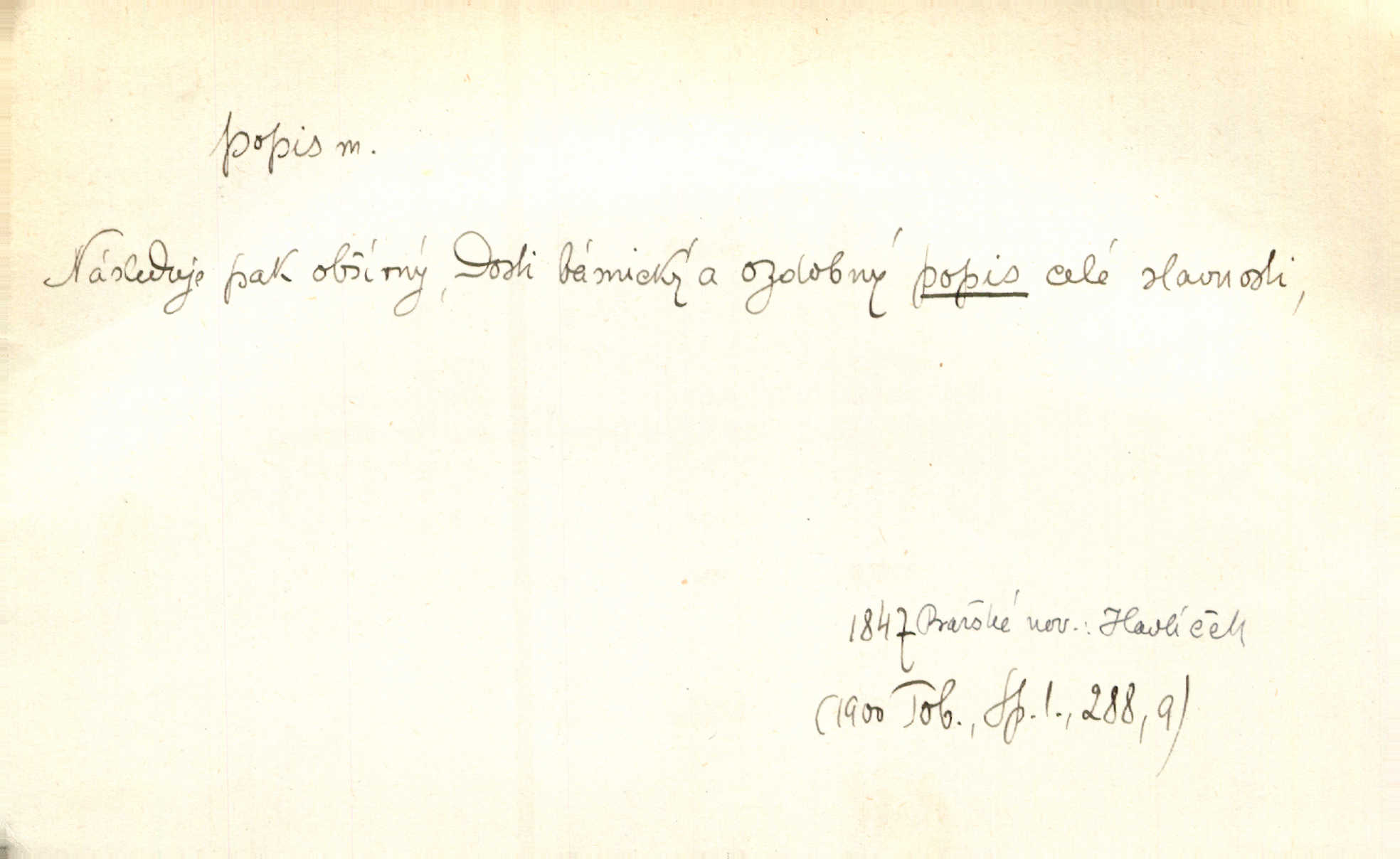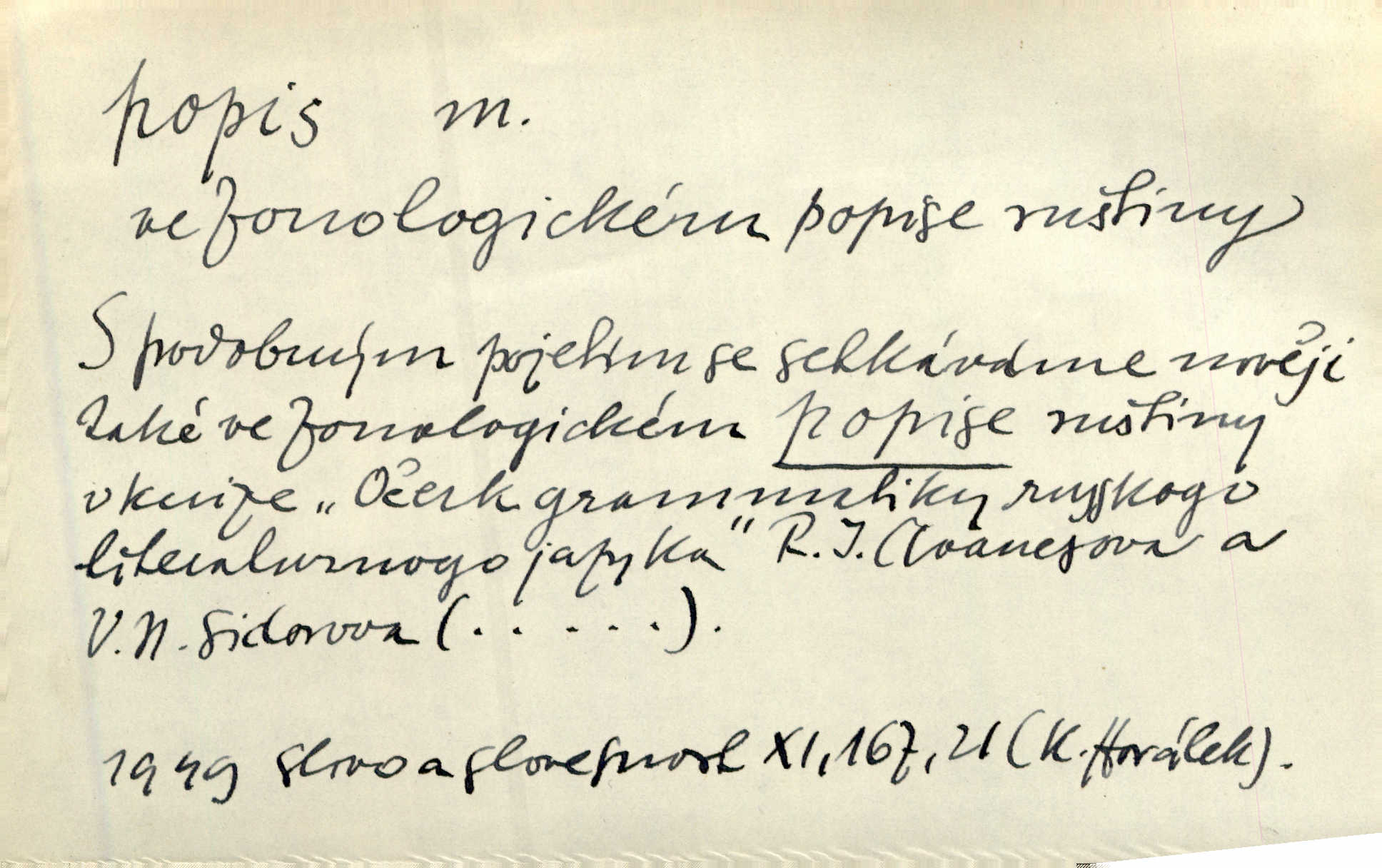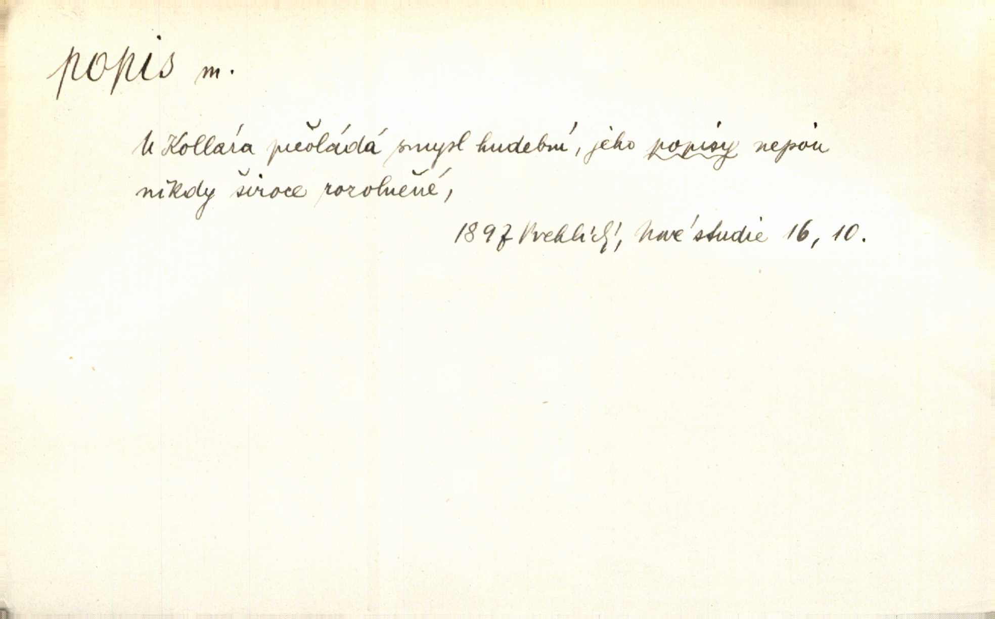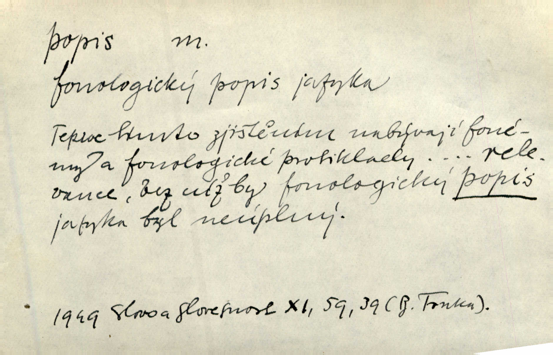 - popis, -u m. souvislá charakteristika podoby někoho n. něčeho. Přikročíme k popisu osad, které na Dyji leží. Bran. Následuje obšírný, dosti básnický a ozdobný popis celé slavnosti. Havl. O pohádku se [Wilde] více zajímá než o přesný popis každodennosti. Kar. Dle tvého popisu jsem chatu našel. Vrch. [Pojezdná] každý týden podrobný popis o tom, co se ve dvoře dělo, zaslati měla. Svět. Střih i s popisy provedení. Hvězda. Villemain vycítil nedostatek methody věd přírodních, která usiluje jen o klassifikaci a popis. Tille. Popis jest až dosud nejrozšířenější formou sociologické literatury. Chalup. D výčet charakteristických znaků osoby, který slouží k zjišťování. [Soudní komise] dala si dívku popsati; ale když souhlasný popis svědkyň porovnán s popisem v čelední knížce, shledáno, že popisy — nesouhlasí. Arb. [Hrabal] musil udati, jak [Josef] vyhlíží, co na sobě měl a co s sebou vzal, když mu utekl. Popis ten se vsadil do novin. Prav. Telegrafujeme, aby byl zadržen cestující na lůžku číslo 14. Můžete nám dát jeho přesný popis? Lid. nov. Malíř ho ihned poznal dle popisu Kalinova. Jir. Zool., bot., fys. a j. odborný výčet znaků něčeho. Úř. kvalifikační popis ocenění osobních vlastností veřejných zaměstnanců, důstojníků a p. Knihovn. část zpracování knihy v knihovně. D soupis, sčítání. Petrohradský mezinárodní kongres statistický z r. 1872 zařadil „La langue parlée“ mezi skutečnosti, jež obligatorně mají býti při všeobecném popisu lidu zjišťovány. Čes. pol. D Tech. popis výkresu, rysu, náčrtku a p. číslice, písmena a nápisy. Zem. popis mapy jména měst, hor, řek a p.