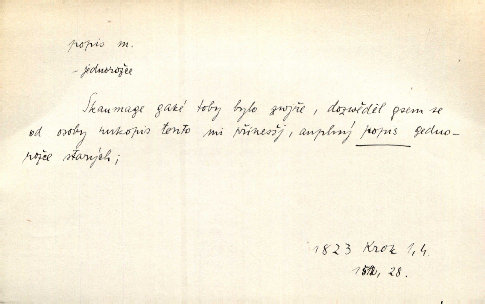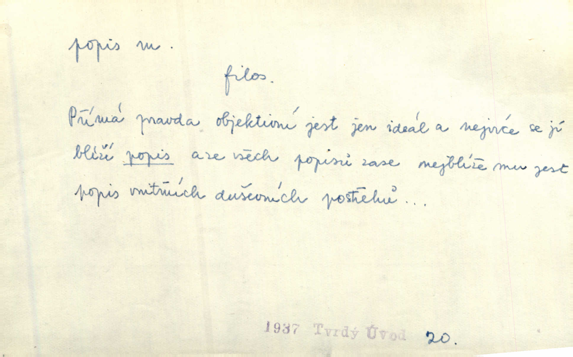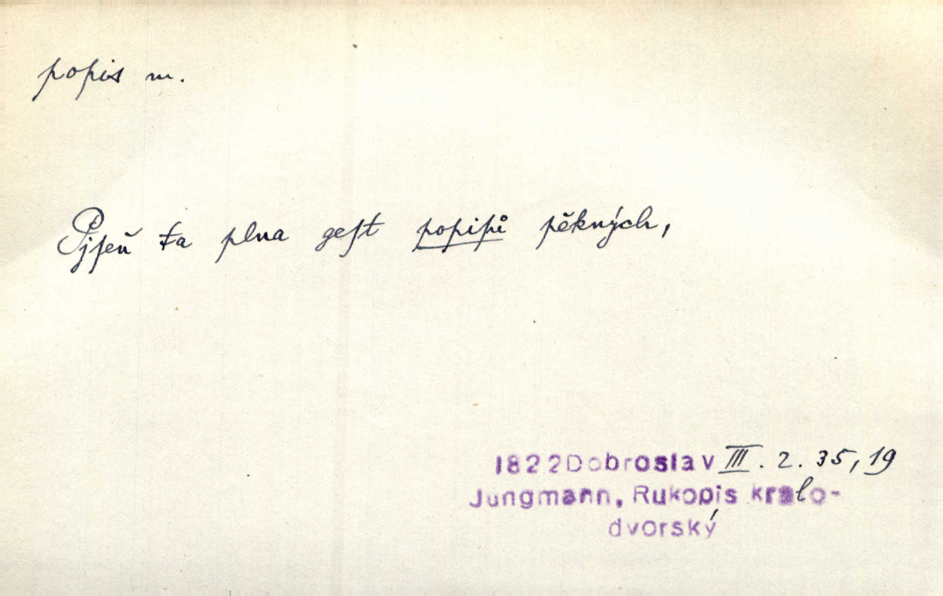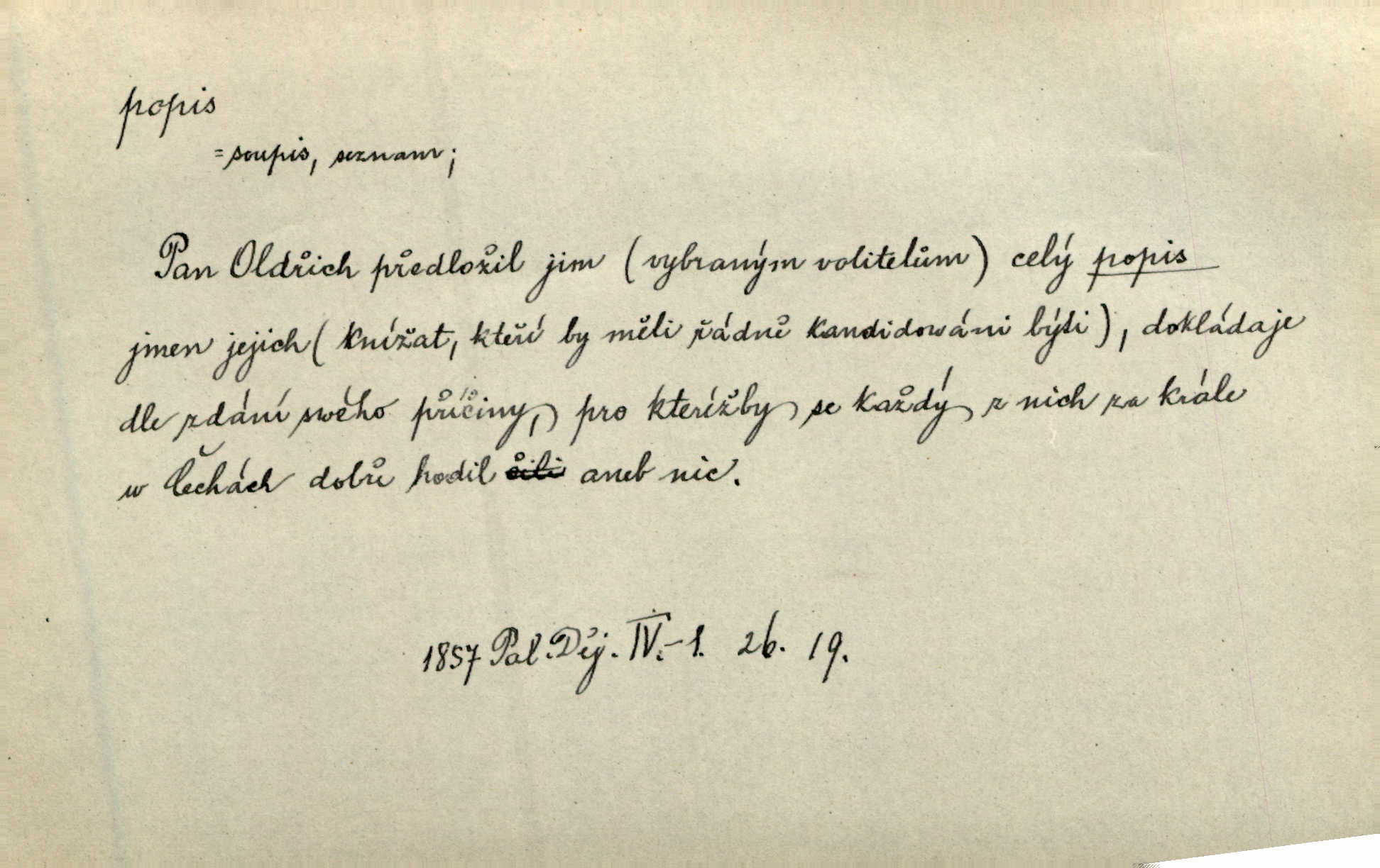 - popis, -u m. souvislá charakteristika podoby někoho n. něčeho. Přikročíme k popisu osad, které na Dyji leží. Bran. Následuje obšírný, dosti básnický a ozdobný popis celé slavnosti. Havl. O pohádku se [Wilde] více zajímá než o přesný popis každodennosti. Kar. Dle tvého popisu jsem chatu našel. Vrch. [Pojezdná] každý týden podrobný popis o tom, co se ve dvoře dělo, zaslati měla. Svět. Střih i s popisy provedení. Hvězda. Villemain vycítil nedostatek methody věd přírodních, která usiluje jen o klassifikaci a popis. Tille. Popis jest až dosud nejrozšířenější formou sociologické literatury. Chalup. D výčet charakteristických znaků osoby, který slouží k zjišťování. [Soudní komise] dala si dívku popsati; ale když souhlasný popis svědkyň porovnán s popisem v čelední knížce, shledáno, že popisy — nesouhlasí. Arb. [Hrabal] musil udati, jak [Josef] vyhlíží, co na sobě měl a co s sebou vzal, když mu utekl. Popis ten se vsadil do novin. Prav. Telegrafujeme, aby byl zadržen cestující na lůžku číslo 14. Můžete nám dát jeho přesný popis? Lid. nov. Malíř ho ihned poznal dle popisu Kalinova. Jir. Zool., bot., fys. a j. odborný výčet znaků něčeho. Úř. kvalifikační popis ocenění osobních vlastností veřejných zaměstnanců, důstojníků a p. Knihovn. část zpracování knihy v knihovně. D soupis, sčítání. Petrohradský mezinárodní kongres statistický z r. 1872 zařadil „La langue parlée“ mezi skutečnosti, jež obligatorně mají býti při všeobecném popisu lidu zjišťovány. Čes. pol. D Tech. popis výkresu, rysu, náčrtku a p. číslice, písmena a nápisy. Zem. popis mapy jména měst, hor, řek a p.