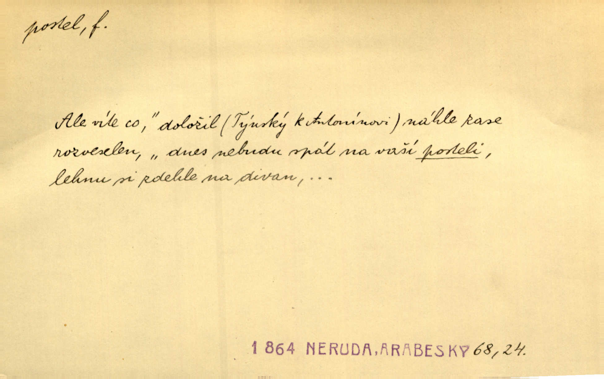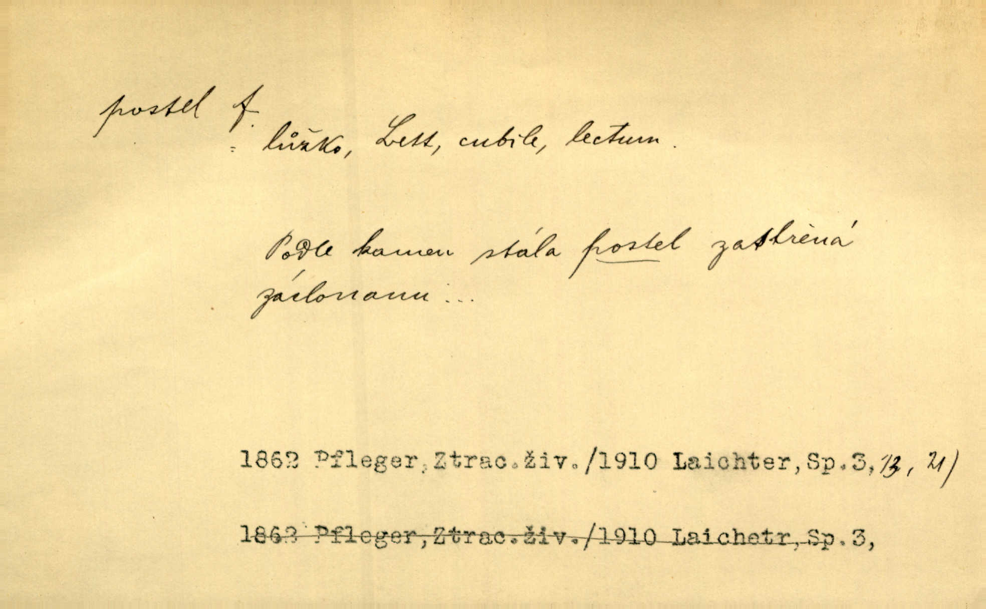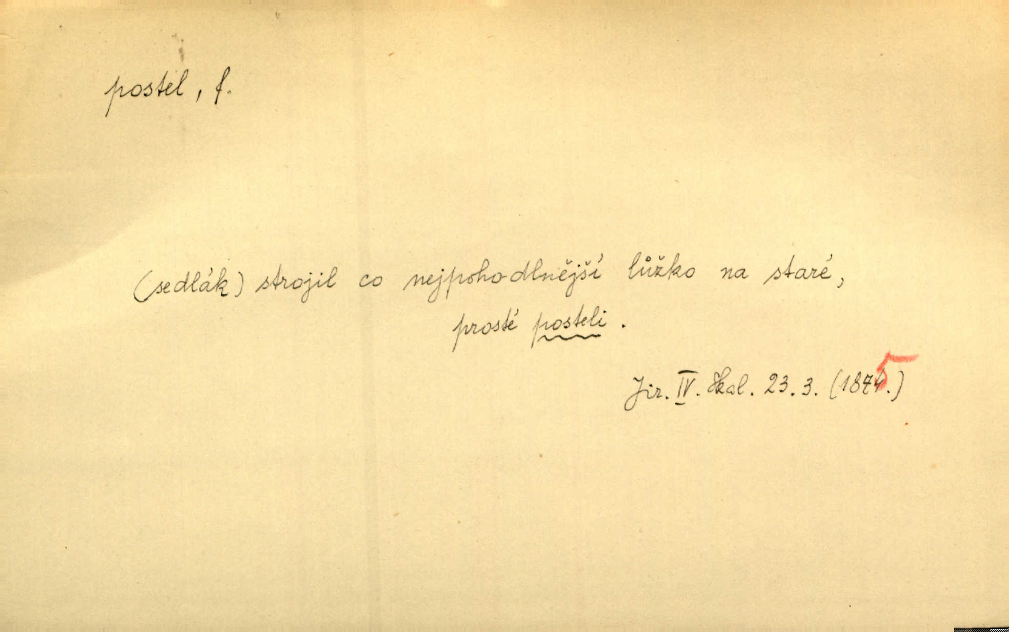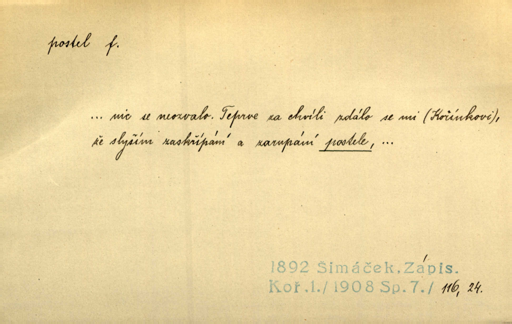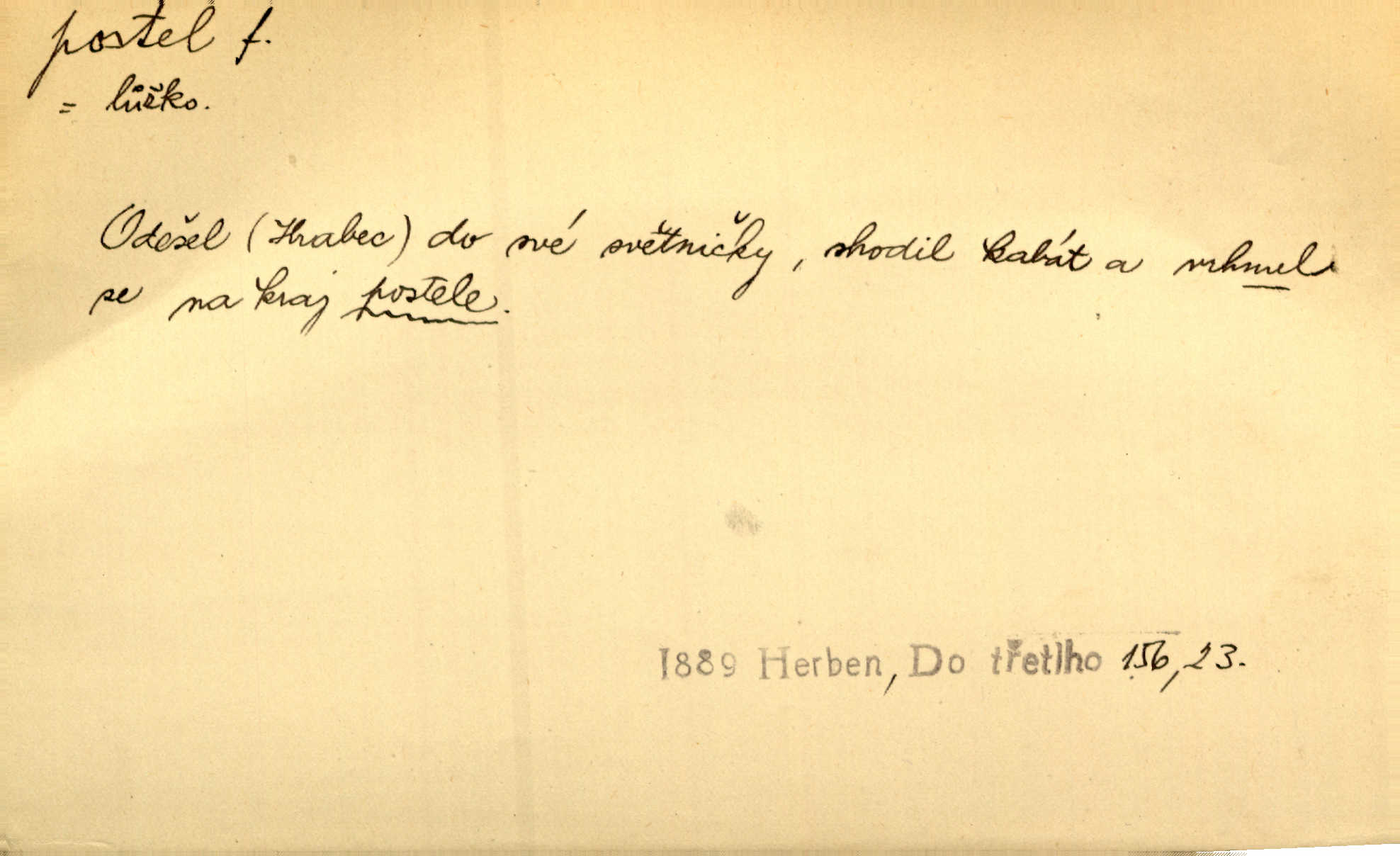 - *postel, -u m. postlání. Císař jede na bílém oři, jenž těžce se boří do umrzajícího sněhu a zledovatělých mrtvol, poněkud znepokojen a vyplašen nezvyklým postelem cesty. Mod. r.
