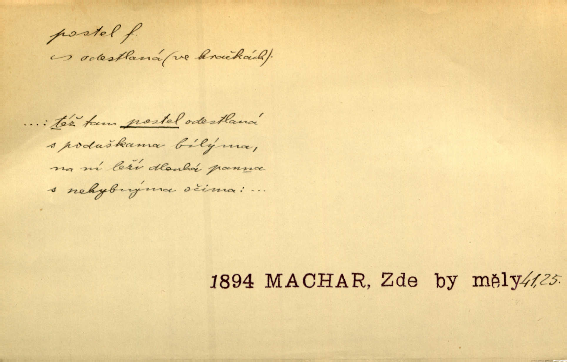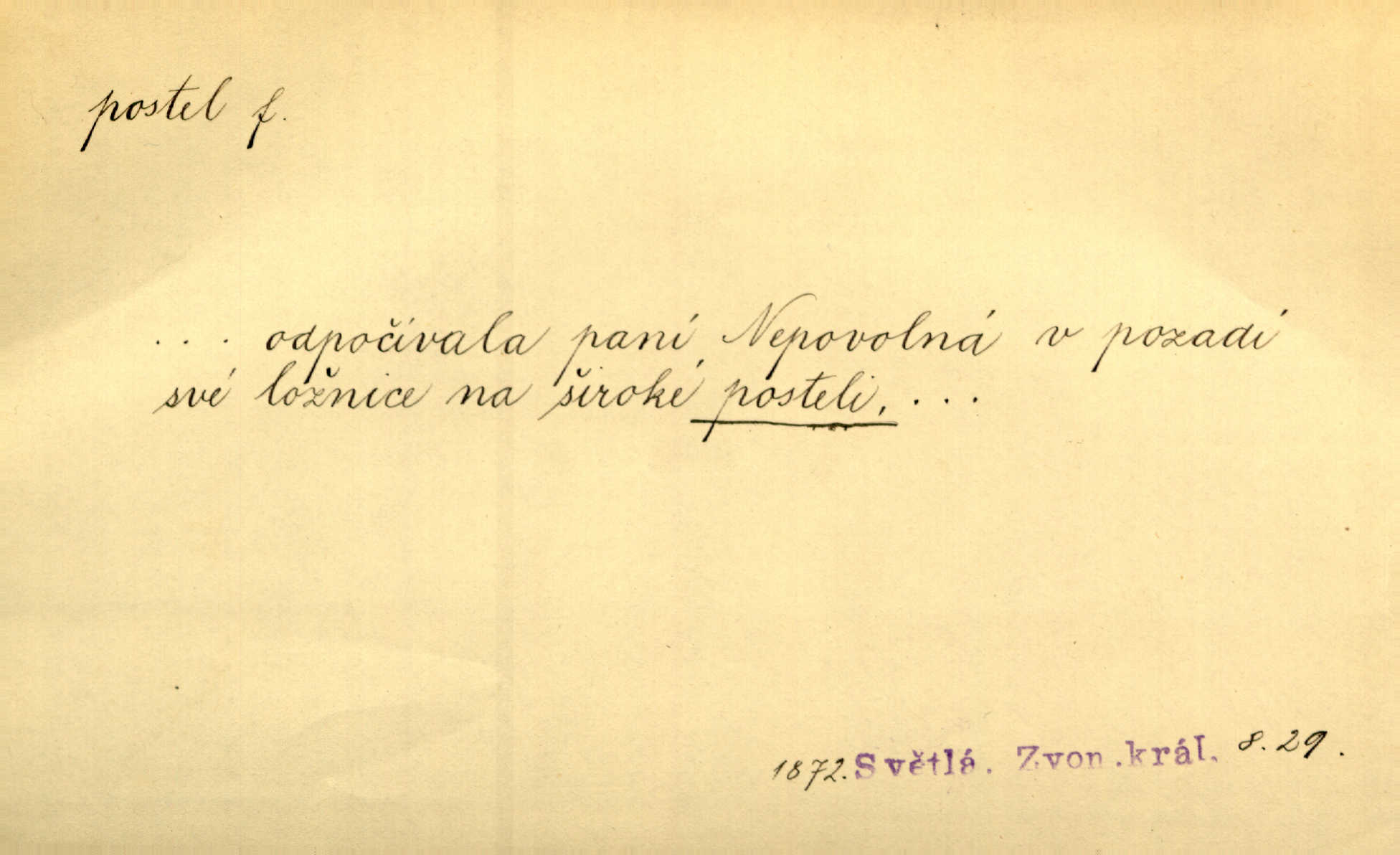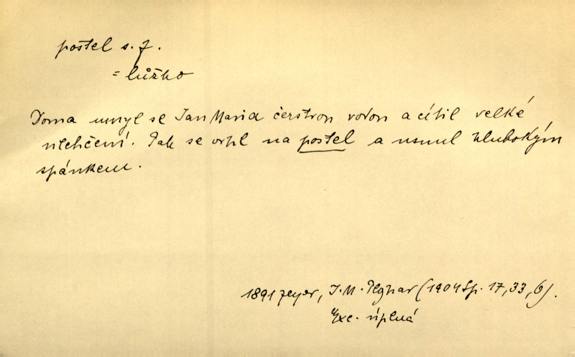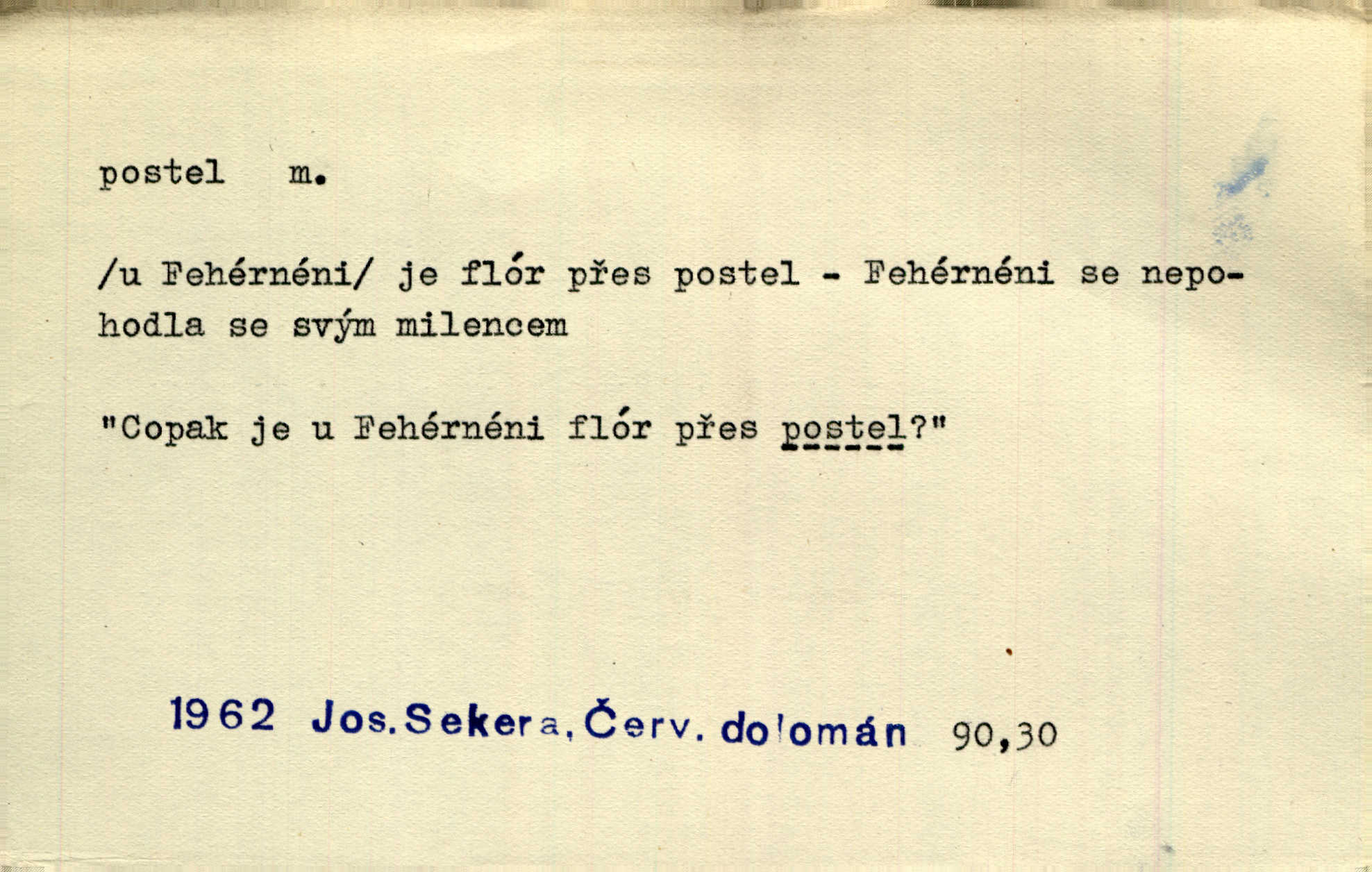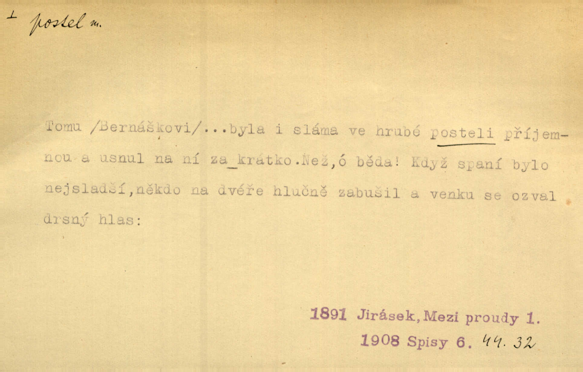 - *postel, -u m. postlání. Císař jede na bílém oři, jenž těžce se boří do umrzajícího sněhu a zledovatělých mrtvol, poněkud znepokojen a vyplašen nezvyklým postelem cesty. Mod. r.