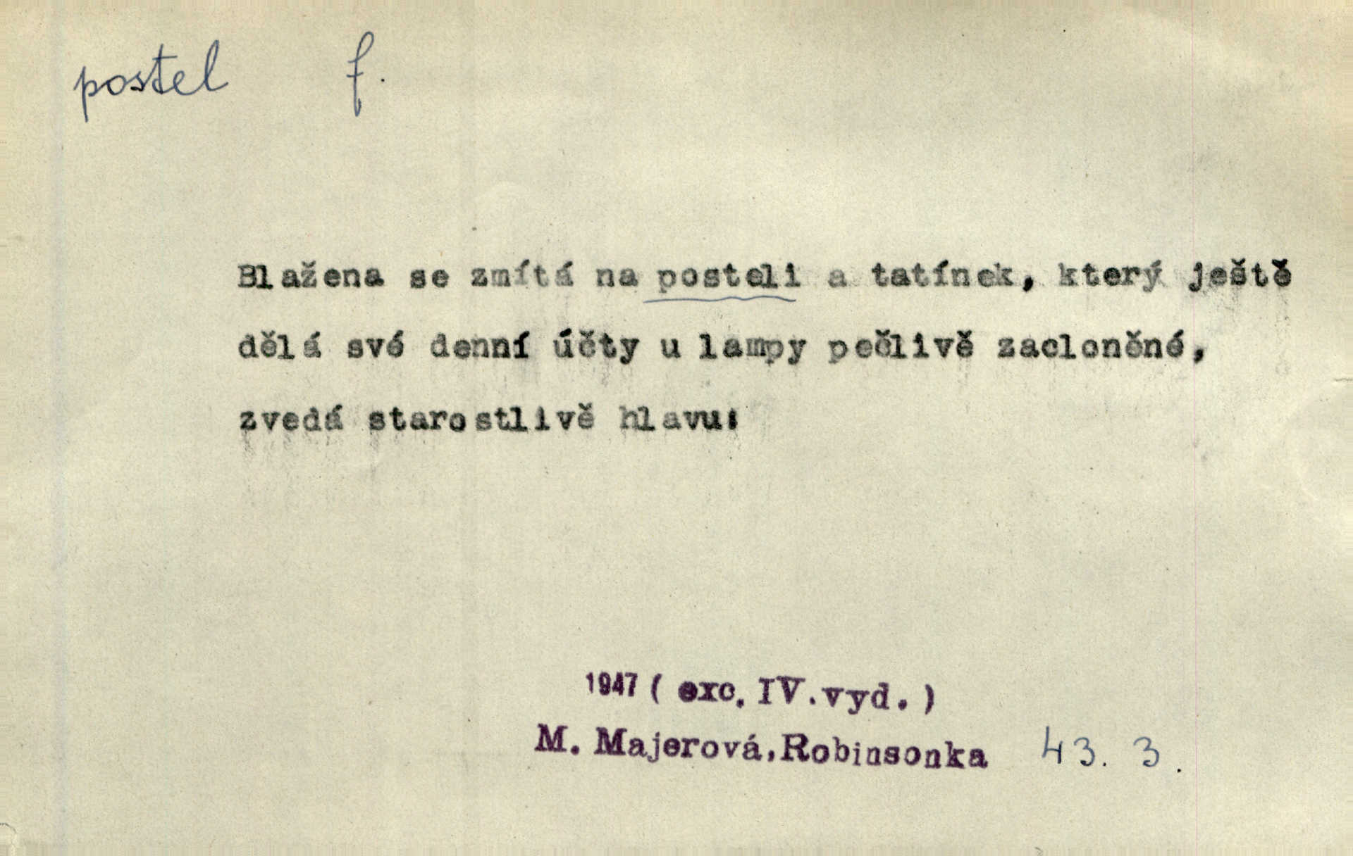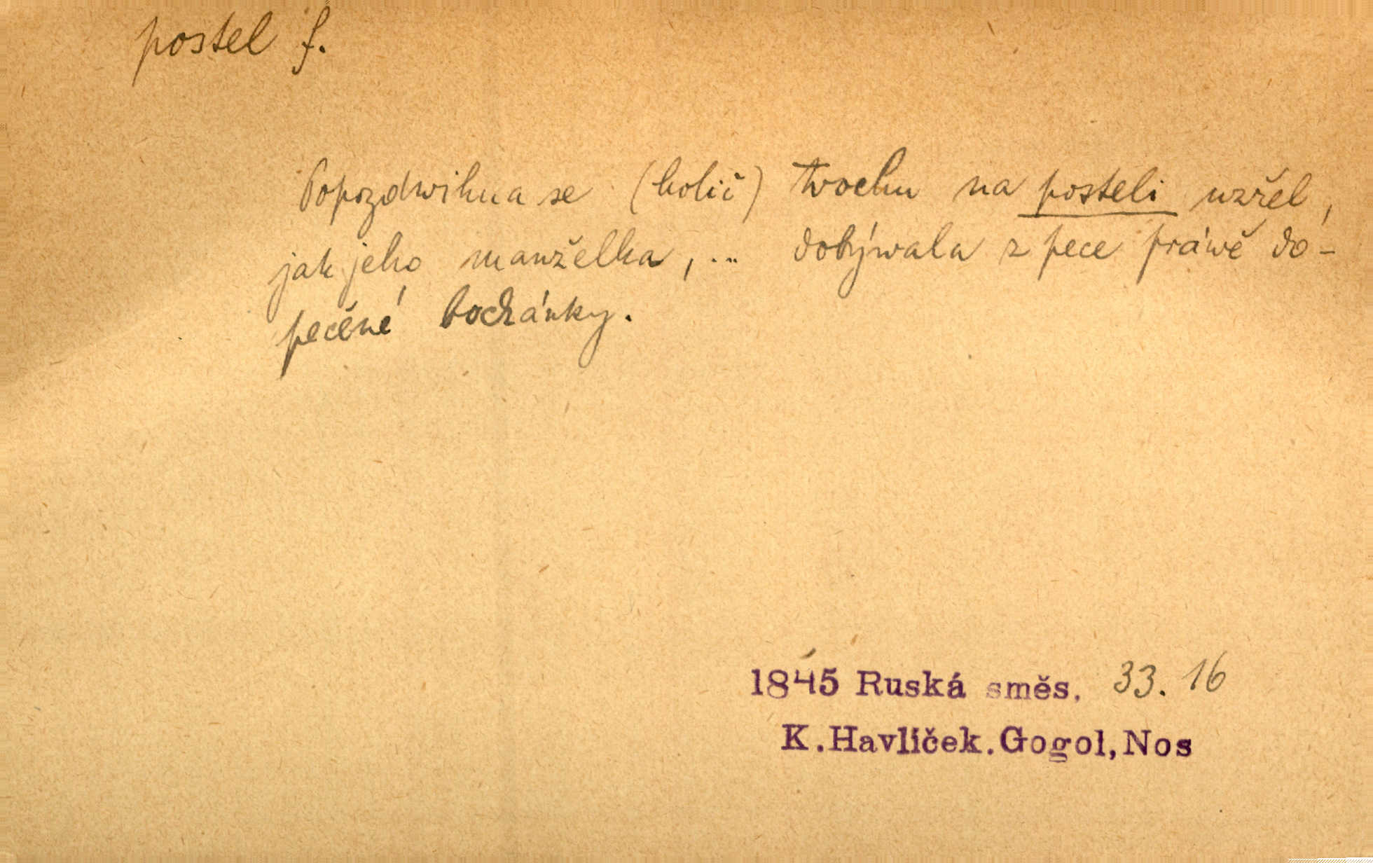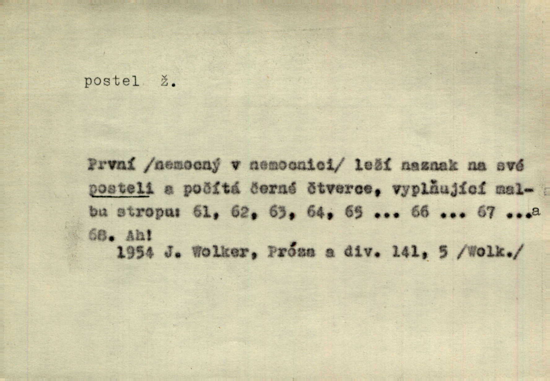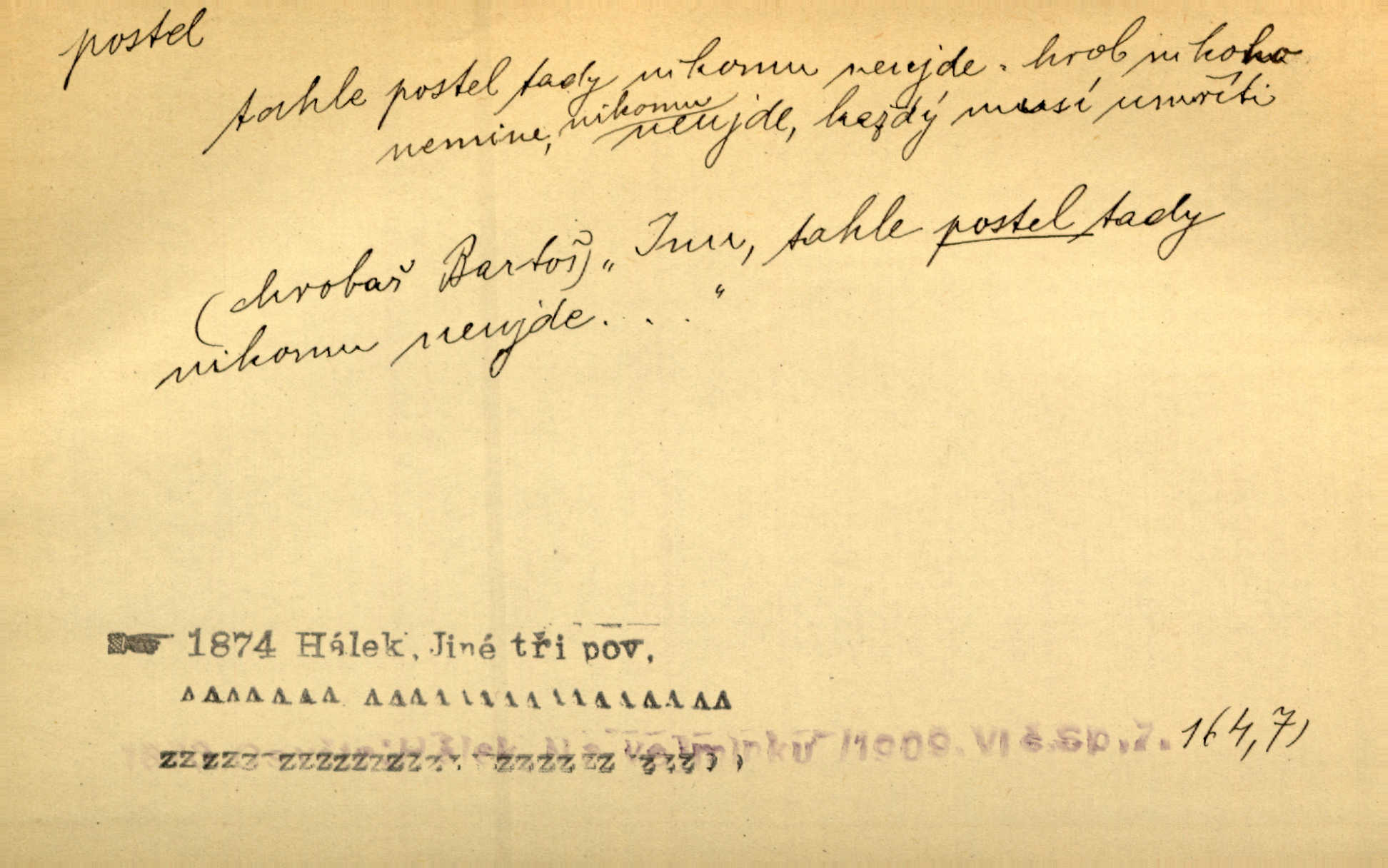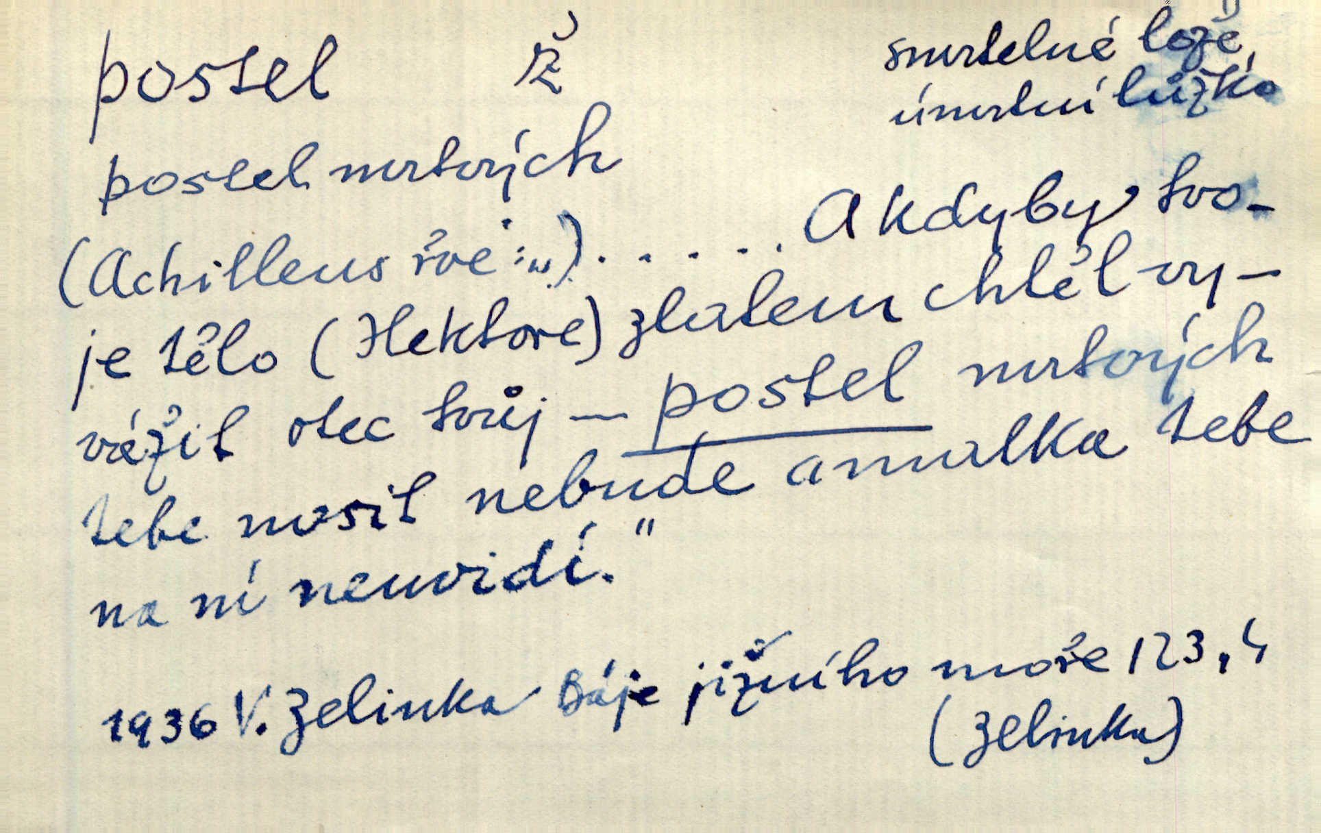 - *postel, -u m. postlání. Císař jede na bílém oři, jenž těžce se boří do umrzajícího sněhu a zledovatělých mrtvol, poněkud znepokojen a vyplašen nezvyklým postelem cesty. Mod. r.