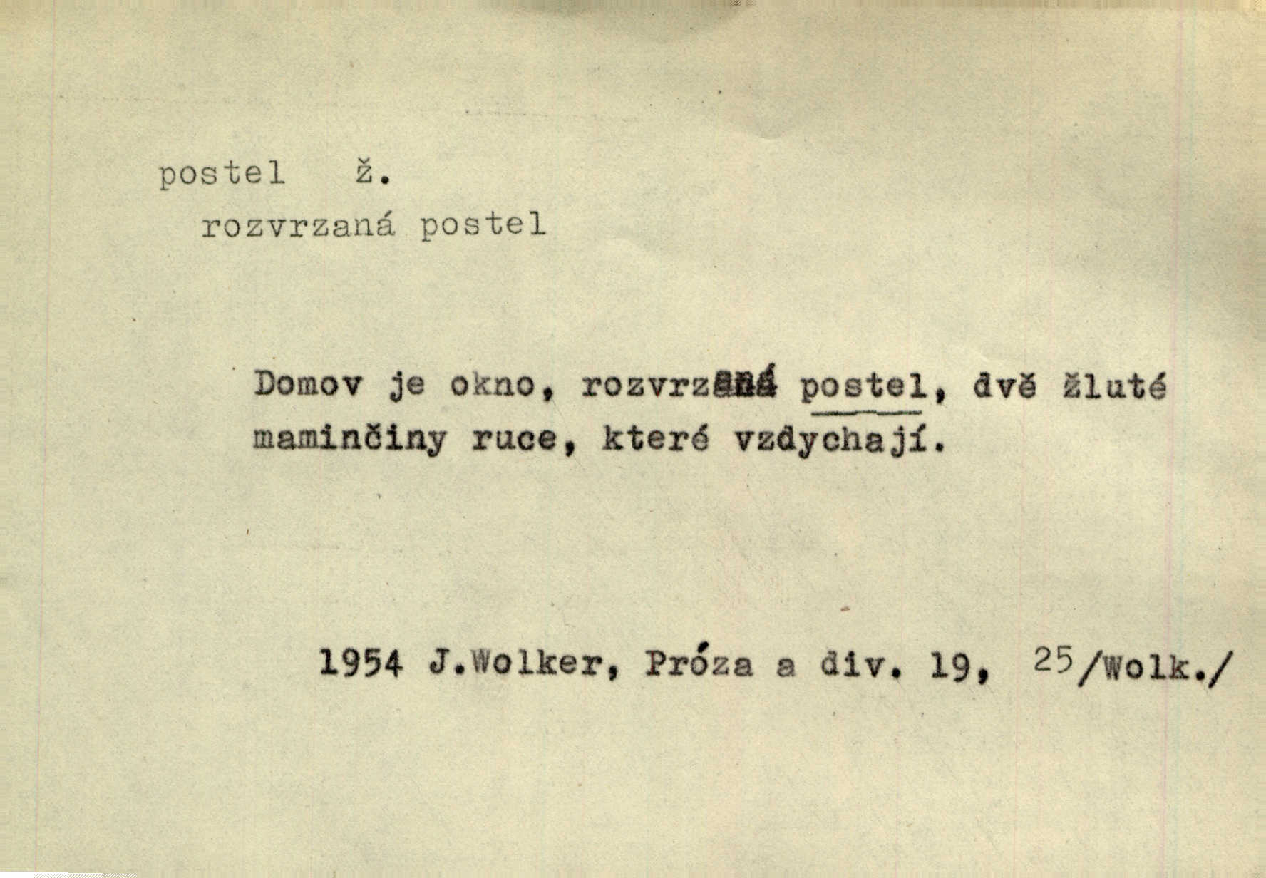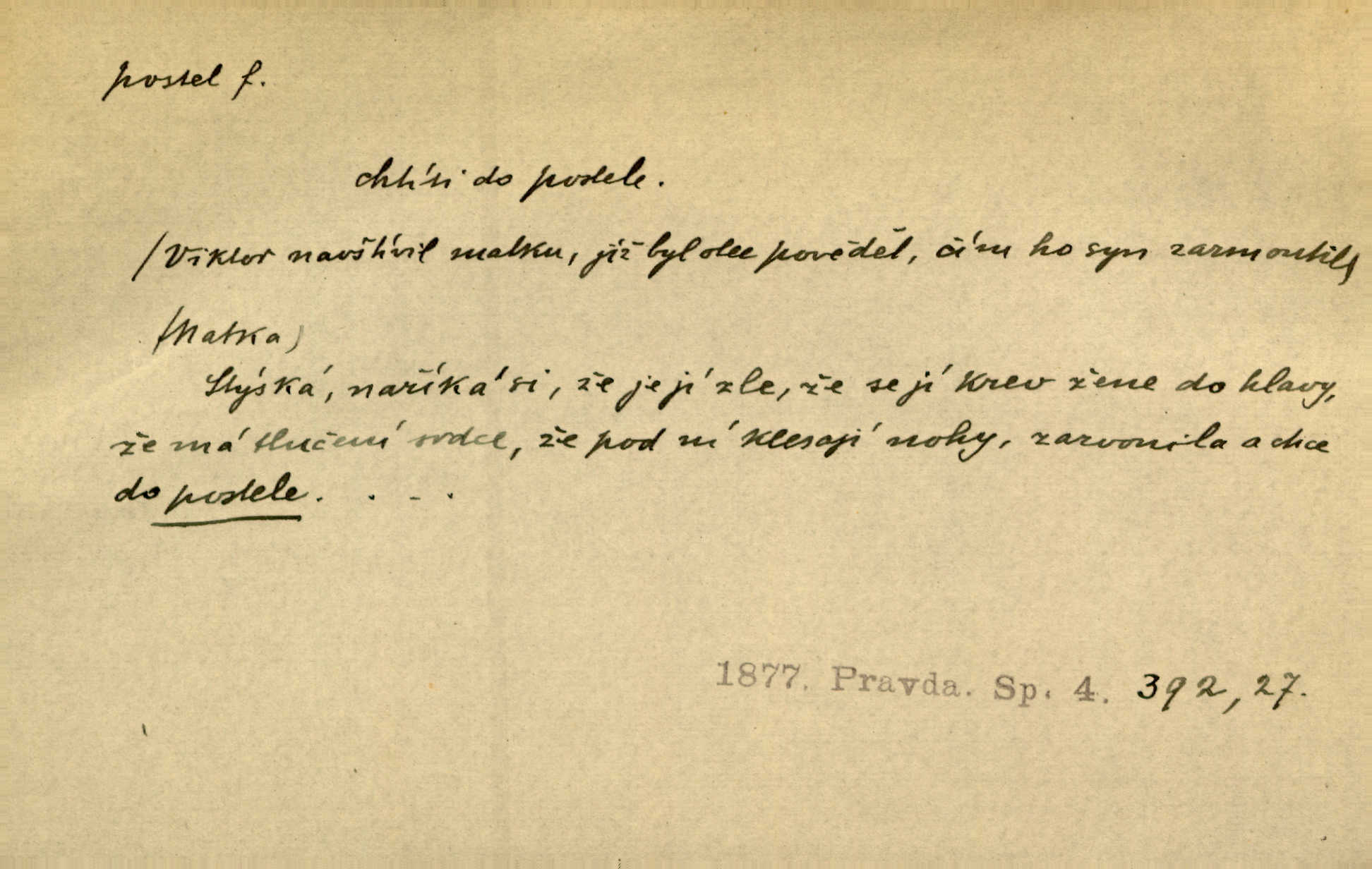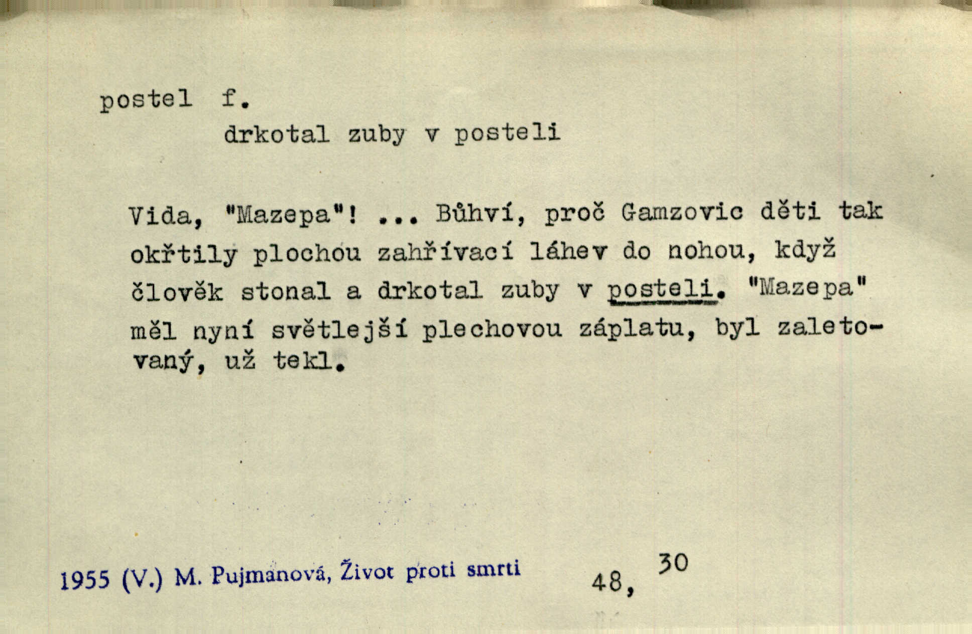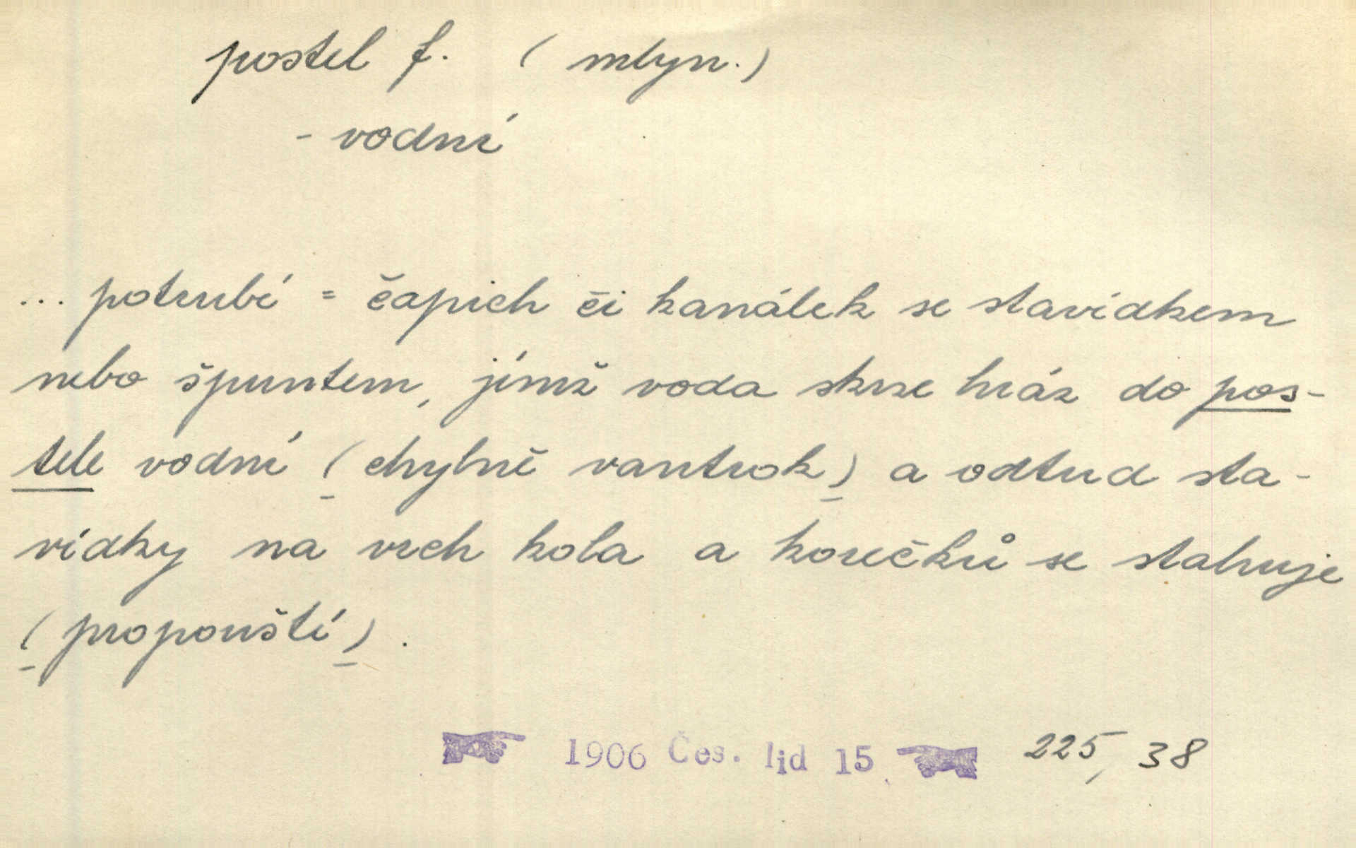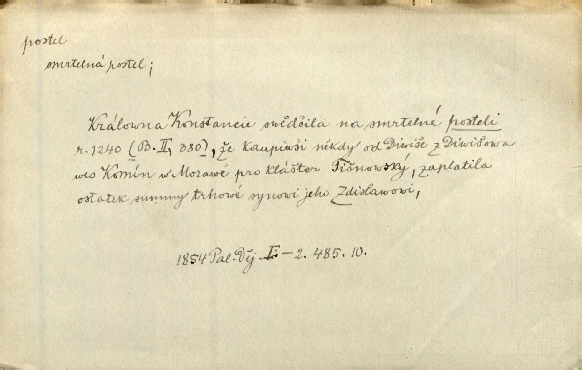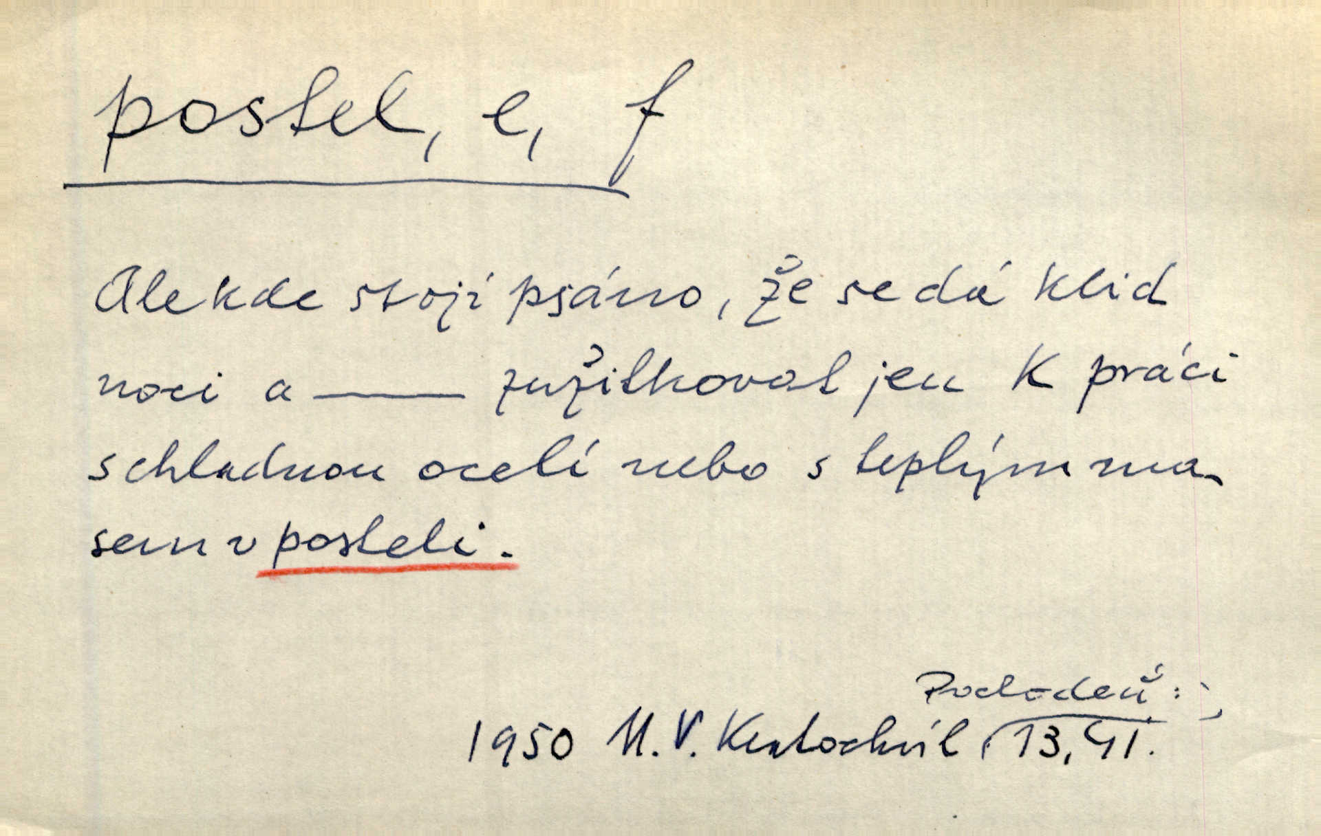 - *postel, -u m. postlání. Císař jede na bílém oři, jenž těžce se boří do umrzajícího sněhu a zledovatělých mrtvol, poněkud znepokojen a vyplašen nezvyklým postelem cesty. Mod. r.