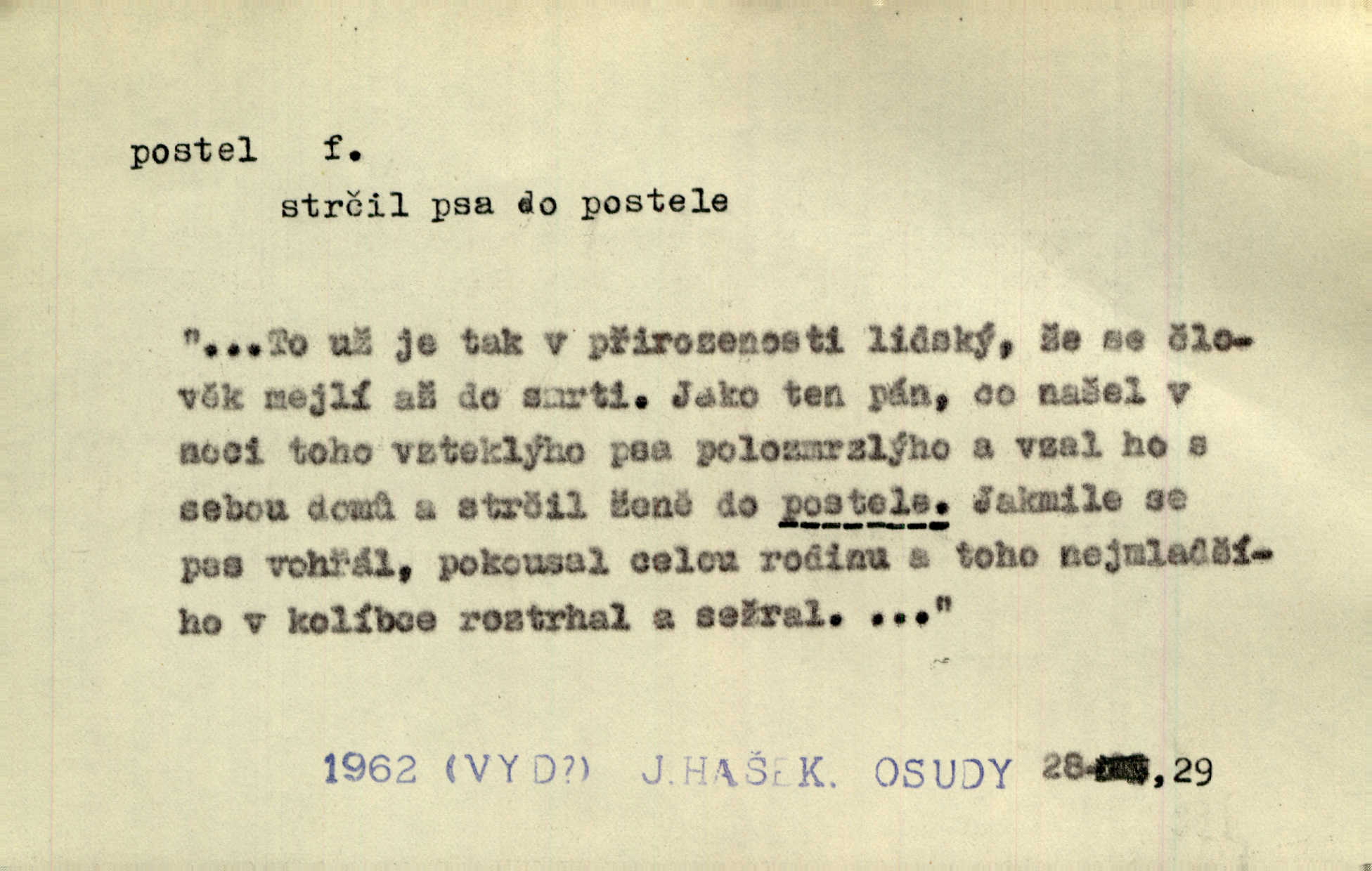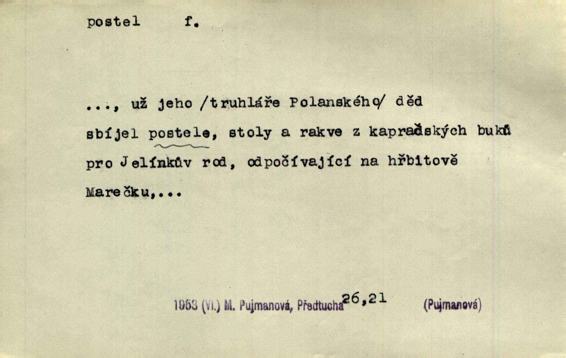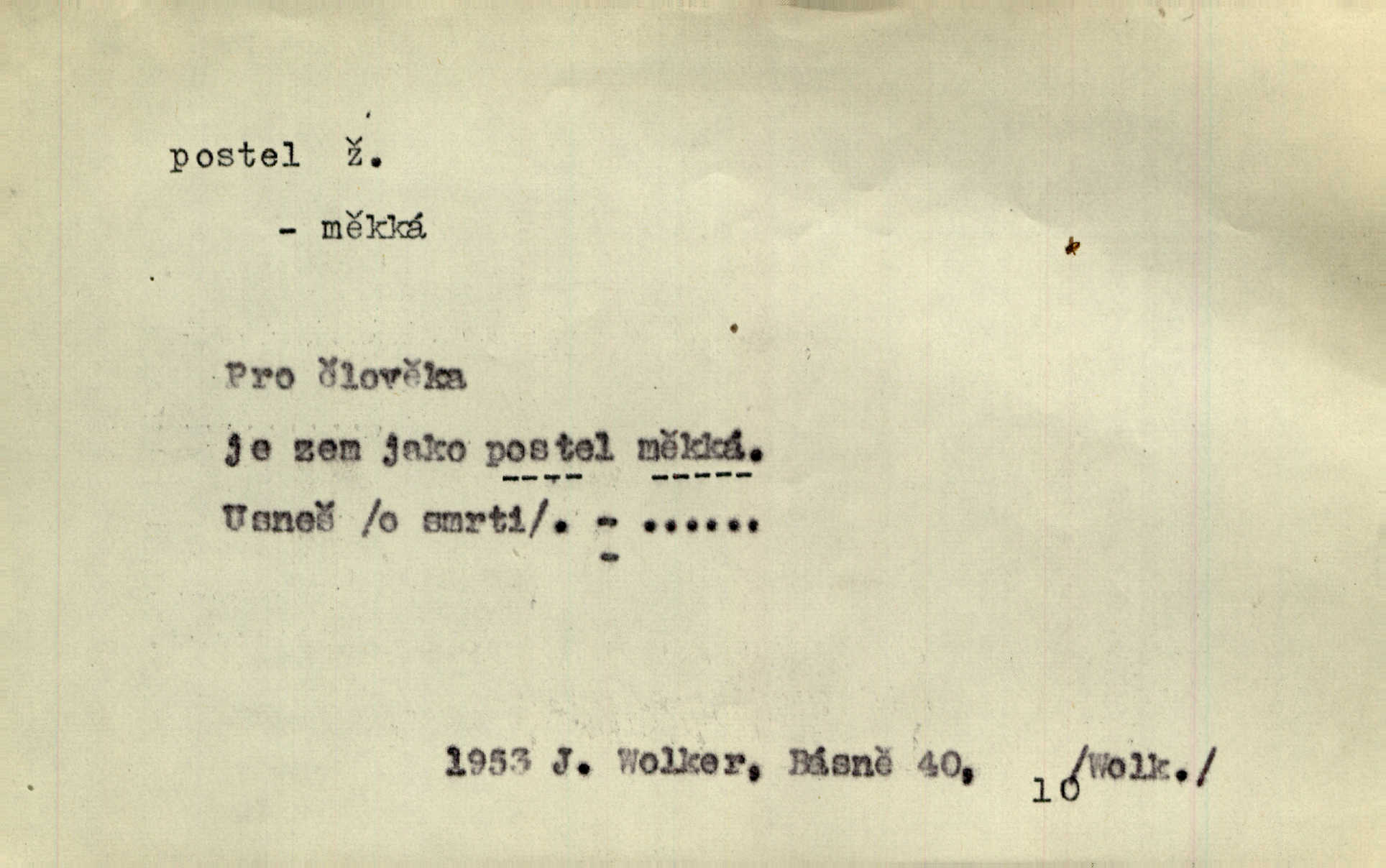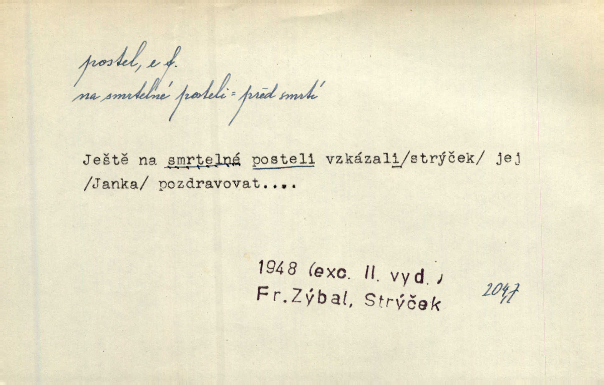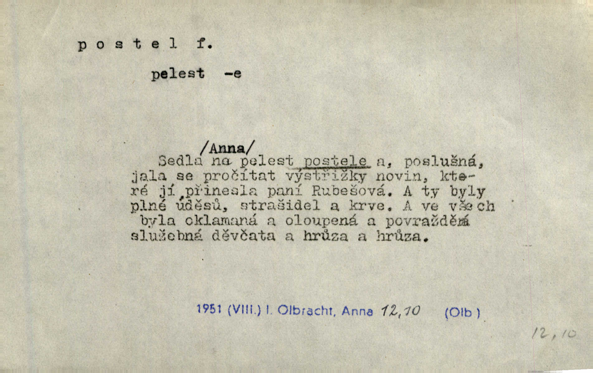 - *postel, -u m. postlání. Císař jede na bílém oři, jenž těžce se boří do umrzajícího sněhu a zledovatělých mrtvol, poněkud znepokojen a vyplašen nezvyklým postelem cesty. Mod. r.
