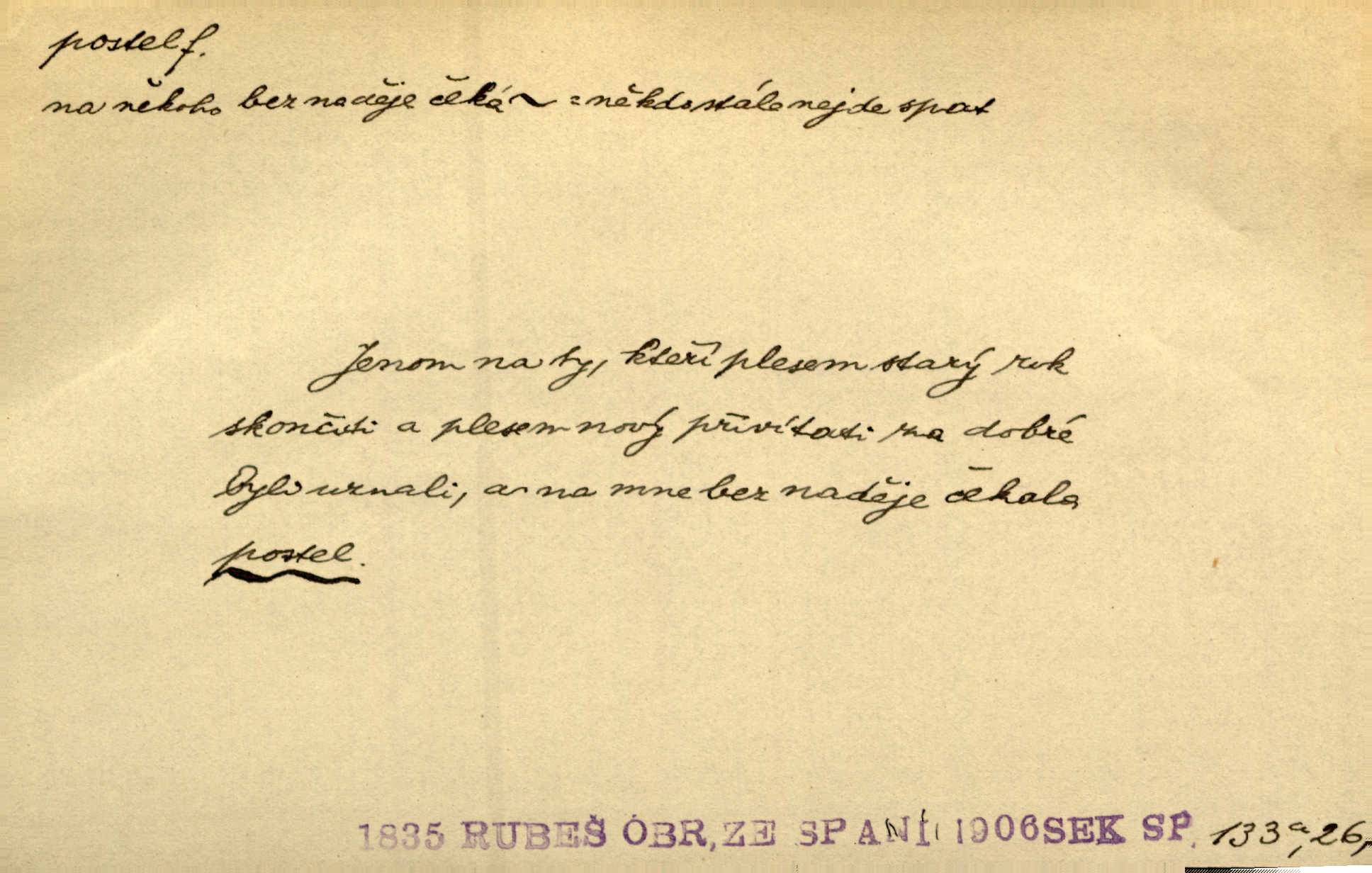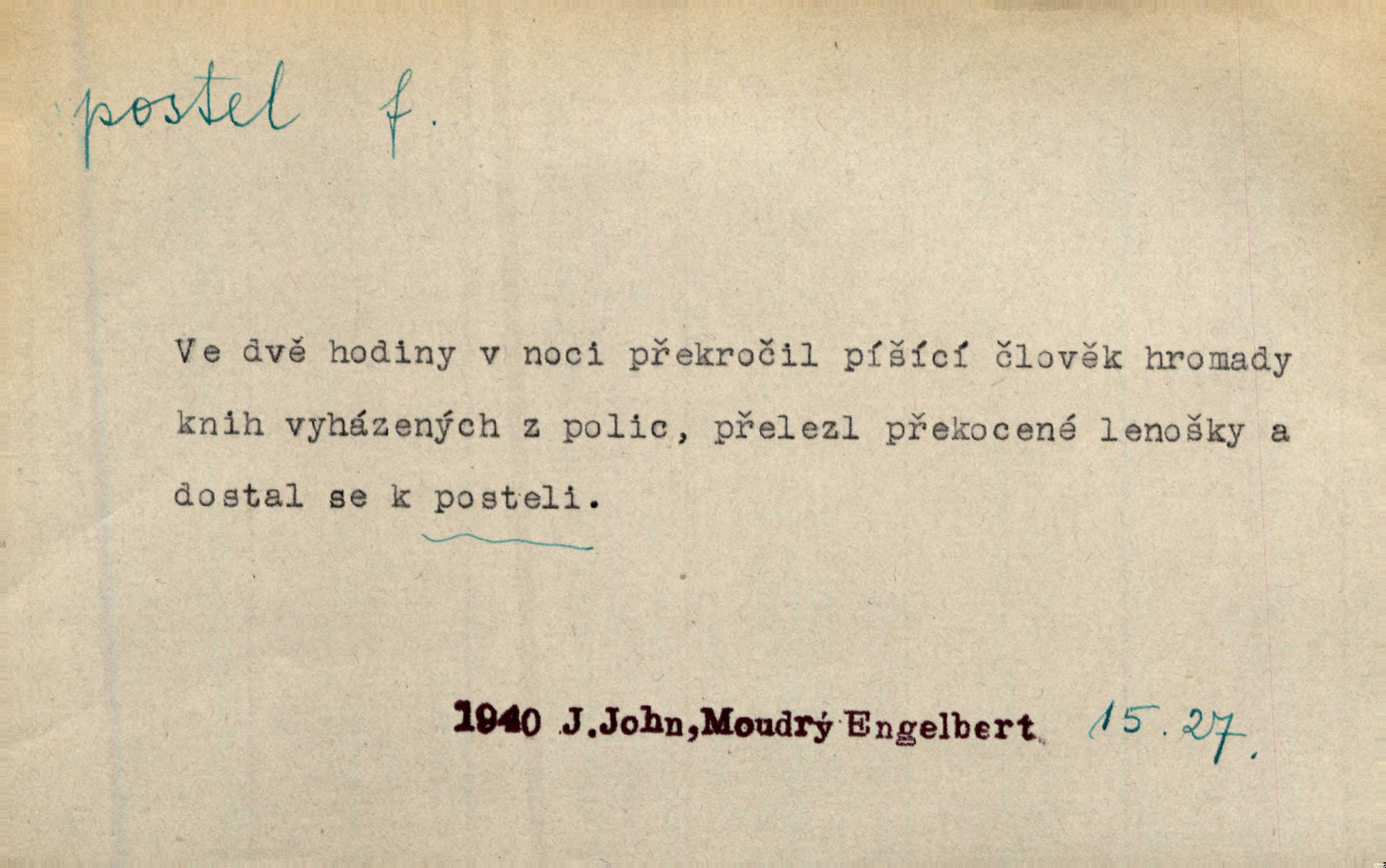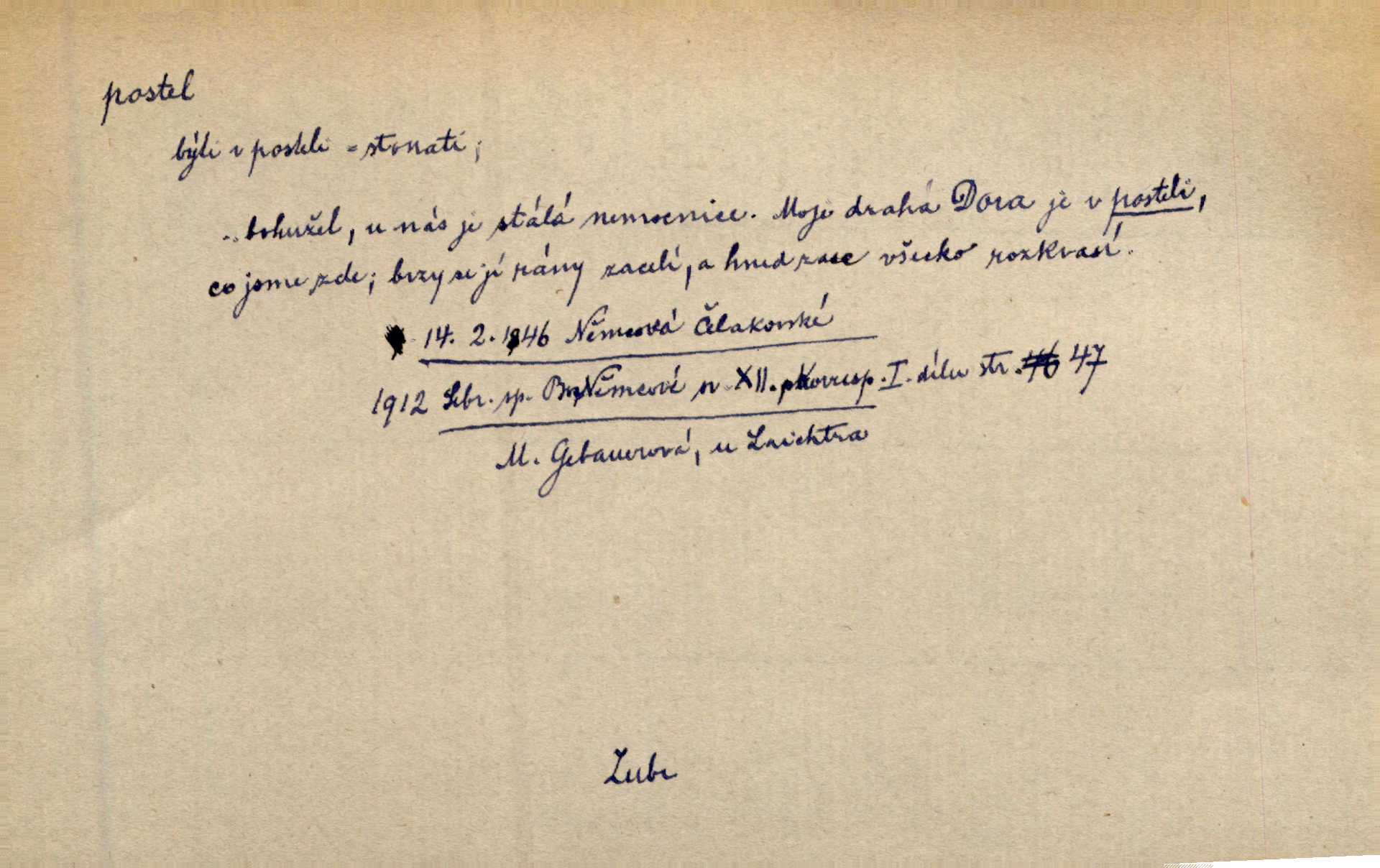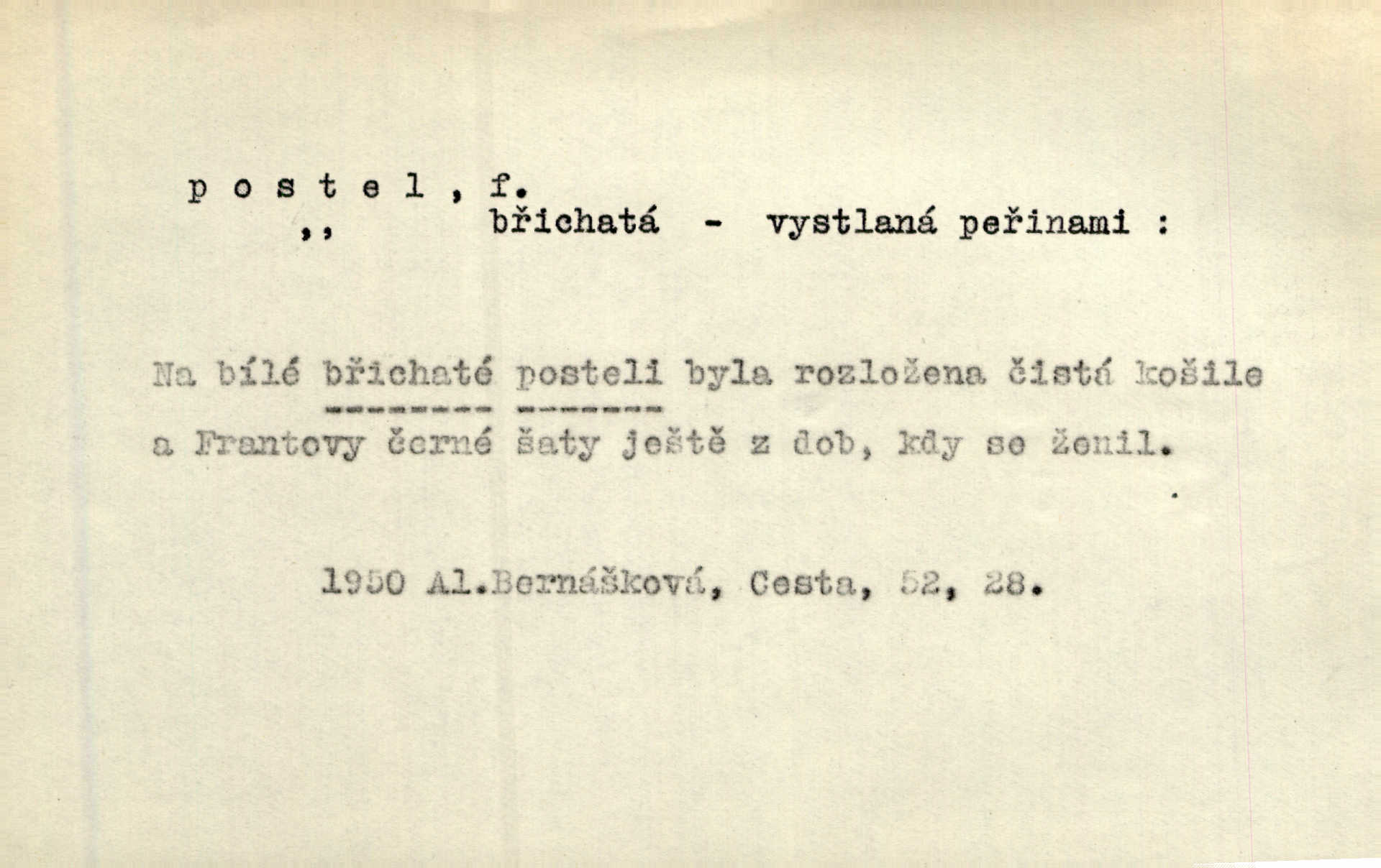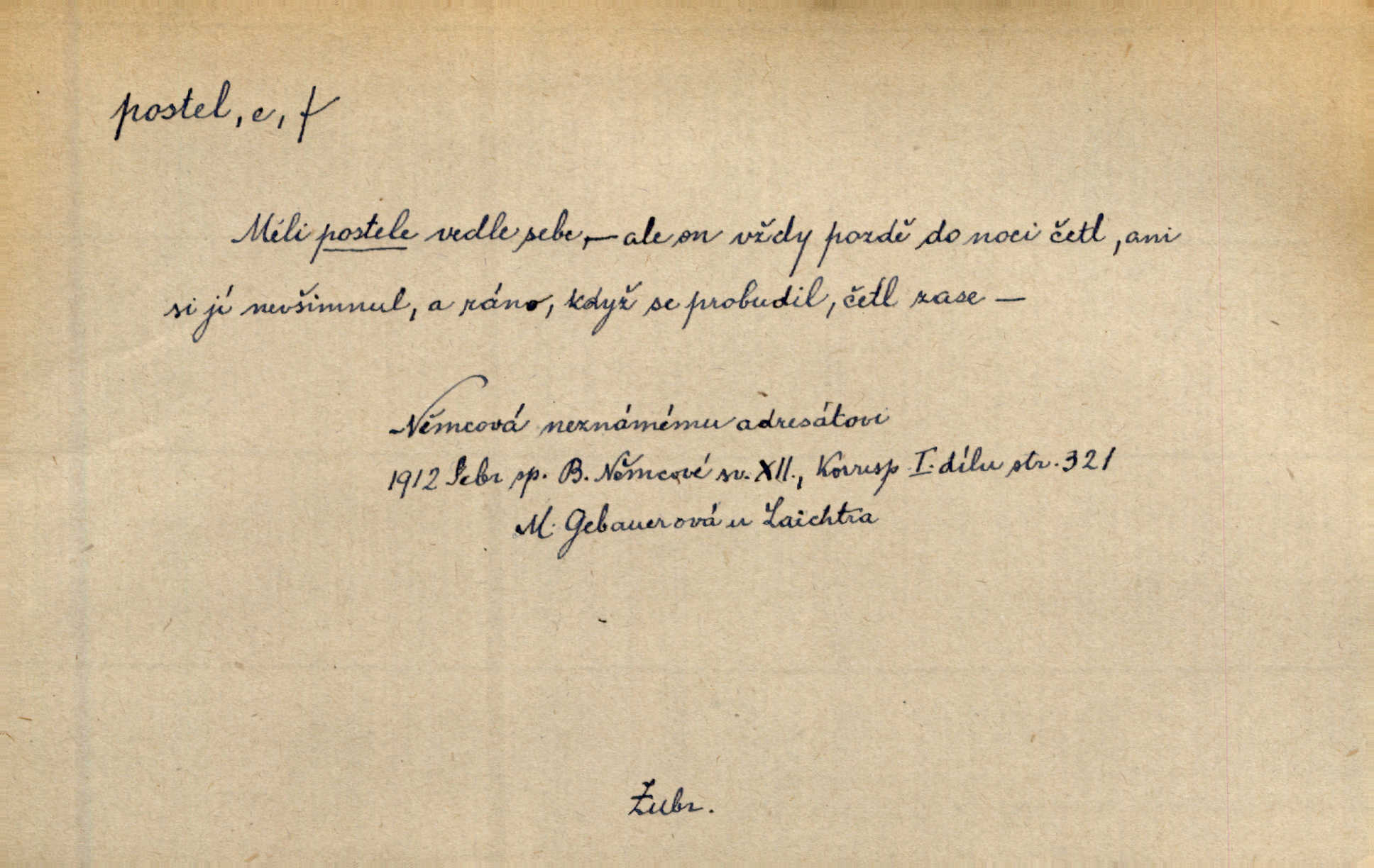 - *postel, -u m. postlání. Císař jede na bílém oři, jenž těžce se boří do umrzajícího sněhu a zledovatělých mrtvol, poněkud znepokojen a vyplašen nezvyklým postelem cesty. Mod. r.