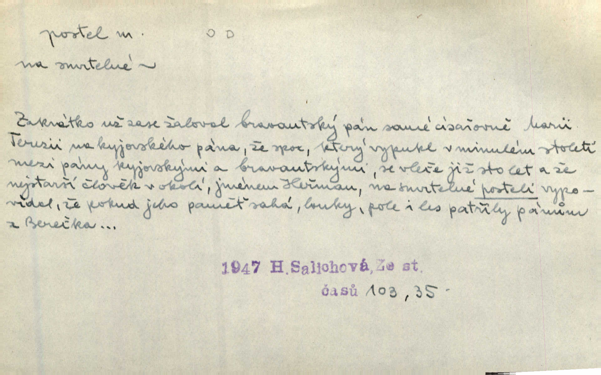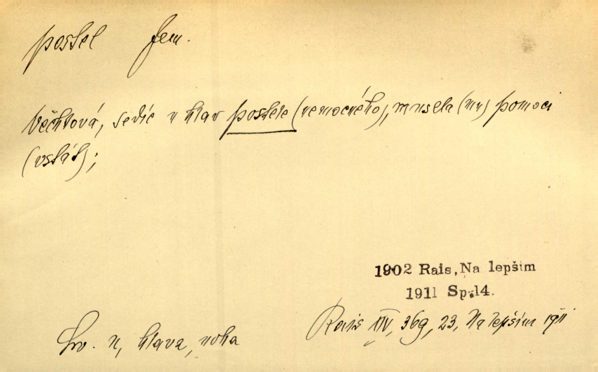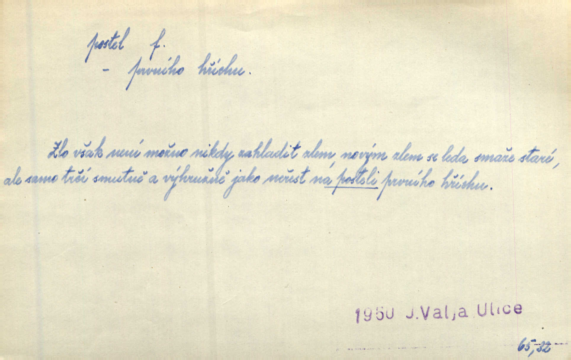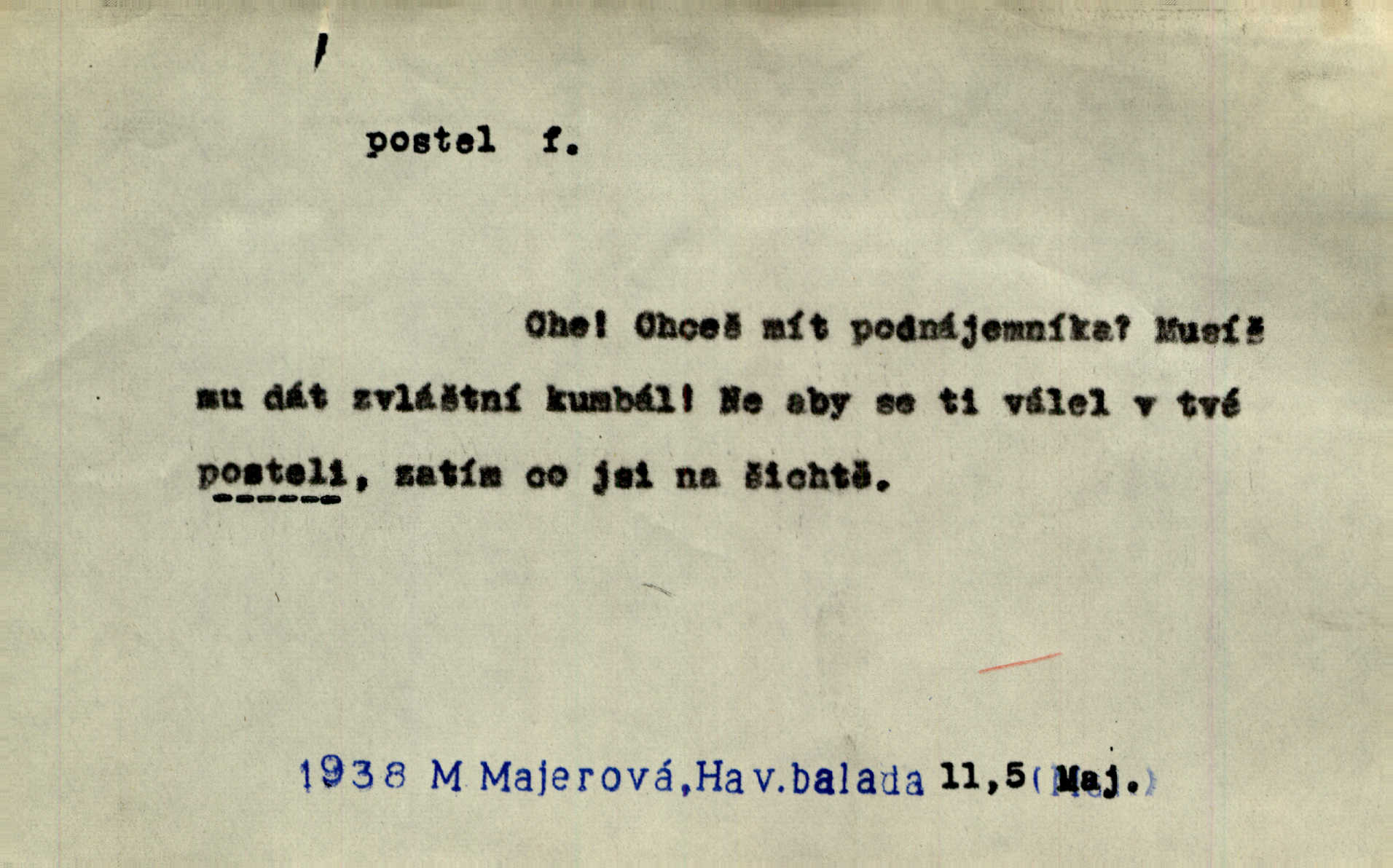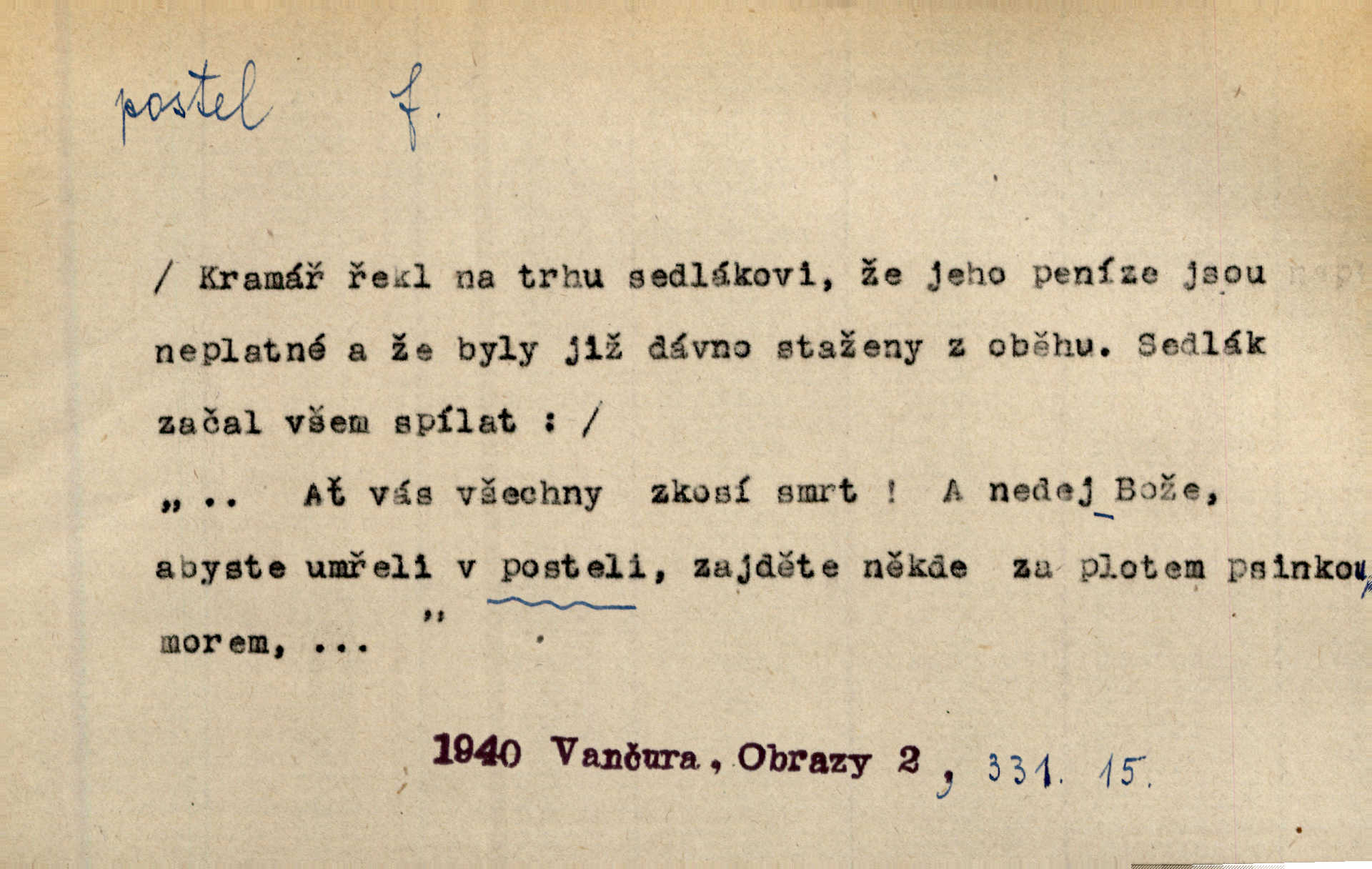 - *postel, -u m. postlání. Císař jede na bílém oři, jenž těžce se boří do umrzajícího sněhu a zledovatělých mrtvol, poněkud znepokojen a vyplašen nezvyklým postelem cesty. Mod. r.