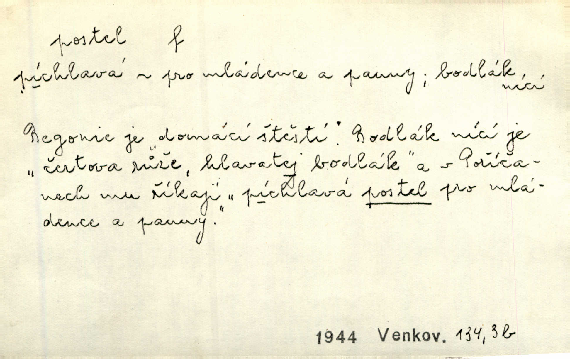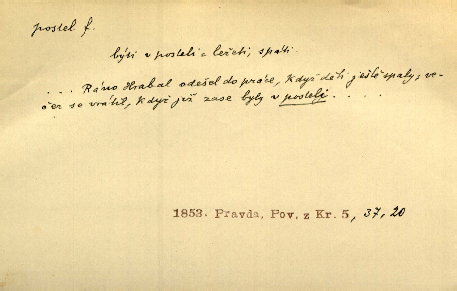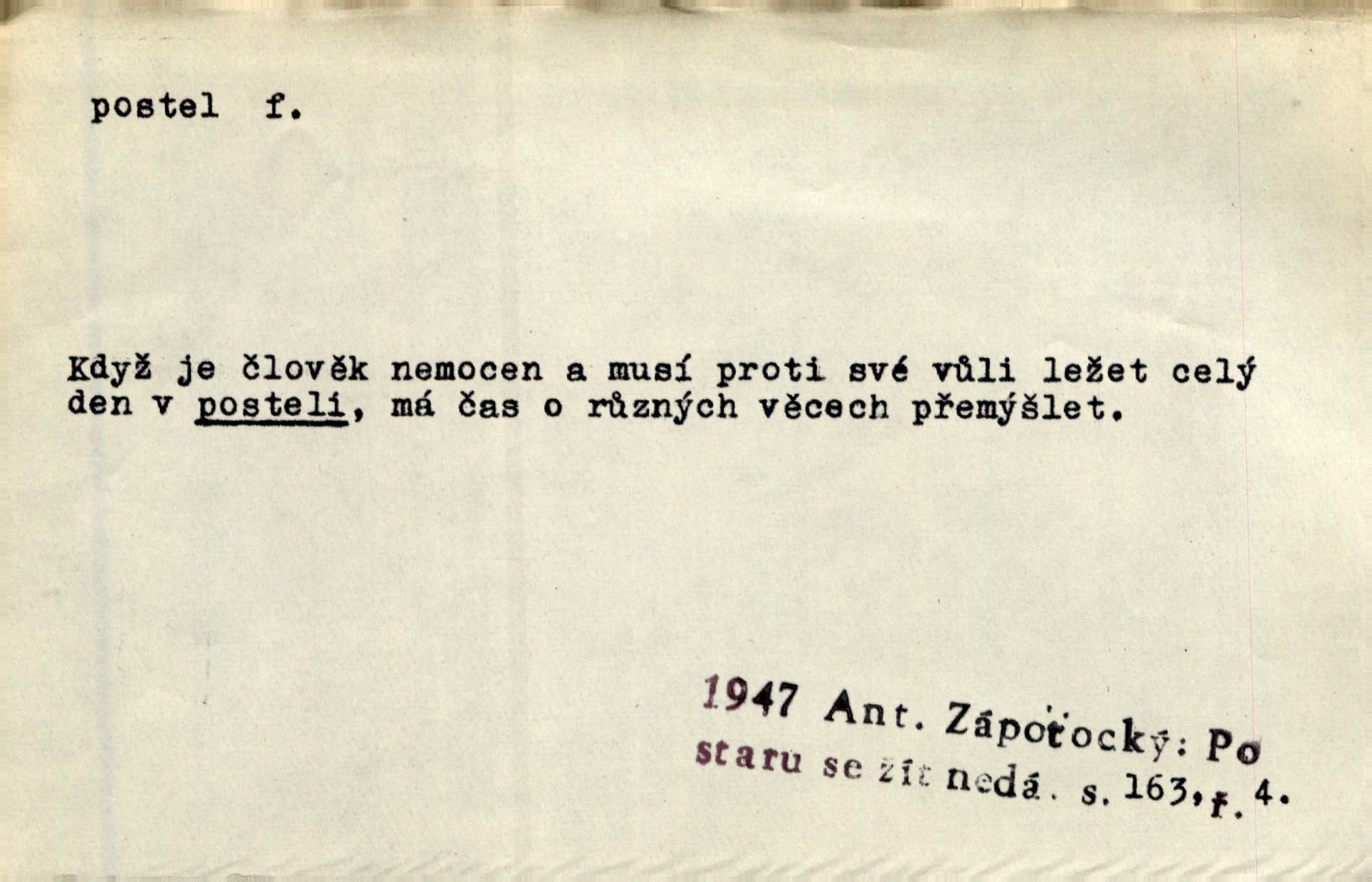 - postel, -e f. (dial. m.) nábytek sloužící k ležení, ke spaní, opatřený zpravidla slamníkem n. žíněnkami, polštáři a peřinou n. přikrývkou. [Hoši] stěhovali postel: jeden hlavu, druhý nohy, postranice vždycky dva, a nejmenší táhli prkénka. Rais. Musil si usednouti na pelesť ustlané postele. Kam. V letě spala tam Chlebounka, jejíž byl „postel“ jměním. Nov. „Holka, připrav tomu pánovi postel,“ volal Bárta. Mácha. Veselka trvala tři dni a tři noci, nepřišli jsme po ten celý čas do postele neulehli jsme. Svět. Vít byl jako ospalý, brzy šel do postele, přece však nespal šel si lehnouti. Prav. Kde pán už v posteli, sluha ještě veselý. Čel. Boubínce dali slepičí polévky a slepice v nudlích i koláčů, jež Kojanka poslala „do postele“ šestinedělce do kouta. Hol. Ještě na smrtelné posteli opakoval, že nezapálil umíraje. Jir.