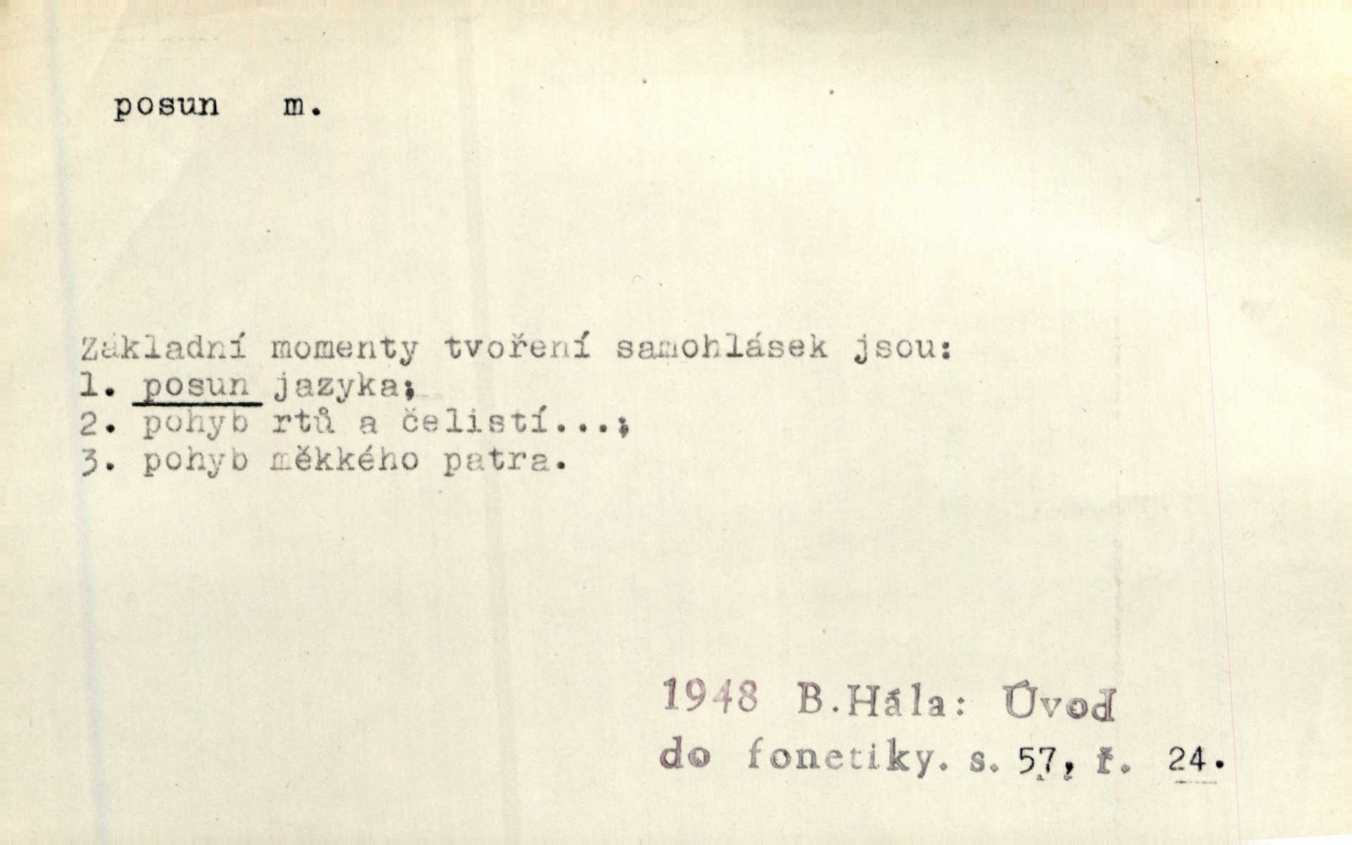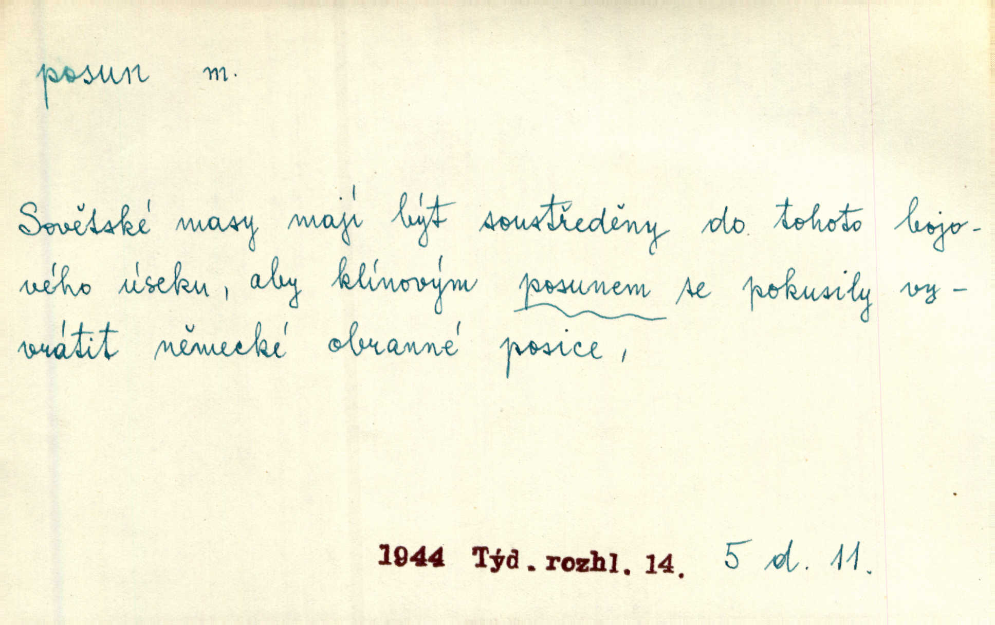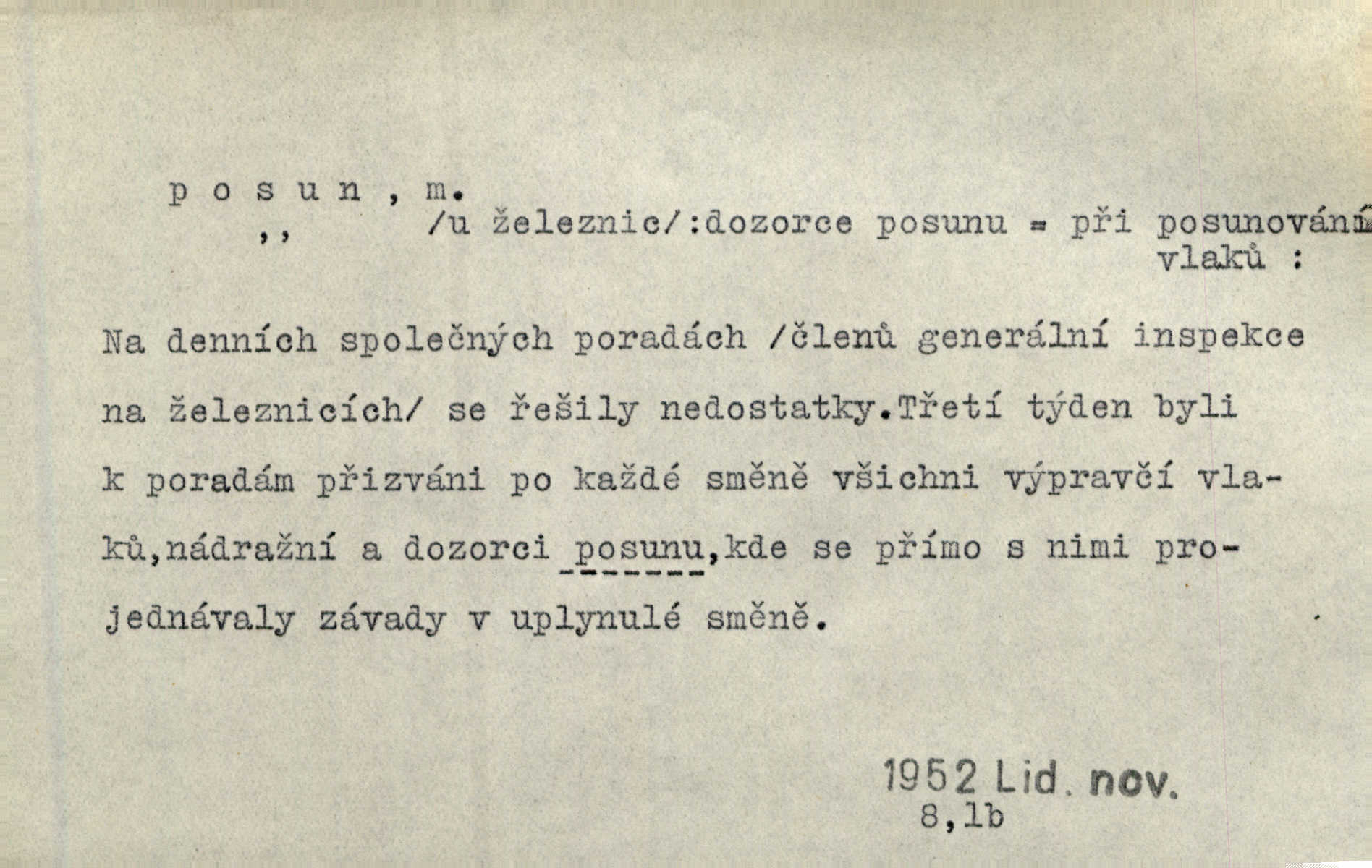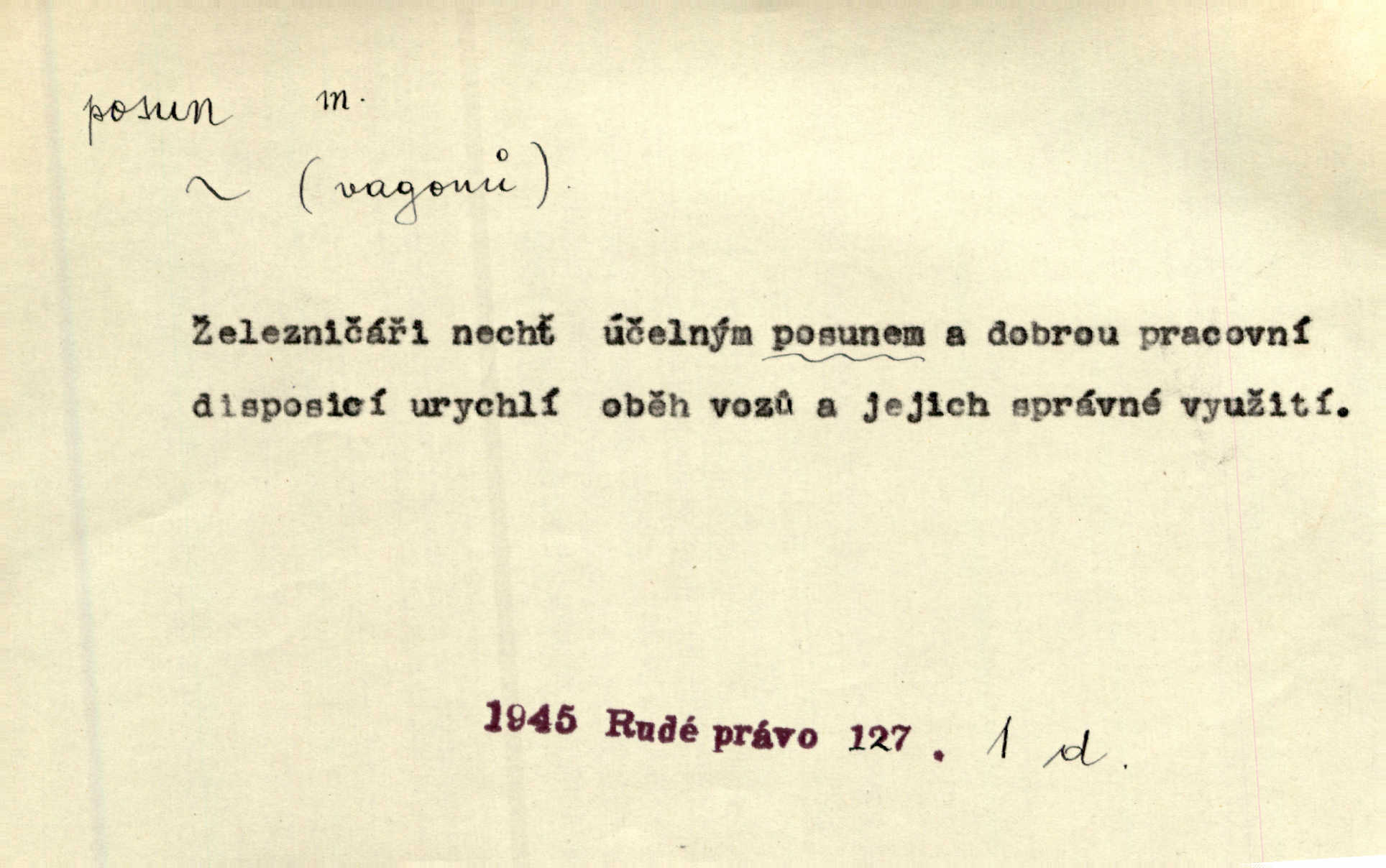- posun, -u m. pohyb některou částí těla, posunek. Roztomilý byl ten každý její posun, pohled, úsměv. Mach. Mlčky mu posunem ruky ukázal, aby šel před ním. Šmil. Pro každý posun, pro každý akcent měla důvod. Vrch. Učiní zvláštní omrzelý posun, jakoby nějakou myšlenku v hlavě dlouhou a tlustou čárou přetrhával. Šrám. Přen. V básních Březinových setkáváš se s výraznými a typickými posuny a postoji, v něž ještě vtělena celá akce! Šal. Těl. posunování ruky při ručkování. Sport. (v šermu) ve střehu pohyb nohy stojící vpředu a hned za ním stejný pohyb nohy stojící vzadu. D jiný pohyb v prostoru. Líný proud [moře] nás [plavce] unášel směrem k pevnině, postrkuje nás rytmickými posuny vln. J. Čap. Vějířem tím nutno kývat v líném hodin posuně. Čech. Voj. pohyb jednotky z jednoho vyčkávacího postavení do druhého. Geol. druh poruchy způsobený pohybem ker (vrstev) ve směru vodorovném. Horizontální posun vrstev. El. tech. fázový posun časový rozdíl mezi napětím a proudem (u střídavého proudu), vyjádřený v úhlové míře, fázové pošinutí. Žel. sestavování vlaku, řadění jednotlivých vozů pro rozličné účely. Řidič posunu, dozorce posunu. D změna, proměna. Válka přinesla posun i ve světové výrobě. Přít. Století třinácté zemím českým přineslo pronikavý posun všech řádů životních. Šus. Národnostní boj a politické přesuny osvětlují lépe posuny, které vznikají mezi národnostmi v téže zemi vedle sebe žijícími měnou přirozenou. Vlastiv.