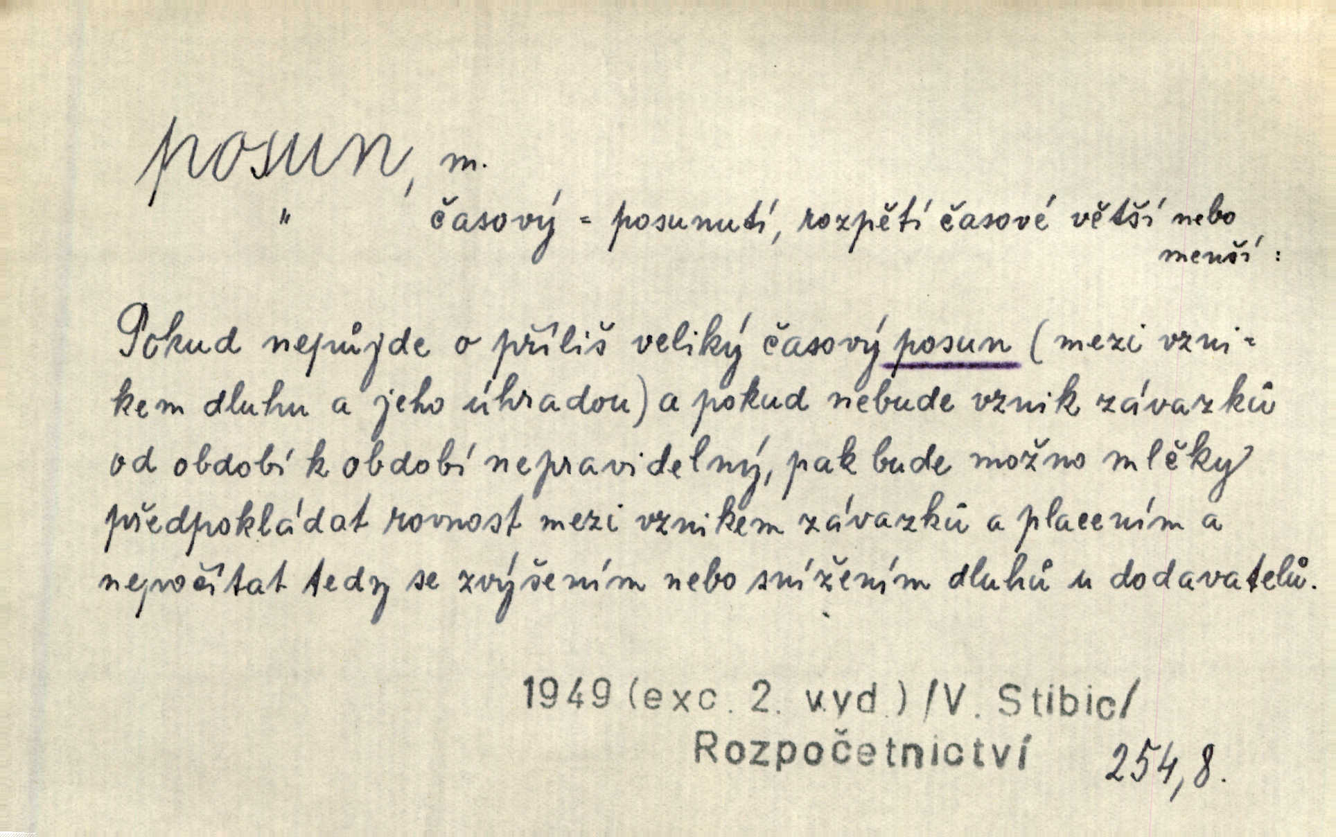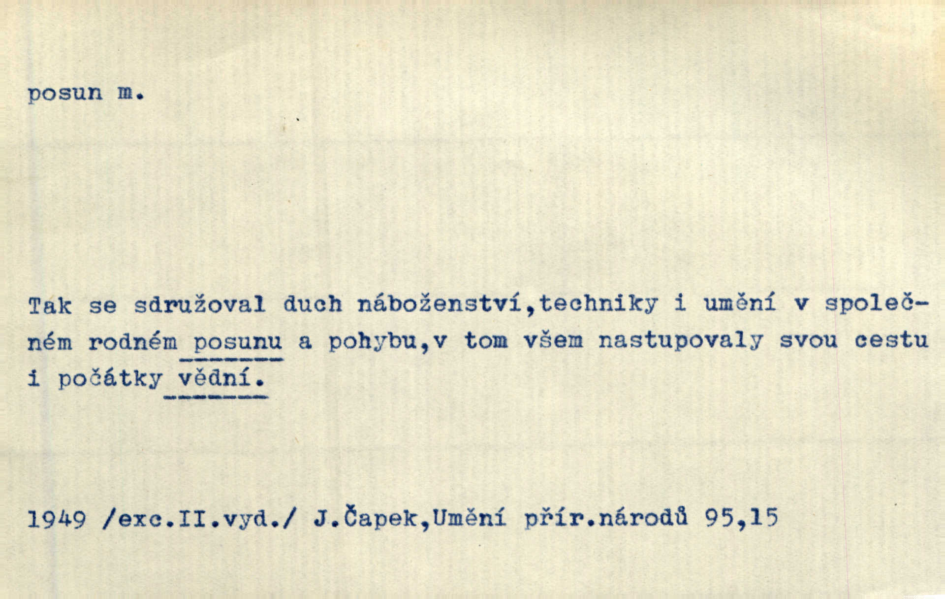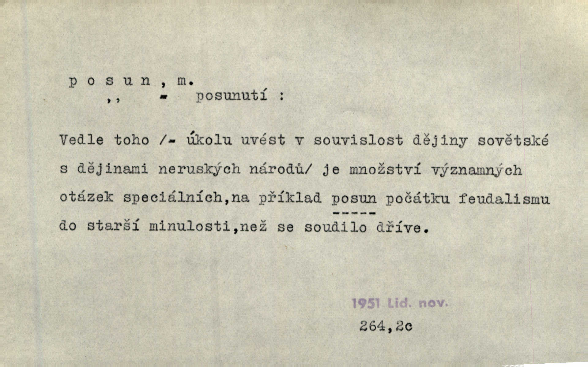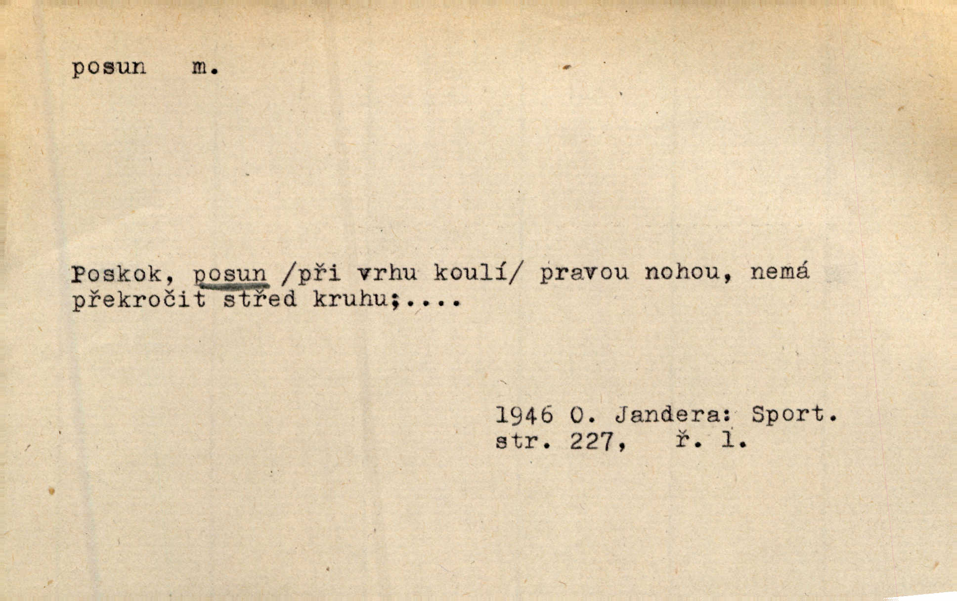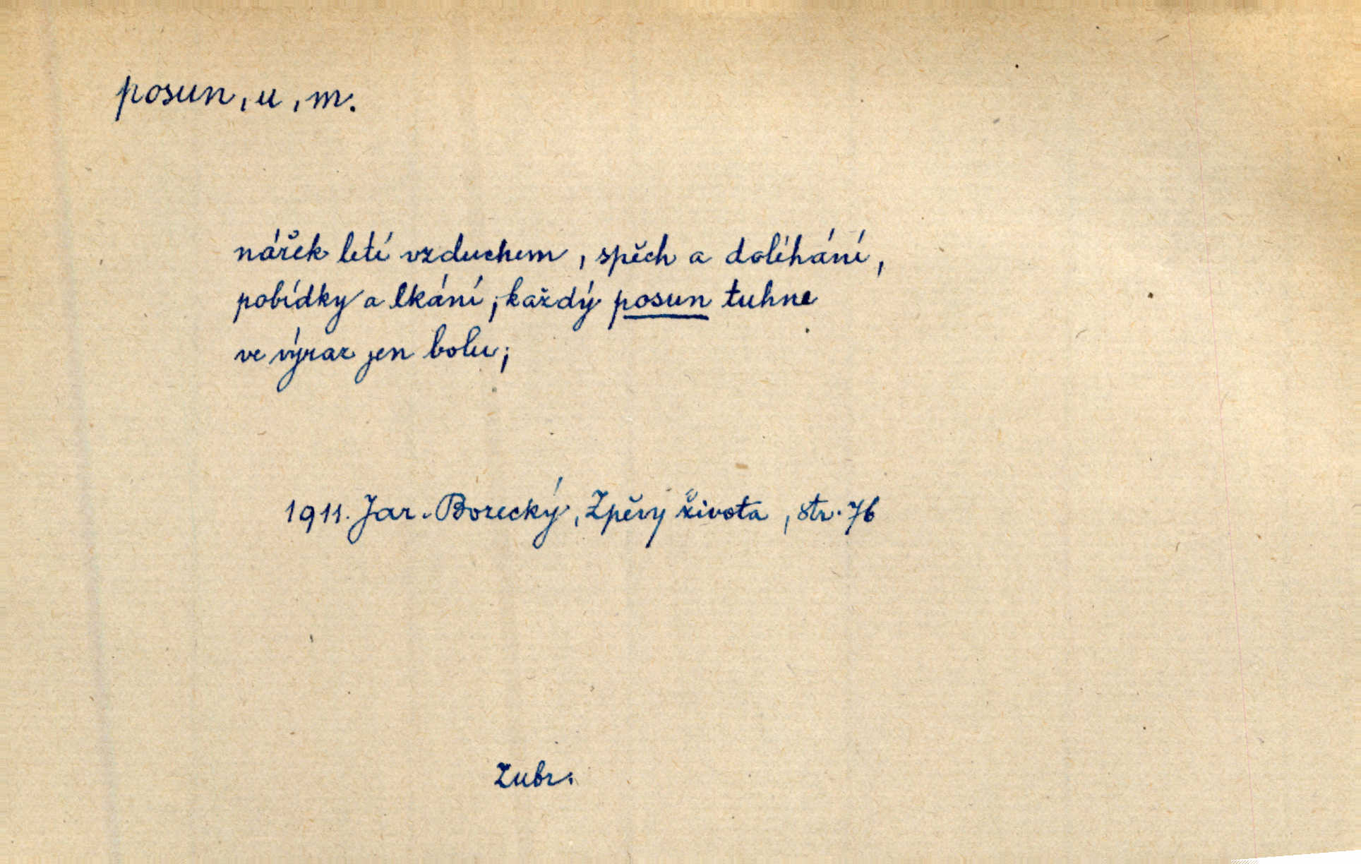 - posun, -u m. pohyb některou částí těla, posunek. Roztomilý byl ten každý její posun, pohled, úsměv. Mach. Mlčky mu posunem ruky ukázal, aby šel před ním. Šmil. Pro každý posun, pro každý akcent měla důvod. Vrch. Učiní zvláštní omrzelý posun, jakoby nějakou myšlenku v hlavě dlouhou a tlustou čárou přetrhával. Šrám. Přen. V básních Březinových setkáváš se s výraznými a typickými posuny a postoji, v něž ještě vtělena celá akce! Šal. Těl. posunování ruky při ručkování. Sport. (v šermu) ve střehu pohyb nohy stojící vpředu a hned za ním stejný pohyb nohy stojící vzadu. D jiný pohyb v prostoru. Líný proud [moře] nás [plavce] unášel směrem k pevnině, postrkuje nás rytmickými posuny vln. J. Čap. Vějířem tím nutno kývat v líném hodin posuně. Čech. Voj. pohyb jednotky z jednoho vyčkávacího postavení do druhého. Geol. druh poruchy způsobený pohybem ker (vrstev) ve směru vodorovném. Horizontální posun vrstev. El. tech. fázový posun časový rozdíl mezi napětím a proudem (u střídavého proudu), vyjádřený v úhlové míře, fázové pošinutí. Žel. sestavování vlaku, řadění jednotlivých vozů pro rozličné účely. Řidič posunu, dozorce posunu. D změna, proměna. Válka přinesla posun i ve světové výrobě. Přít. Století třinácté zemím českým přineslo pronikavý posun všech řádů životních. Šus. Národnostní boj a politické přesuny osvětlují lépe posuny, které vznikají mezi národnostmi v téže zemi vedle sebe žijícími měnou přirozenou. Vlastiv.