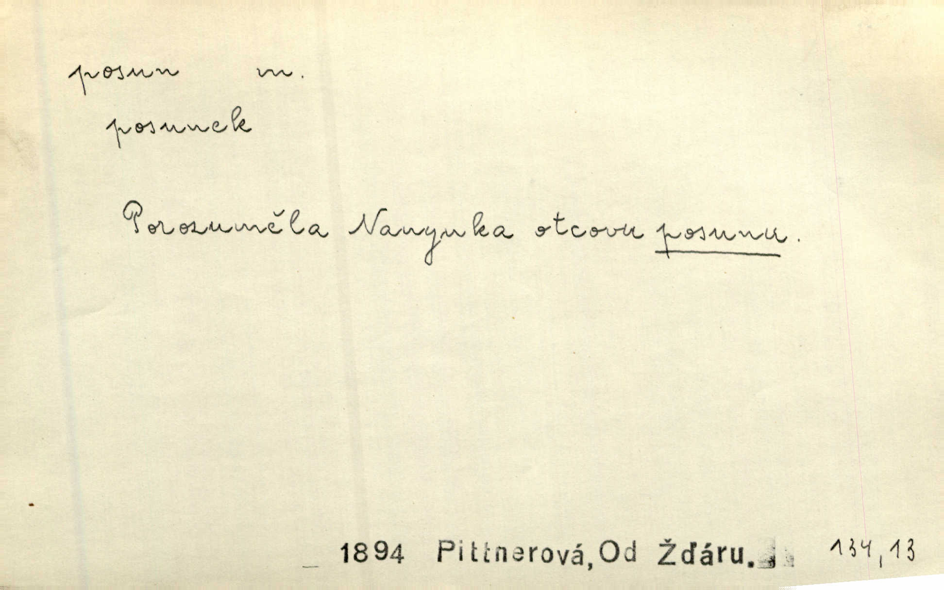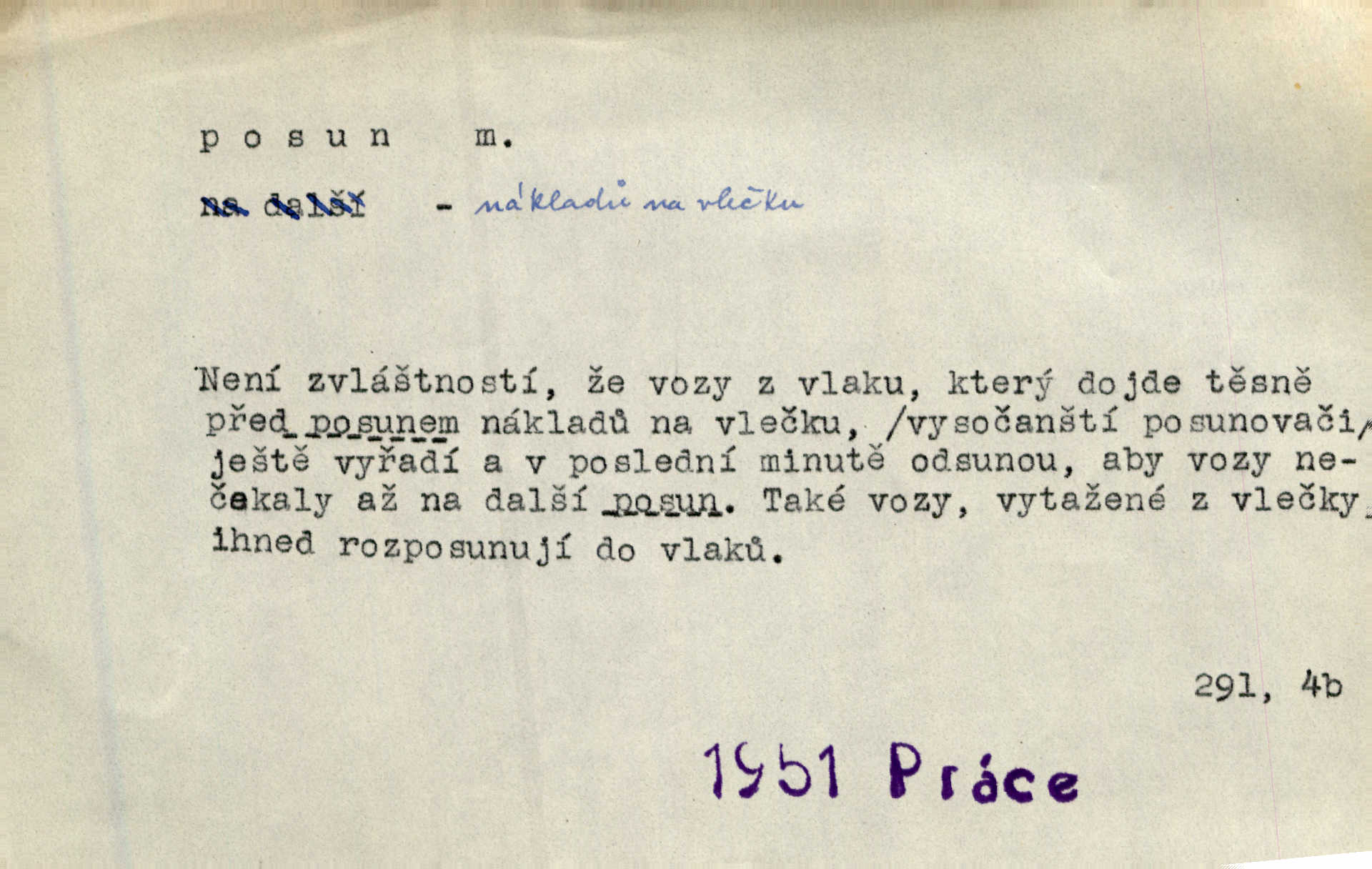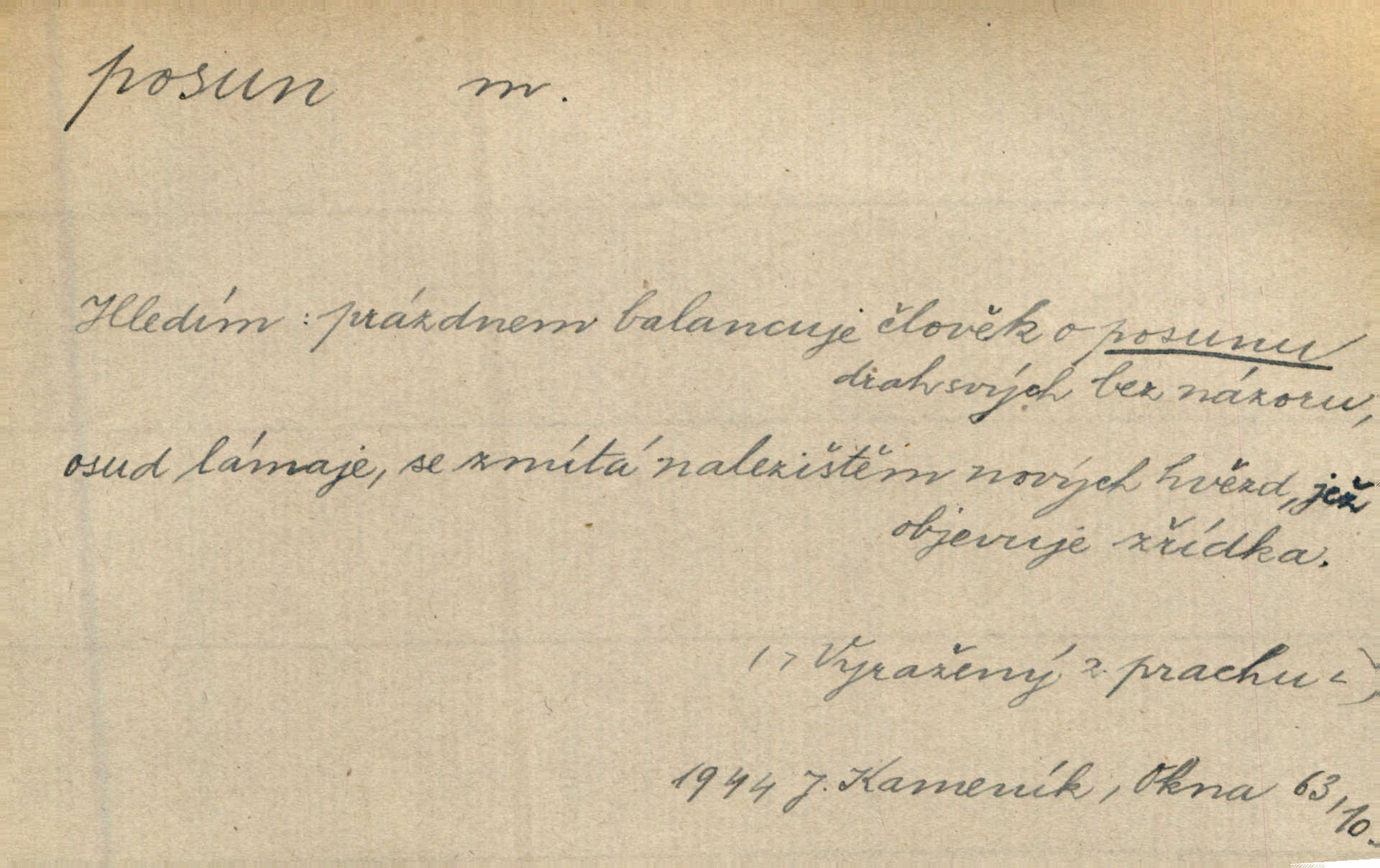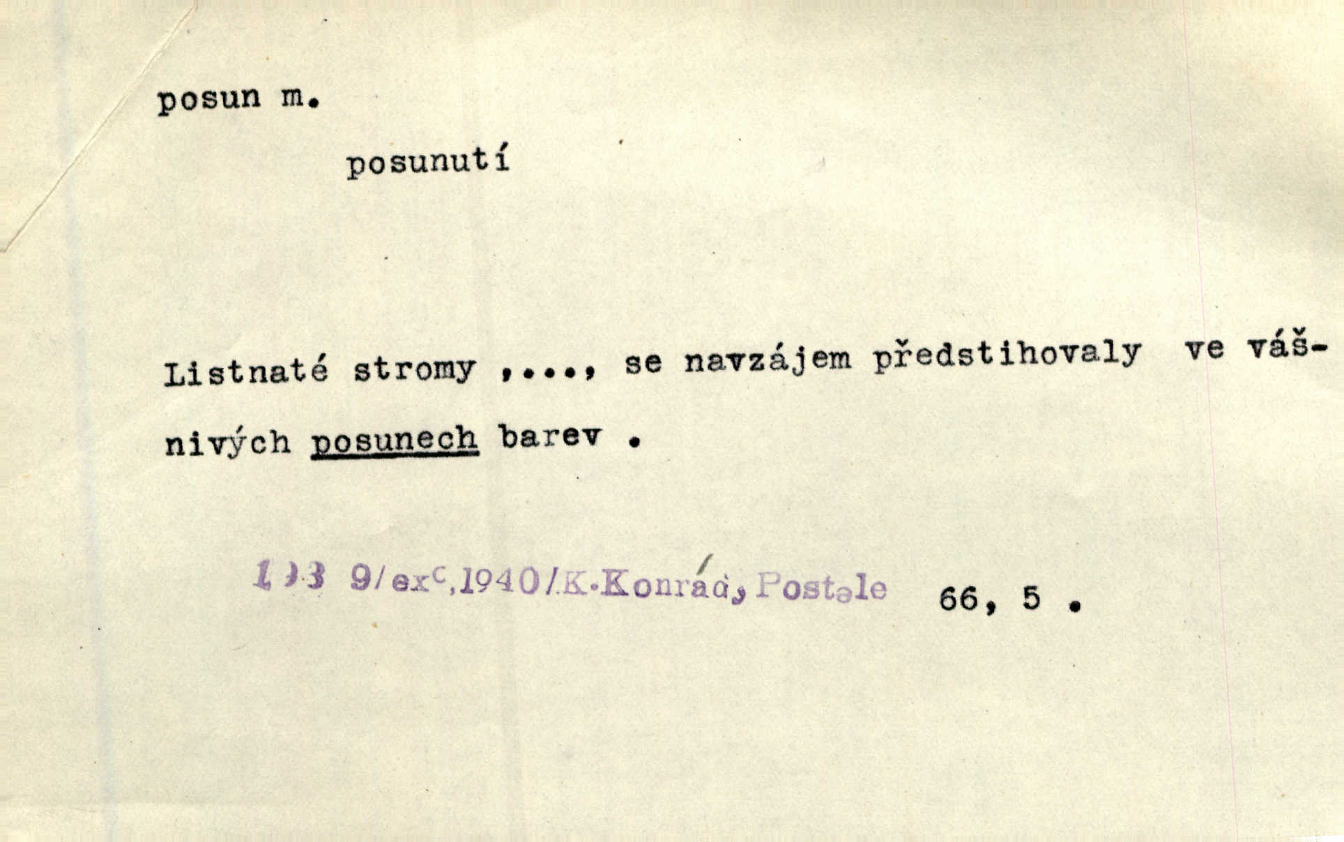 - posun, -u m. pohyb některou částí těla, posunek. Roztomilý byl ten každý její posun, pohled, úsměv. Mach. Mlčky mu posunem ruky ukázal, aby šel před ním. Šmil. Pro každý posun, pro každý akcent měla důvod. Vrch. Učiní zvláštní omrzelý posun, jakoby nějakou myšlenku v hlavě dlouhou a tlustou čárou přetrhával. Šrám. Přen. V básních Březinových setkáváš se s výraznými a typickými posuny a postoji, v něž ještě vtělena celá akce! Šal. Těl. posunování ruky při ručkování. Sport. (v šermu) ve střehu pohyb nohy stojící vpředu a hned za ním stejný pohyb nohy stojící vzadu. D jiný pohyb v prostoru. Líný proud [moře] nás [plavce] unášel směrem k pevnině, postrkuje nás rytmickými posuny vln. J. Čap. Vějířem tím nutno kývat v líném hodin posuně. Čech. Voj. pohyb jednotky z jednoho vyčkávacího postavení do druhého. Geol. druh poruchy způsobený pohybem ker (vrstev) ve směru vodorovném. Horizontální posun vrstev. El. tech. fázový posun časový rozdíl mezi napětím a proudem (u střídavého proudu), vyjádřený v úhlové míře, fázové pošinutí. Žel. sestavování vlaku, řadění jednotlivých vozů pro rozličné účely. Řidič posunu, dozorce posunu. D změna, proměna. Válka přinesla posun i ve světové výrobě. Přít. Století třinácté zemím českým přineslo pronikavý posun všech řádů životních. Šus. Národnostní boj a politické přesuny osvětlují lépe posuny, které vznikají mezi národnostmi v téže zemi vedle sebe žijícími měnou přirozenou. Vlastiv.