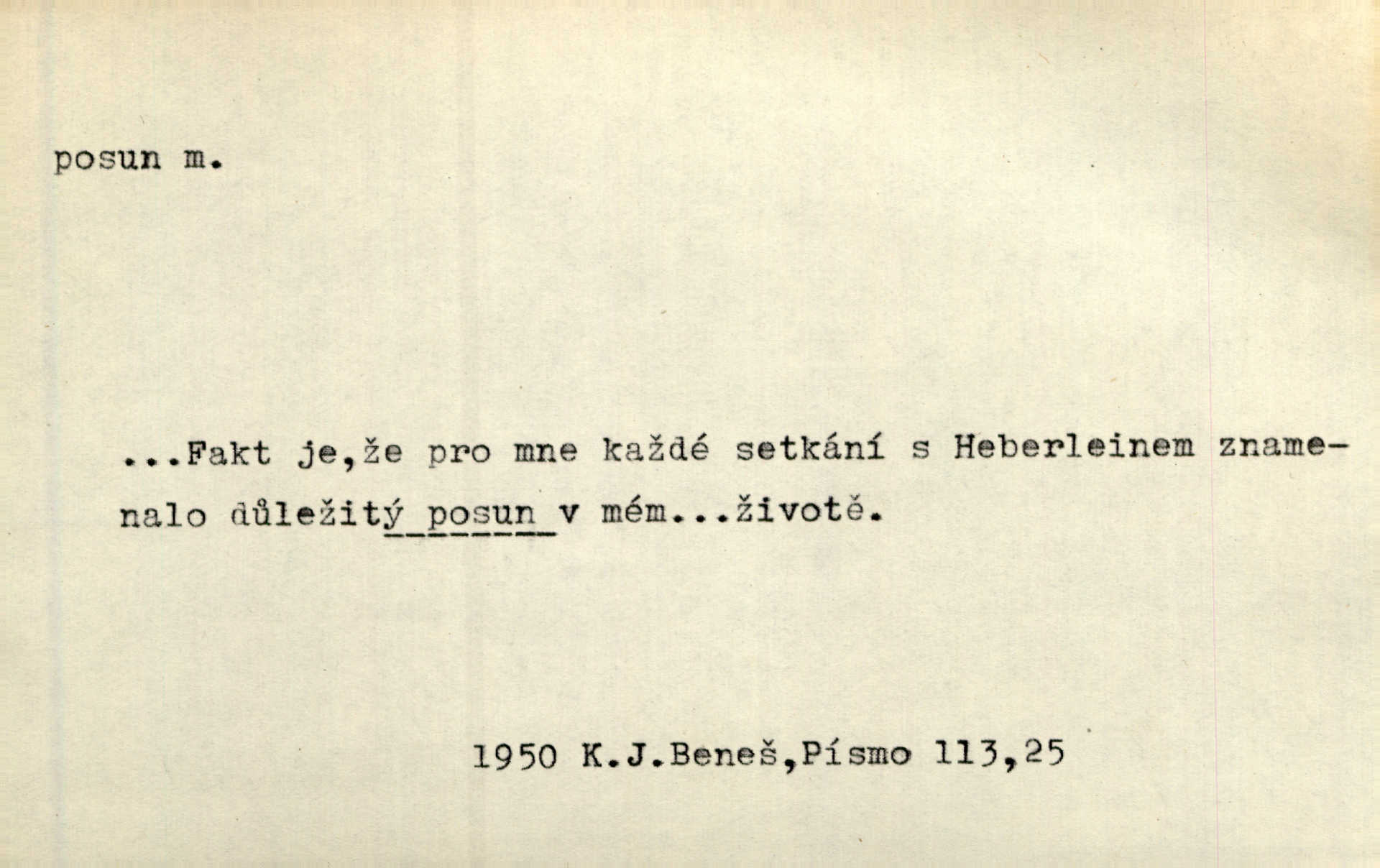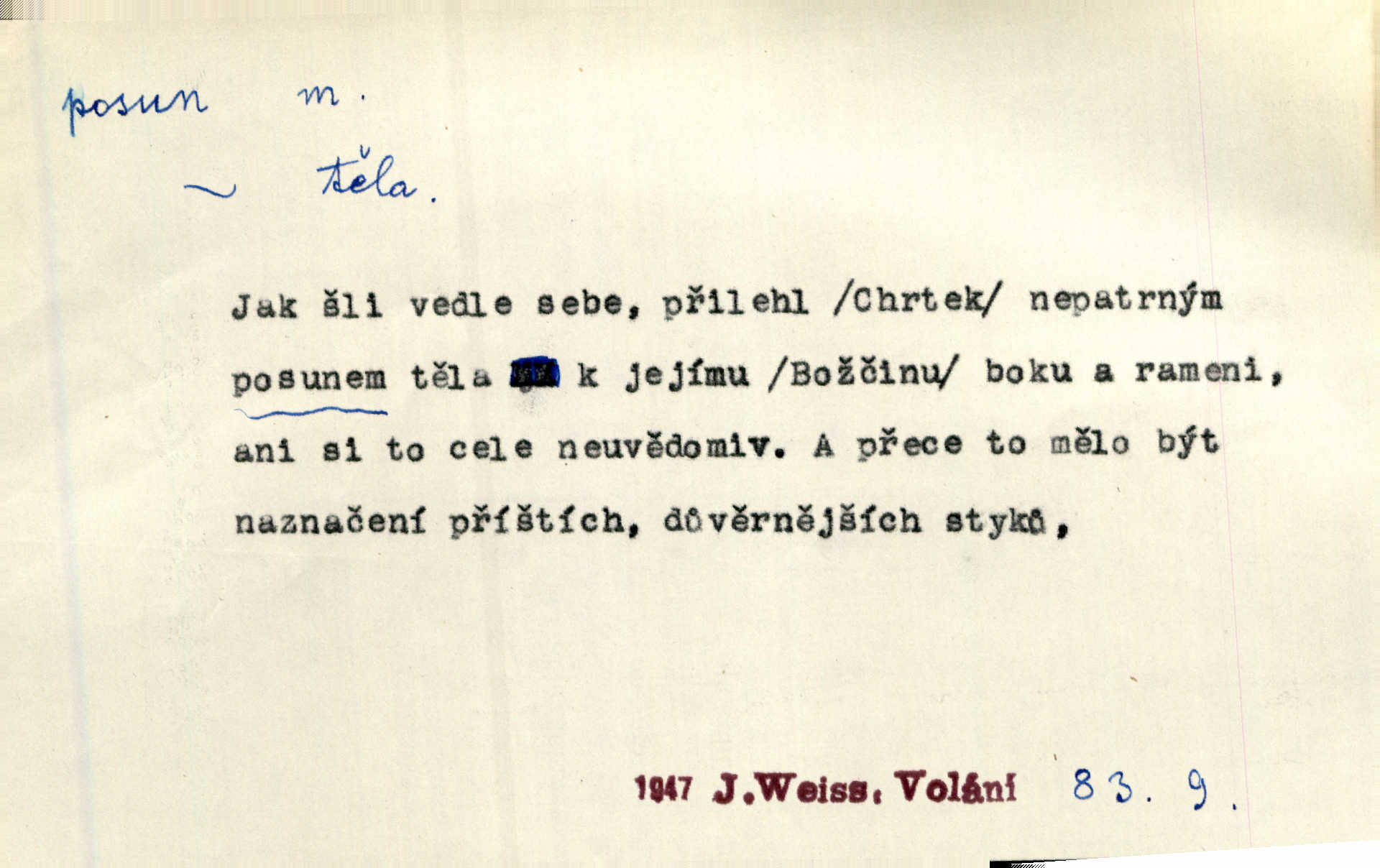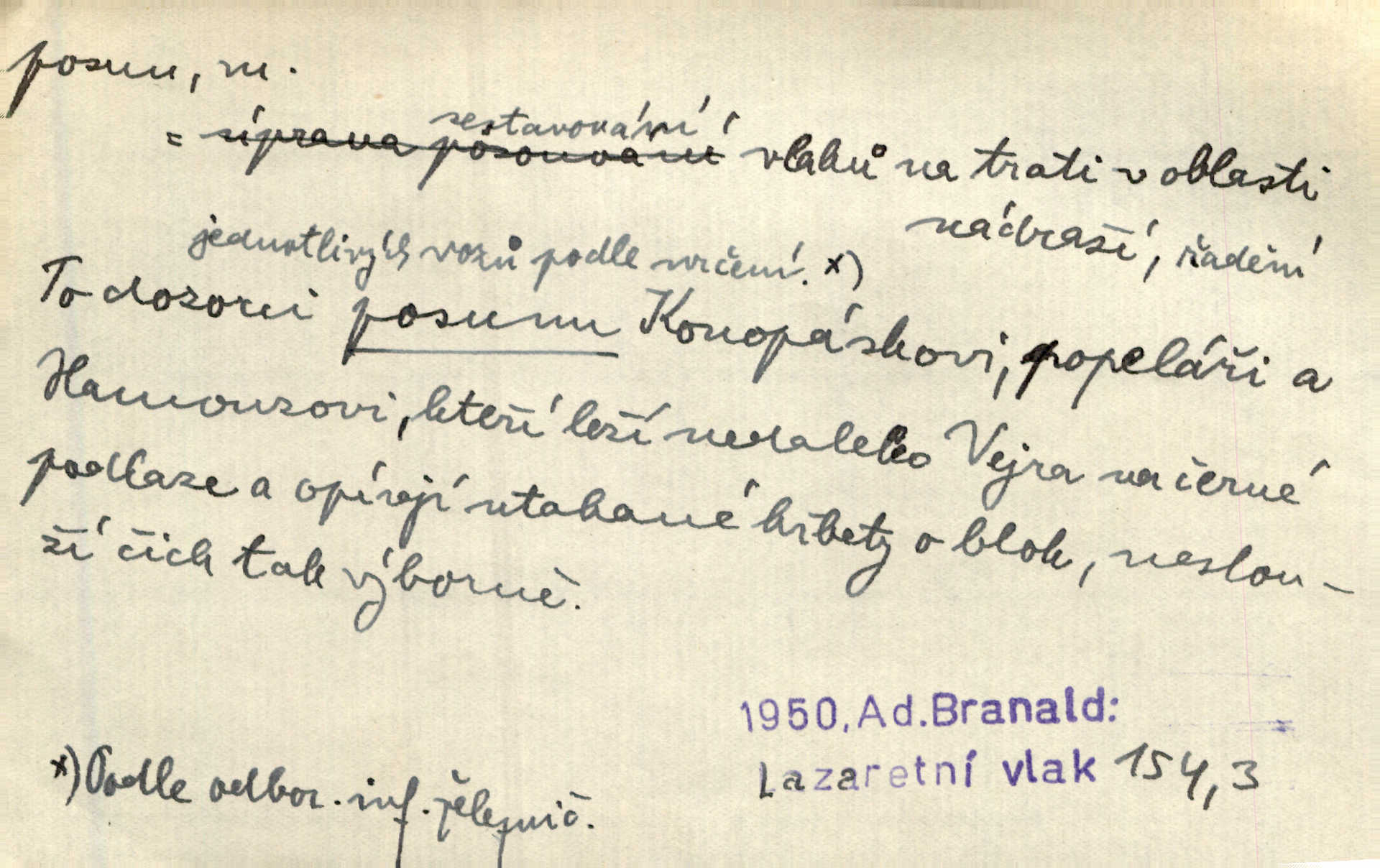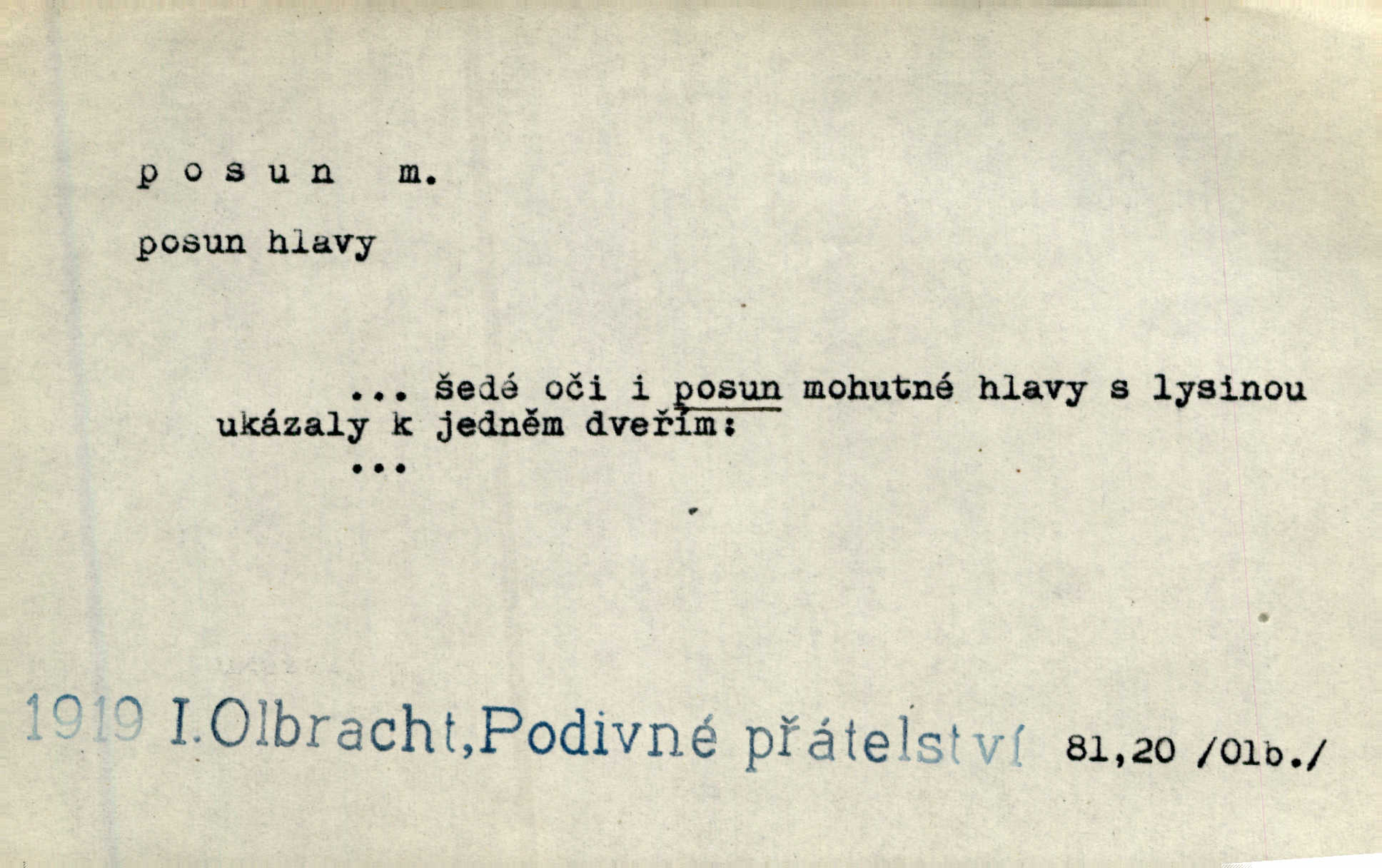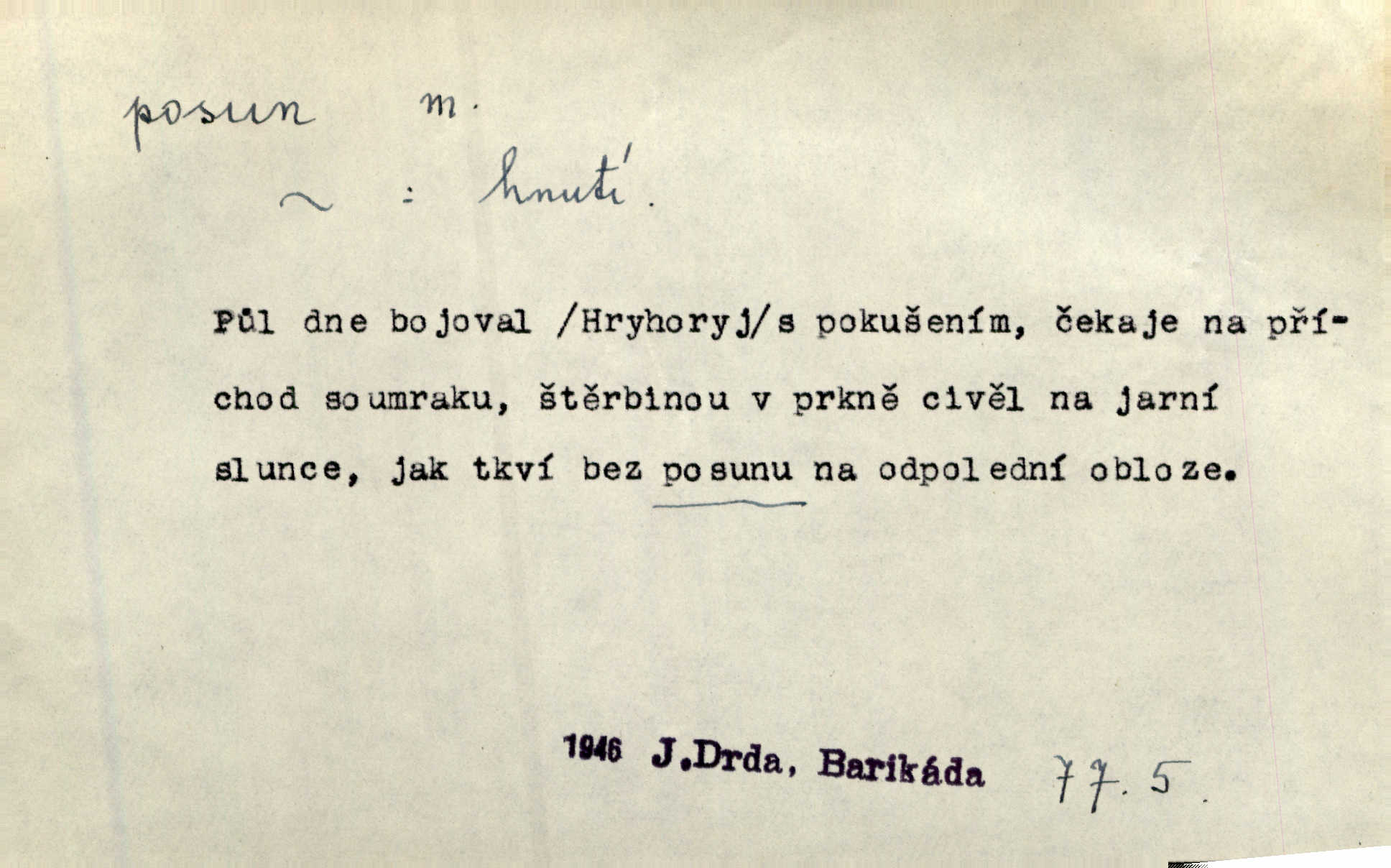 - posun, -u m. pohyb některou částí těla, posunek. Roztomilý byl ten každý její posun, pohled, úsměv. Mach. Mlčky mu posunem ruky ukázal, aby šel před ním. Šmil. Pro každý posun, pro každý akcent měla důvod. Vrch. Učiní zvláštní omrzelý posun, jakoby nějakou myšlenku v hlavě dlouhou a tlustou čárou přetrhával. Šrám. Přen. V básních Březinových setkáváš se s výraznými a typickými posuny a postoji, v něž ještě vtělena celá akce! Šal. Těl. posunování ruky při ručkování. Sport. (v šermu) ve střehu pohyb nohy stojící vpředu a hned za ním stejný pohyb nohy stojící vzadu. D jiný pohyb v prostoru. Líný proud [moře] nás [plavce] unášel směrem k pevnině, postrkuje nás rytmickými posuny vln. J. Čap. Vějířem tím nutno kývat v líném hodin posuně. Čech. Voj. pohyb jednotky z jednoho vyčkávacího postavení do druhého. Geol. druh poruchy způsobený pohybem ker (vrstev) ve směru vodorovném. Horizontální posun vrstev. El. tech. fázový posun časový rozdíl mezi napětím a proudem (u střídavého proudu), vyjádřený v úhlové míře, fázové pošinutí. Žel. sestavování vlaku, řadění jednotlivých vozů pro rozličné účely. Řidič posunu, dozorce posunu. D změna, proměna. Válka přinesla posun i ve světové výrobě. Přít. Století třinácté zemím českým přineslo pronikavý posun všech řádů životních. Šus. Národnostní boj a politické přesuny osvětlují lépe posuny, které vznikají mezi národnostmi v téže zemi vedle sebe žijícími měnou přirozenou. Vlastiv.