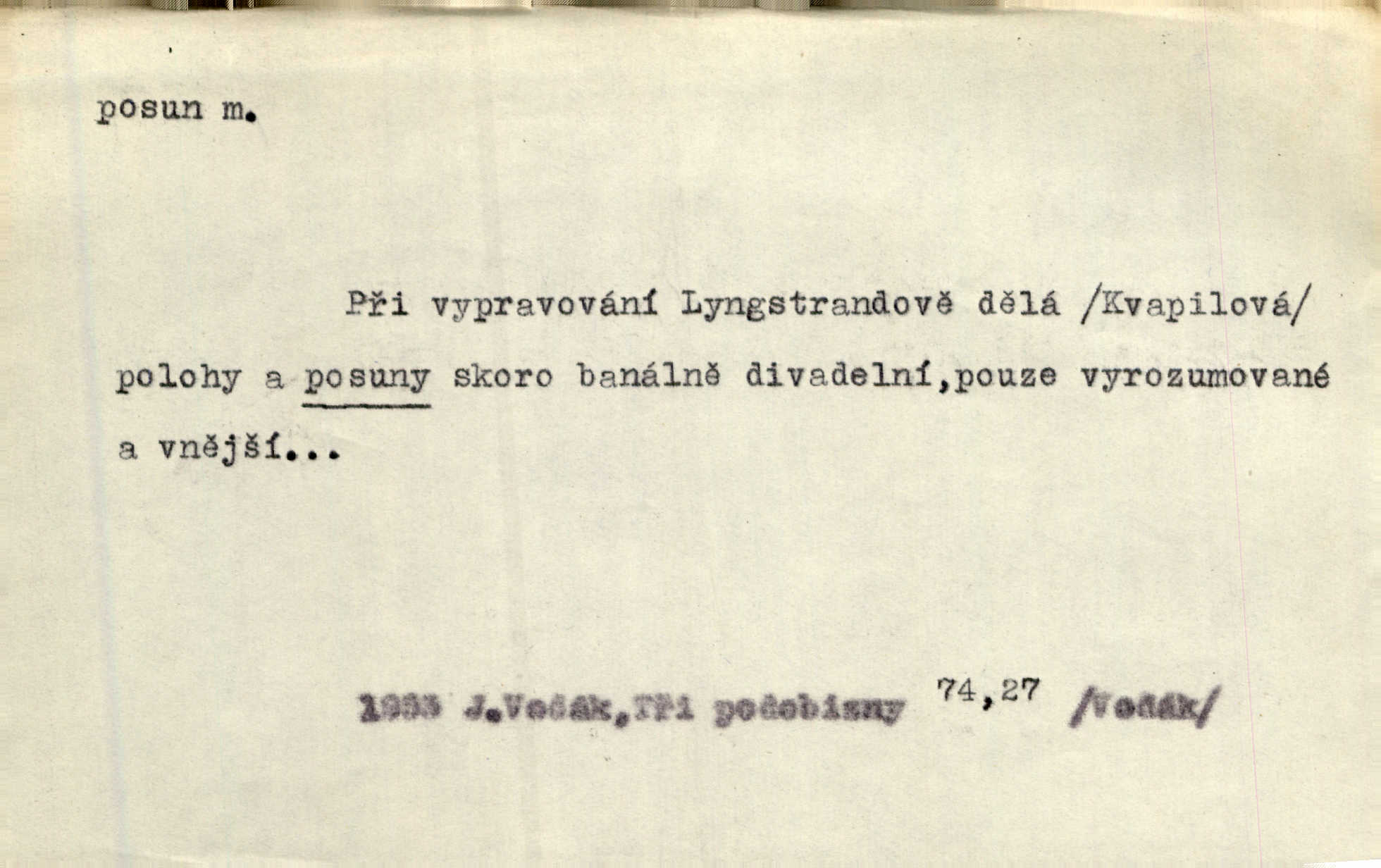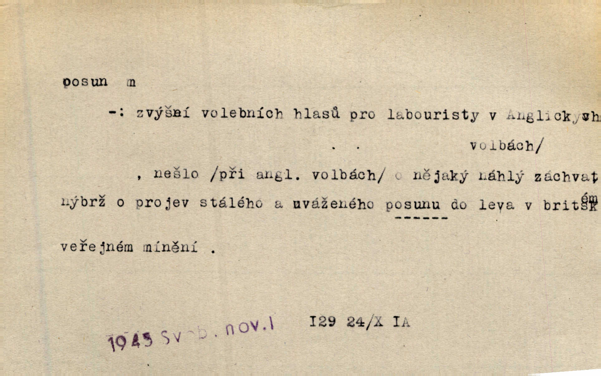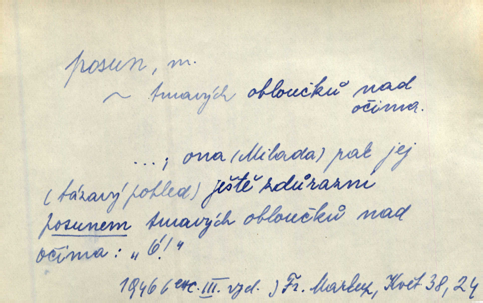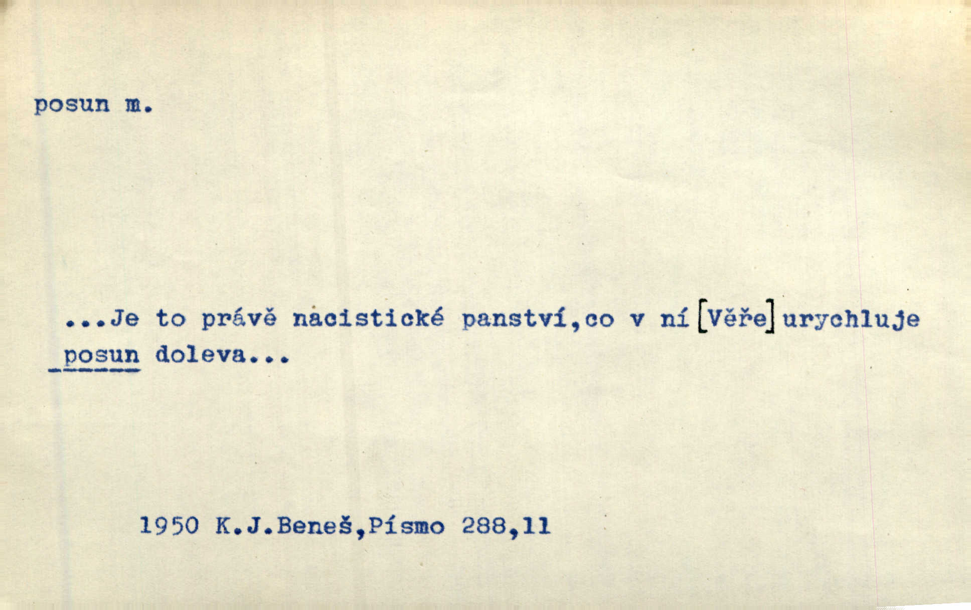 - posun, -u m. pohyb některou částí těla, posunek. Roztomilý byl ten každý její posun, pohled, úsměv. Mach. Mlčky mu posunem ruky ukázal, aby šel před ním. Šmil. Pro každý posun, pro každý akcent měla důvod. Vrch. Učiní zvláštní omrzelý posun, jakoby nějakou myšlenku v hlavě dlouhou a tlustou čárou přetrhával. Šrám. Přen. V básních Březinových setkáváš se s výraznými a typickými posuny a postoji, v něž ještě vtělena celá akce! Šal. Těl. posunování ruky při ručkování. Sport. (v šermu) ve střehu pohyb nohy stojící vpředu a hned za ním stejný pohyb nohy stojící vzadu. D jiný pohyb v prostoru. Líný proud [moře] nás [plavce] unášel směrem k pevnině, postrkuje nás rytmickými posuny vln. J. Čap. Vějířem tím nutno kývat v líném hodin posuně. Čech. Voj. pohyb jednotky z jednoho vyčkávacího postavení do druhého. Geol. druh poruchy způsobený pohybem ker (vrstev) ve směru vodorovném. Horizontální posun vrstev. El. tech. fázový posun časový rozdíl mezi napětím a proudem (u střídavého proudu), vyjádřený v úhlové míře, fázové pošinutí. Žel. sestavování vlaku, řadění jednotlivých vozů pro rozličné účely. Řidič posunu, dozorce posunu. D změna, proměna. Válka přinesla posun i ve světové výrobě. Přít. Století třinácté zemím českým přineslo pronikavý posun všech řádů životních. Šus. Národnostní boj a politické přesuny osvětlují lépe posuny, které vznikají mezi národnostmi v téže zemi vedle sebe žijícími měnou přirozenou. Vlastiv.