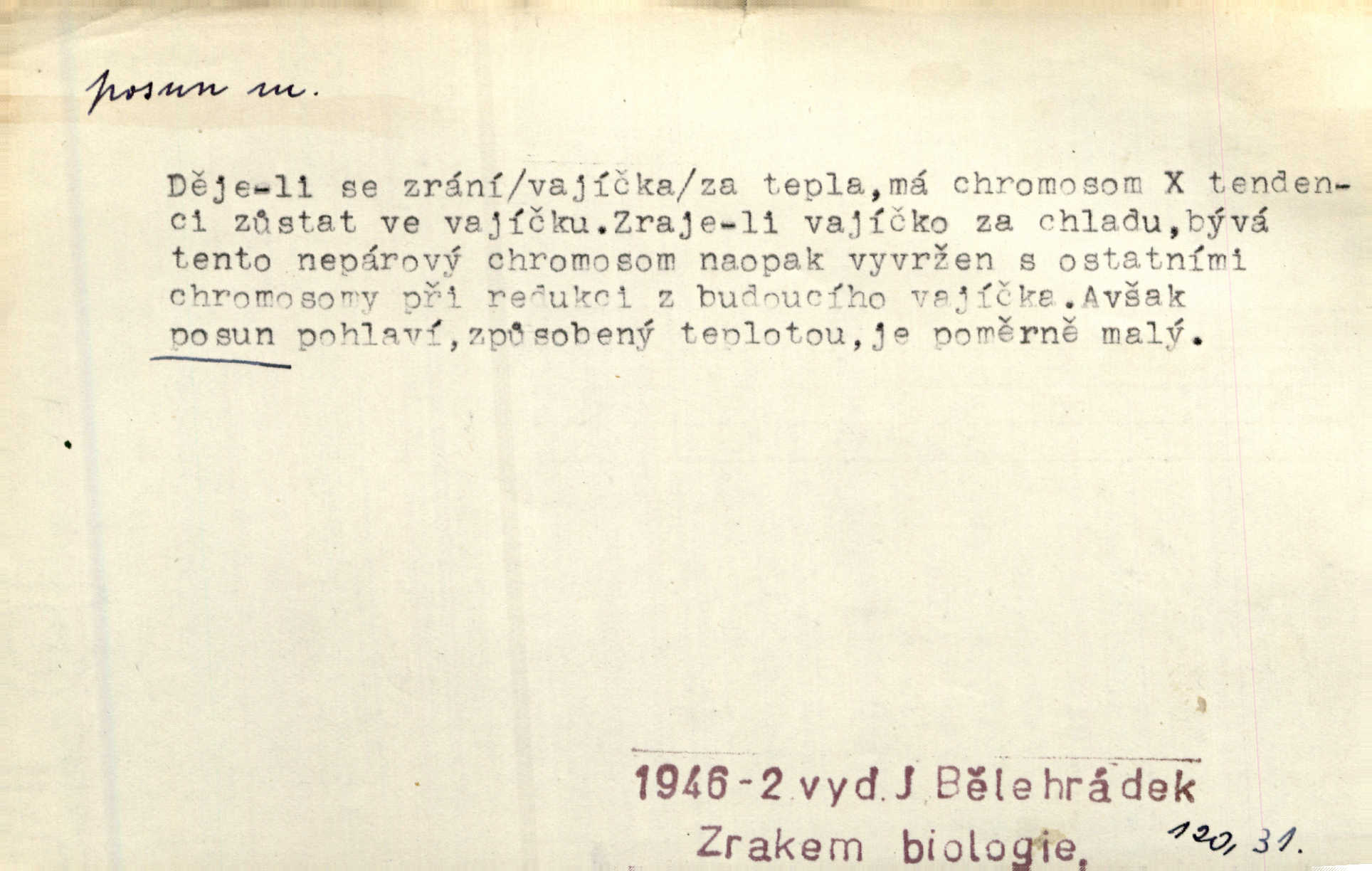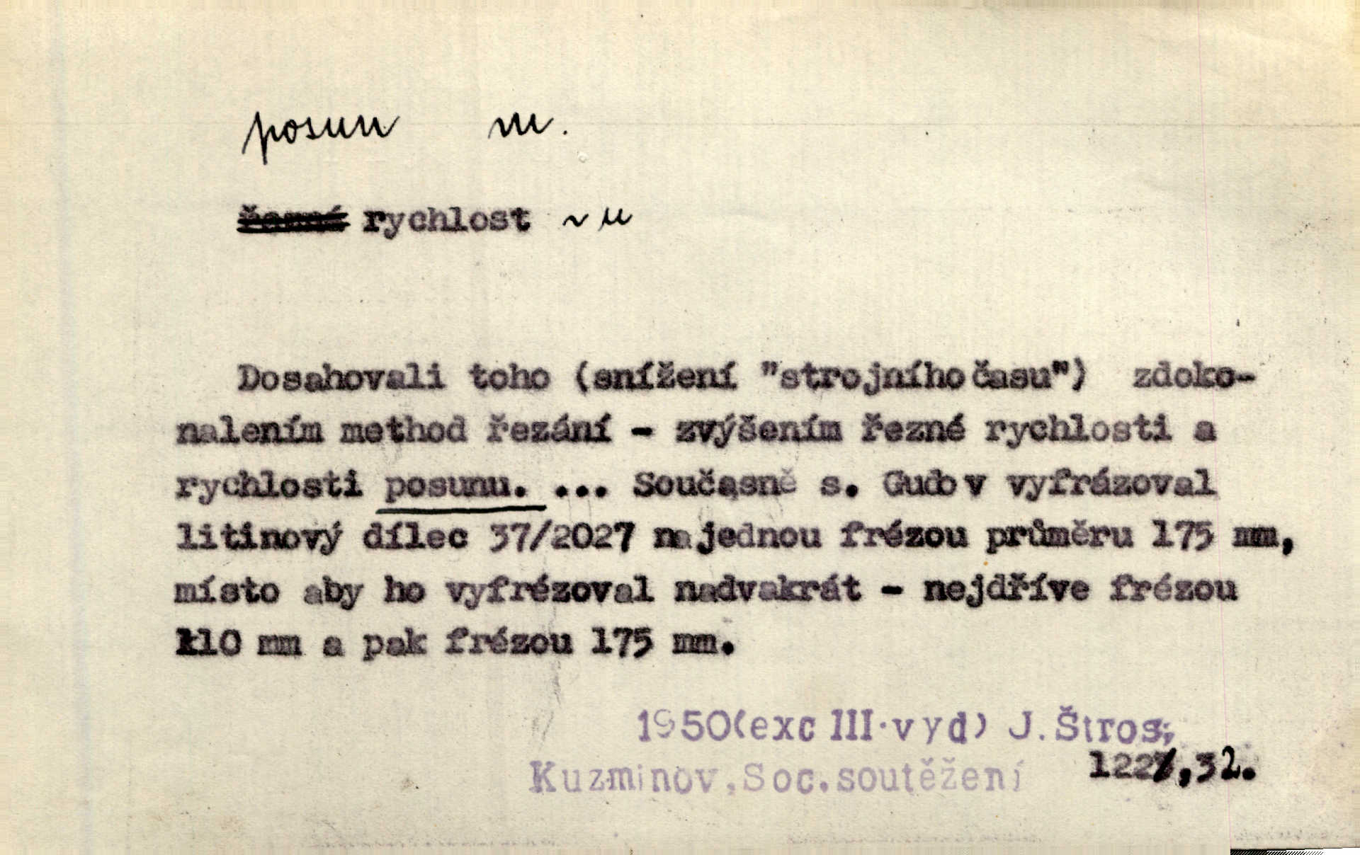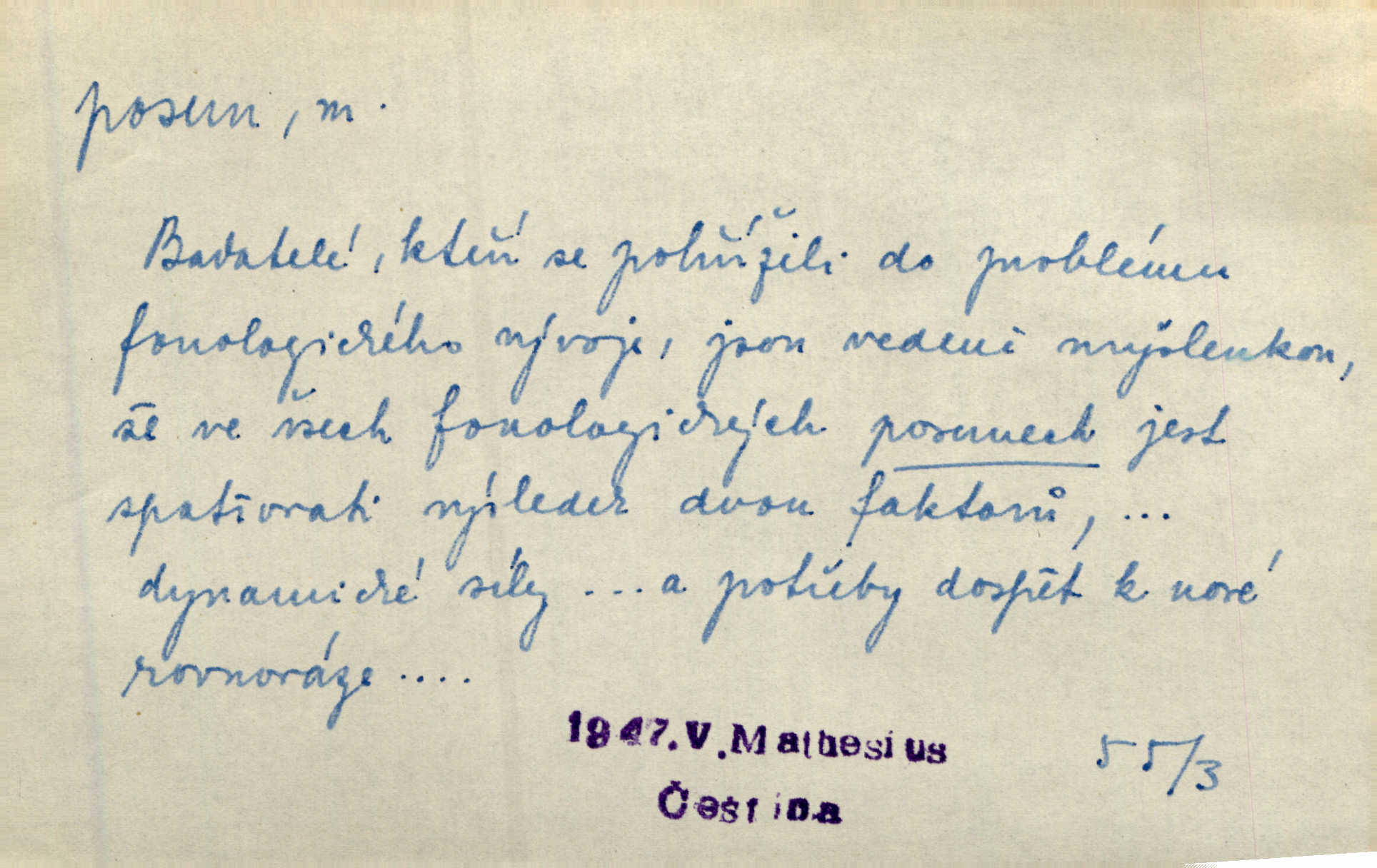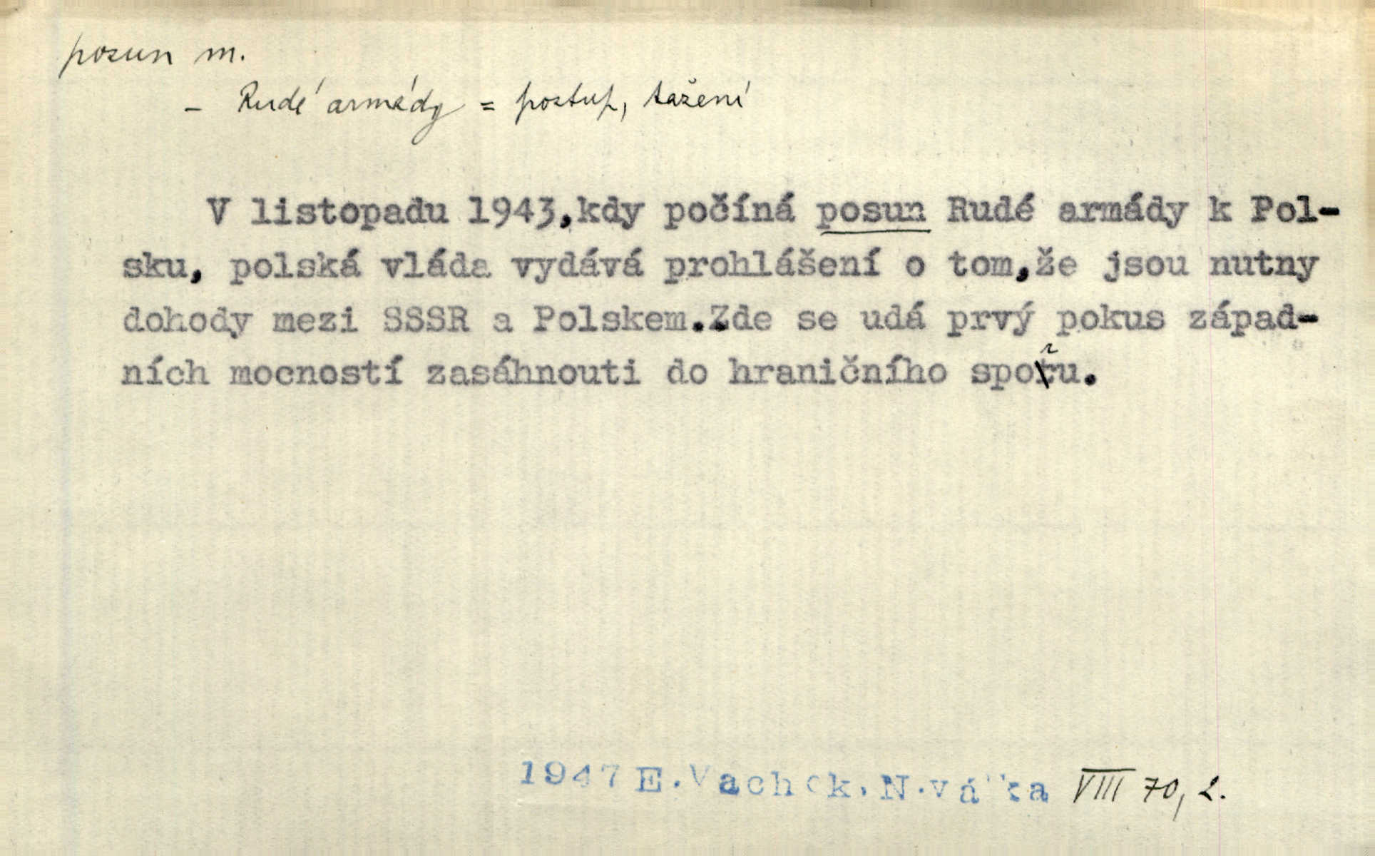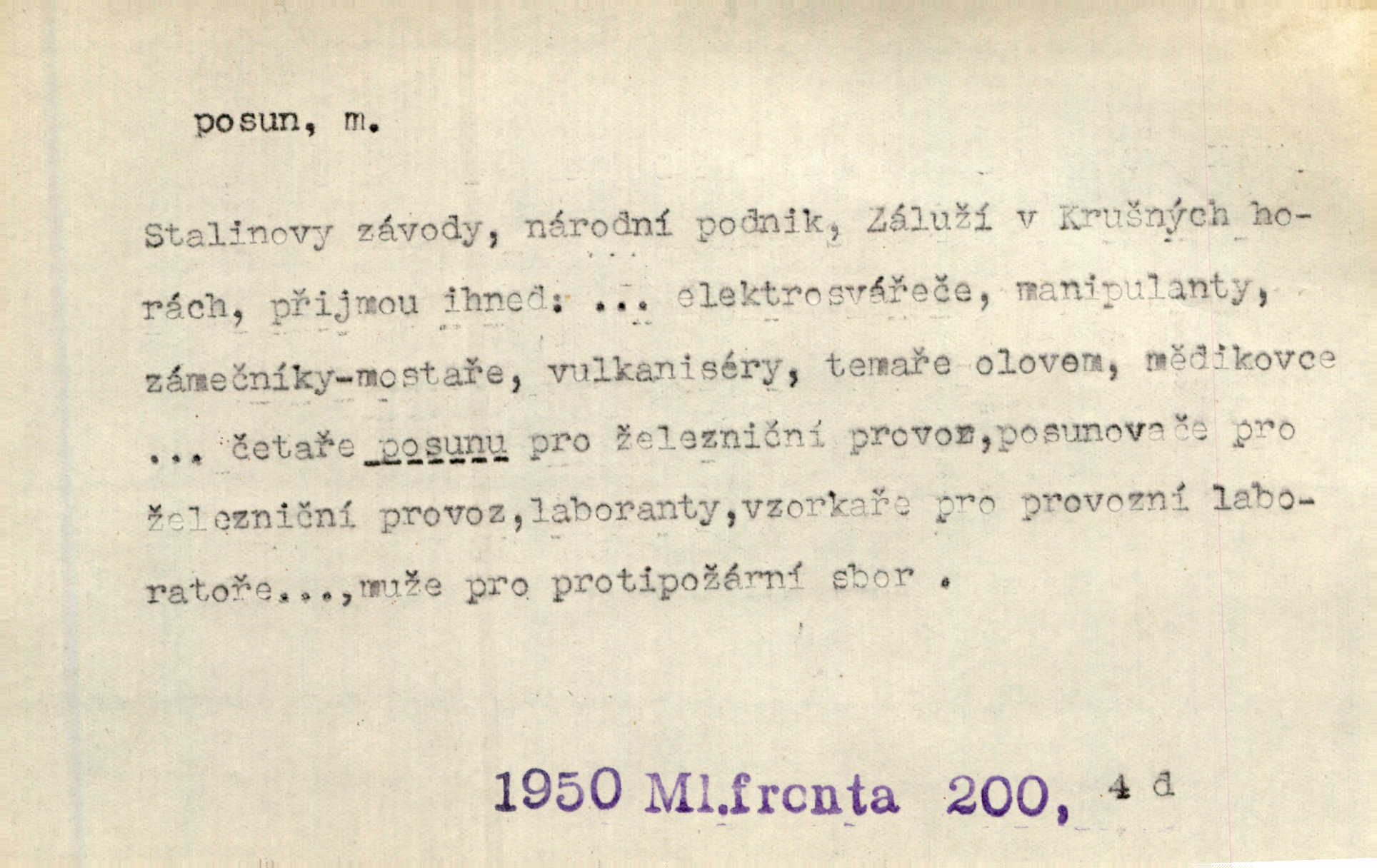 - posun, -u m. pohyb některou částí těla, posunek. Roztomilý byl ten každý její posun, pohled, úsměv. Mach. Mlčky mu posunem ruky ukázal, aby šel před ním. Šmil. Pro každý posun, pro každý akcent měla důvod. Vrch. Učiní zvláštní omrzelý posun, jakoby nějakou myšlenku v hlavě dlouhou a tlustou čárou přetrhával. Šrám. Přen. V básních Březinových setkáváš se s výraznými a typickými posuny a postoji, v něž ještě vtělena celá akce! Šal. Těl. posunování ruky při ručkování. Sport. (v šermu) ve střehu pohyb nohy stojící vpředu a hned za ním stejný pohyb nohy stojící vzadu. D jiný pohyb v prostoru. Líný proud [moře] nás [plavce] unášel směrem k pevnině, postrkuje nás rytmickými posuny vln. J. Čap. Vějířem tím nutno kývat v líném hodin posuně. Čech. Voj. pohyb jednotky z jednoho vyčkávacího postavení do druhého. Geol. druh poruchy způsobený pohybem ker (vrstev) ve směru vodorovném. Horizontální posun vrstev. El. tech. fázový posun časový rozdíl mezi napětím a proudem (u střídavého proudu), vyjádřený v úhlové míře, fázové pošinutí. Žel. sestavování vlaku, řadění jednotlivých vozů pro rozličné účely. Řidič posunu, dozorce posunu. D změna, proměna. Válka přinesla posun i ve světové výrobě. Přít. Století třinácté zemím českým přineslo pronikavý posun všech řádů životních. Šus. Národnostní boj a politické přesuny osvětlují lépe posuny, které vznikají mezi národnostmi v téže zemi vedle sebe žijícími měnou přirozenou. Vlastiv.