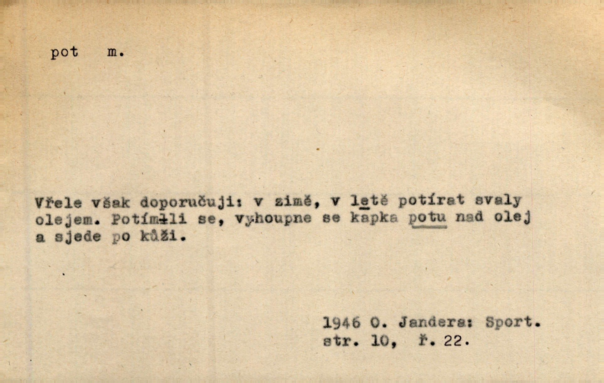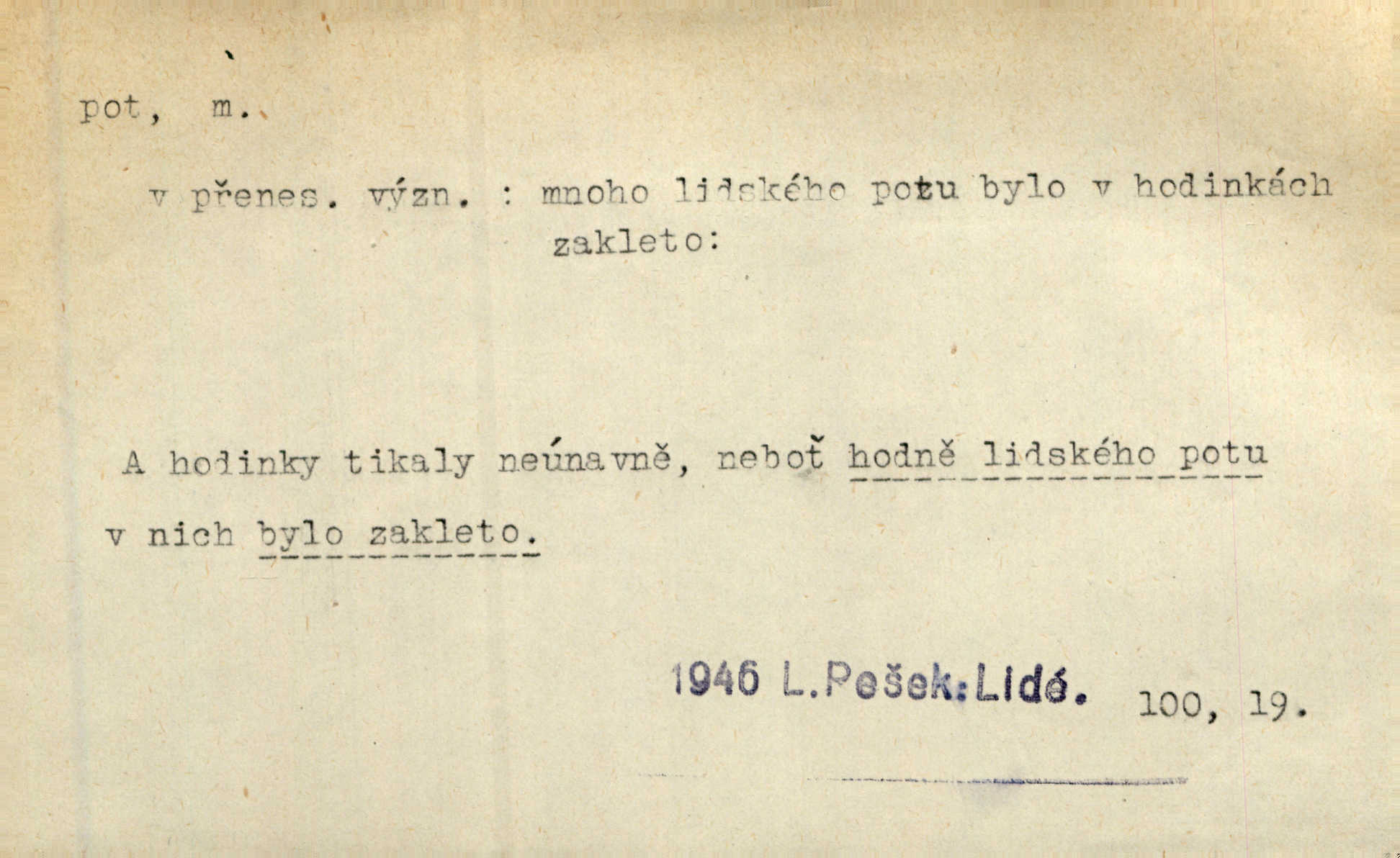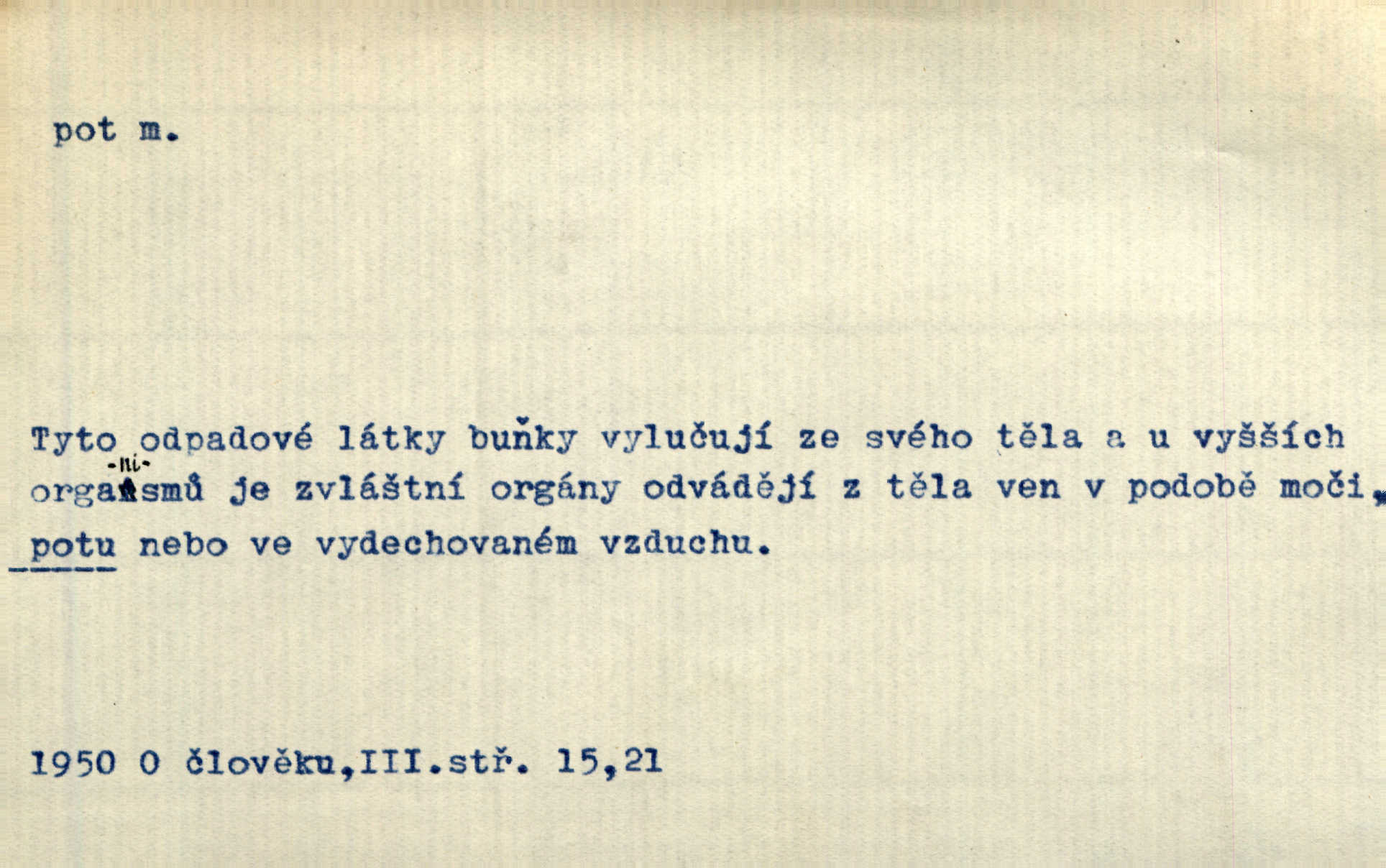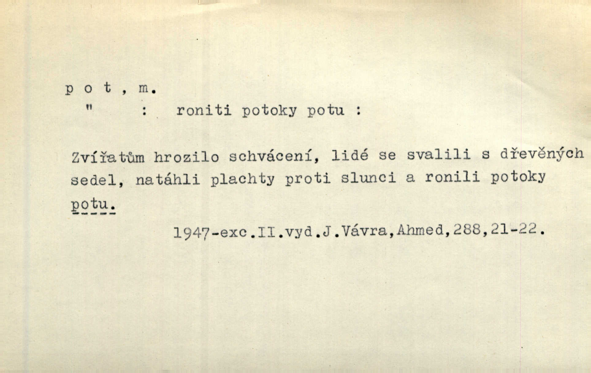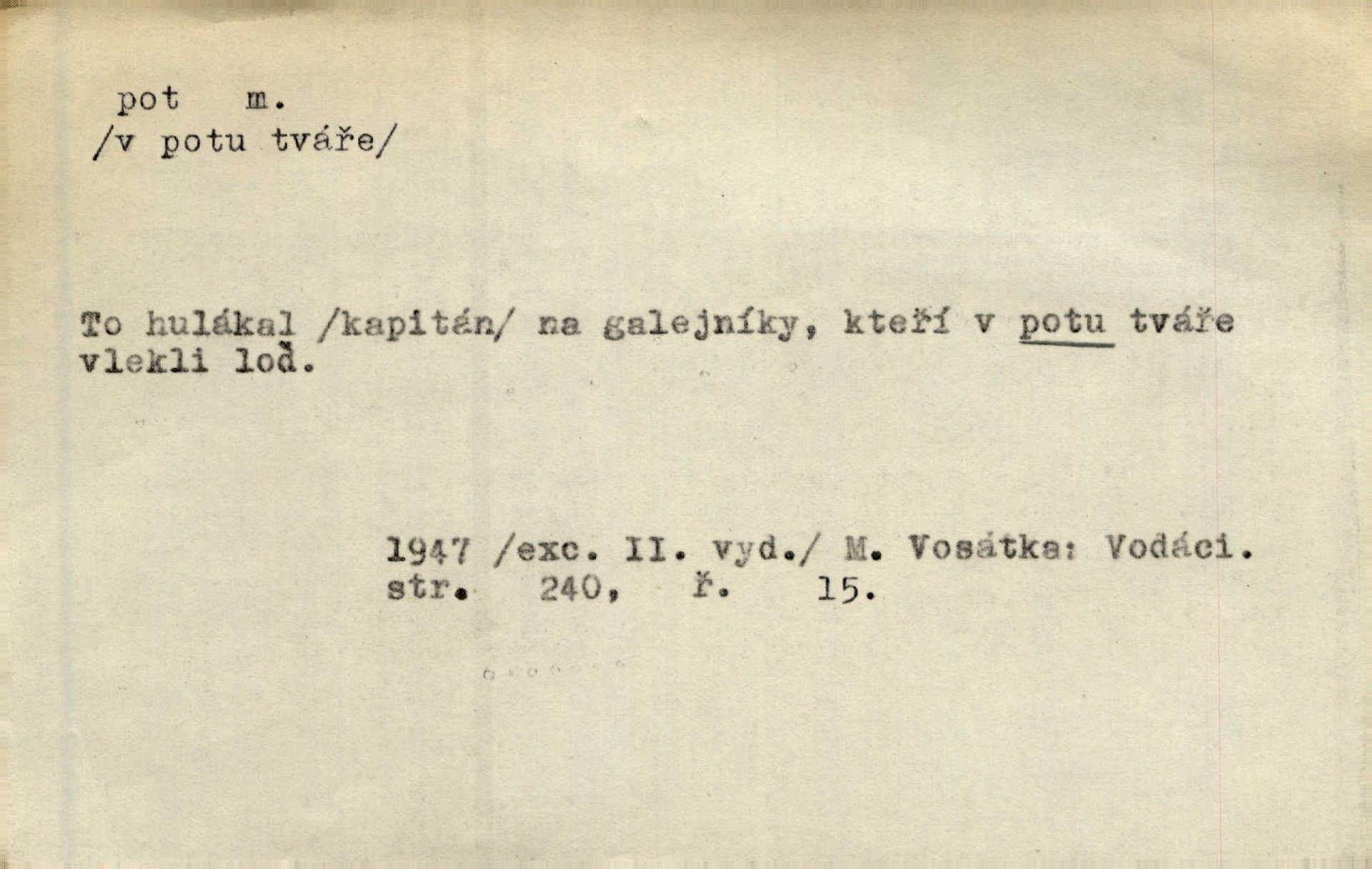 - pot, -u m. čirá, bezbarvá tekutina, slané chuti a nepříjemného zápachu, vyměšovaná zvláštními žlázami z kůže. Václav štípal, až se mu pot vyrážel na čele. Just. Drobounký pot se mu leskl na čele. Jir. Slunce pralo do kůže, pot se lil v potůčkách. Just. Není mi dobře, ale dostanu-li se do potu, bude dobře. Jir. Cítil jsem, na čele že mi vyskakuje pot. Šim. Obročnímu vyvstal na čele smrtelný pot. Šmil. Sedlák lpí na té hrudě, z které v potu tváři chléb dobývá. Něm. Lék. pot zbarvený, krvavý, zapáchající chorobné odchylky potu. D Expr. těžká práce, námaha. Páni ssáli jeho [sedlákovu] krev a za jeho pot hodovali. Jir. Rolník po vedru a potu žní slaví příjemné obžinky. Šmil. D Zř. pára sražená v kapičkách na povrchu něčeho. Příjemné teplo rozbíhá se síní a po vnitřních oknech řine se pot. Ner.
