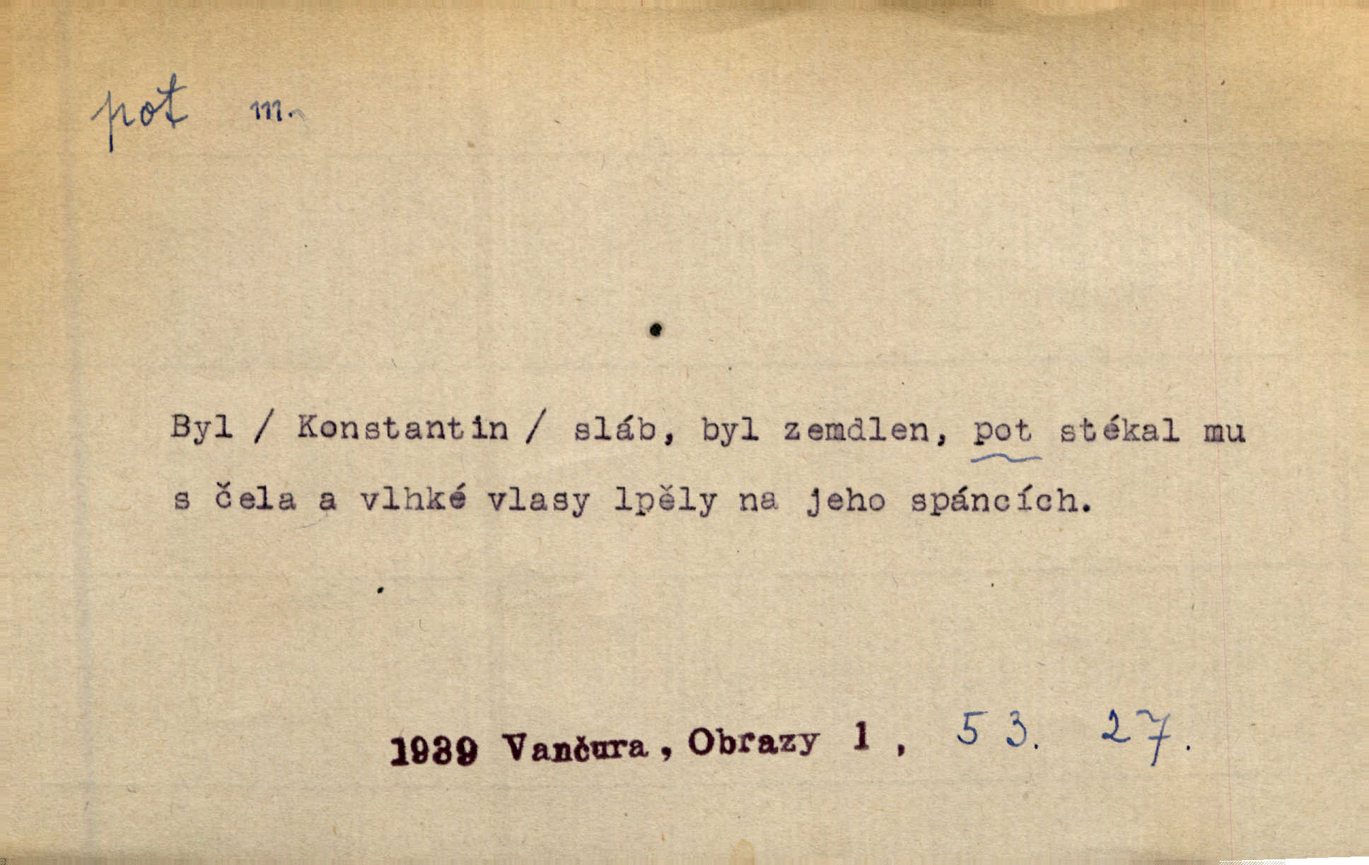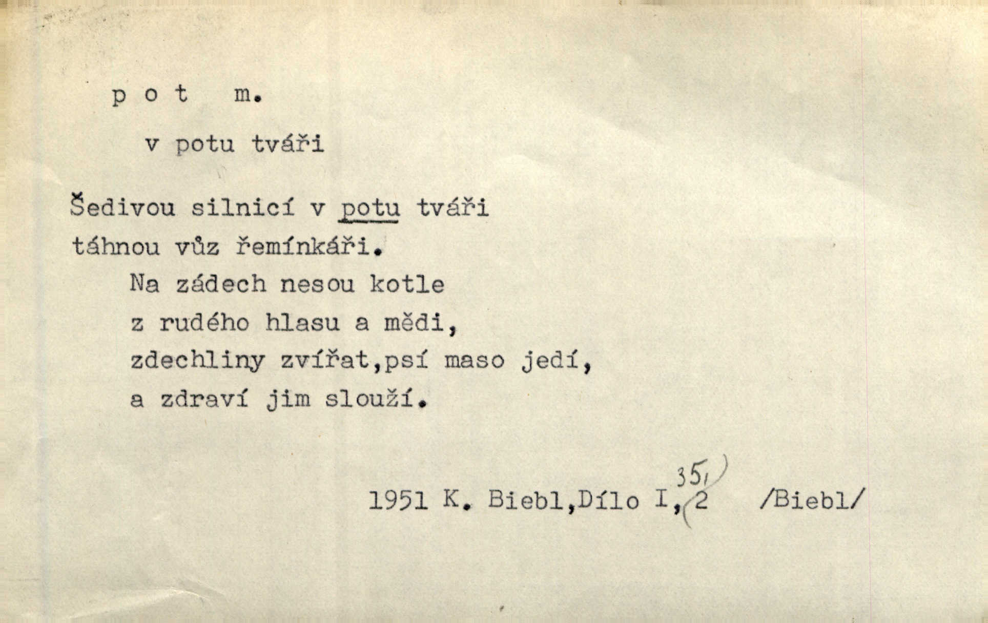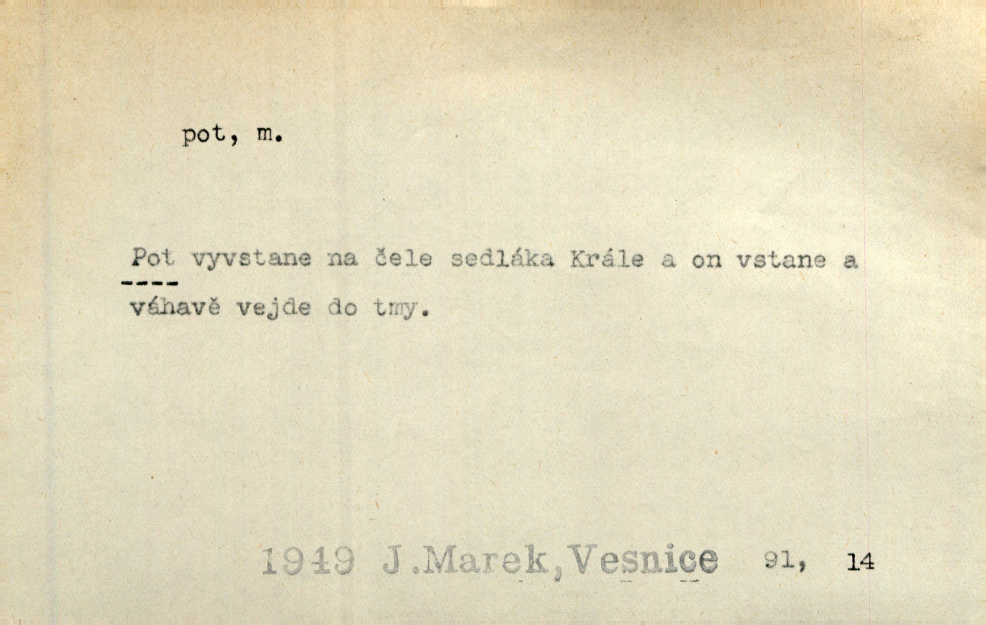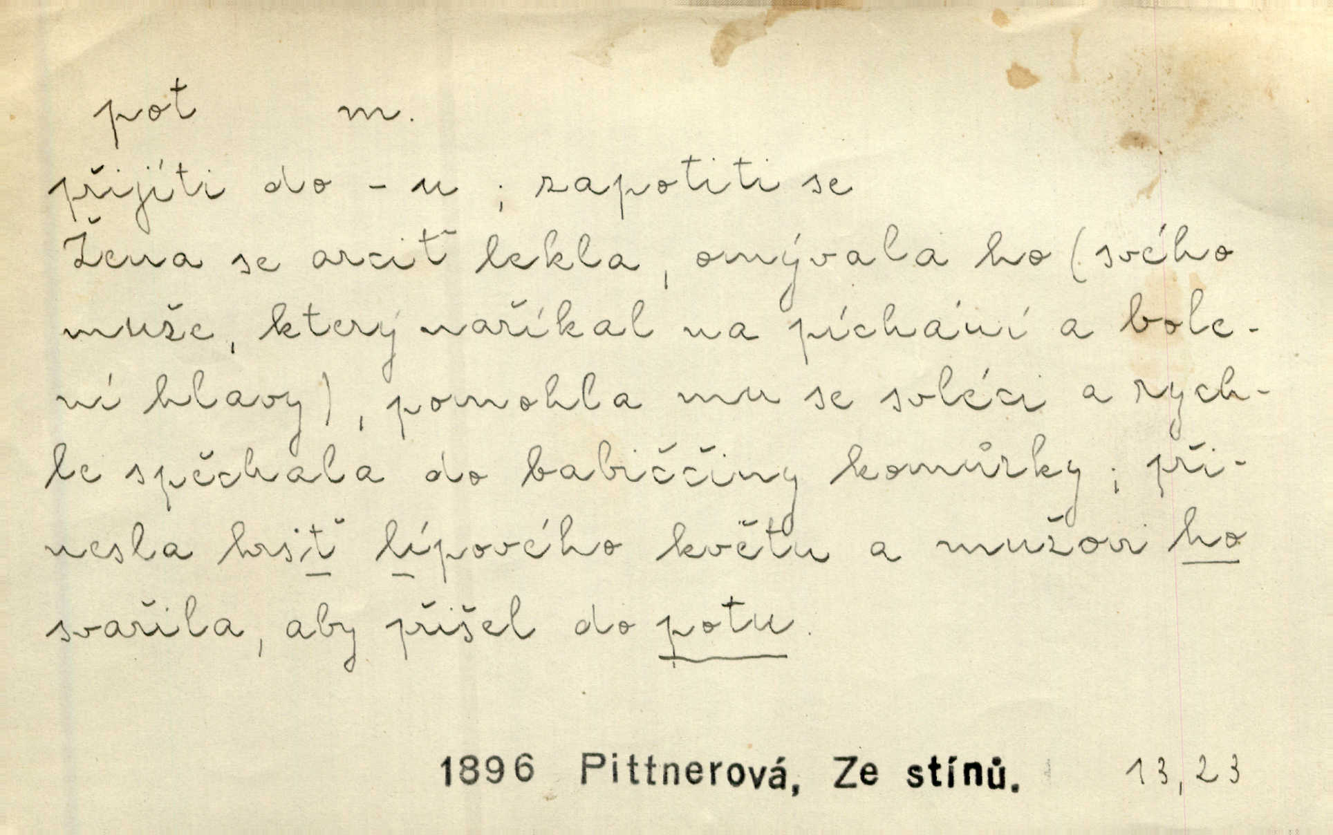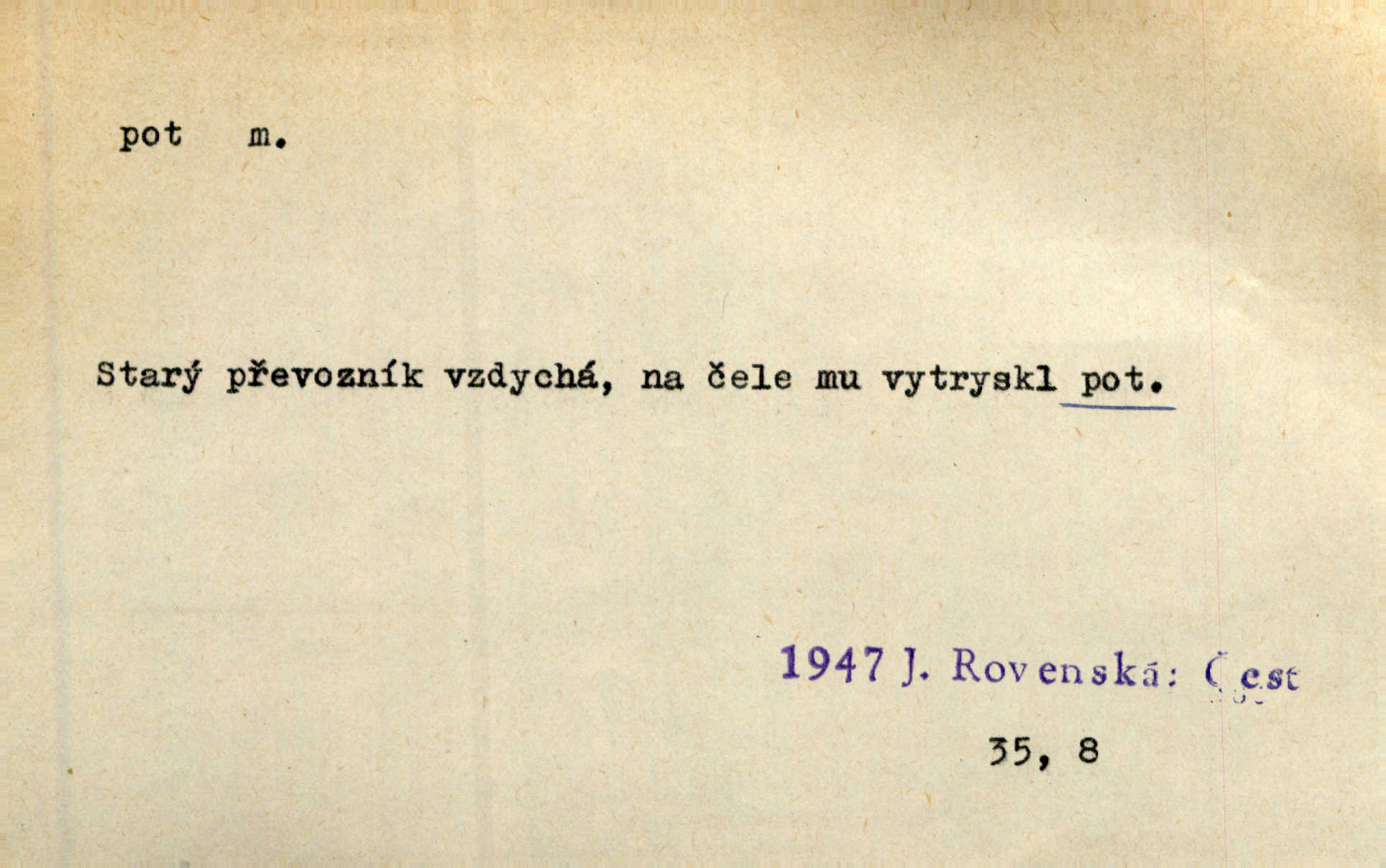 - pot, -u m. čirá, bezbarvá tekutina, slané chuti a nepříjemného zápachu, vyměšovaná zvláštními žlázami z kůže. Václav štípal, až se mu pot vyrážel na čele. Just. Drobounký pot se mu leskl na čele. Jir. Slunce pralo do kůže, pot se lil v potůčkách. Just. Není mi dobře, ale dostanu-li se do potu, bude dobře. Jir. Cítil jsem, na čele že mi vyskakuje pot. Šim. Obročnímu vyvstal na čele smrtelný pot. Šmil. Sedlák lpí na té hrudě, z které v potu tváři chléb dobývá. Něm. Lék. pot zbarvený, krvavý, zapáchající chorobné odchylky potu. D Expr. těžká práce, námaha. Páni ssáli jeho [sedlákovu] krev a za jeho pot hodovali. Jir. Rolník po vedru a potu žní slaví příjemné obžinky. Šmil. D Zř. pára sražená v kapičkách na povrchu něčeho. Příjemné teplo rozbíhá se síní a po vnitřních oknech řine se pot. Ner.