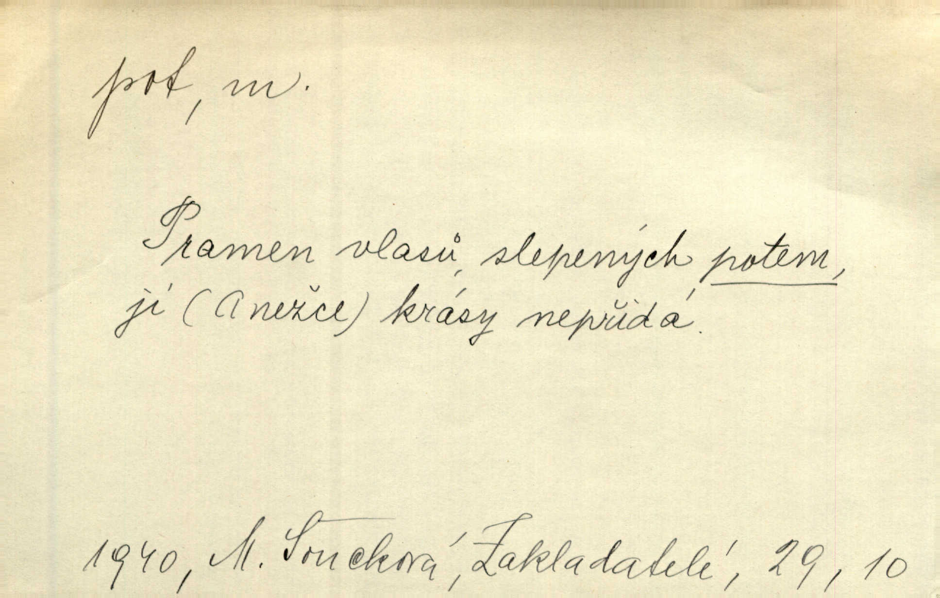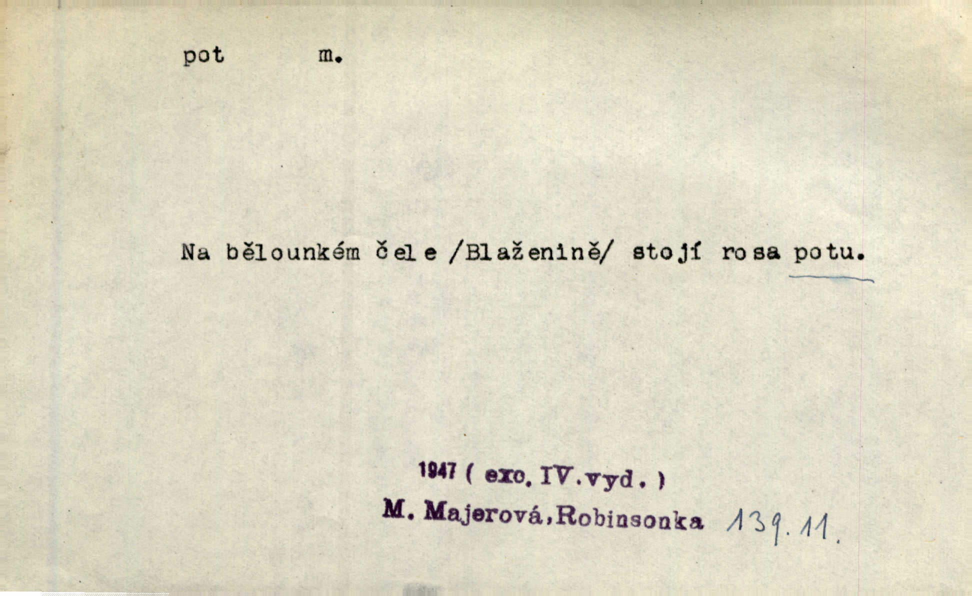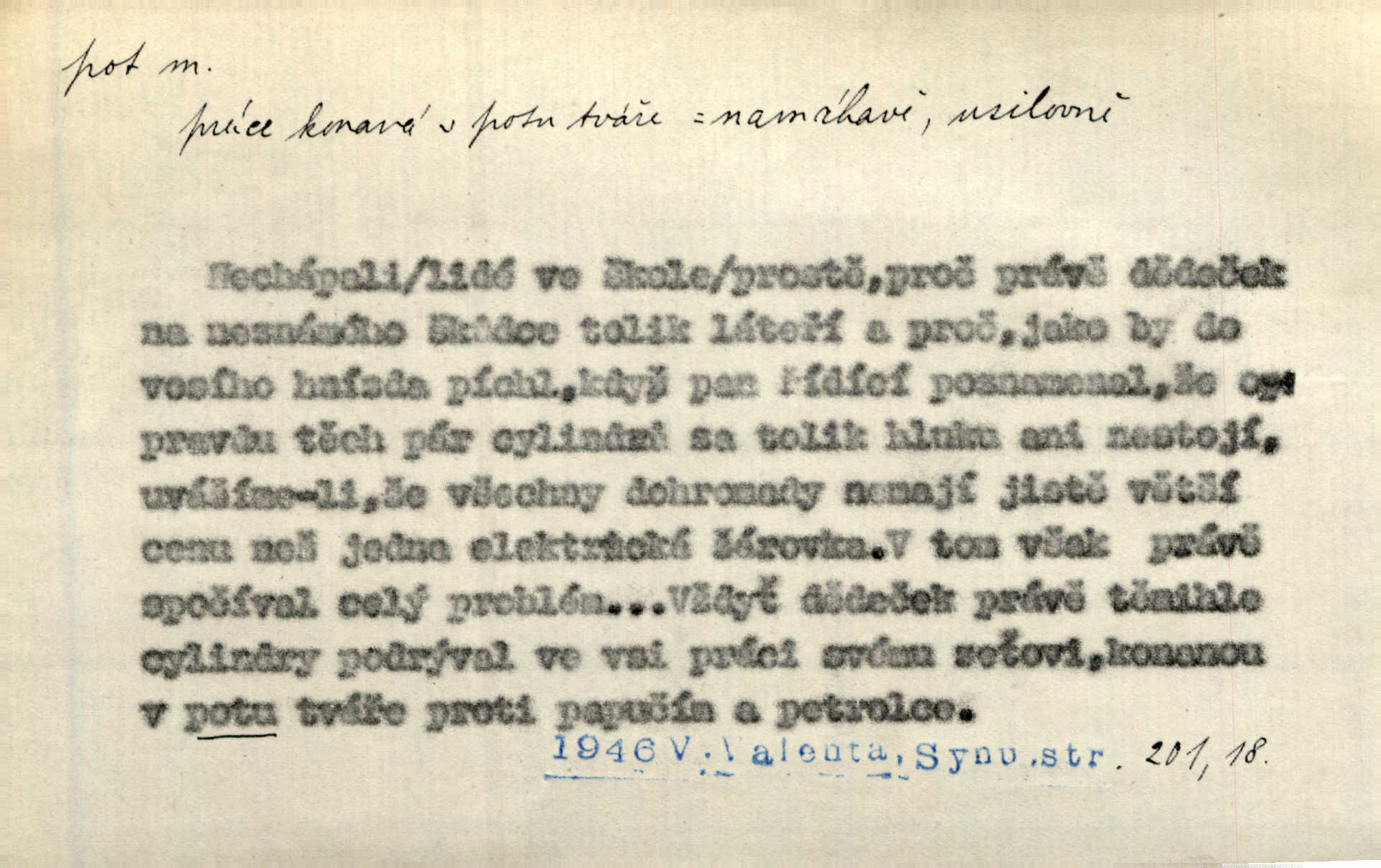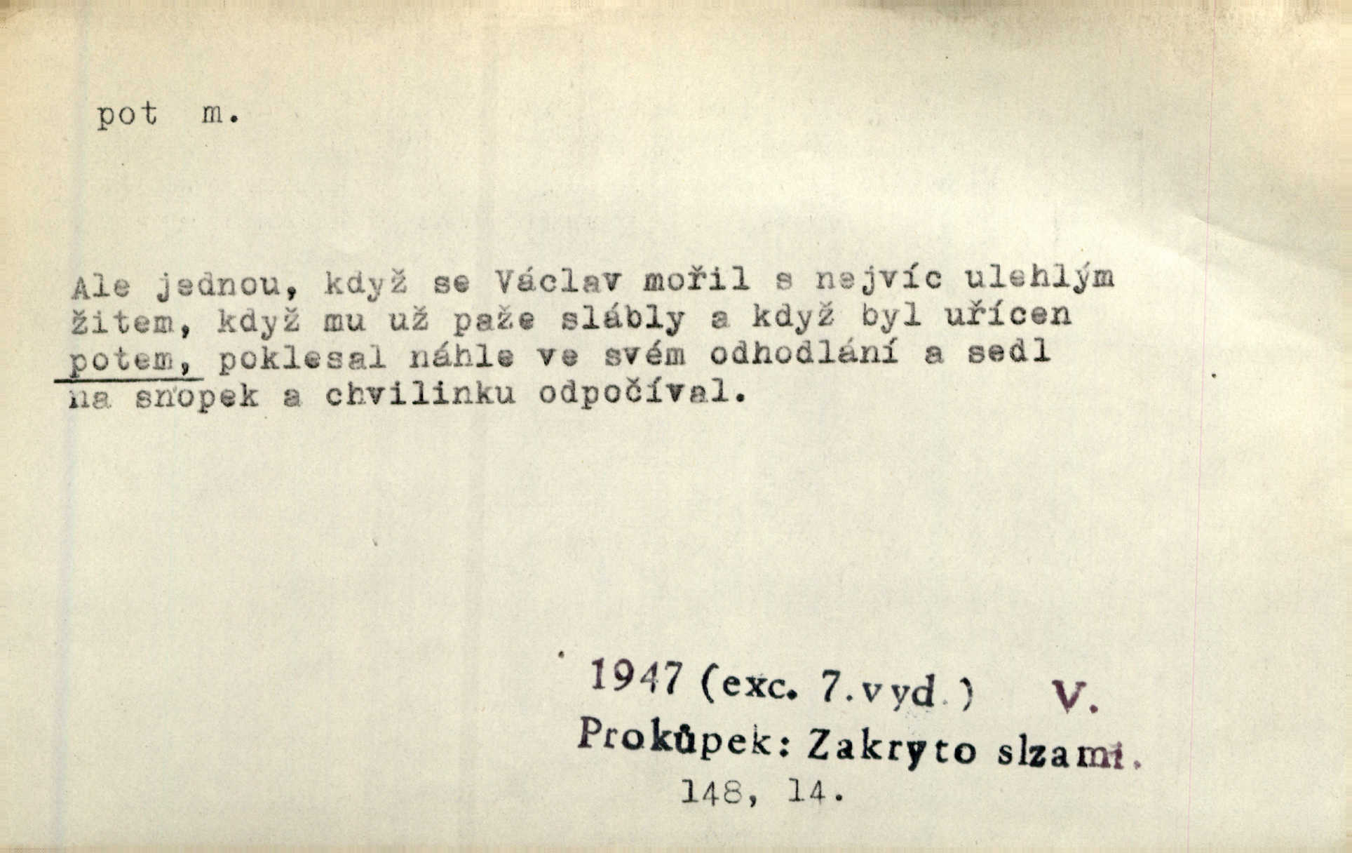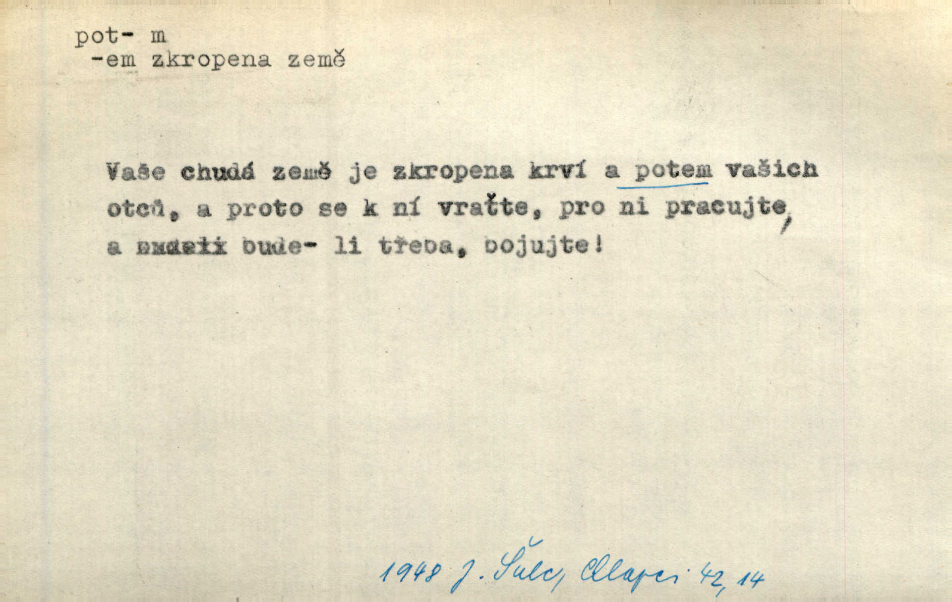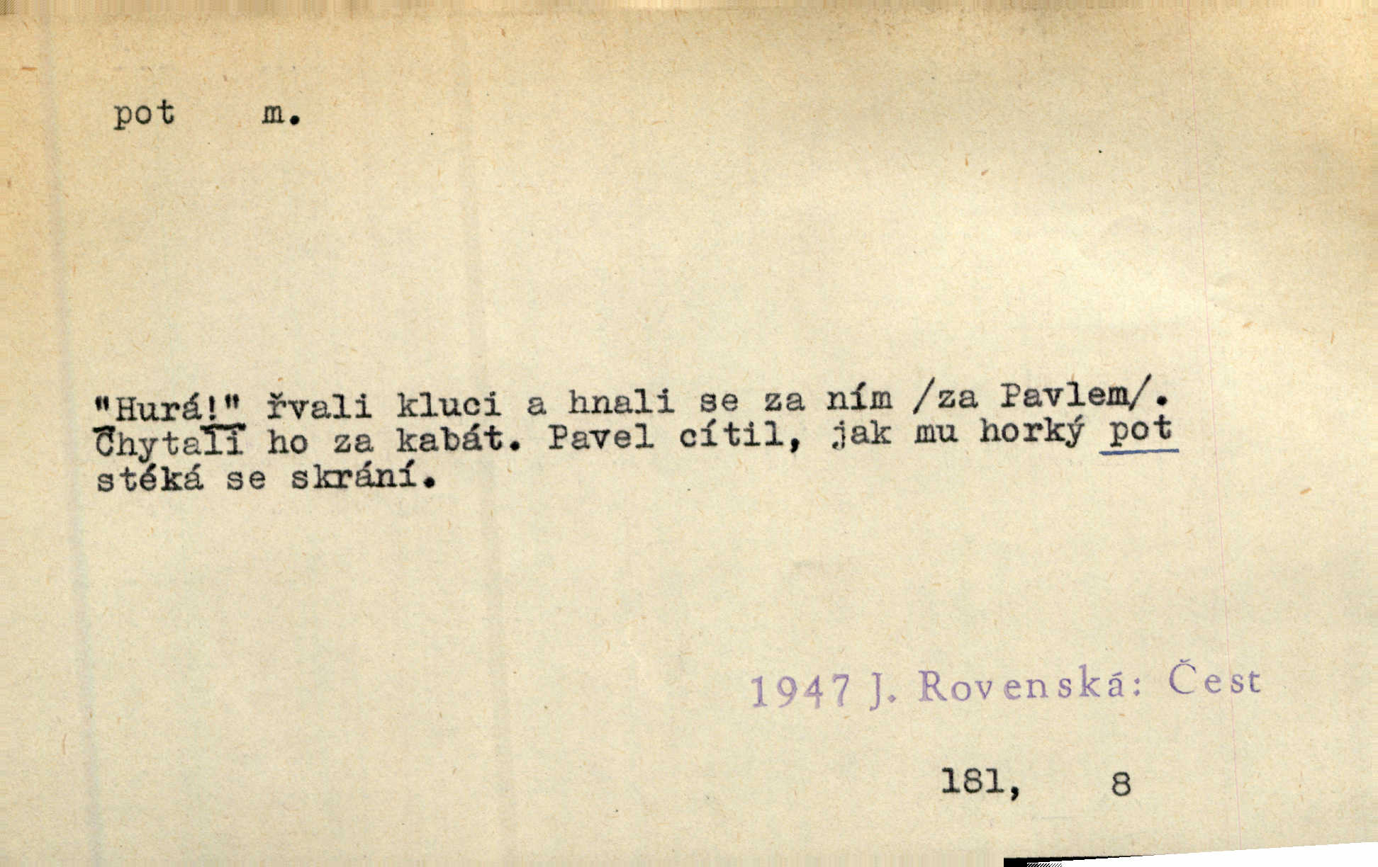 - pot, -u m. čirá, bezbarvá tekutina, slané chuti a nepříjemného zápachu, vyměšovaná zvláštními žlázami z kůže. Václav štípal, až se mu pot vyrážel na čele. Just. Drobounký pot se mu leskl na čele. Jir. Slunce pralo do kůže, pot se lil v potůčkách. Just. Není mi dobře, ale dostanu-li se do potu, bude dobře. Jir. Cítil jsem, na čele že mi vyskakuje pot. Šim. Obročnímu vyvstal na čele smrtelný pot. Šmil. Sedlák lpí na té hrudě, z které v potu tváři chléb dobývá. Něm. Lék. pot zbarvený, krvavý, zapáchající chorobné odchylky potu. D Expr. těžká práce, námaha. Páni ssáli jeho [sedlákovu] krev a za jeho pot hodovali. Jir. Rolník po vedru a potu žní slaví příjemné obžinky. Šmil. D Zř. pára sražená v kapičkách na povrchu něčeho. Příjemné teplo rozbíhá se síní a po vnitřních oknech řine se pot. Ner.