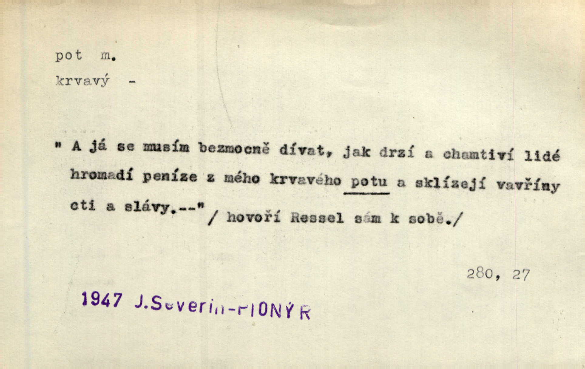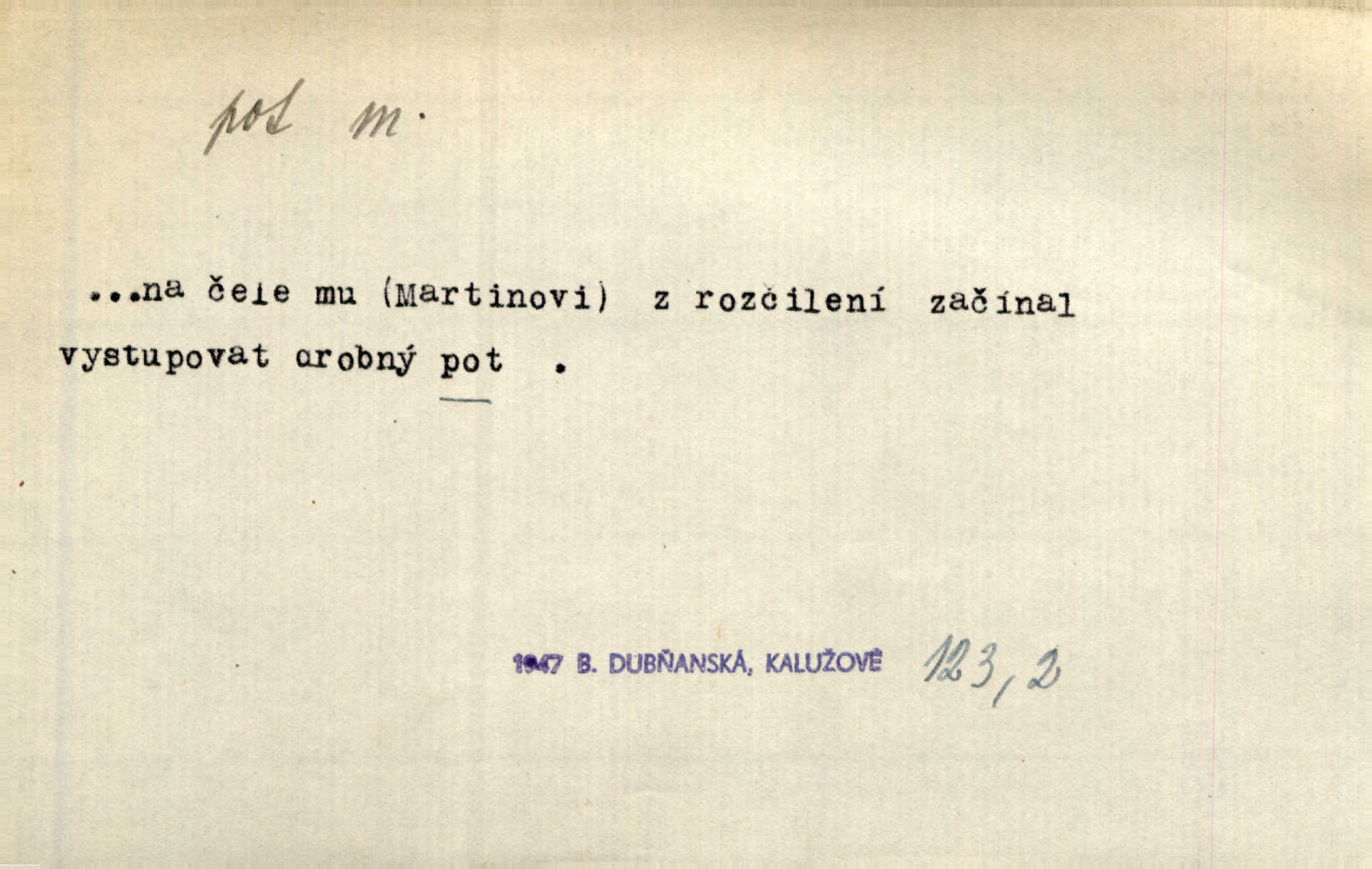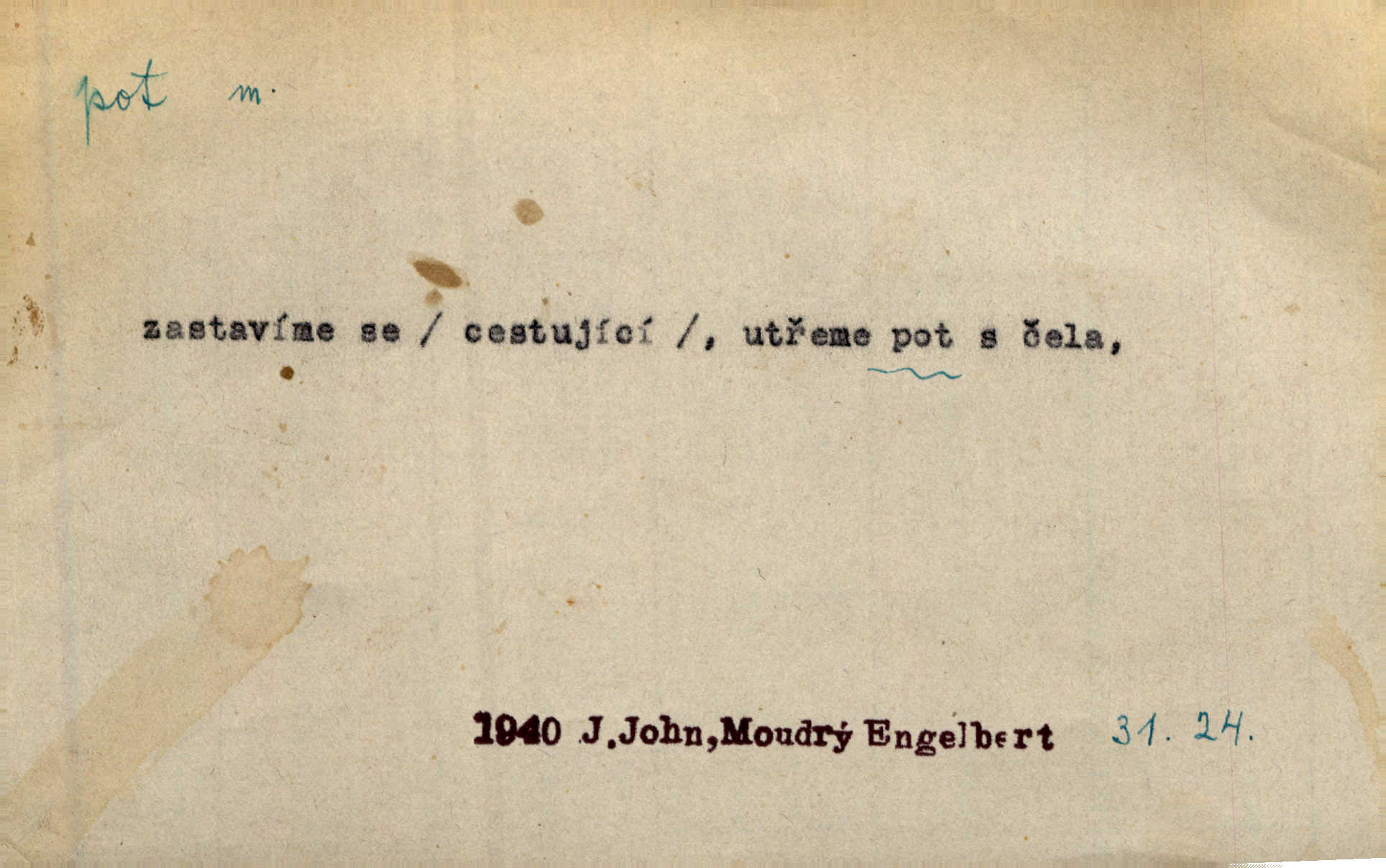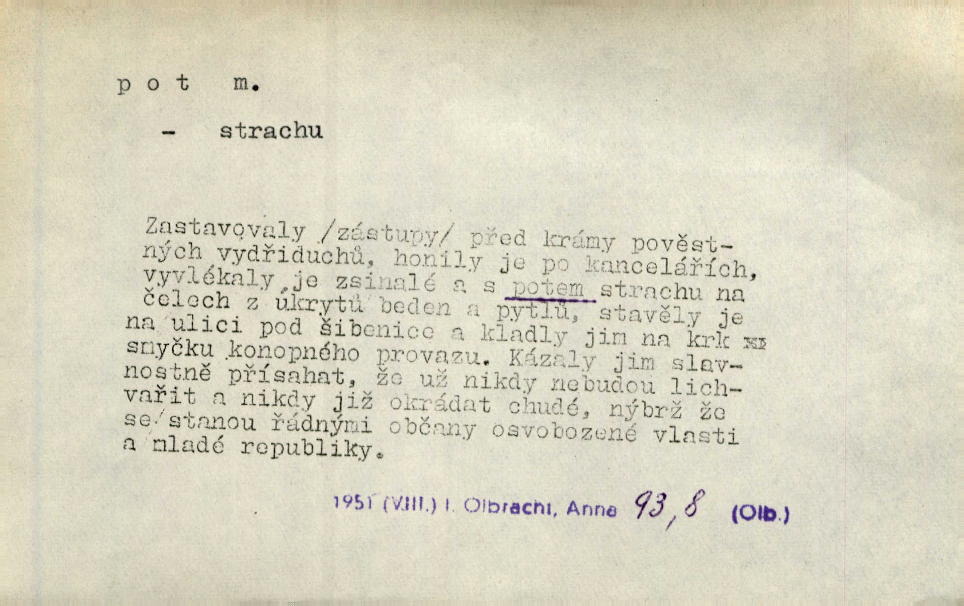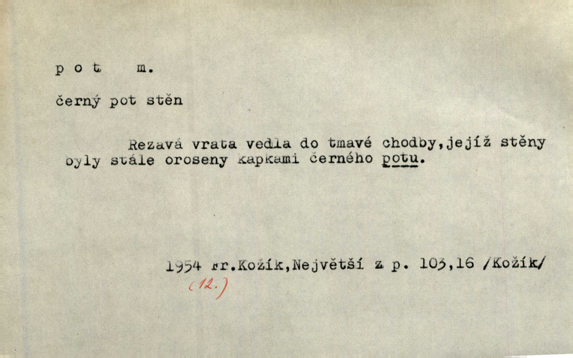 - pot, -u m. čirá, bezbarvá tekutina, slané chuti a nepříjemného zápachu, vyměšovaná zvláštními žlázami z kůže. Václav štípal, až se mu pot vyrážel na čele. Just. Drobounký pot se mu leskl na čele. Jir. Slunce pralo do kůže, pot se lil v potůčkách. Just. Není mi dobře, ale dostanu-li se do potu, bude dobře. Jir. Cítil jsem, na čele že mi vyskakuje pot. Šim. Obročnímu vyvstal na čele smrtelný pot. Šmil. Sedlák lpí na té hrudě, z které v potu tváři chléb dobývá. Něm. Lék. pot zbarvený, krvavý, zapáchající chorobné odchylky potu. D Expr. těžká práce, námaha. Páni ssáli jeho [sedlákovu] krev a za jeho pot hodovali. Jir. Rolník po vedru a potu žní slaví příjemné obžinky. Šmil. D Zř. pára sražená v kapičkách na povrchu něčeho. Příjemné teplo rozbíhá se síní a po vnitřních oknech řine se pot. Ner.