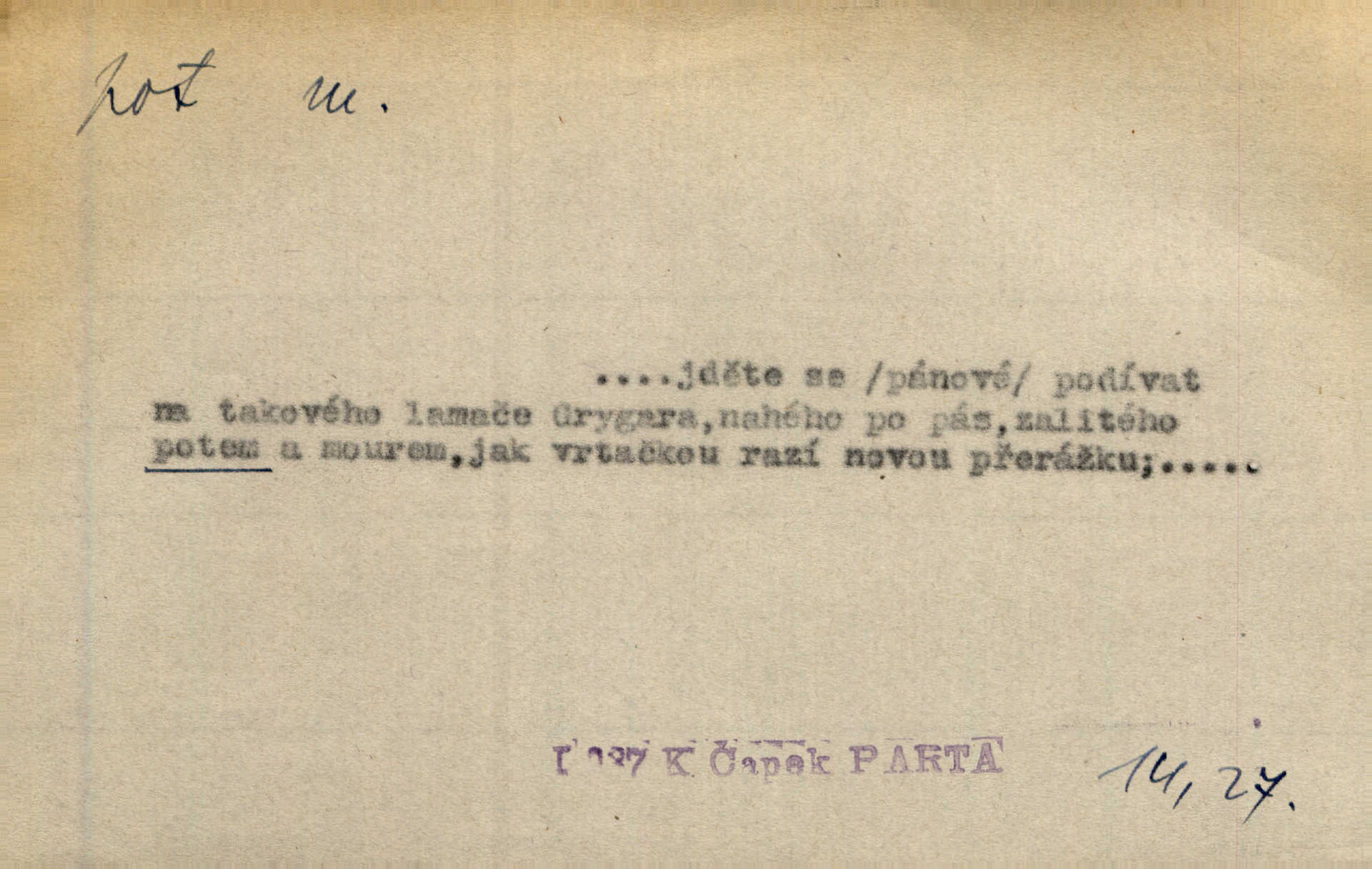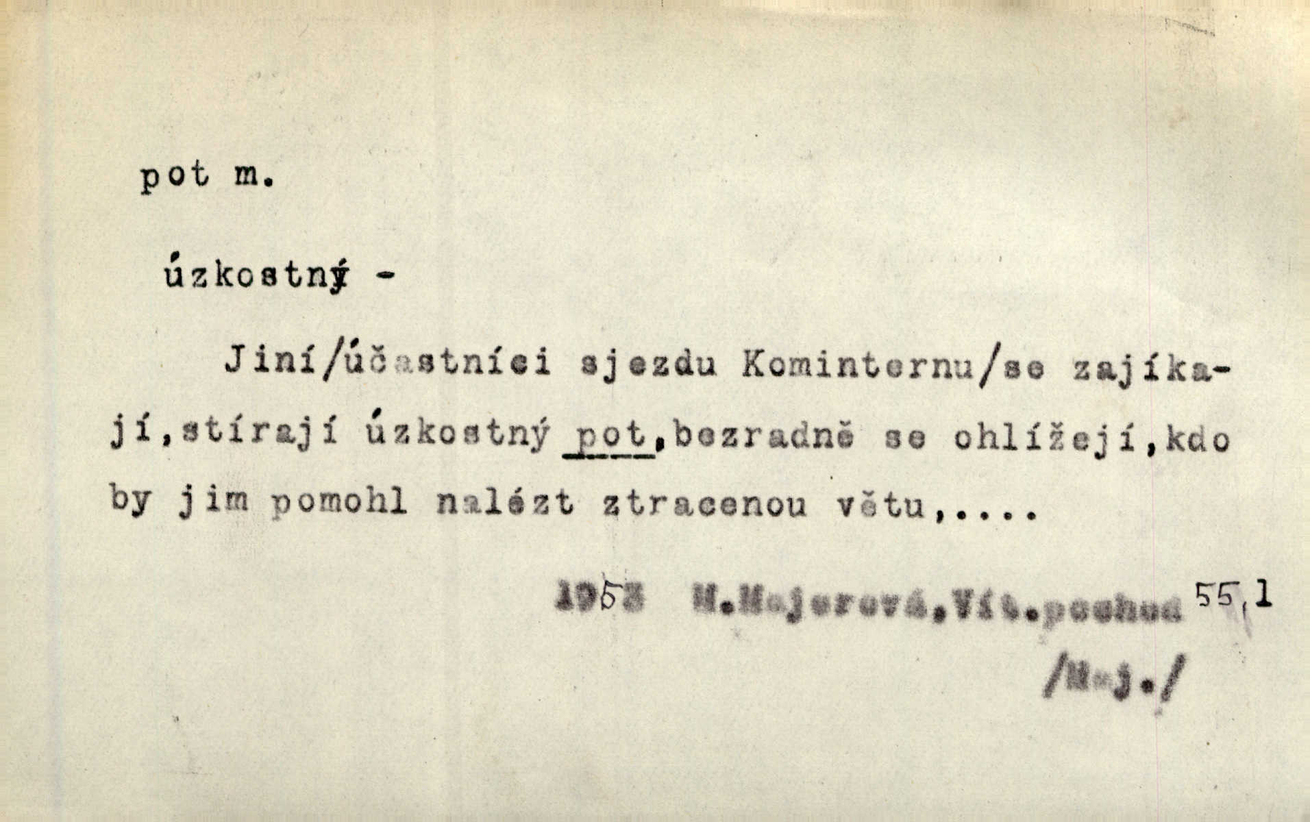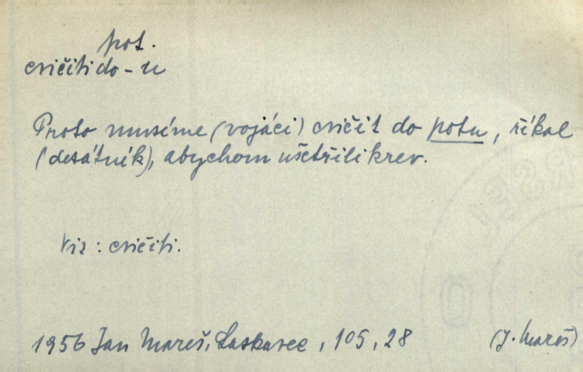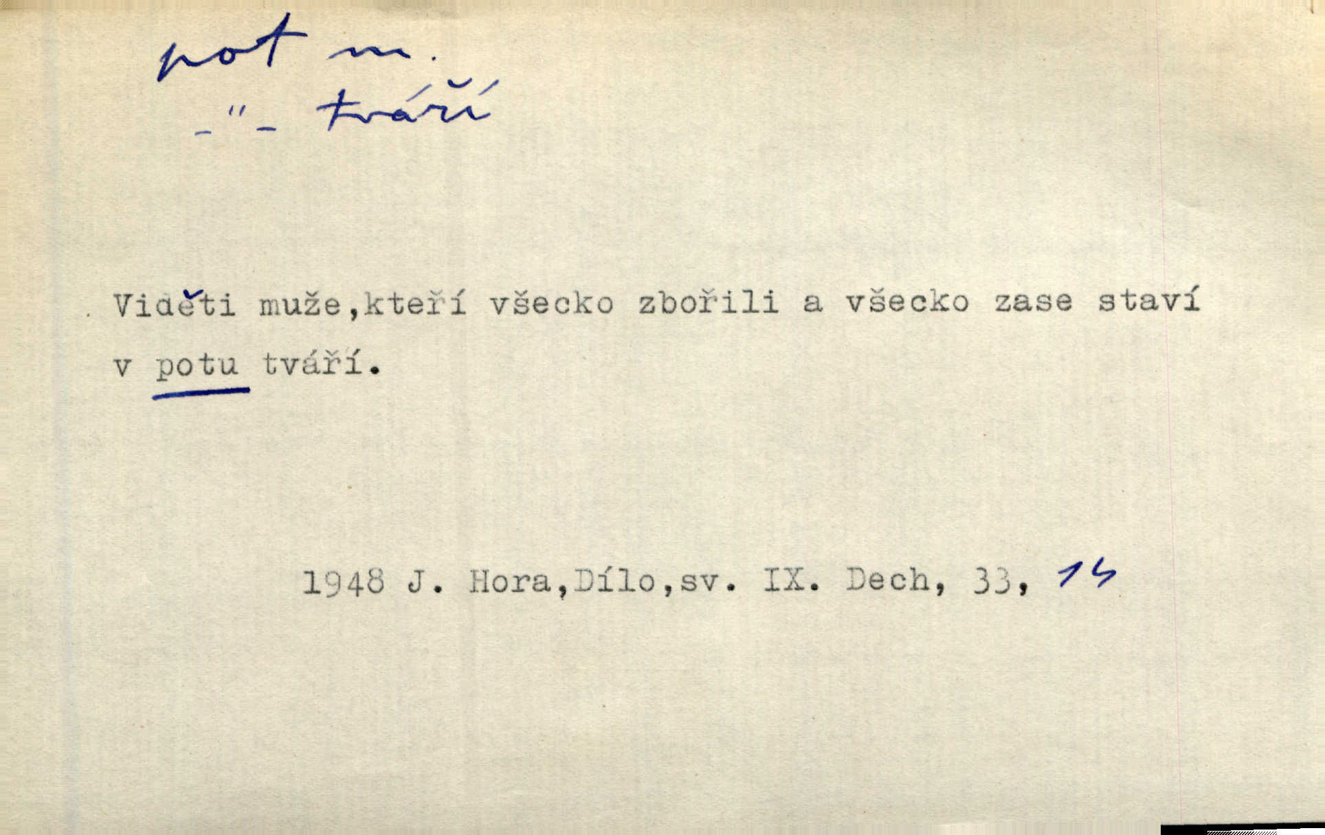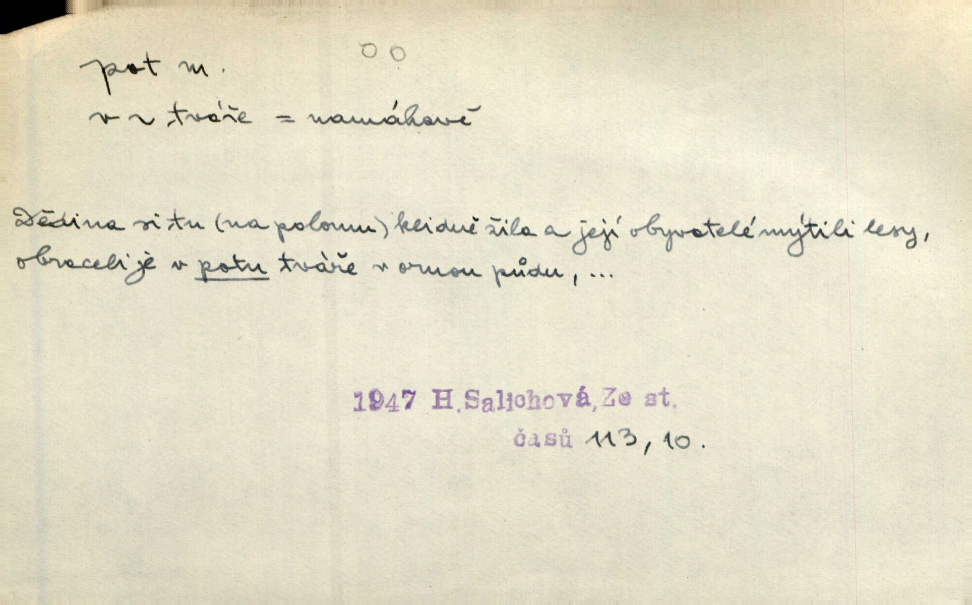 - pot, -u m. čirá, bezbarvá tekutina, slané chuti a nepříjemného zápachu, vyměšovaná zvláštními žlázami z kůže. Václav štípal, až se mu pot vyrážel na čele. Just. Drobounký pot se mu leskl na čele. Jir. Slunce pralo do kůže, pot se lil v potůčkách. Just. Není mi dobře, ale dostanu-li se do potu, bude dobře. Jir. Cítil jsem, na čele že mi vyskakuje pot. Šim. Obročnímu vyvstal na čele smrtelný pot. Šmil. Sedlák lpí na té hrudě, z které v potu tváři chléb dobývá. Něm. Lék. pot zbarvený, krvavý, zapáchající chorobné odchylky potu. D Expr. těžká práce, námaha. Páni ssáli jeho [sedlákovu] krev a za jeho pot hodovali. Jir. Rolník po vedru a potu žní slaví příjemné obžinky. Šmil. D Zř. pára sražená v kapičkách na povrchu něčeho. Příjemné teplo rozbíhá se síní a po vnitřních oknech řine se pot. Ner.