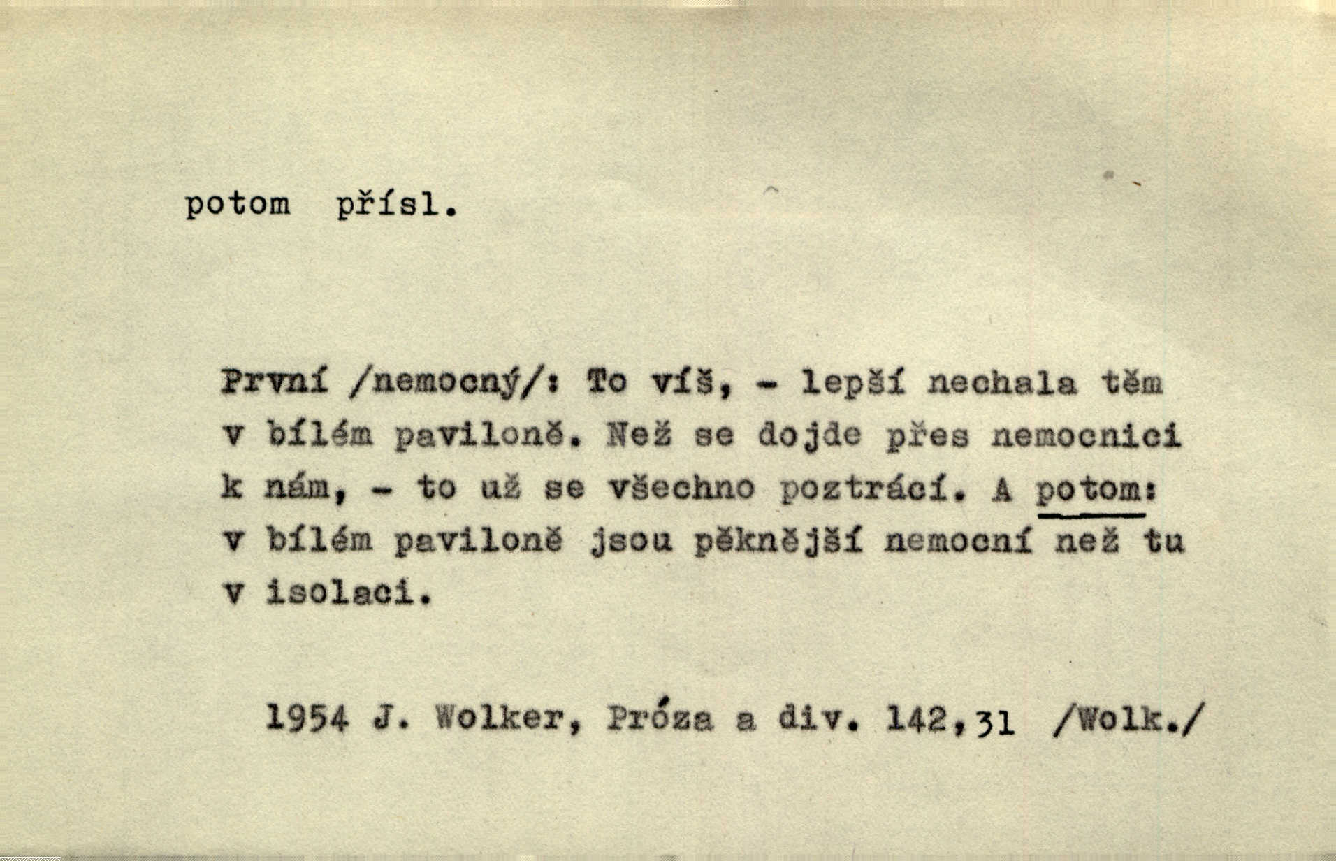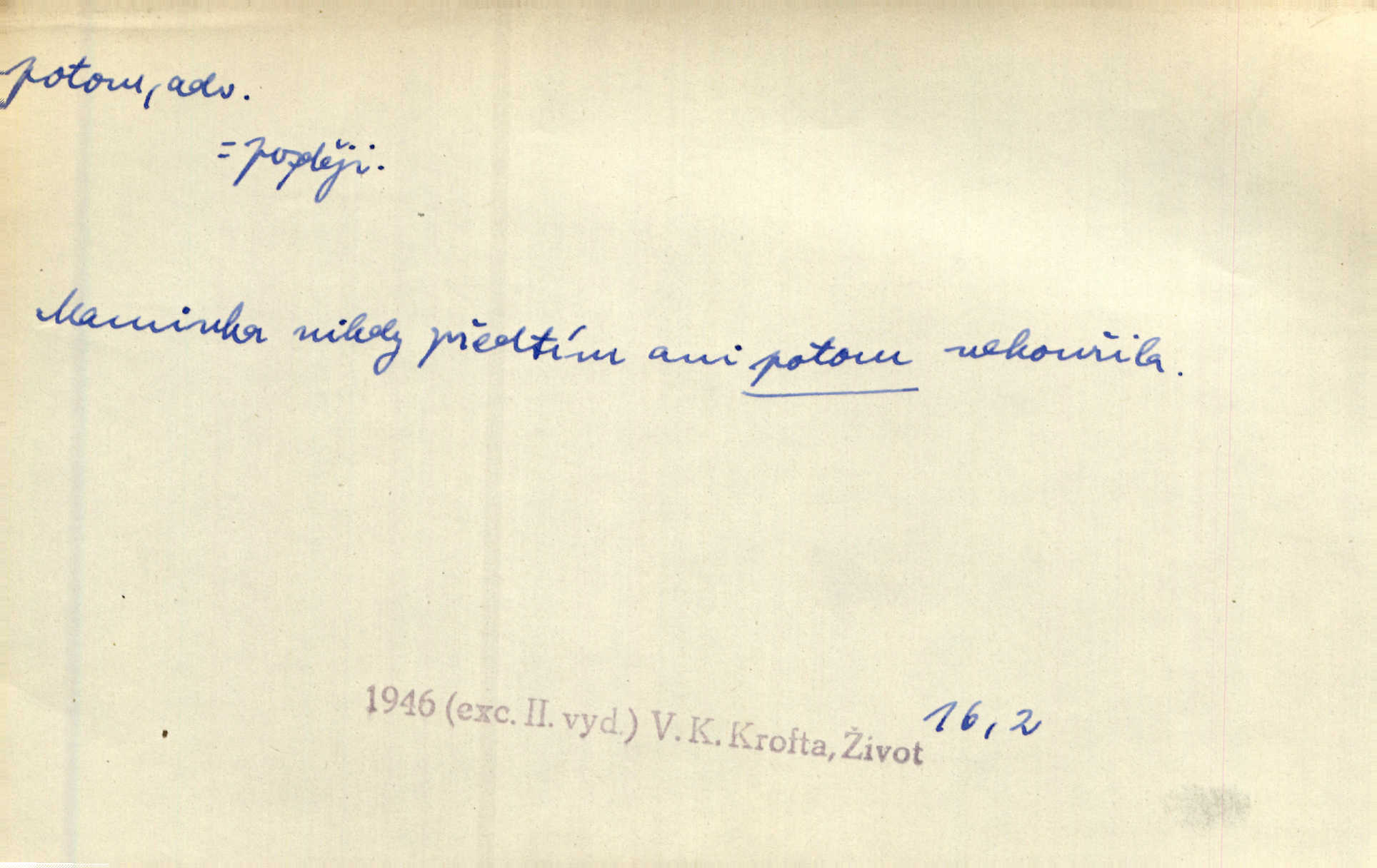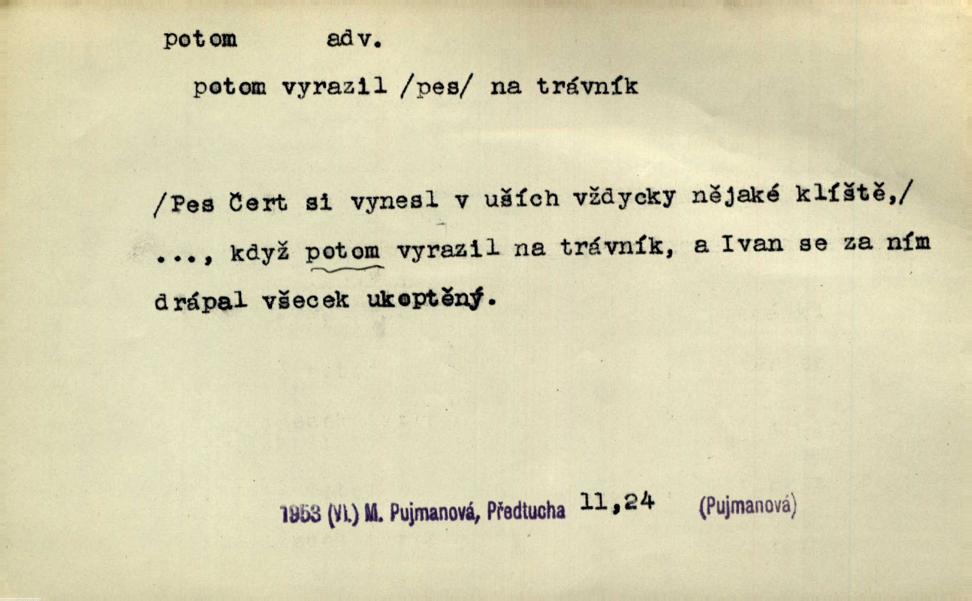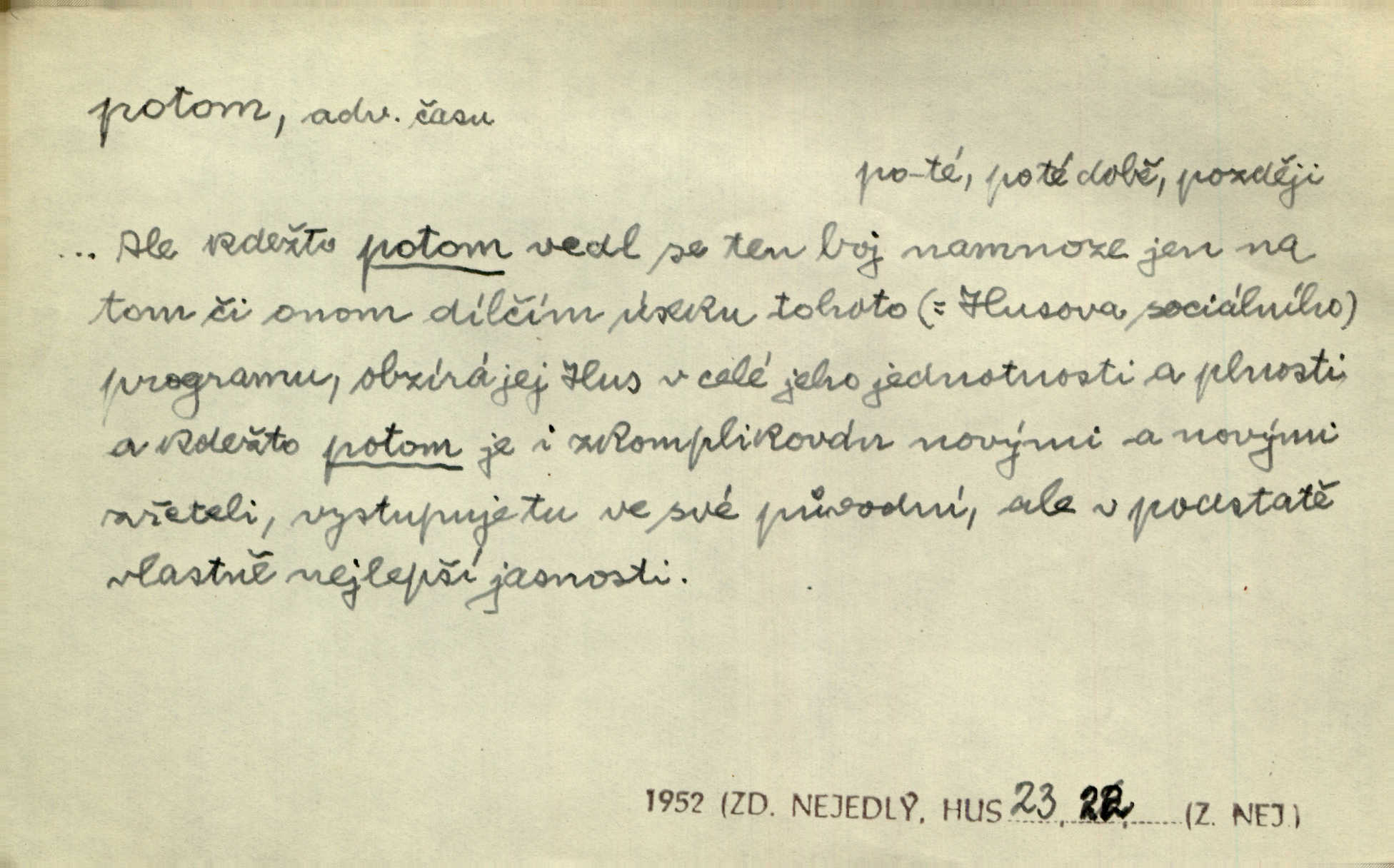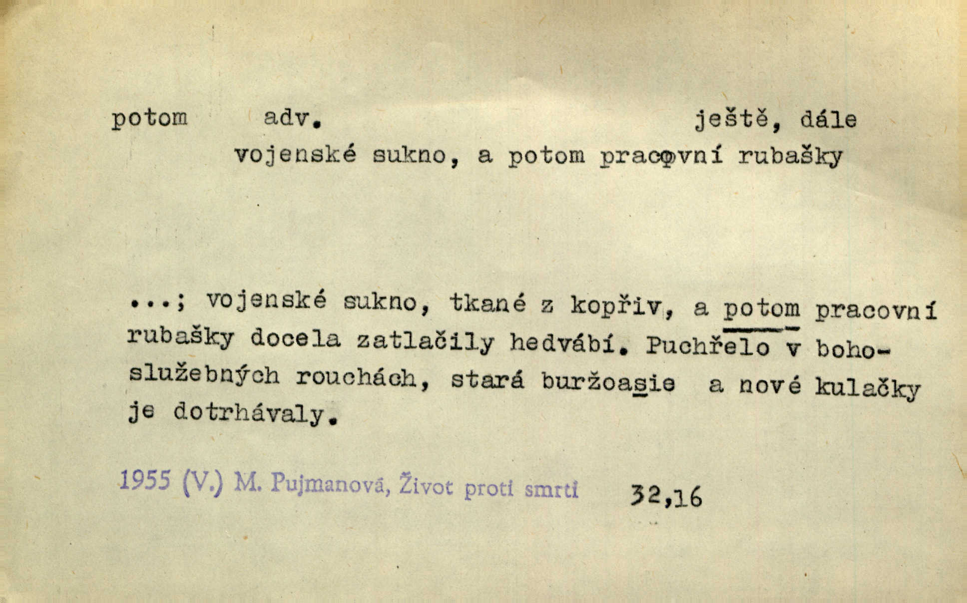 - potom adv. označuje časovou posloupnost; později. Přijde čas a vyláme nám zuby. Co potom? Vrch. Napřed podepíše žádost za svolení ku stavbě a potom proti stavbě protestuje. Čap. Ch. Za chvíli potom volali [páni] Baltazara na kancelář. Jir. D vyjadřuje výsledek: tedy, v tom případě. Pořádnosť mezi lidmi má být — to se potom snesou. Svob. „A o kom že to mluvíte, milý sedláku?“ „O dceři vdovy Loučanské!“ „O Marii? — Potom, milý brachu, té holce křivdíte.“ Třeb. Když je člověk zdráv, projde to, ale když máte trolení v oudech, potom zkusíte. Něm. Zač stálo by potom jinak naše vítězství! Třeb. D zdůrazňuje rozpor nějakého tvrzení s jiným. Poznali jsme, že to veliká sova. A potom prý je sova nočním ptákem! Thom. To je tatík, co? To je potom otec! Svob. Zamiloval se již do chlapce, jak potom do děvy tak krásné? Choch. Jeden učený Angličan pravil: „Člověče, čiň, co chceš, všecko tě posléz omrzí.“ Jak pak člověka nemělo omrzet potom to, co nechce? Rub. Ale proč nejde Dalibor? Aby tak potom nepřišel! Klicp. D vyjadřuje slučování: a, i, také, též. Celkem může se říci, že u Krátkých dětem se více líbilo. Předně, že u Krátkých měli více dětí. A potom, když strýček Krátký přemítal v knížkách, hned ukázal dětem pěkný obrázek. Herb. Moje matka také nebyla na mojí veselce v kostele. A potom mám moc práce. Svob. Daleko nezašel, aby nezabloudil, a potom, aby ho někdo nezastihl. Ehrenb. Veliká byla rodina: dva synové, potom tři vnuci ženatí, potom dva vnuci výrostkové. Čel.