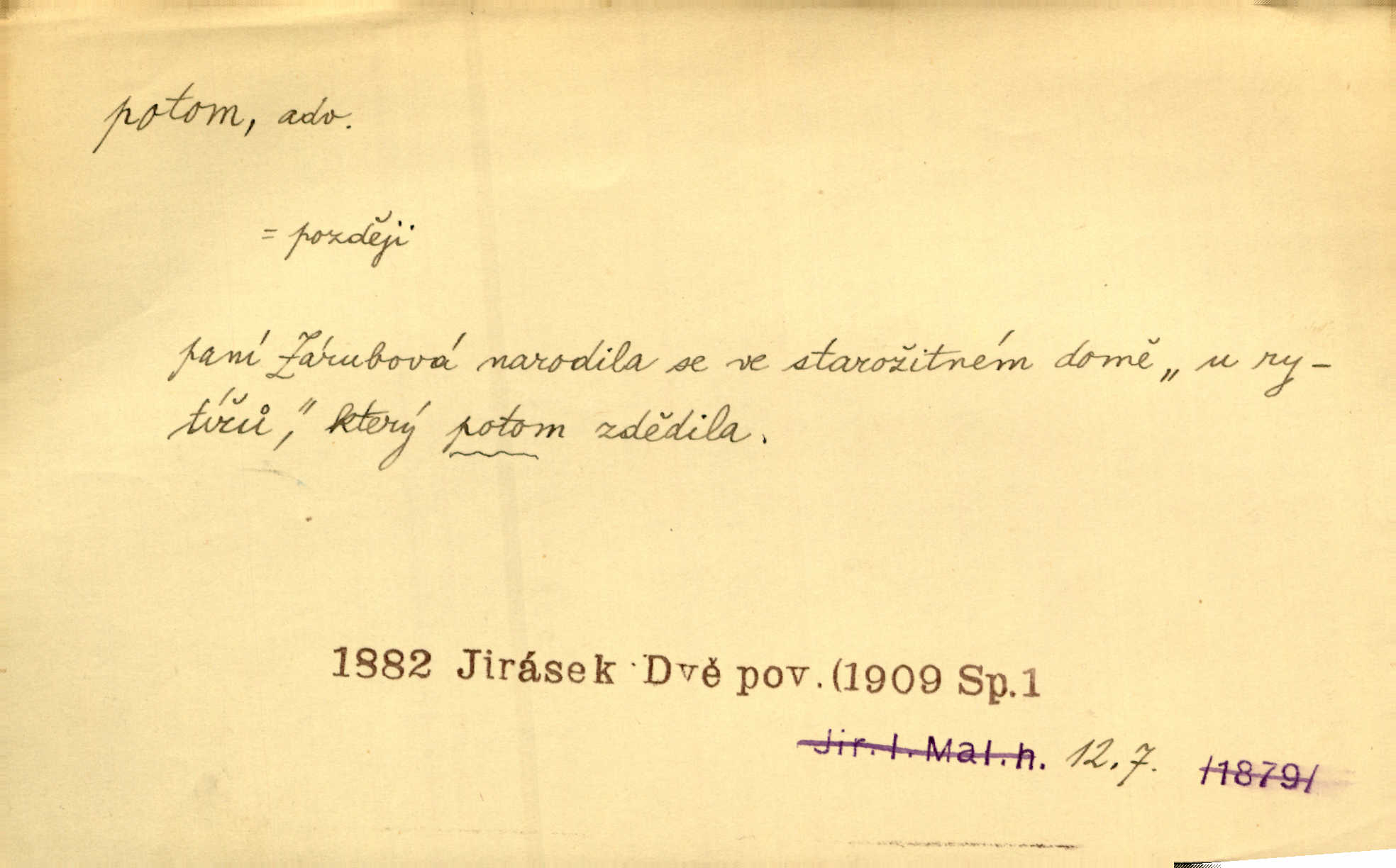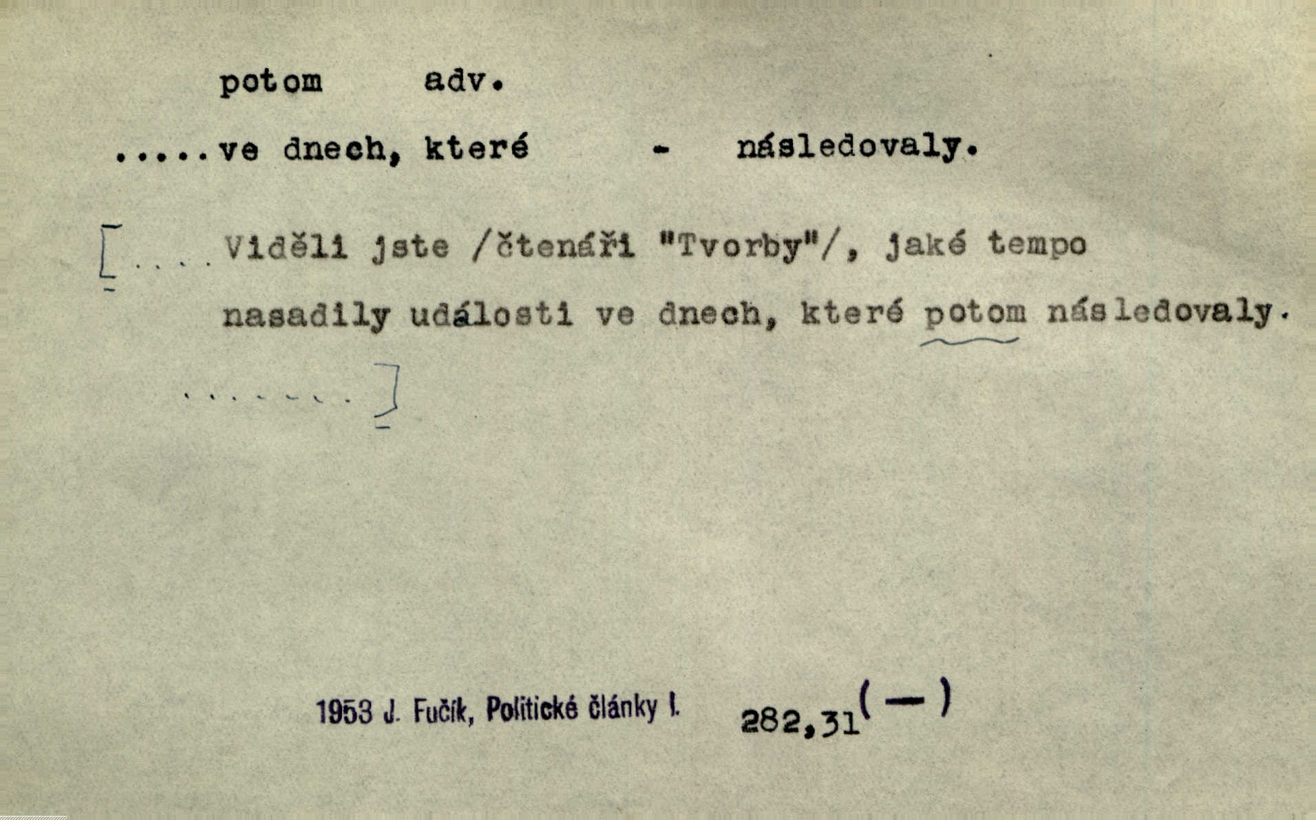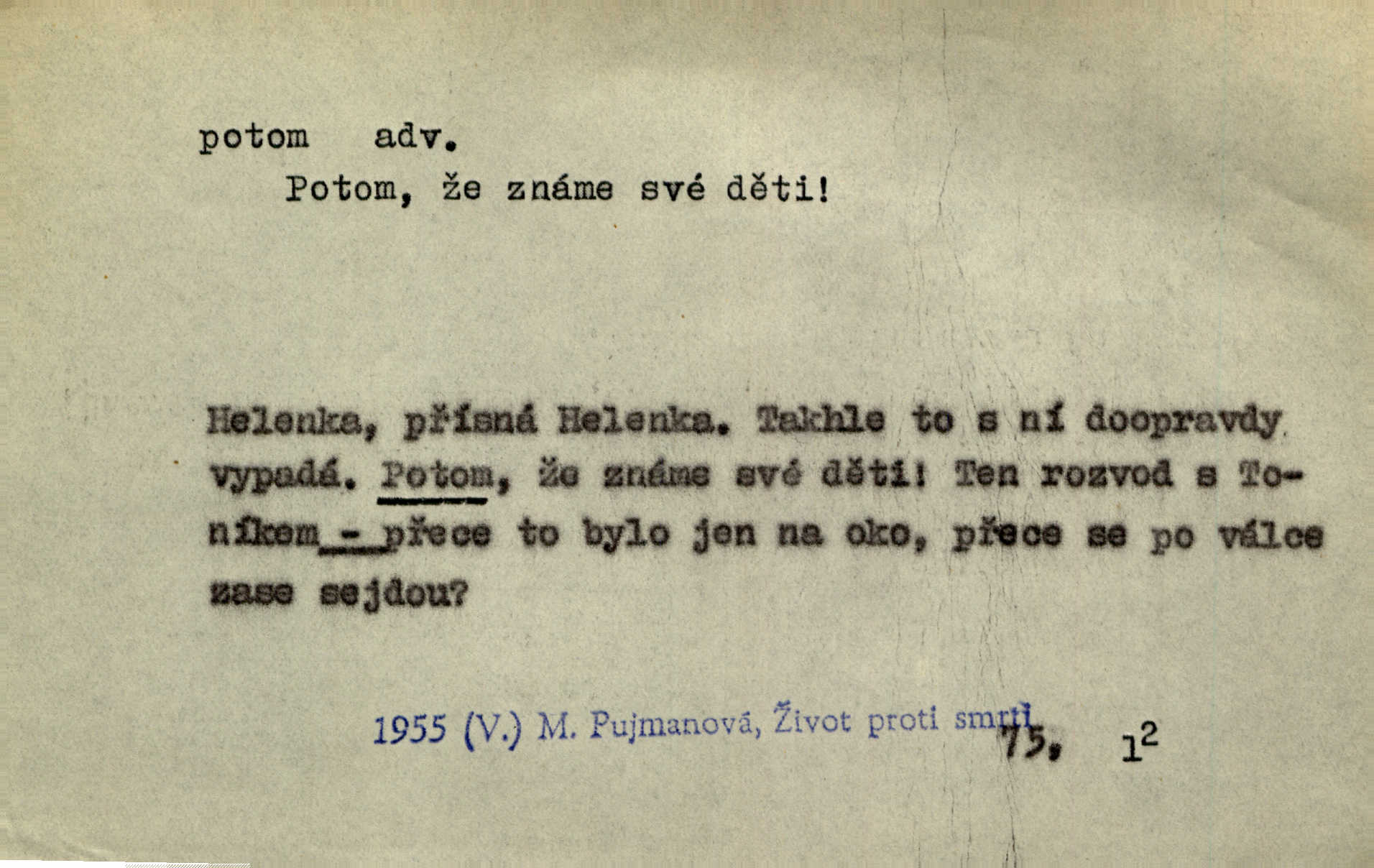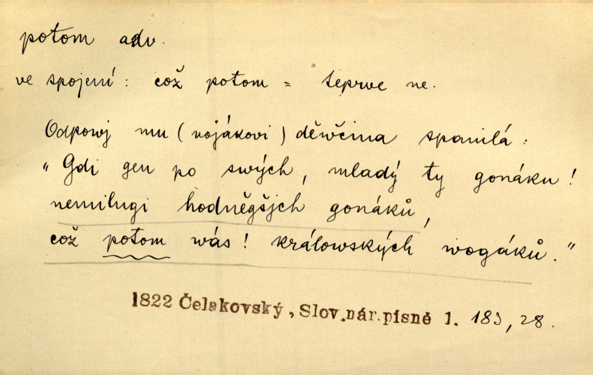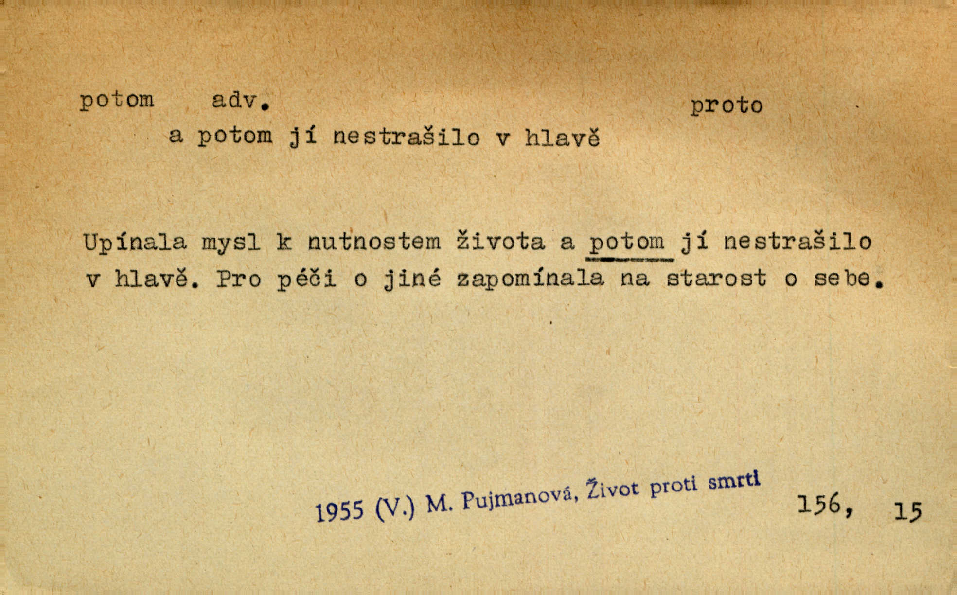 - potom adv. označuje časovou posloupnost; později. Přijde čas a vyláme nám zuby. Co potom? Vrch. Napřed podepíše žádost za svolení ku stavbě a potom proti stavbě protestuje. Čap. Ch. Za chvíli potom volali [páni] Baltazara na kancelář. Jir. D vyjadřuje výsledek: tedy, v tom případě. Pořádnosť mezi lidmi má být — to se potom snesou. Svob. „A o kom že to mluvíte, milý sedláku?“ „O dceři vdovy Loučanské!“ „O Marii? — Potom, milý brachu, té holce křivdíte.“ Třeb. Když je člověk zdráv, projde to, ale když máte trolení v oudech, potom zkusíte. Něm. Zač stálo by potom jinak naše vítězství! Třeb. D zdůrazňuje rozpor nějakého tvrzení s jiným. Poznali jsme, že to veliká sova. A potom prý je sova nočním ptákem! Thom. To je tatík, co? To je potom otec! Svob. Zamiloval se již do chlapce, jak potom do děvy tak krásné? Choch. Jeden učený Angličan pravil: „Člověče, čiň, co chceš, všecko tě posléz omrzí.“ Jak pak člověka nemělo omrzet potom to, co nechce? Rub. Ale proč nejde Dalibor? Aby tak potom nepřišel! Klicp. D vyjadřuje slučování: a, i, také, též. Celkem může se říci, že u Krátkých dětem se více líbilo. Předně, že u Krátkých měli více dětí. A potom, když strýček Krátký přemítal v knížkách, hned ukázal dětem pěkný obrázek. Herb. Moje matka také nebyla na mojí veselce v kostele. A potom mám moc práce. Svob. Daleko nezašel, aby nezabloudil, a potom, aby ho někdo nezastihl. Ehrenb. Veliká byla rodina: dva synové, potom tři vnuci ženatí, potom dva vnuci výrostkové. Čel.