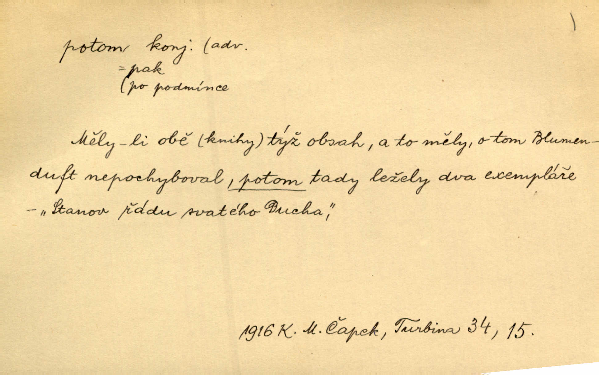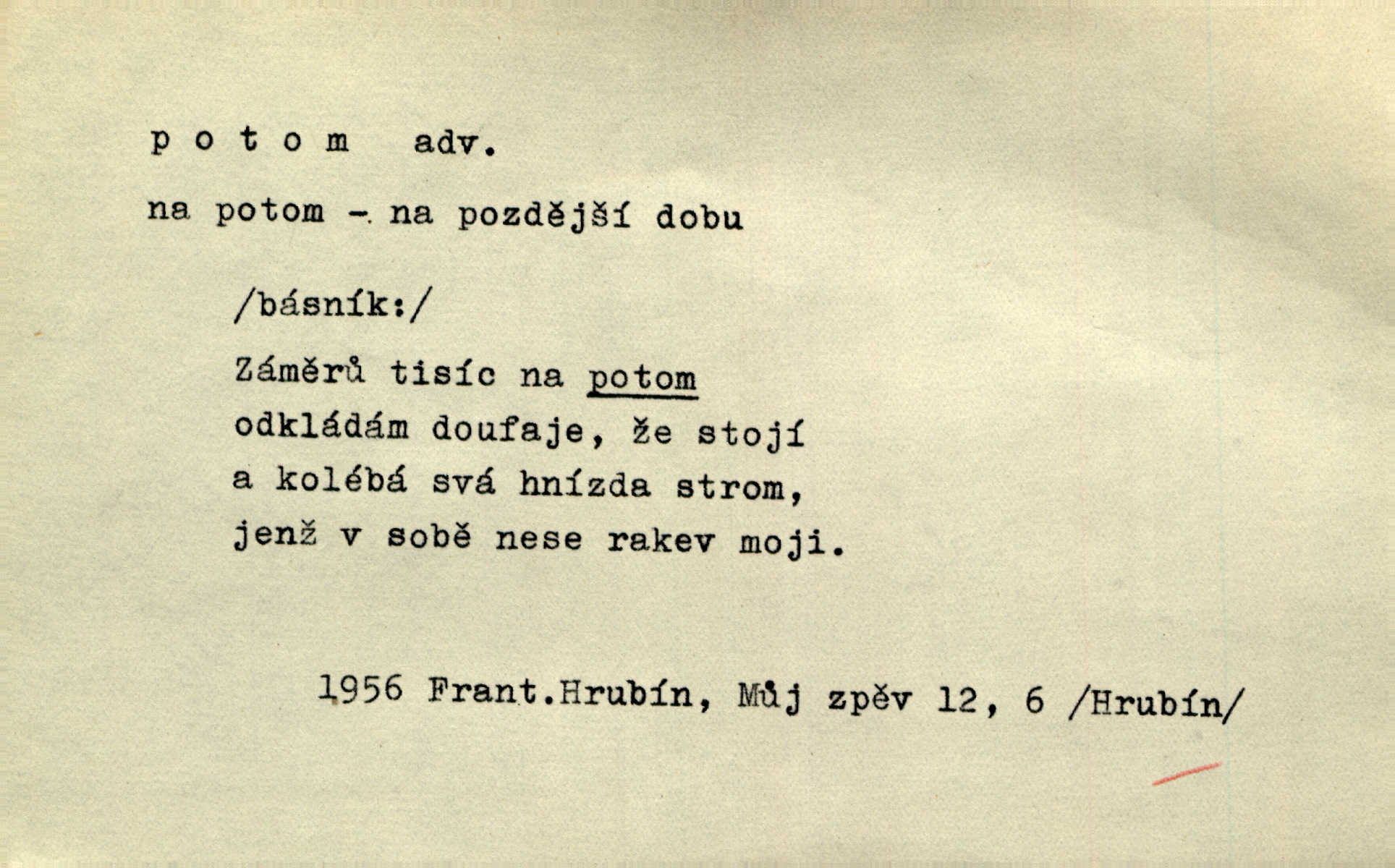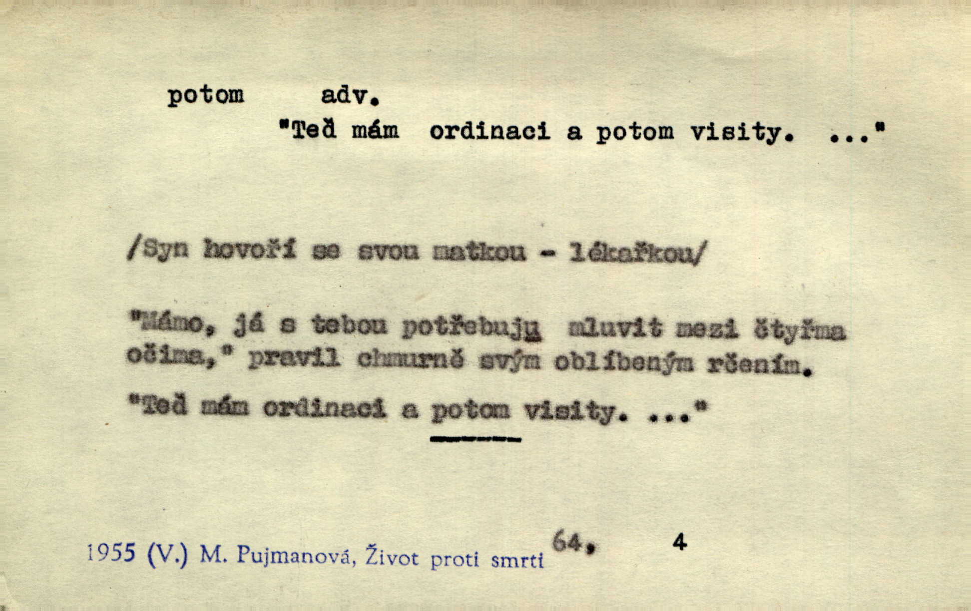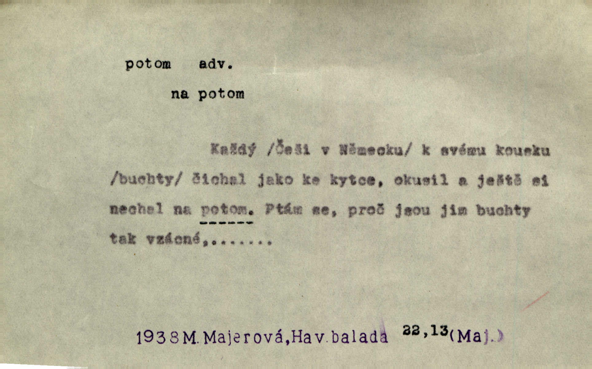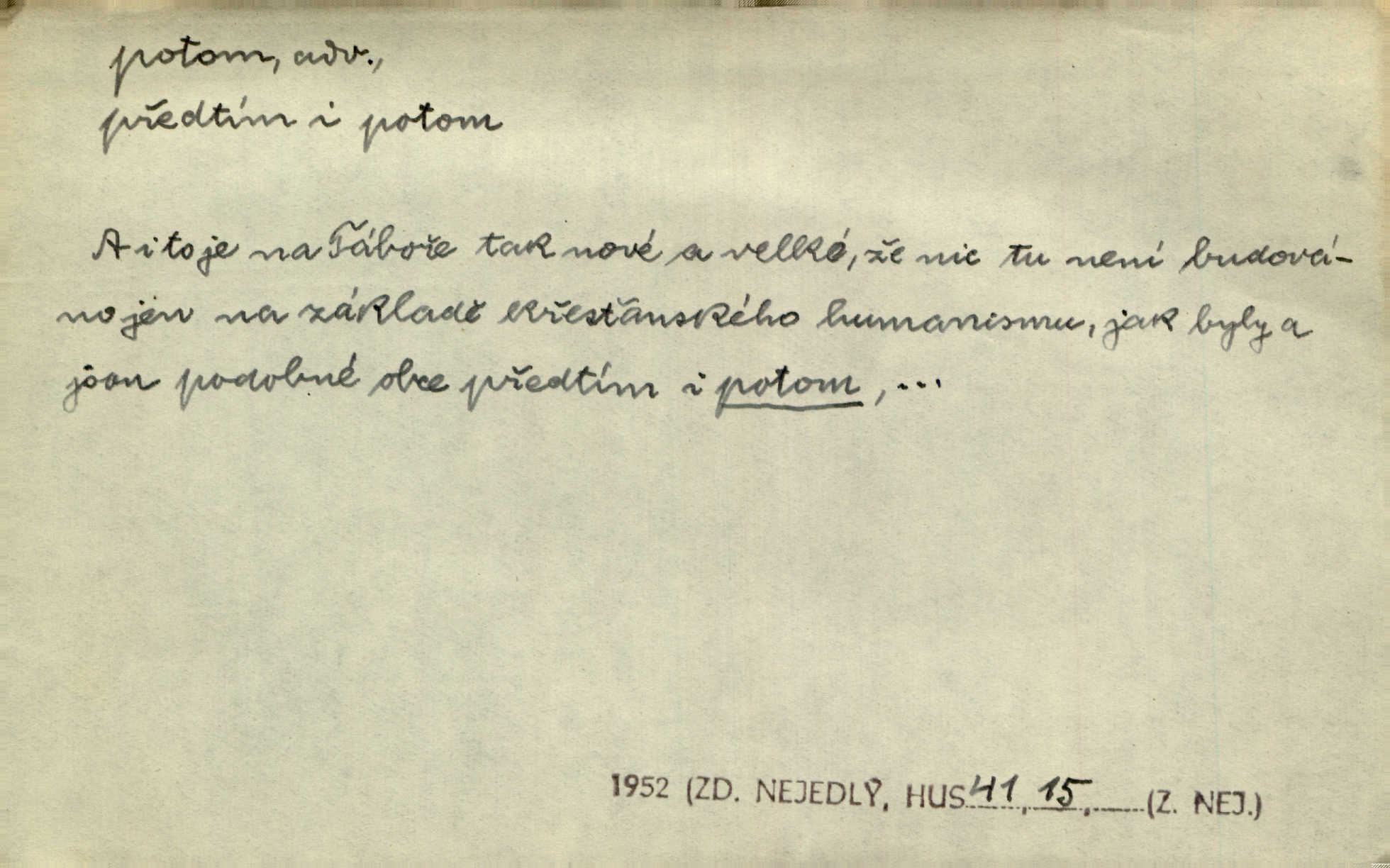 - potom adv. označuje časovou posloupnost; později. Přijde čas a vyláme nám zuby. Co potom? Vrch. Napřed podepíše žádost za svolení ku stavbě a potom proti stavbě protestuje. Čap. Ch. Za chvíli potom volali [páni] Baltazara na kancelář. Jir. D vyjadřuje výsledek: tedy, v tom případě. Pořádnosť mezi lidmi má být — to se potom snesou. Svob. „A o kom že to mluvíte, milý sedláku?“ „O dceři vdovy Loučanské!“ „O Marii? — Potom, milý brachu, té holce křivdíte.“ Třeb. Když je člověk zdráv, projde to, ale když máte trolení v oudech, potom zkusíte. Něm. Zač stálo by potom jinak naše vítězství! Třeb. D zdůrazňuje rozpor nějakého tvrzení s jiným. Poznali jsme, že to veliká sova. A potom prý je sova nočním ptákem! Thom. To je tatík, co? To je potom otec! Svob. Zamiloval se již do chlapce, jak potom do děvy tak krásné? Choch. Jeden učený Angličan pravil: „Člověče, čiň, co chceš, všecko tě posléz omrzí.“ Jak pak člověka nemělo omrzet potom to, co nechce? Rub. Ale proč nejde Dalibor? Aby tak potom nepřišel! Klicp. D vyjadřuje slučování: a, i, také, též. Celkem může se říci, že u Krátkých dětem se více líbilo. Předně, že u Krátkých měli více dětí. A potom, když strýček Krátký přemítal v knížkách, hned ukázal dětem pěkný obrázek. Herb. Moje matka také nebyla na mojí veselce v kostele. A potom mám moc práce. Svob. Daleko nezašel, aby nezabloudil, a potom, aby ho někdo nezastihl. Ehrenb. Veliká byla rodina: dva synové, potom tři vnuci ženatí, potom dva vnuci výrostkové. Čel.
