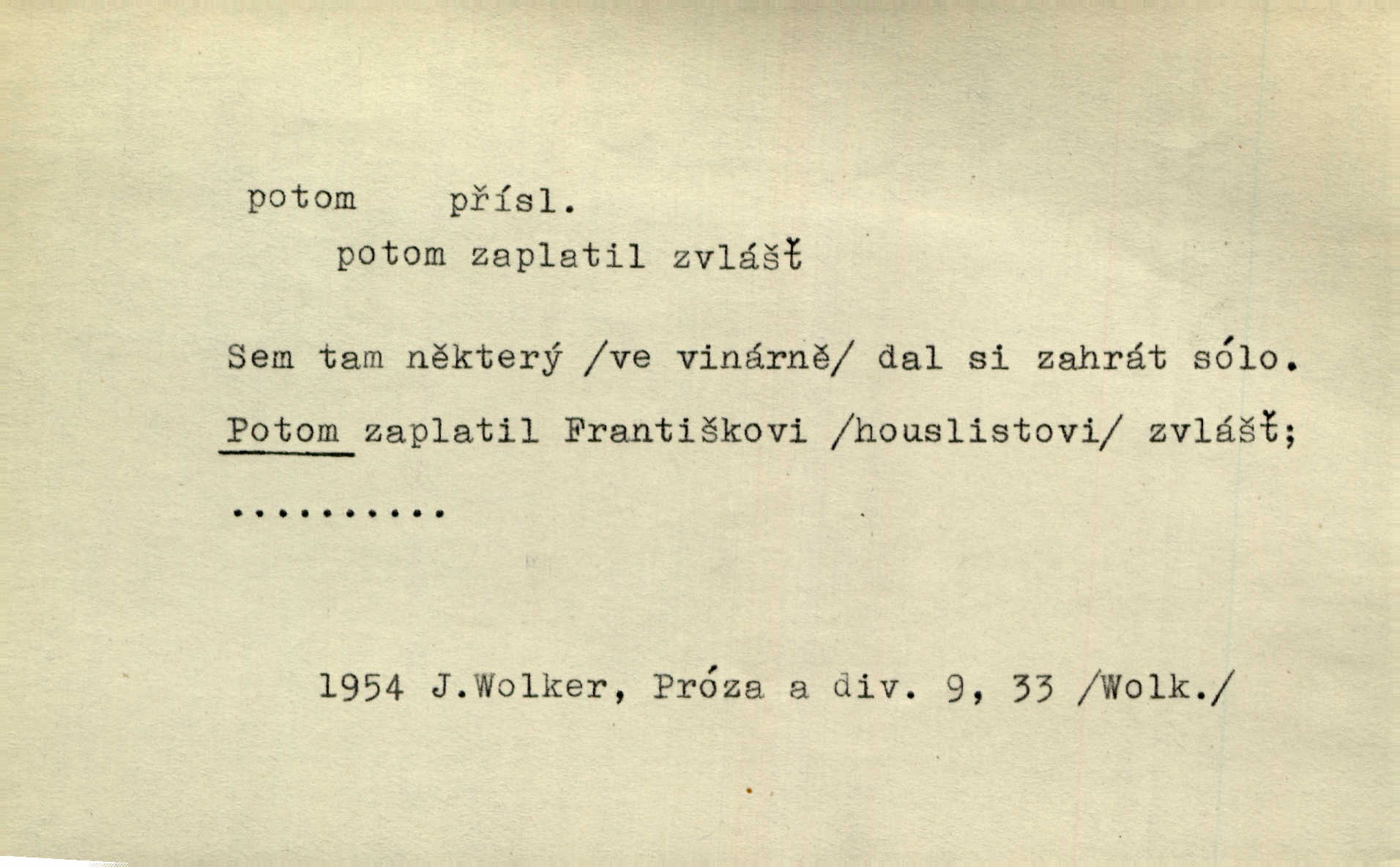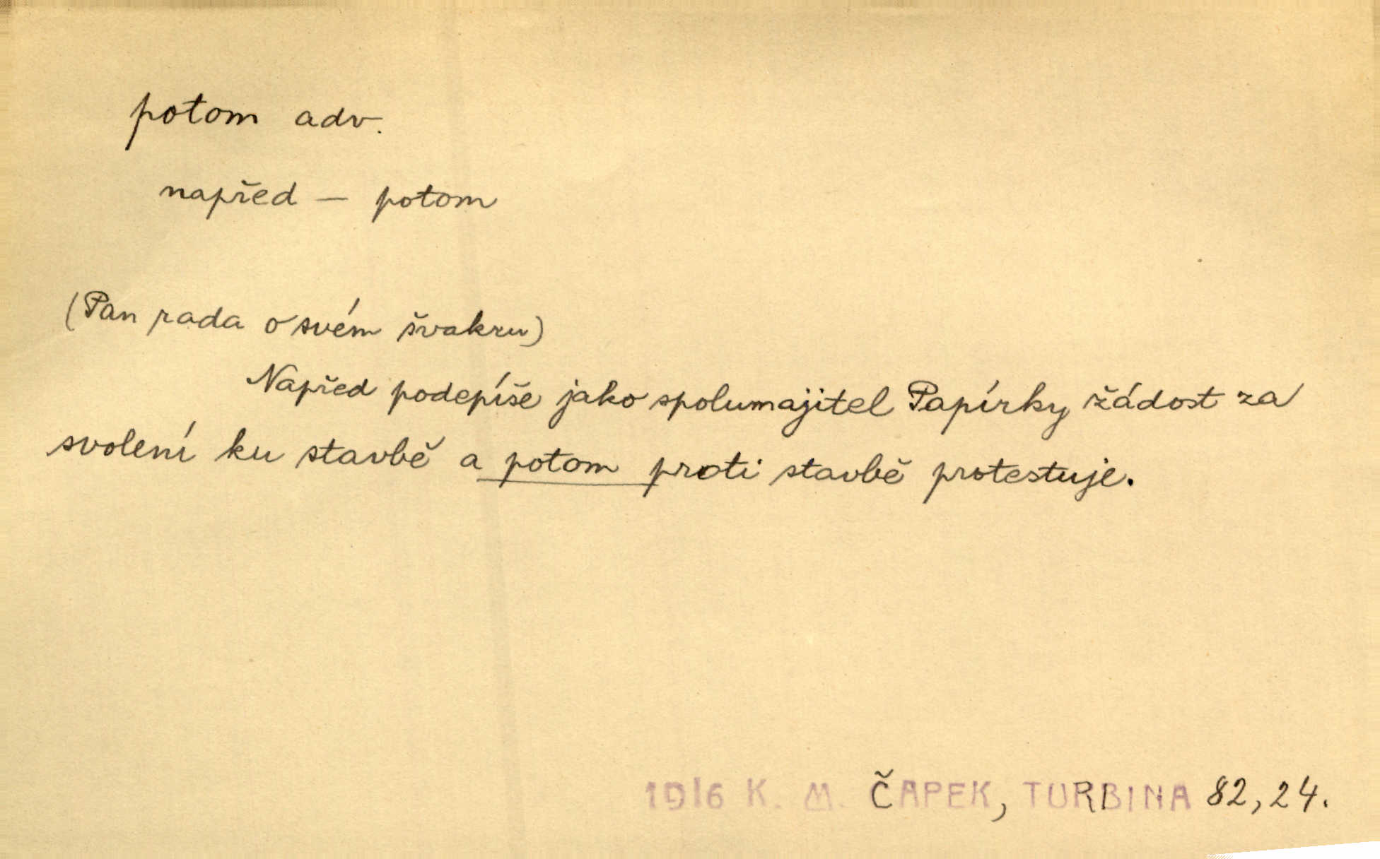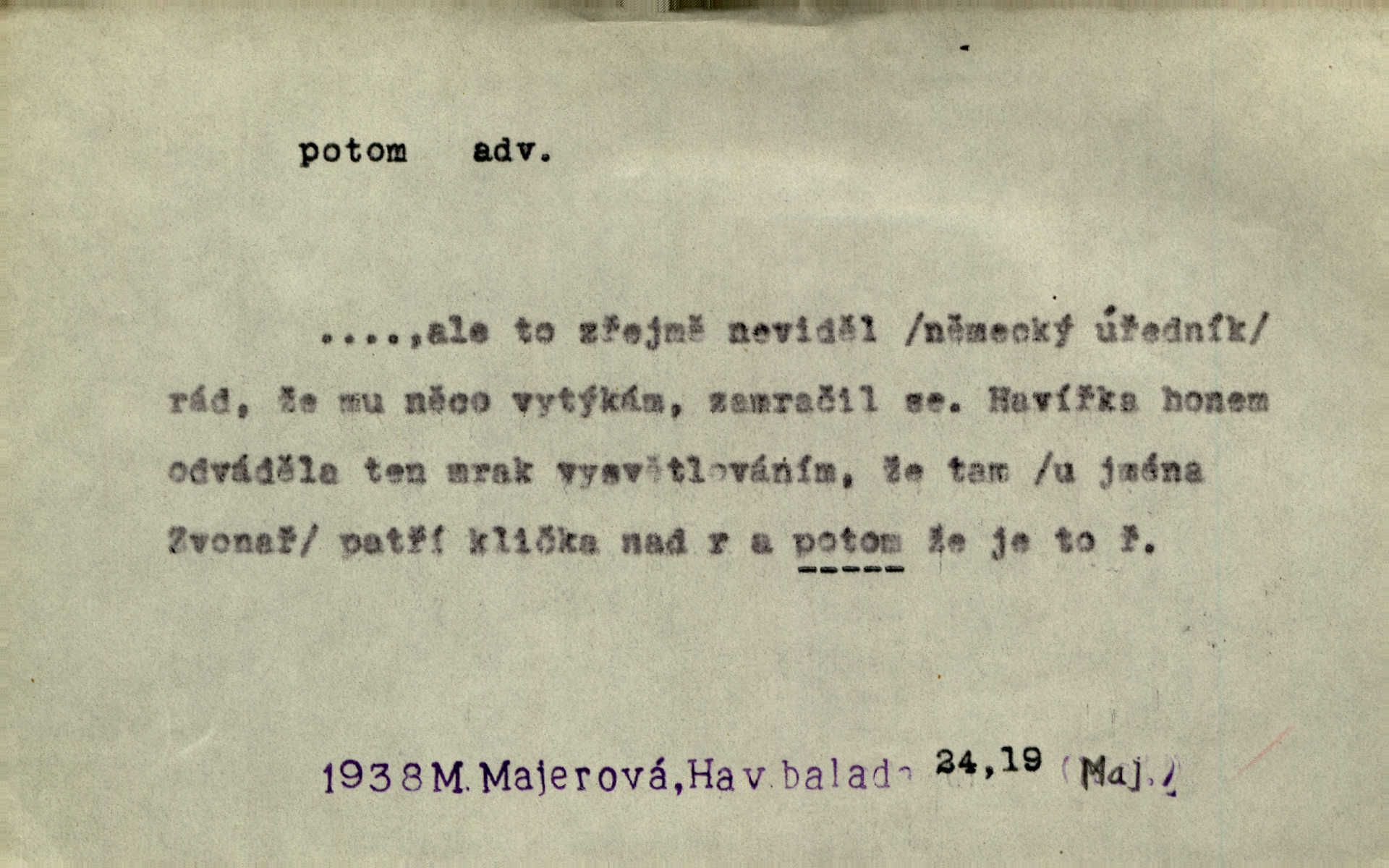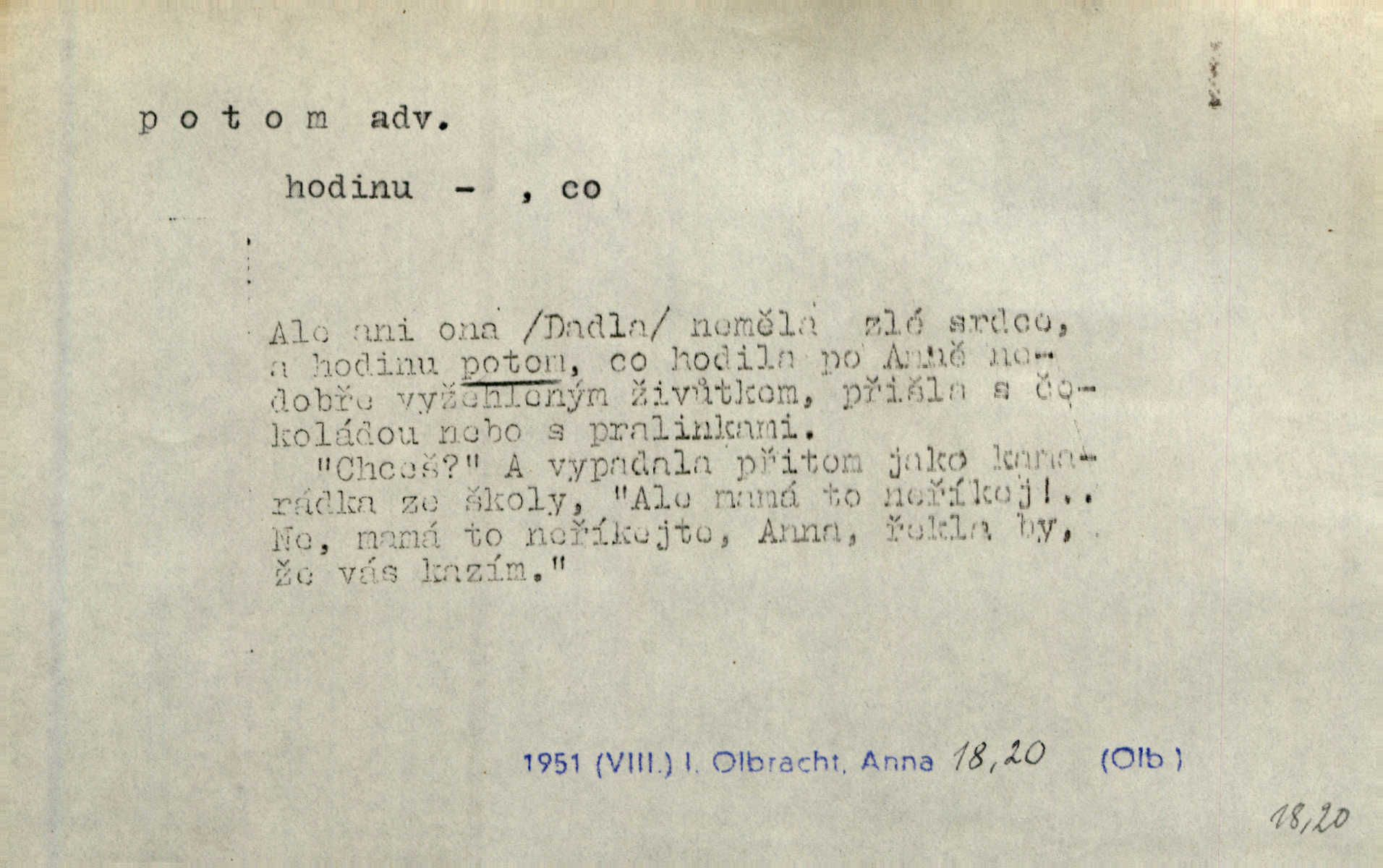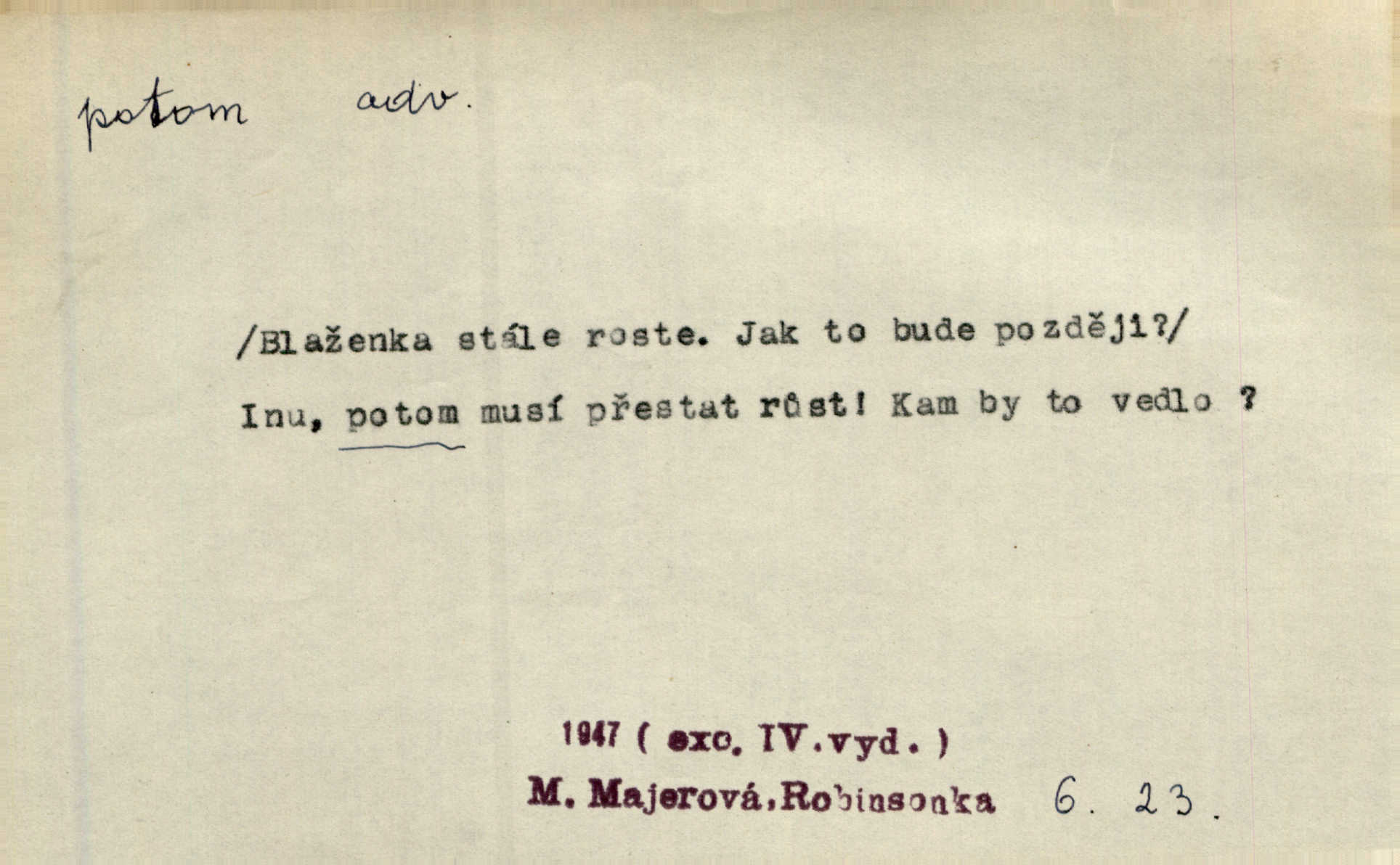 - potom adv. označuje časovou posloupnost; později. Přijde čas a vyláme nám zuby. Co potom? Vrch. Napřed podepíše žádost za svolení ku stavbě a potom proti stavbě protestuje. Čap. Ch. Za chvíli potom volali [páni] Baltazara na kancelář. Jir. D vyjadřuje výsledek: tedy, v tom případě. Pořádnosť mezi lidmi má být — to se potom snesou. Svob. „A o kom že to mluvíte, milý sedláku?“ „O dceři vdovy Loučanské!“ „O Marii? — Potom, milý brachu, té holce křivdíte.“ Třeb. Když je člověk zdráv, projde to, ale když máte trolení v oudech, potom zkusíte. Něm. Zač stálo by potom jinak naše vítězství! Třeb. D zdůrazňuje rozpor nějakého tvrzení s jiným. Poznali jsme, že to veliká sova. A potom prý je sova nočním ptákem! Thom. To je tatík, co? To je potom otec! Svob. Zamiloval se již do chlapce, jak potom do děvy tak krásné? Choch. Jeden učený Angličan pravil: „Člověče, čiň, co chceš, všecko tě posléz omrzí.“ Jak pak člověka nemělo omrzet potom to, co nechce? Rub. Ale proč nejde Dalibor? Aby tak potom nepřišel! Klicp. D vyjadřuje slučování: a, i, také, též. Celkem může se říci, že u Krátkých dětem se více líbilo. Předně, že u Krátkých měli více dětí. A potom, když strýček Krátký přemítal v knížkách, hned ukázal dětem pěkný obrázek. Herb. Moje matka také nebyla na mojí veselce v kostele. A potom mám moc práce. Svob. Daleko nezašel, aby nezabloudil, a potom, aby ho někdo nezastihl. Ehrenb. Veliká byla rodina: dva synové, potom tři vnuci ženatí, potom dva vnuci výrostkové. Čel.