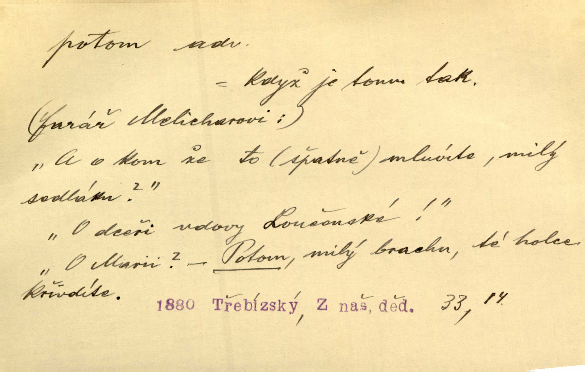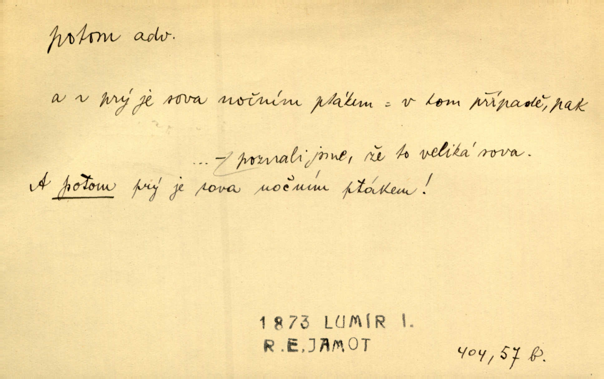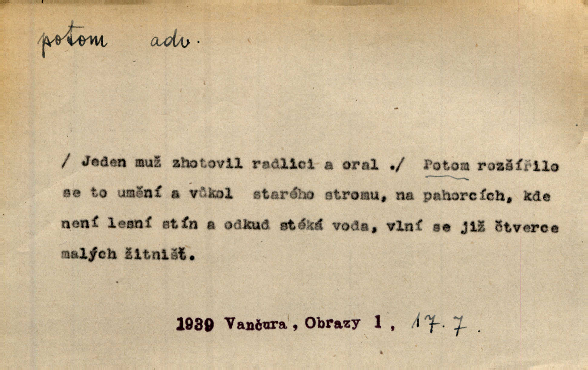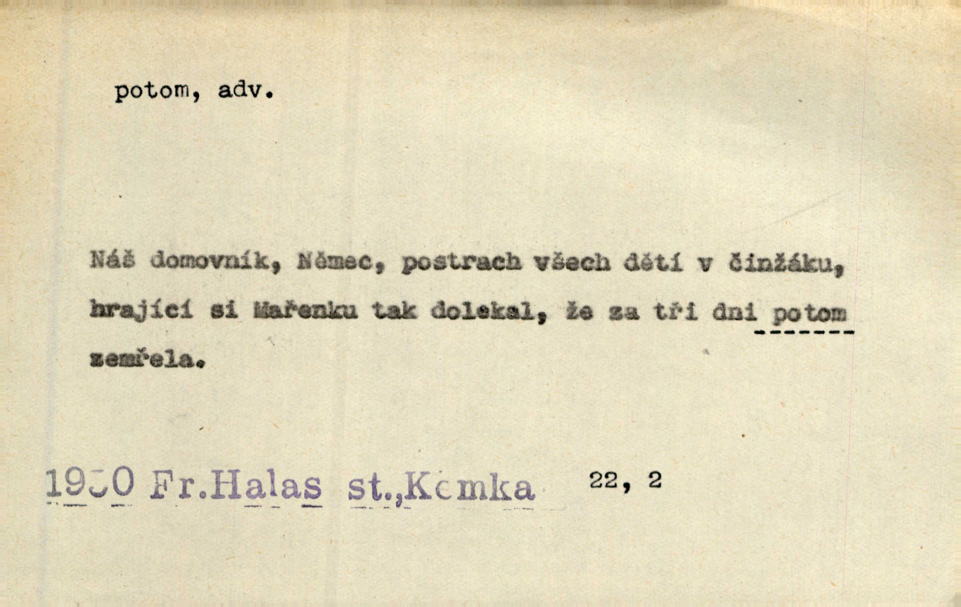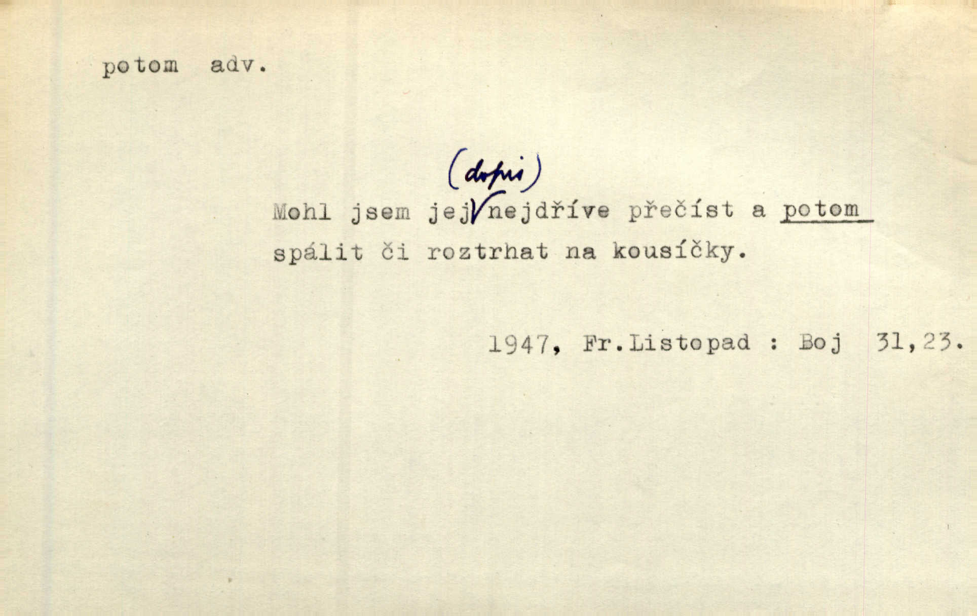 - potom adv. označuje časovou posloupnost; později. Přijde čas a vyláme nám zuby. Co potom? Vrch. Napřed podepíše žádost za svolení ku stavbě a potom proti stavbě protestuje. Čap. Ch. Za chvíli potom volali [páni] Baltazara na kancelář. Jir. D vyjadřuje výsledek: tedy, v tom případě. Pořádnosť mezi lidmi má být — to se potom snesou. Svob. „A o kom že to mluvíte, milý sedláku?“ „O dceři vdovy Loučanské!“ „O Marii? — Potom, milý brachu, té holce křivdíte.“ Třeb. Když je člověk zdráv, projde to, ale když máte trolení v oudech, potom zkusíte. Něm. Zač stálo by potom jinak naše vítězství! Třeb. D zdůrazňuje rozpor nějakého tvrzení s jiným. Poznali jsme, že to veliká sova. A potom prý je sova nočním ptákem! Thom. To je tatík, co? To je potom otec! Svob. Zamiloval se již do chlapce, jak potom do děvy tak krásné? Choch. Jeden učený Angličan pravil: „Člověče, čiň, co chceš, všecko tě posléz omrzí.“ Jak pak člověka nemělo omrzet potom to, co nechce? Rub. Ale proč nejde Dalibor? Aby tak potom nepřišel! Klicp. D vyjadřuje slučování: a, i, také, též. Celkem může se říci, že u Krátkých dětem se více líbilo. Předně, že u Krátkých měli více dětí. A potom, když strýček Krátký přemítal v knížkách, hned ukázal dětem pěkný obrázek. Herb. Moje matka také nebyla na mojí veselce v kostele. A potom mám moc práce. Svob. Daleko nezašel, aby nezabloudil, a potom, aby ho někdo nezastihl. Ehrenb. Veliká byla rodina: dva synové, potom tři vnuci ženatí, potom dva vnuci výrostkové. Čel.