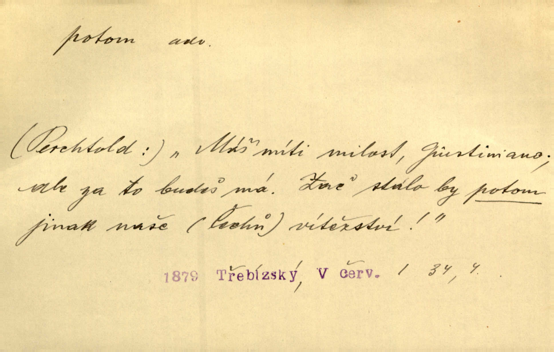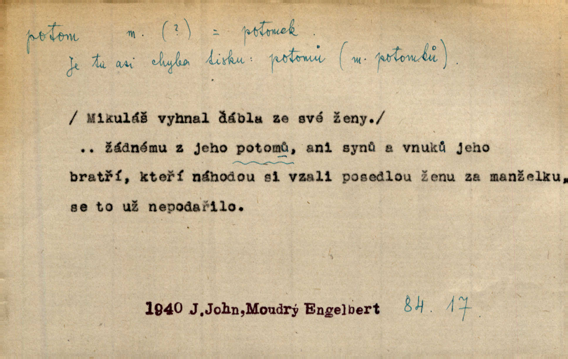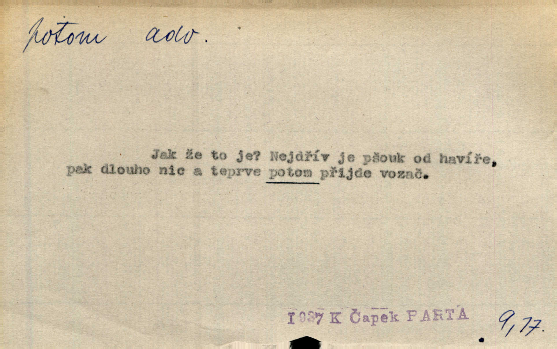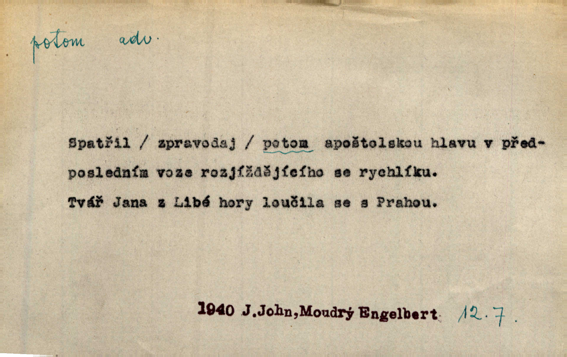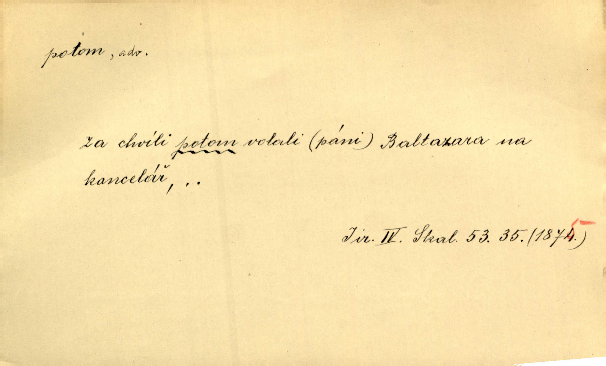 - potom adv. označuje časovou posloupnost; později. Přijde čas a vyláme nám zuby. Co potom? Vrch. Napřed podepíše žádost za svolení ku stavbě a potom proti stavbě protestuje. Čap. Ch. Za chvíli potom volali [páni] Baltazara na kancelář. Jir. D vyjadřuje výsledek: tedy, v tom případě. Pořádnosť mezi lidmi má být — to se potom snesou. Svob. „A o kom že to mluvíte, milý sedláku?“ „O dceři vdovy Loučanské!“ „O Marii? — Potom, milý brachu, té holce křivdíte.“ Třeb. Když je člověk zdráv, projde to, ale když máte trolení v oudech, potom zkusíte. Něm. Zač stálo by potom jinak naše vítězství! Třeb. D zdůrazňuje rozpor nějakého tvrzení s jiným. Poznali jsme, že to veliká sova. A potom prý je sova nočním ptákem! Thom. To je tatík, co? To je potom otec! Svob. Zamiloval se již do chlapce, jak potom do děvy tak krásné? Choch. Jeden učený Angličan pravil: „Člověče, čiň, co chceš, všecko tě posléz omrzí.“ Jak pak člověka nemělo omrzet potom to, co nechce? Rub. Ale proč nejde Dalibor? Aby tak potom nepřišel! Klicp. D vyjadřuje slučování: a, i, také, též. Celkem může se říci, že u Krátkých dětem se více líbilo. Předně, že u Krátkých měli více dětí. A potom, když strýček Krátký přemítal v knížkách, hned ukázal dětem pěkný obrázek. Herb. Moje matka také nebyla na mojí veselce v kostele. A potom mám moc práce. Svob. Daleko nezašel, aby nezabloudil, a potom, aby ho někdo nezastihl. Ehrenb. Veliká byla rodina: dva synové, potom tři vnuci ženatí, potom dva vnuci výrostkové. Čel.