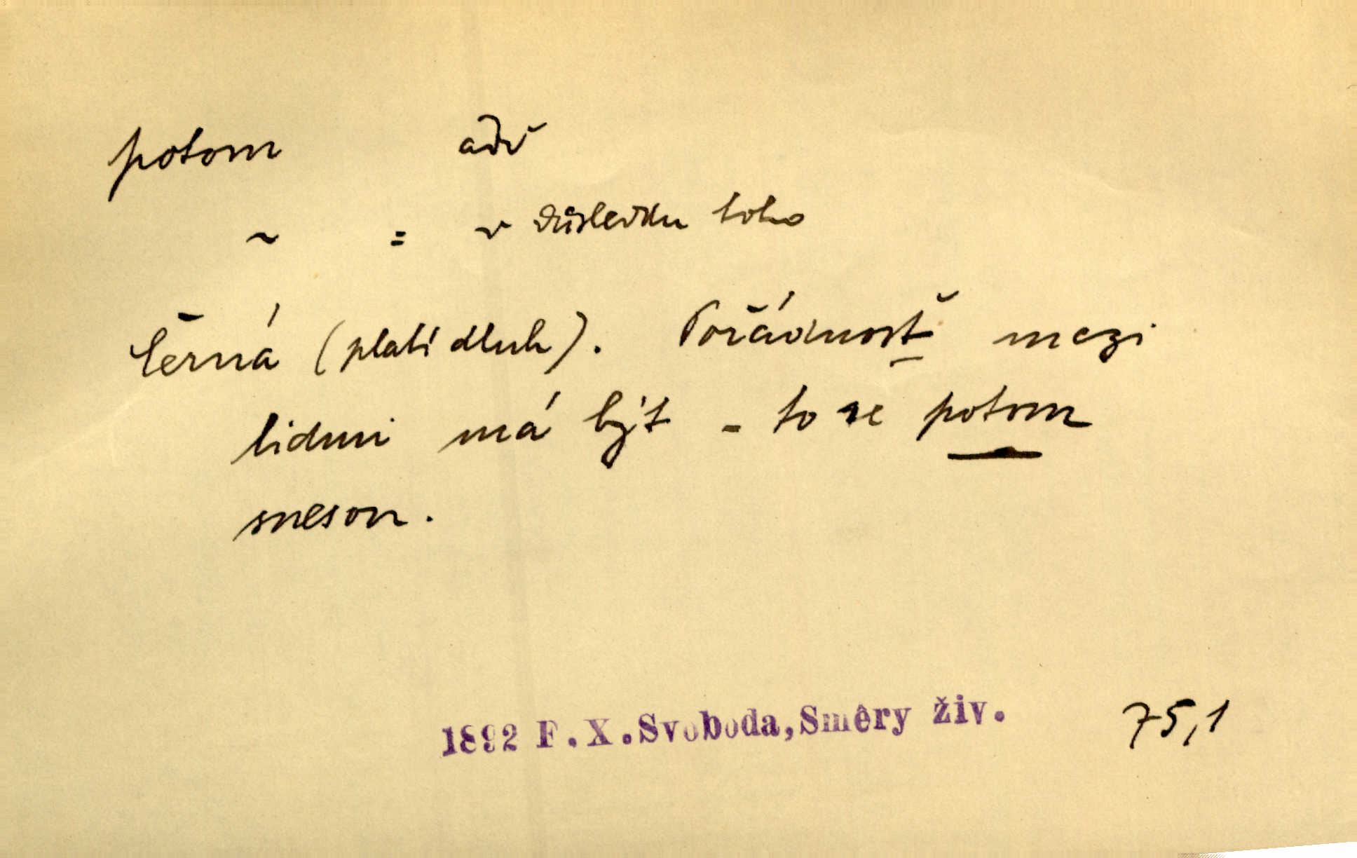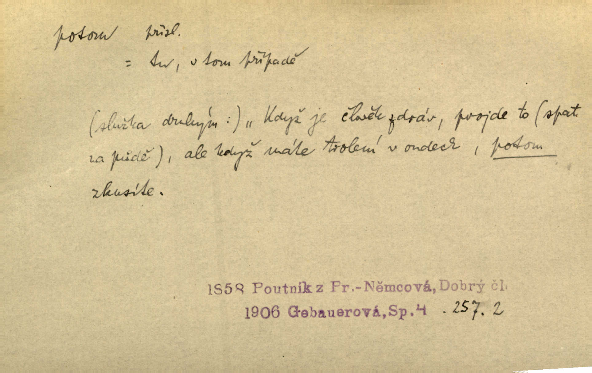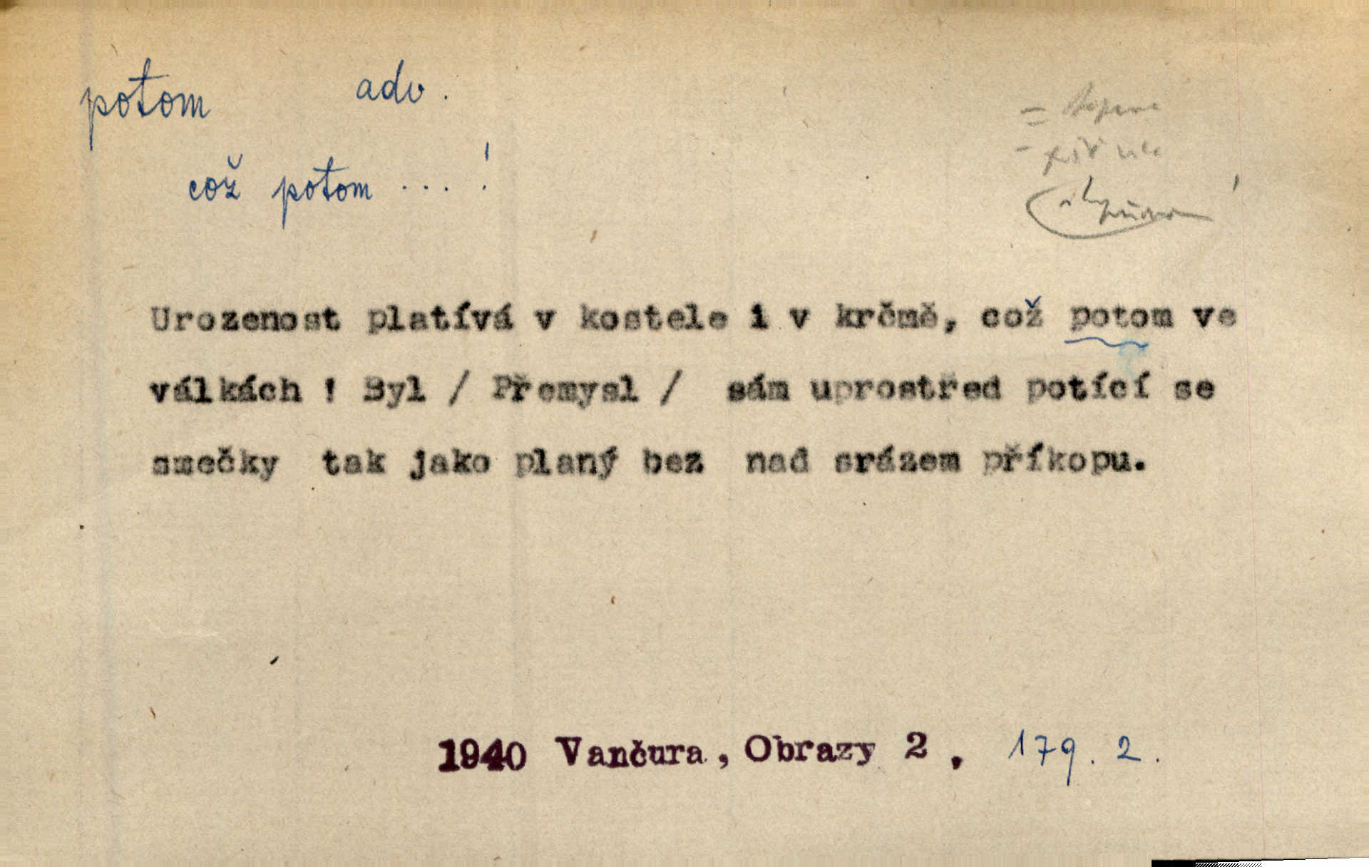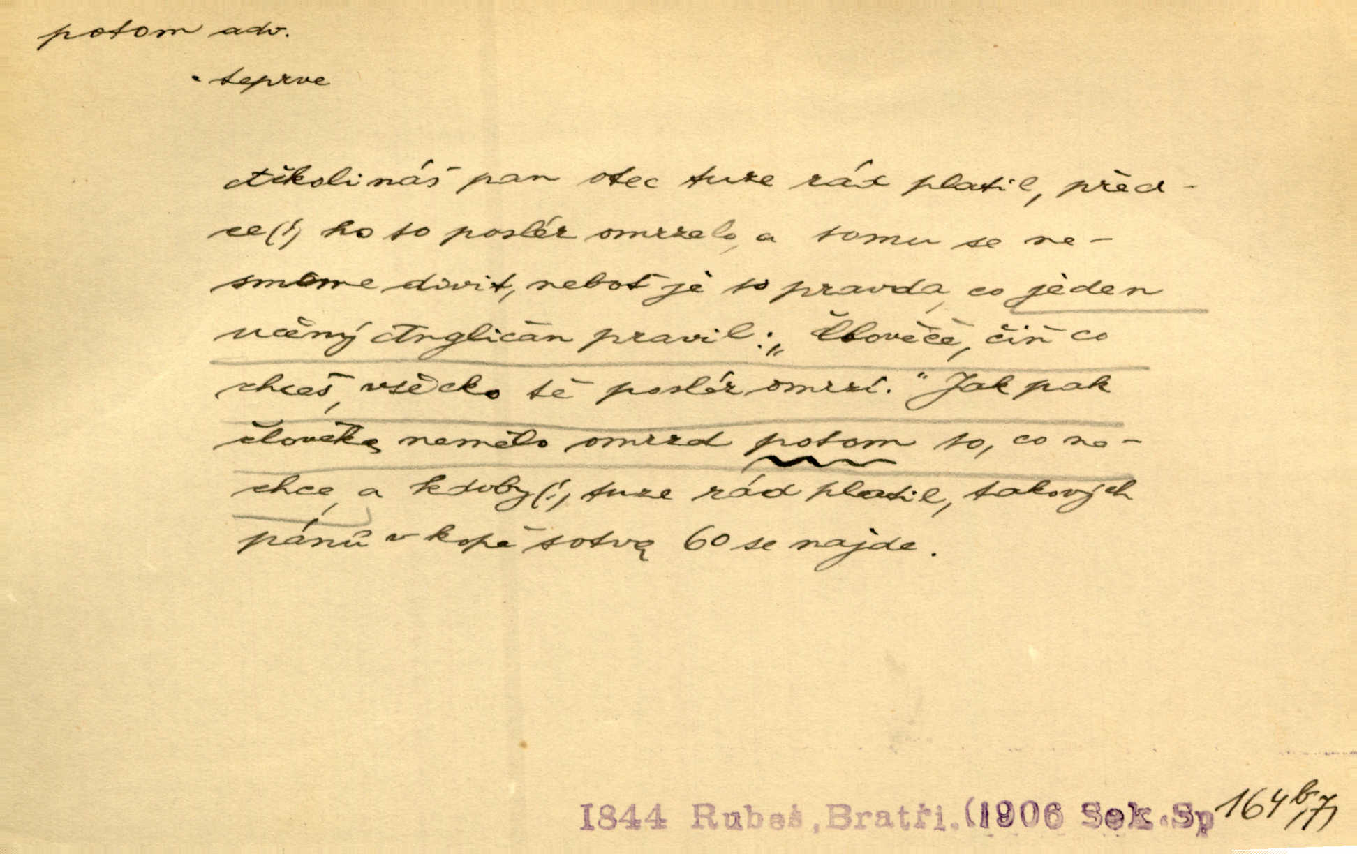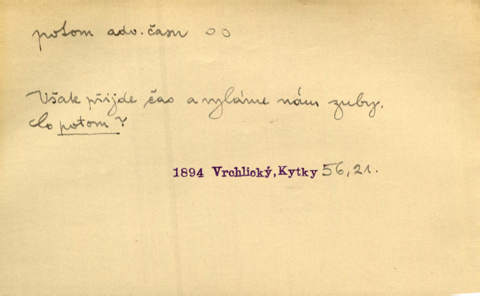- potom adv. označuje časovou posloupnost; později. Přijde čas a vyláme nám zuby. Co potom? Vrch. Napřed podepíše žádost za svolení ku stavbě a potom proti stavbě protestuje. Čap. Ch. Za chvíli potom volali [páni] Baltazara na kancelář. Jir. D vyjadřuje výsledek: tedy, v tom případě. Pořádnosť mezi lidmi má být — to se potom snesou. Svob. „A o kom že to mluvíte, milý sedláku?“ „O dceři vdovy Loučanské!“ „O Marii? — Potom, milý brachu, té holce křivdíte.“ Třeb. Když je člověk zdráv, projde to, ale když máte trolení v oudech, potom zkusíte. Něm. Zač stálo by potom jinak naše vítězství! Třeb. D zdůrazňuje rozpor nějakého tvrzení s jiným. Poznali jsme, že to veliká sova. A potom prý je sova nočním ptákem! Thom. To je tatík, co? To je potom otec! Svob. Zamiloval se již do chlapce, jak potom do děvy tak krásné? Choch. Jeden učený Angličan pravil: „Člověče, čiň, co chceš, všecko tě posléz omrzí.“ Jak pak člověka nemělo omrzet potom to, co nechce? Rub. Ale proč nejde Dalibor? Aby tak potom nepřišel! Klicp. D vyjadřuje slučování: a, i, také, též. Celkem může se říci, že u Krátkých dětem se více líbilo. Předně, že u Krátkých měli více dětí. A potom, když strýček Krátký přemítal v knížkách, hned ukázal dětem pěkný obrázek. Herb. Moje matka také nebyla na mojí veselce v kostele. A potom mám moc práce. Svob. Daleko nezašel, aby nezabloudil, a potom, aby ho někdo nezastihl. Ehrenb. Veliká byla rodina: dva synové, potom tři vnuci ženatí, potom dva vnuci výrostkové. Čel.