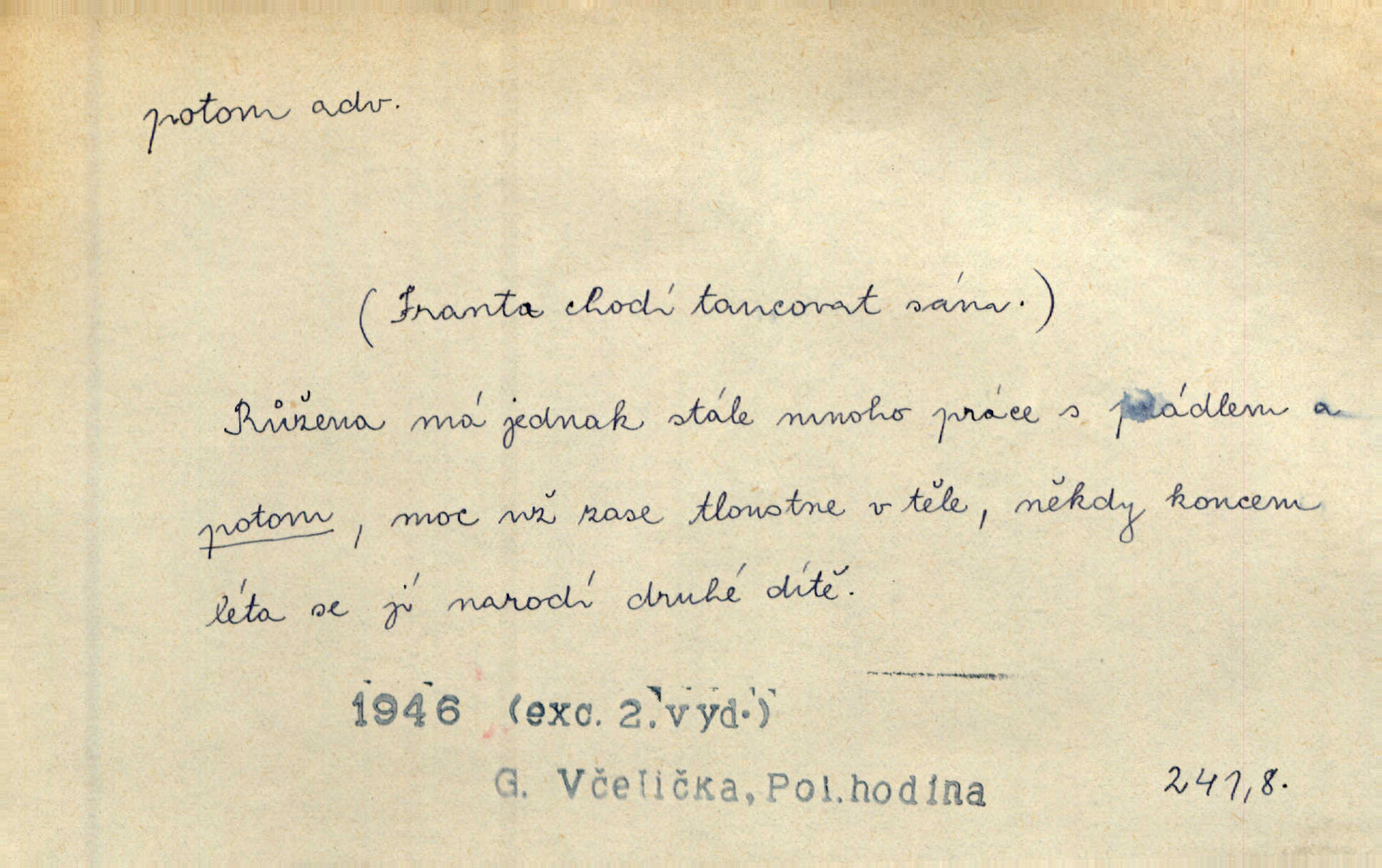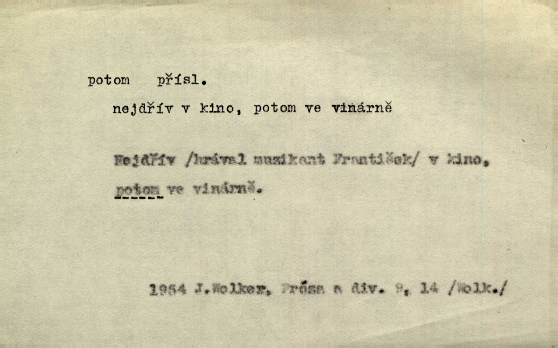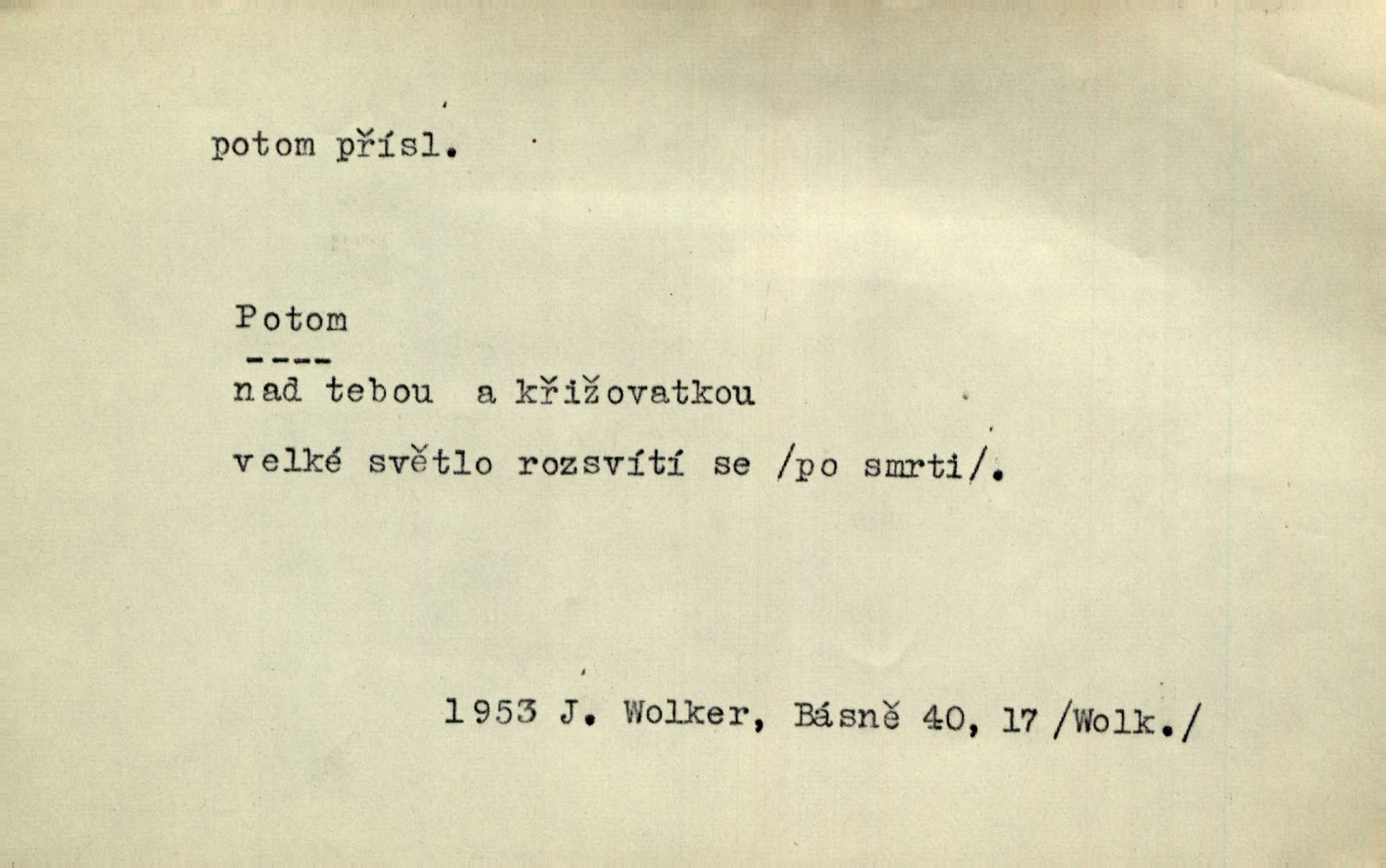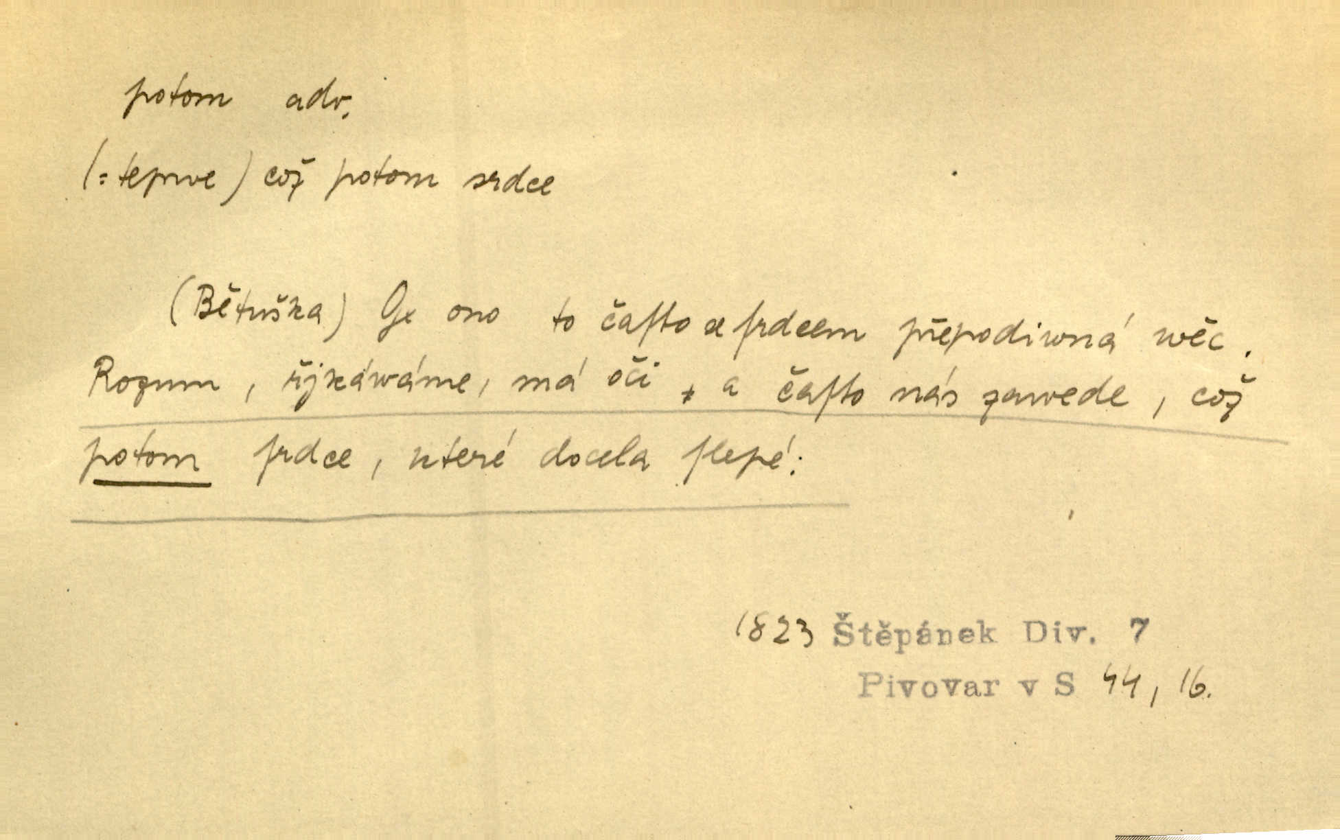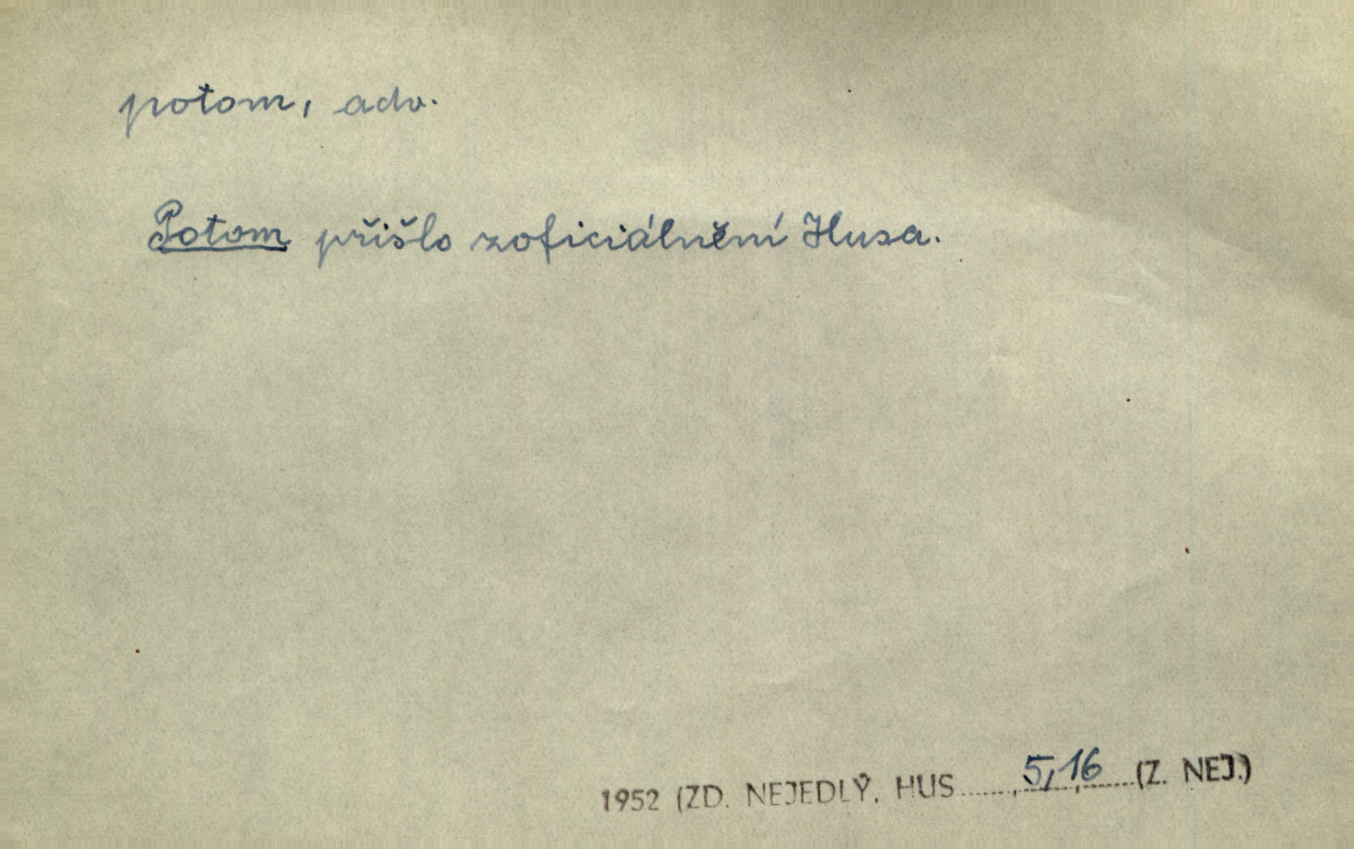 - potom adv. označuje časovou posloupnost; později. Přijde čas a vyláme nám zuby. Co potom? Vrch. Napřed podepíše žádost za svolení ku stavbě a potom proti stavbě protestuje. Čap. Ch. Za chvíli potom volali [páni] Baltazara na kancelář. Jir. D vyjadřuje výsledek: tedy, v tom případě. Pořádnosť mezi lidmi má být — to se potom snesou. Svob. „A o kom že to mluvíte, milý sedláku?“ „O dceři vdovy Loučanské!“ „O Marii? — Potom, milý brachu, té holce křivdíte.“ Třeb. Když je člověk zdráv, projde to, ale když máte trolení v oudech, potom zkusíte. Něm. Zač stálo by potom jinak naše vítězství! Třeb. D zdůrazňuje rozpor nějakého tvrzení s jiným. Poznali jsme, že to veliká sova. A potom prý je sova nočním ptákem! Thom. To je tatík, co? To je potom otec! Svob. Zamiloval se již do chlapce, jak potom do děvy tak krásné? Choch. Jeden učený Angličan pravil: „Člověče, čiň, co chceš, všecko tě posléz omrzí.“ Jak pak člověka nemělo omrzet potom to, co nechce? Rub. Ale proč nejde Dalibor? Aby tak potom nepřišel! Klicp. D vyjadřuje slučování: a, i, také, též. Celkem může se říci, že u Krátkých dětem se více líbilo. Předně, že u Krátkých měli více dětí. A potom, když strýček Krátký přemítal v knížkách, hned ukázal dětem pěkný obrázek. Herb. Moje matka také nebyla na mojí veselce v kostele. A potom mám moc práce. Svob. Daleko nezašel, aby nezabloudil, a potom, aby ho někdo nezastihl. Ehrenb. Veliká byla rodina: dva synové, potom tři vnuci ženatí, potom dva vnuci výrostkové. Čel.