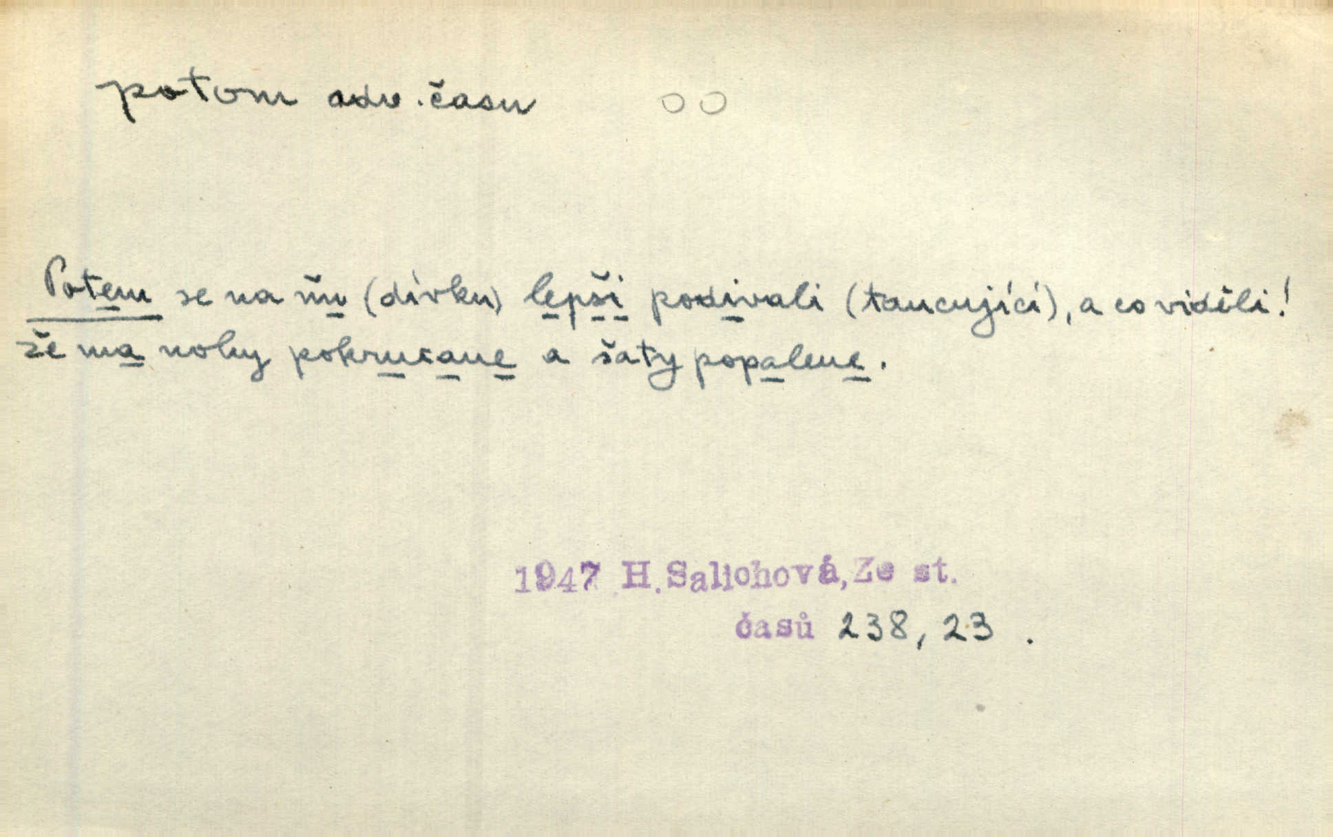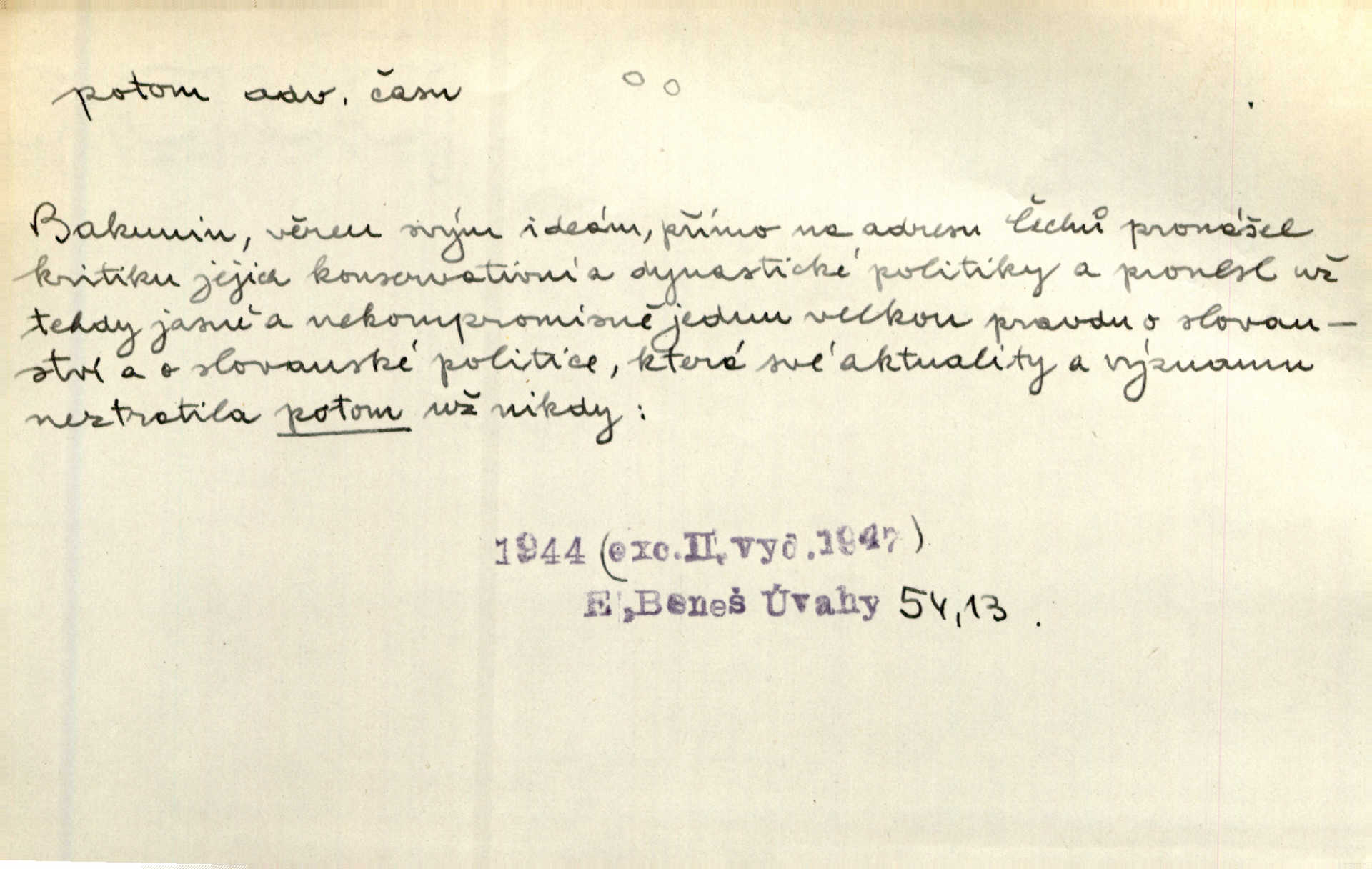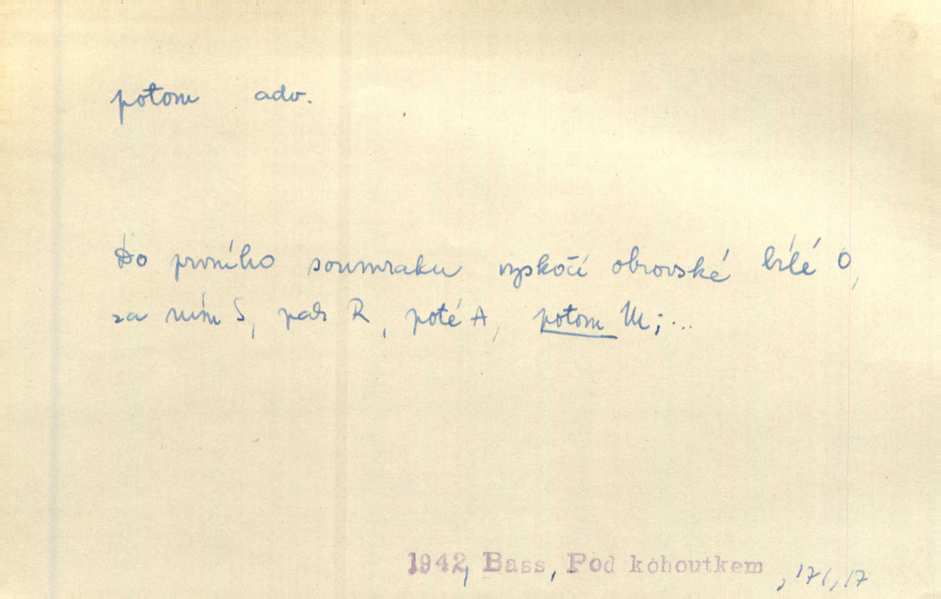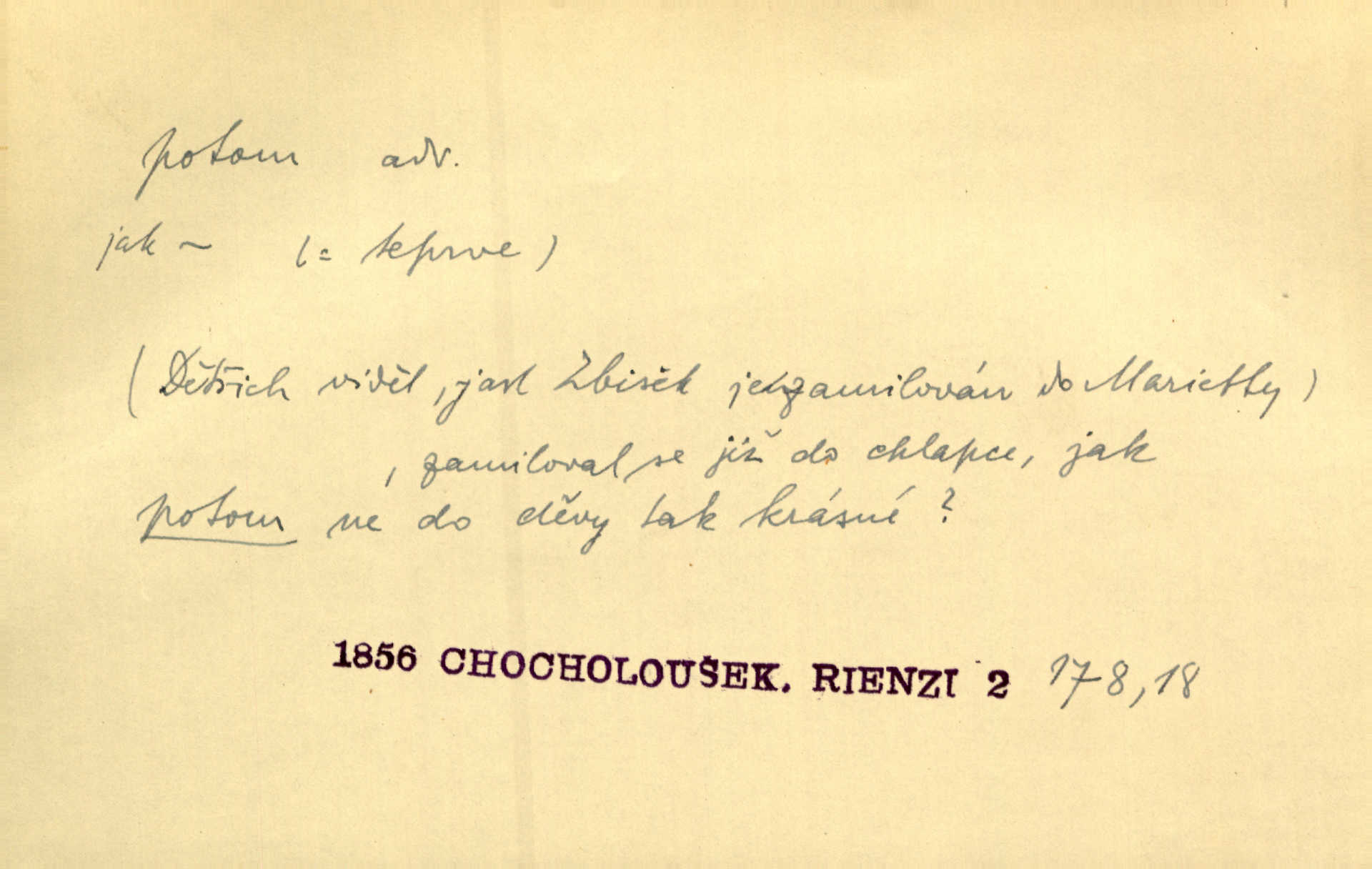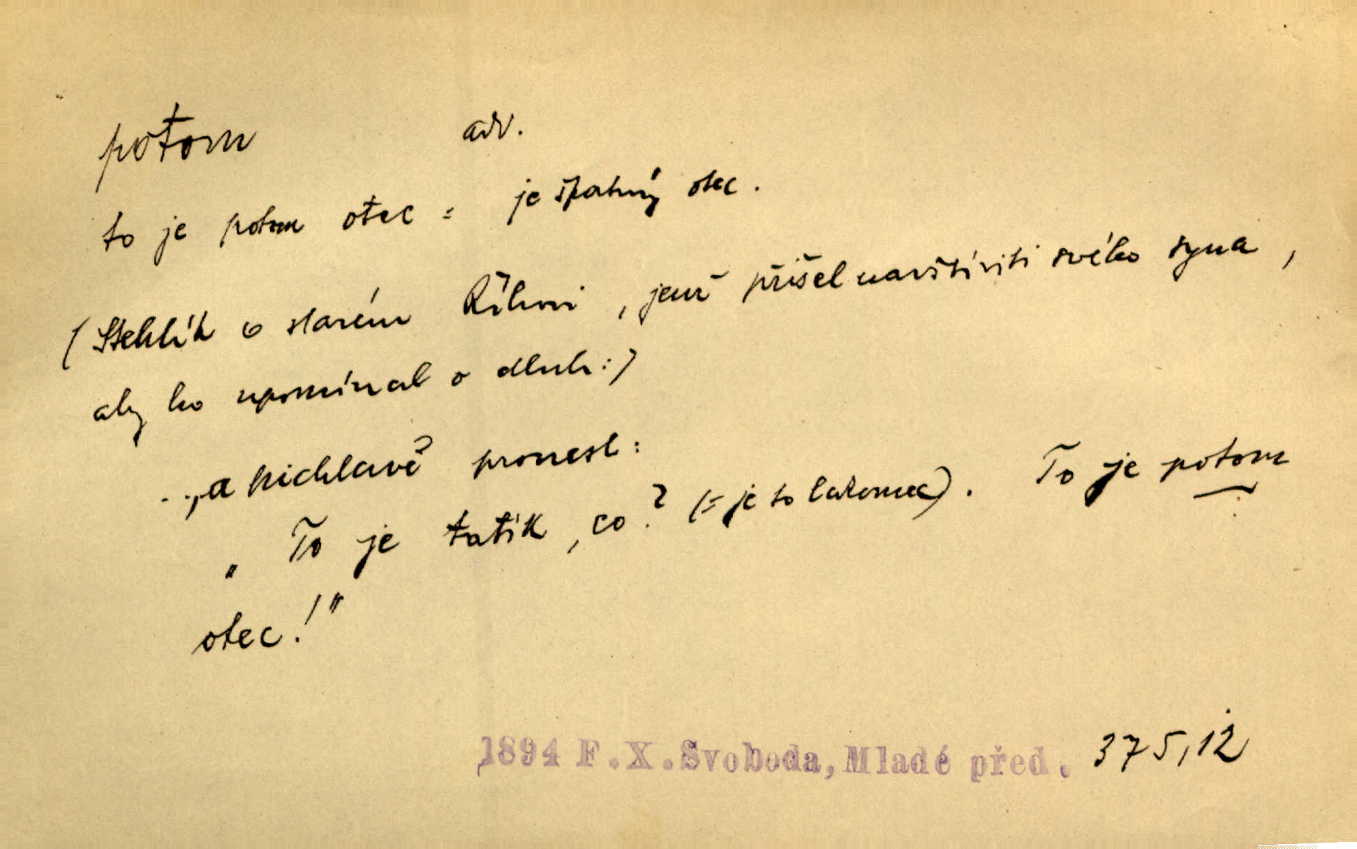 - potom adv. označuje časovou posloupnost; později. Přijde čas a vyláme nám zuby. Co potom? Vrch. Napřed podepíše žádost za svolení ku stavbě a potom proti stavbě protestuje. Čap. Ch. Za chvíli potom volali [páni] Baltazara na kancelář. Jir. D vyjadřuje výsledek: tedy, v tom případě. Pořádnosť mezi lidmi má být — to se potom snesou. Svob. „A o kom že to mluvíte, milý sedláku?“ „O dceři vdovy Loučanské!“ „O Marii? — Potom, milý brachu, té holce křivdíte.“ Třeb. Když je člověk zdráv, projde to, ale když máte trolení v oudech, potom zkusíte. Něm. Zač stálo by potom jinak naše vítězství! Třeb. D zdůrazňuje rozpor nějakého tvrzení s jiným. Poznali jsme, že to veliká sova. A potom prý je sova nočním ptákem! Thom. To je tatík, co? To je potom otec! Svob. Zamiloval se již do chlapce, jak potom do děvy tak krásné? Choch. Jeden učený Angličan pravil: „Člověče, čiň, co chceš, všecko tě posléz omrzí.“ Jak pak člověka nemělo omrzet potom to, co nechce? Rub. Ale proč nejde Dalibor? Aby tak potom nepřišel! Klicp. D vyjadřuje slučování: a, i, také, též. Celkem může se říci, že u Krátkých dětem se více líbilo. Předně, že u Krátkých měli více dětí. A potom, když strýček Krátký přemítal v knížkách, hned ukázal dětem pěkný obrázek. Herb. Moje matka také nebyla na mojí veselce v kostele. A potom mám moc práce. Svob. Daleko nezašel, aby nezabloudil, a potom, aby ho někdo nezastihl. Ehrenb. Veliká byla rodina: dva synové, potom tři vnuci ženatí, potom dva vnuci výrostkové. Čel.