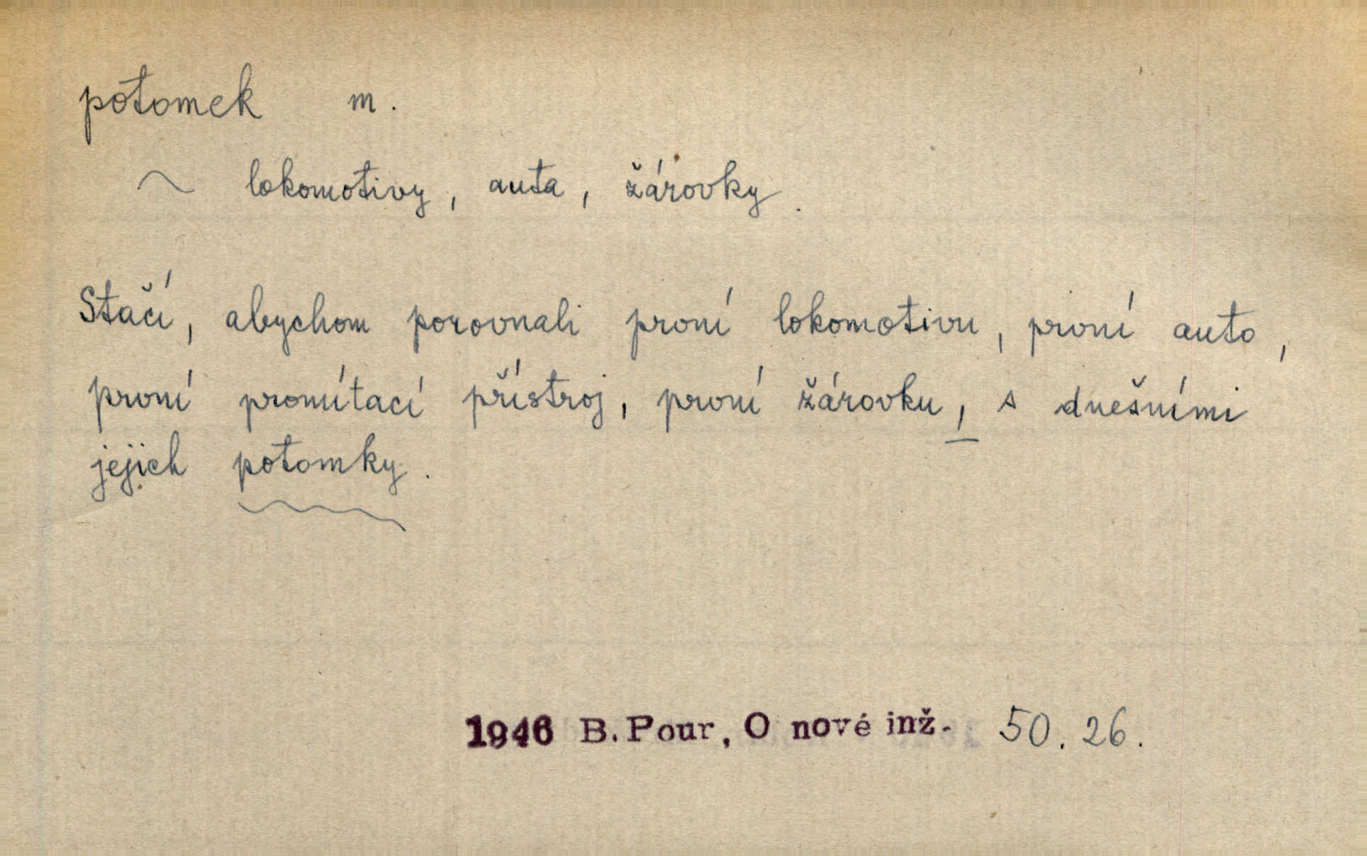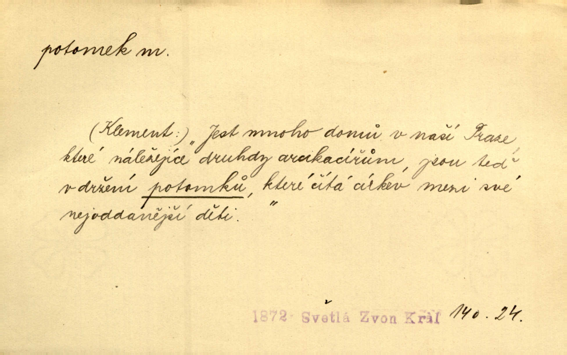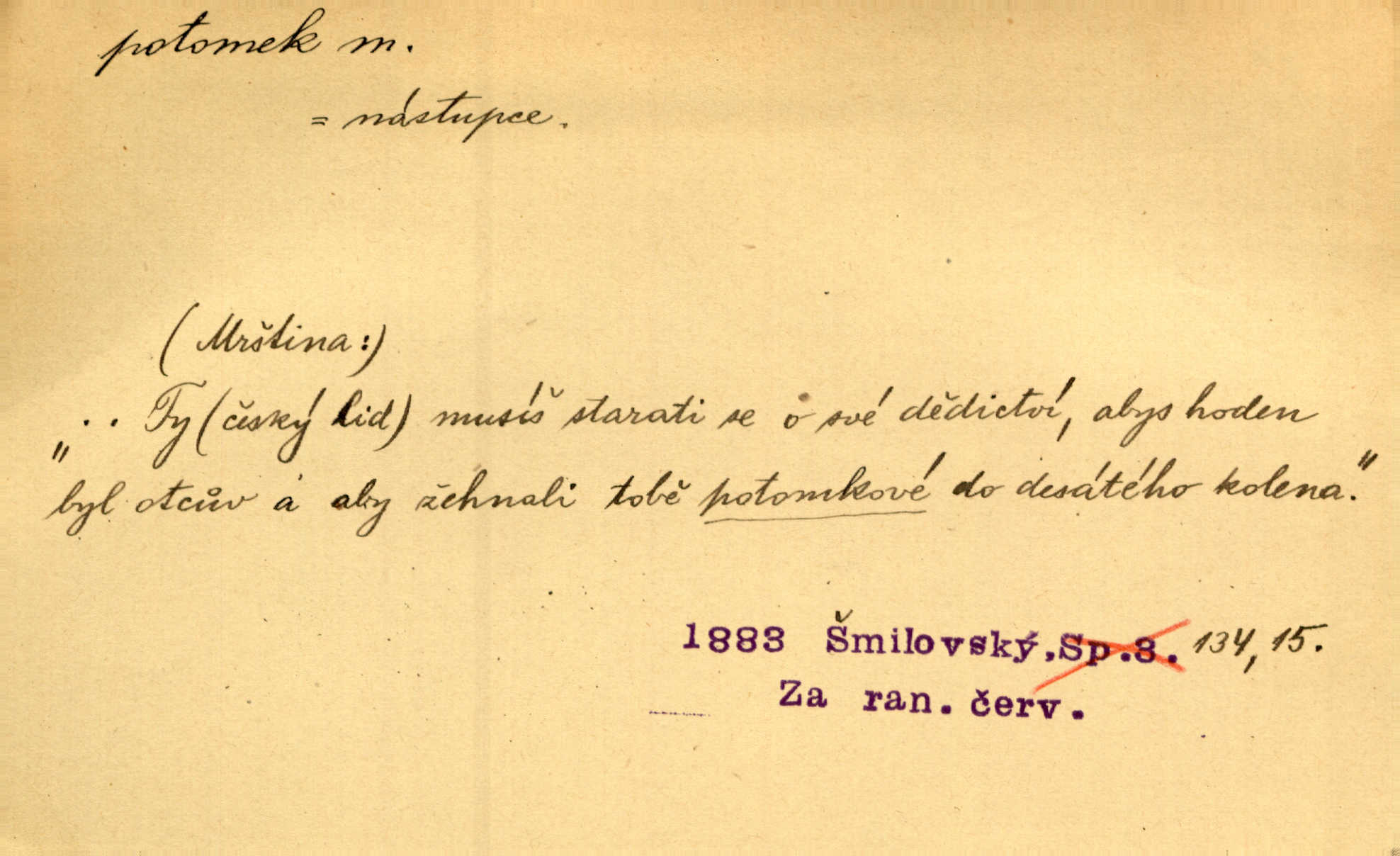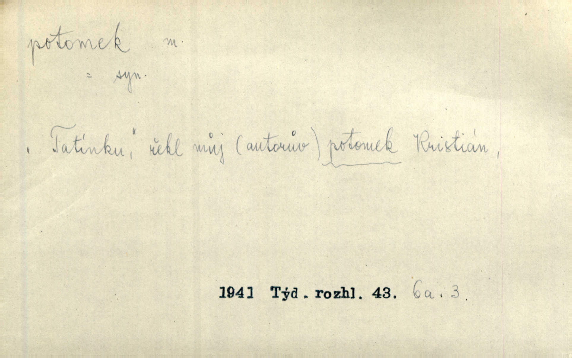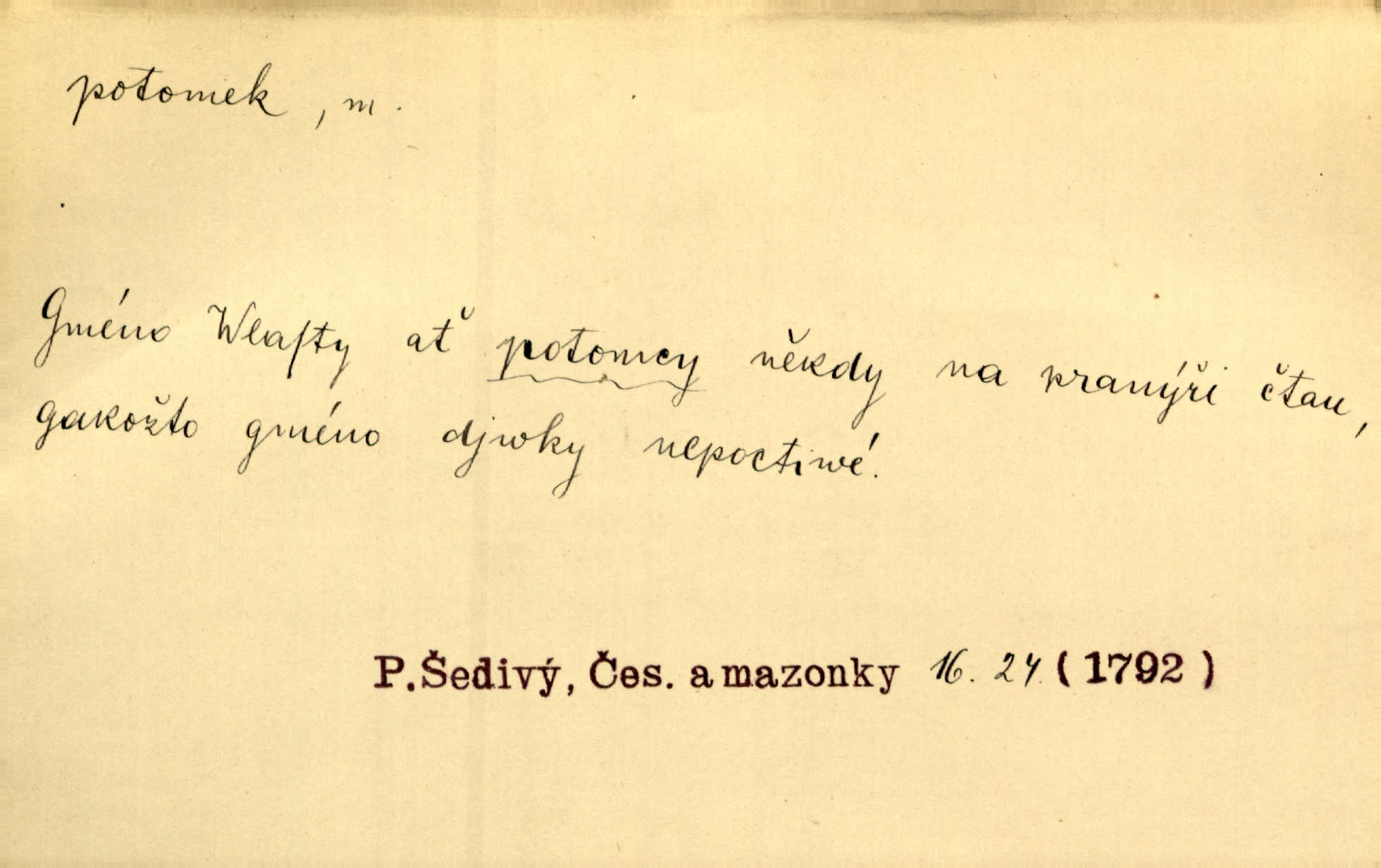 - potomek, -mka m. kdo z někoho přímo n. nepřímo pochází, syn, vnuk atd. Všichni vespolek mají sobě pomáhati, čeho předkové začali, aby potomci jejich dokonali. Tomek. Poslední potomek starého rodu po meči náhle skončil svůj život. Hlad. „A není žádných dědicův?“ „Ani potomkův ani příbuzných.“ Jir. Ve voze je paní s nejmladším svým potomkem na klíně. Prav. Přen. Učiněn pokus, zdali by nebylo možno dopátrati se přímých potomkův oněch keřů, jichž vlastnosti byly tak vynikající. Her. D člen pozdější generace. Klar dobyl si lidumilým působením vděčného uznání souvěkých a památky u potomkův. Zel. Co se mne týče, hlasuju pro a tvrdím, že je to jediná cesta, kterou může potomek Husův nastoupit. Kop. Bratří Čeští, potomci Husovi, od cizincův po celé století nazýváni byli „bratřími Valdenskými“. Pal. Romantism, svým původem buržoasní a revoluční, zplodí radikální subjektivism symbolistů, estétů, Baudelaira, Verlaina, Rimbauda a potomků. Šal.
