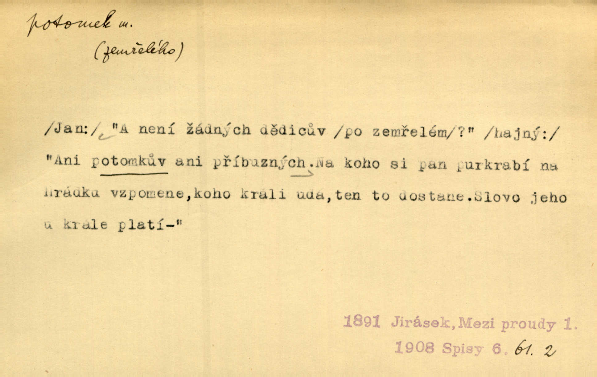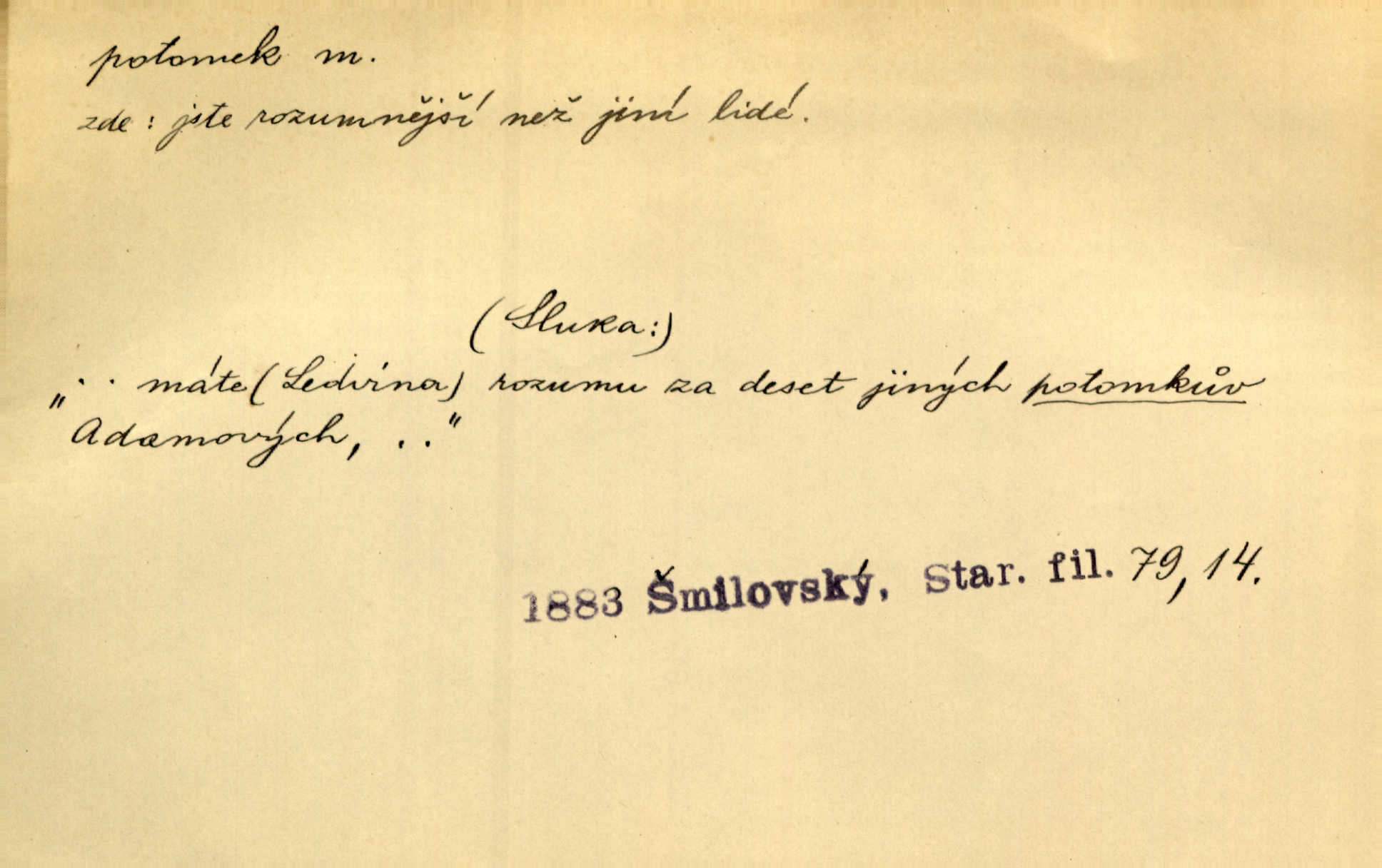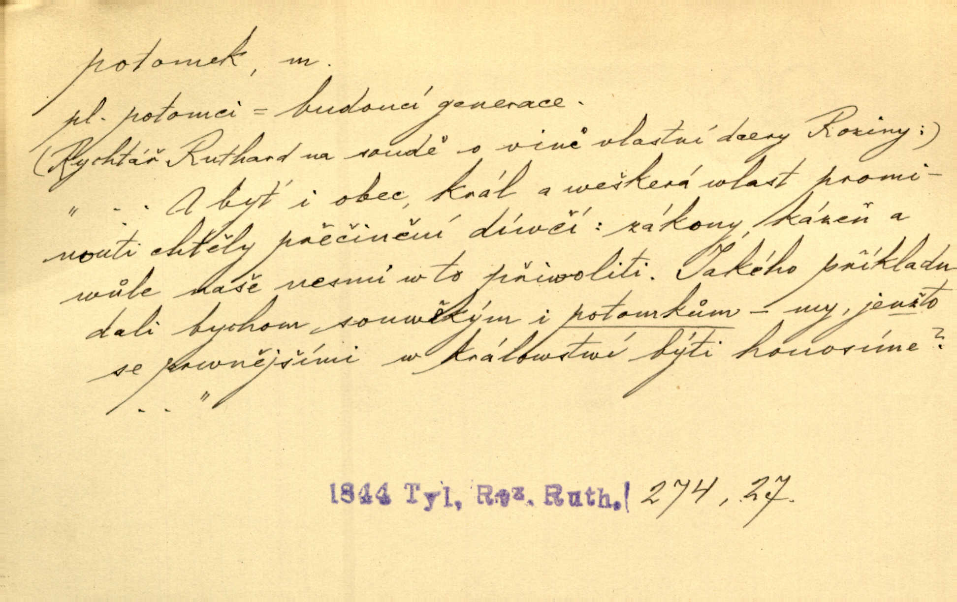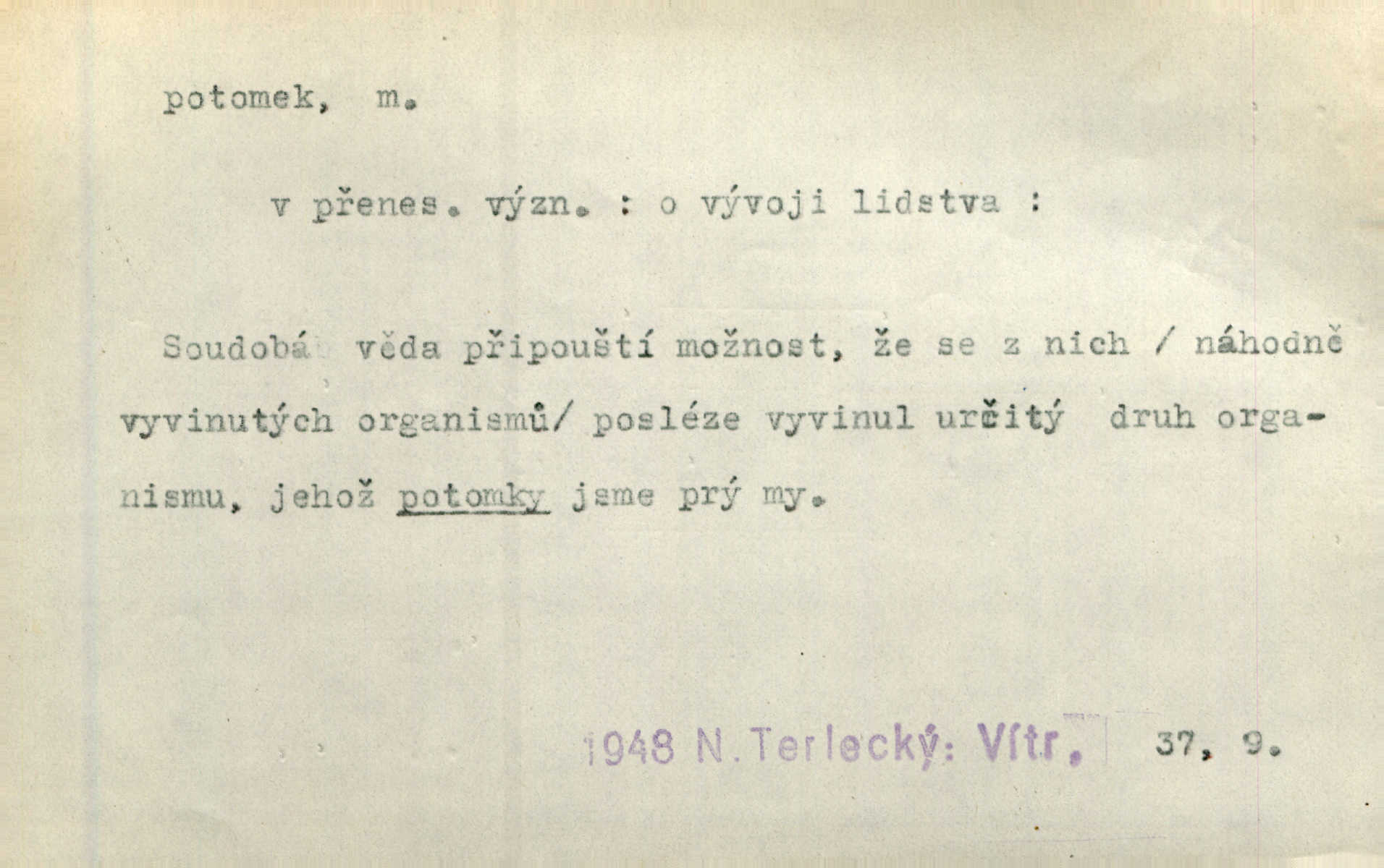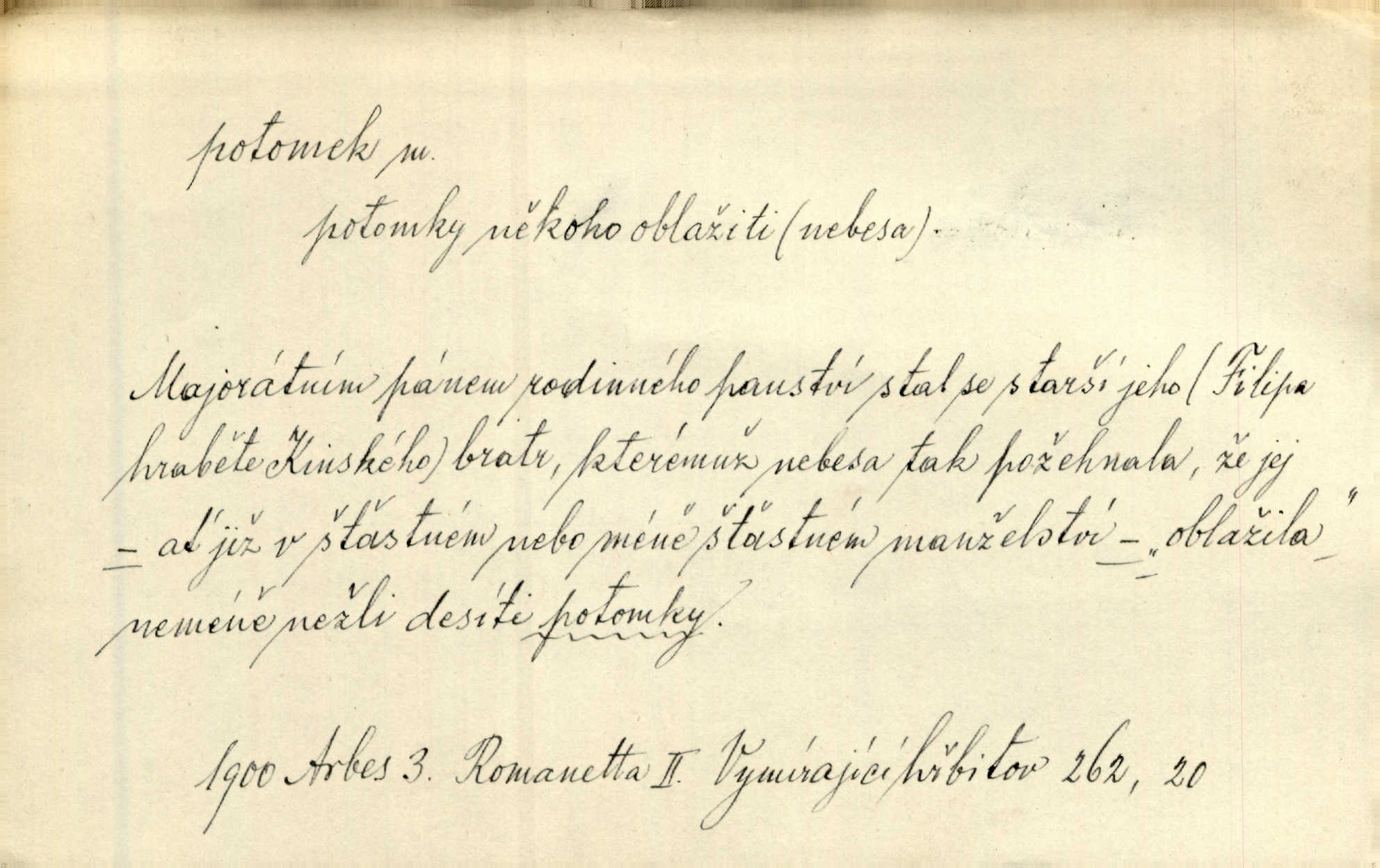 - potomek, -mka m. kdo z někoho přímo n. nepřímo pochází, syn, vnuk atd. Všichni vespolek mají sobě pomáhati, čeho předkové začali, aby potomci jejich dokonali. Tomek. Poslední potomek starého rodu po meči náhle skončil svůj život. Hlad. „A není žádných dědicův?“ „Ani potomkův ani příbuzných.“ Jir. Ve voze je paní s nejmladším svým potomkem na klíně. Prav. Přen. Učiněn pokus, zdali by nebylo možno dopátrati se přímých potomkův oněch keřů, jichž vlastnosti byly tak vynikající. Her. D člen pozdější generace. Klar dobyl si lidumilým působením vděčného uznání souvěkých a památky u potomkův. Zel. Co se mne týče, hlasuju pro a tvrdím, že je to jediná cesta, kterou může potomek Husův nastoupit. Kop. Bratří Čeští, potomci Husovi, od cizincův po celé století nazýváni byli „bratřími Valdenskými“. Pal. Romantism, svým původem buržoasní a revoluční, zplodí radikální subjektivism symbolistů, estétů, Baudelaira, Verlaina, Rimbauda a potomků. Šal.