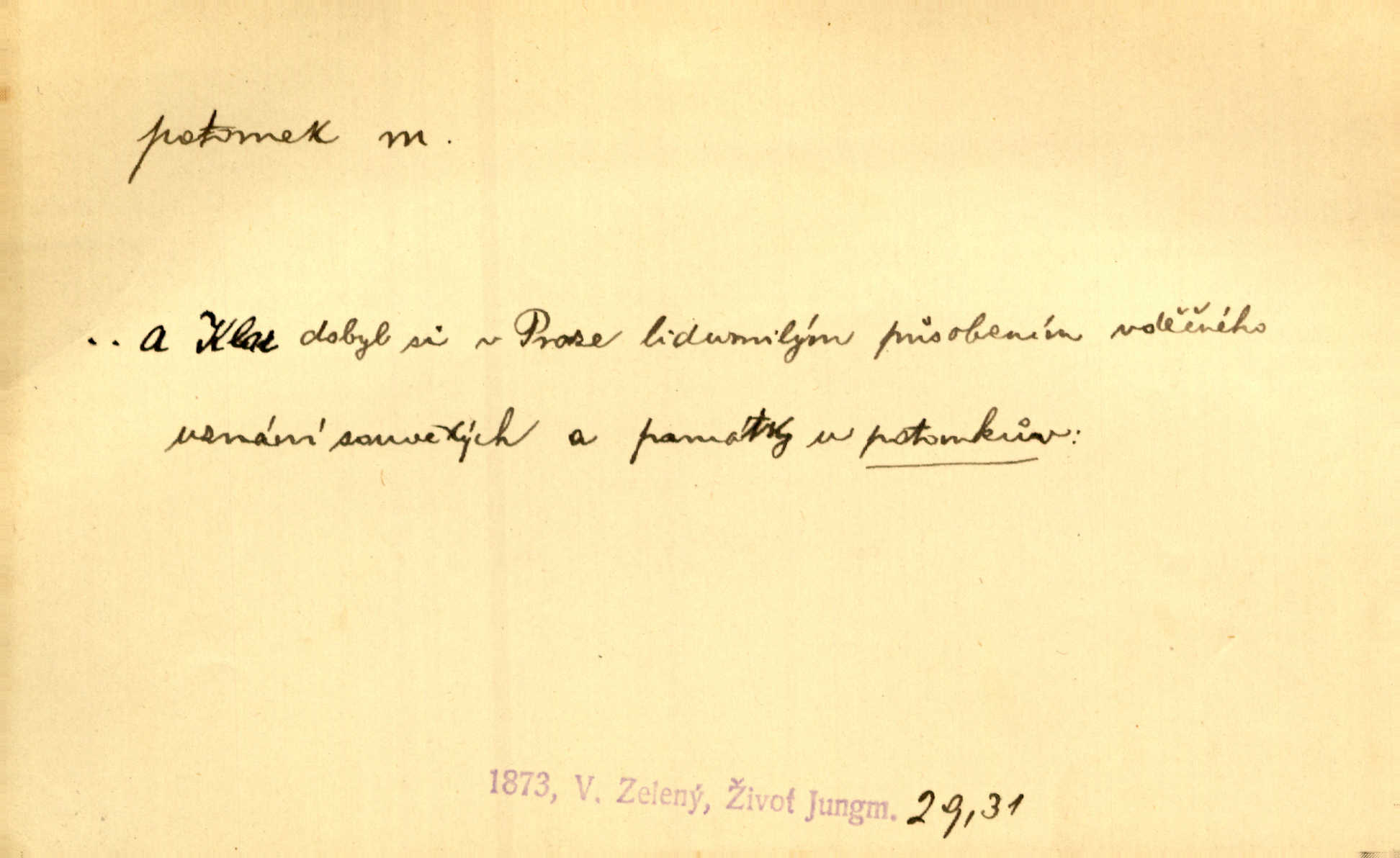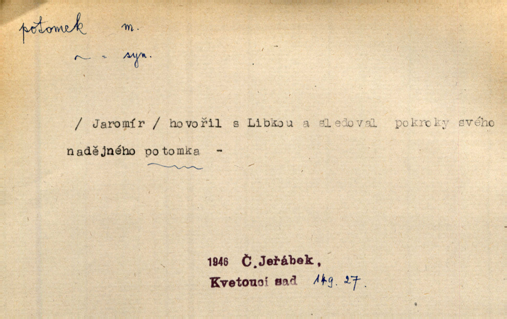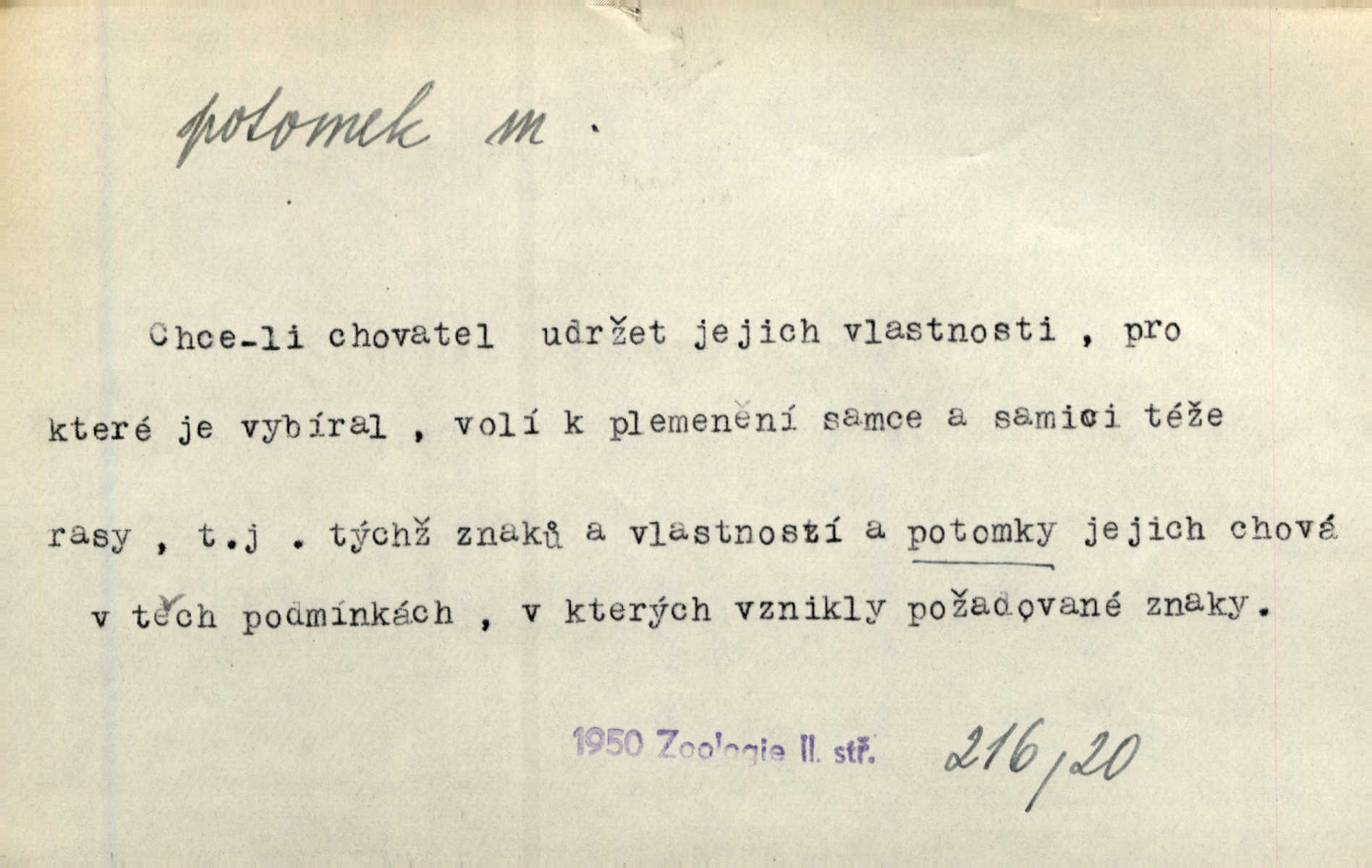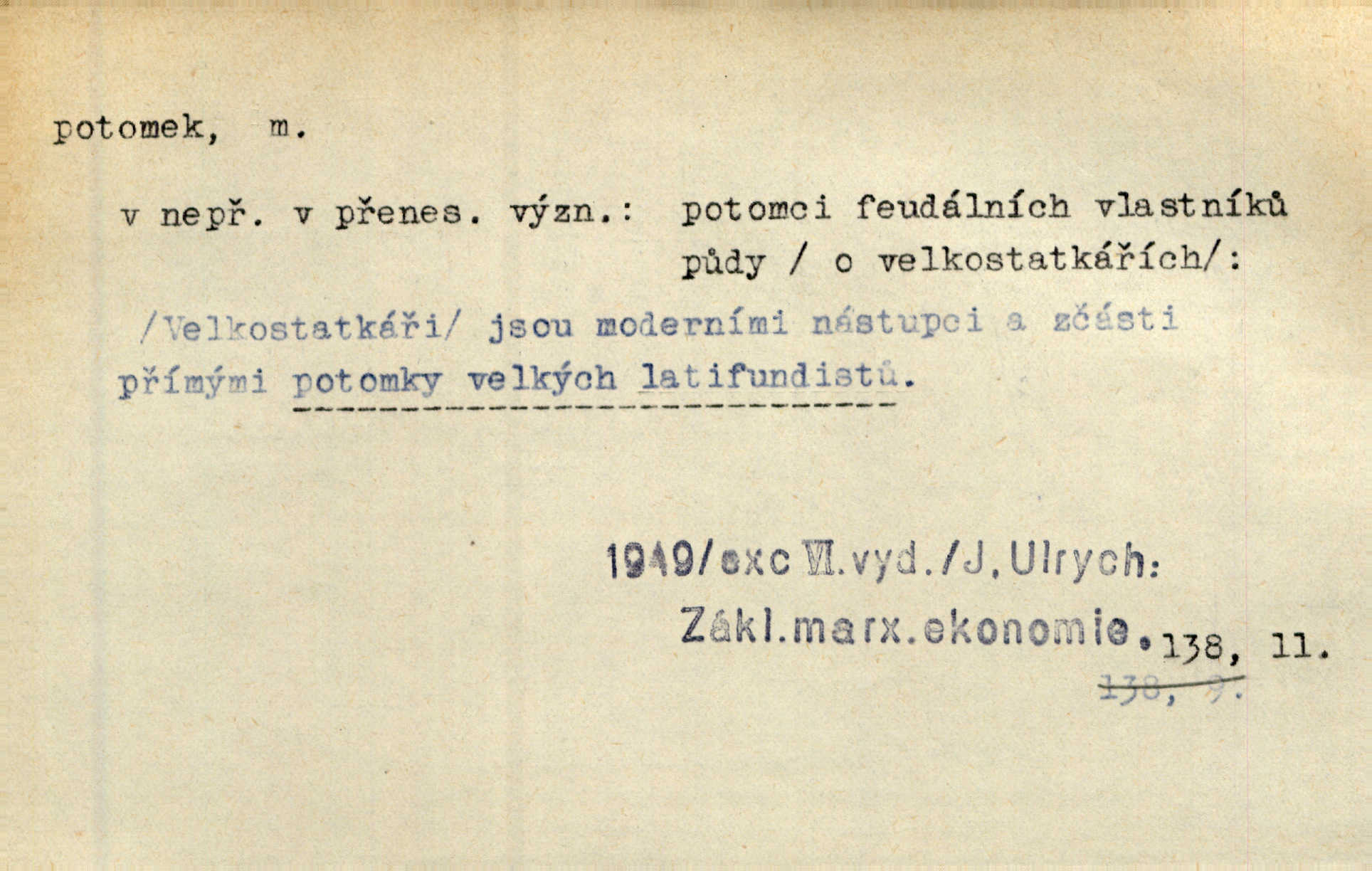 - potomek, -mka m. kdo z někoho přímo n. nepřímo pochází, syn, vnuk atd. Všichni vespolek mají sobě pomáhati, čeho předkové začali, aby potomci jejich dokonali. Tomek. Poslední potomek starého rodu po meči náhle skončil svůj život. Hlad. „A není žádných dědicův?“ „Ani potomkův ani příbuzných.“ Jir. Ve voze je paní s nejmladším svým potomkem na klíně. Prav. Přen. Učiněn pokus, zdali by nebylo možno dopátrati se přímých potomkův oněch keřů, jichž vlastnosti byly tak vynikající. Her. D člen pozdější generace. Klar dobyl si lidumilým působením vděčného uznání souvěkých a památky u potomkův. Zel. Co se mne týče, hlasuju pro a tvrdím, že je to jediná cesta, kterou může potomek Husův nastoupit. Kop. Bratří Čeští, potomci Husovi, od cizincův po celé století nazýváni byli „bratřími Valdenskými“. Pal. Romantism, svým původem buržoasní a revoluční, zplodí radikální subjektivism symbolistů, estétů, Baudelaira, Verlaina, Rimbauda a potomků. Šal.