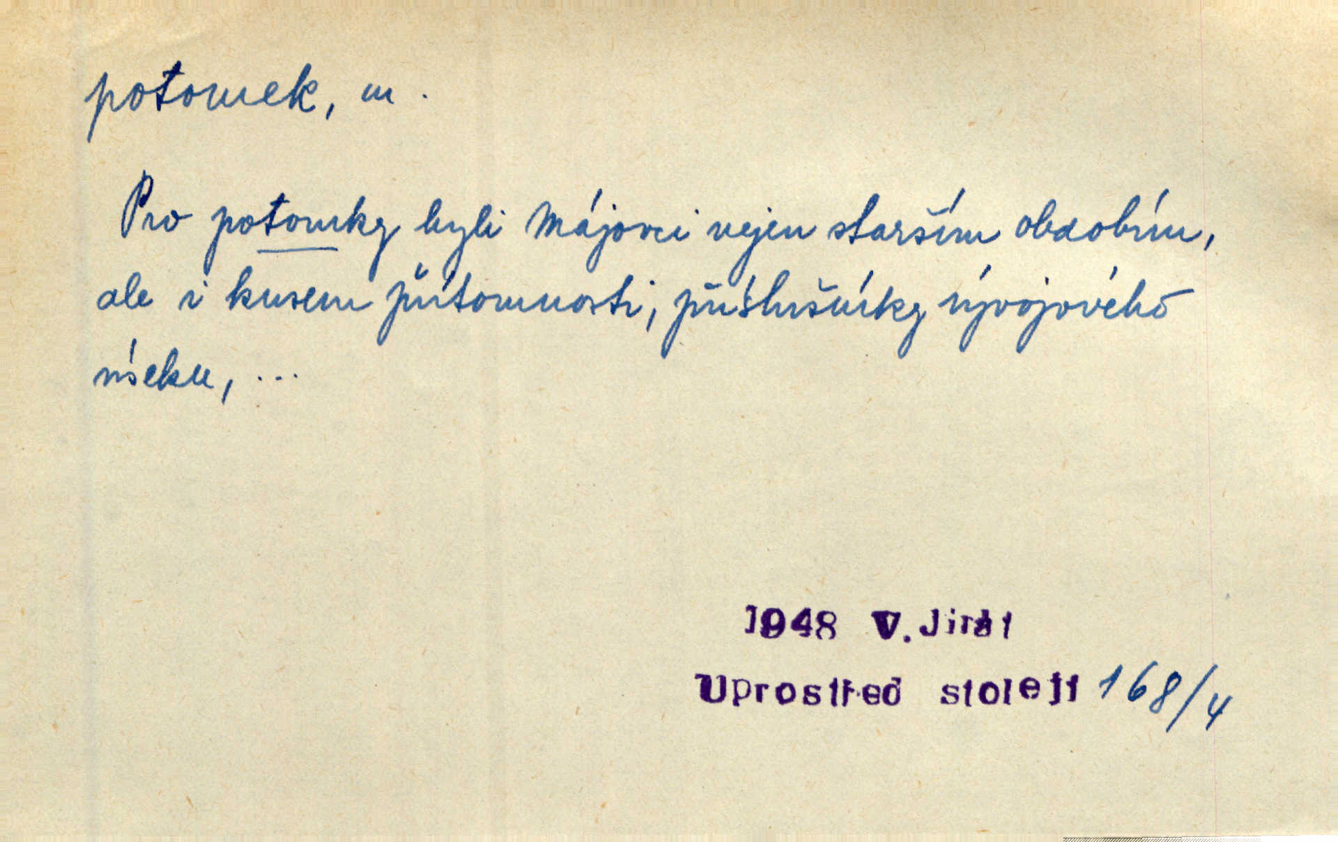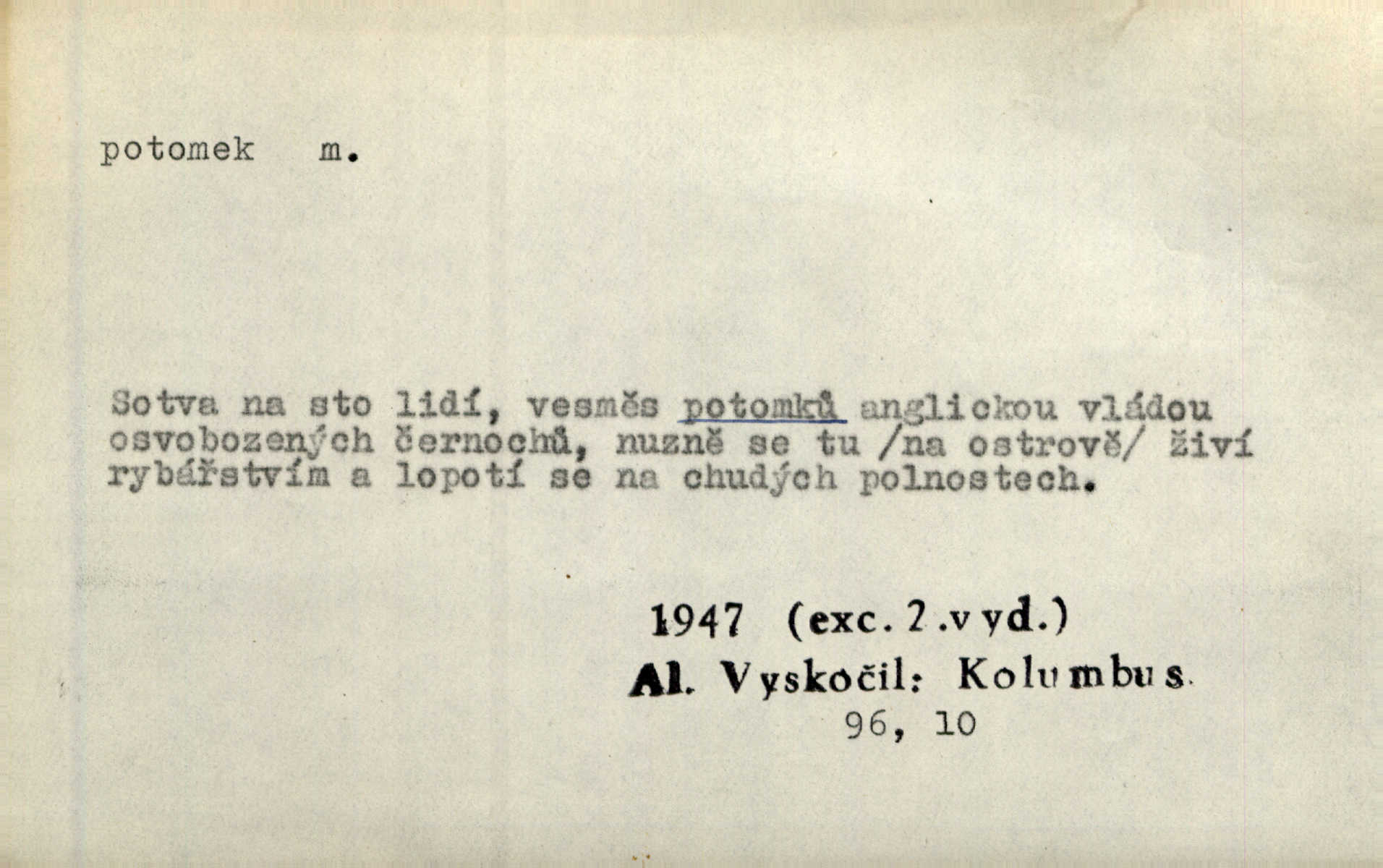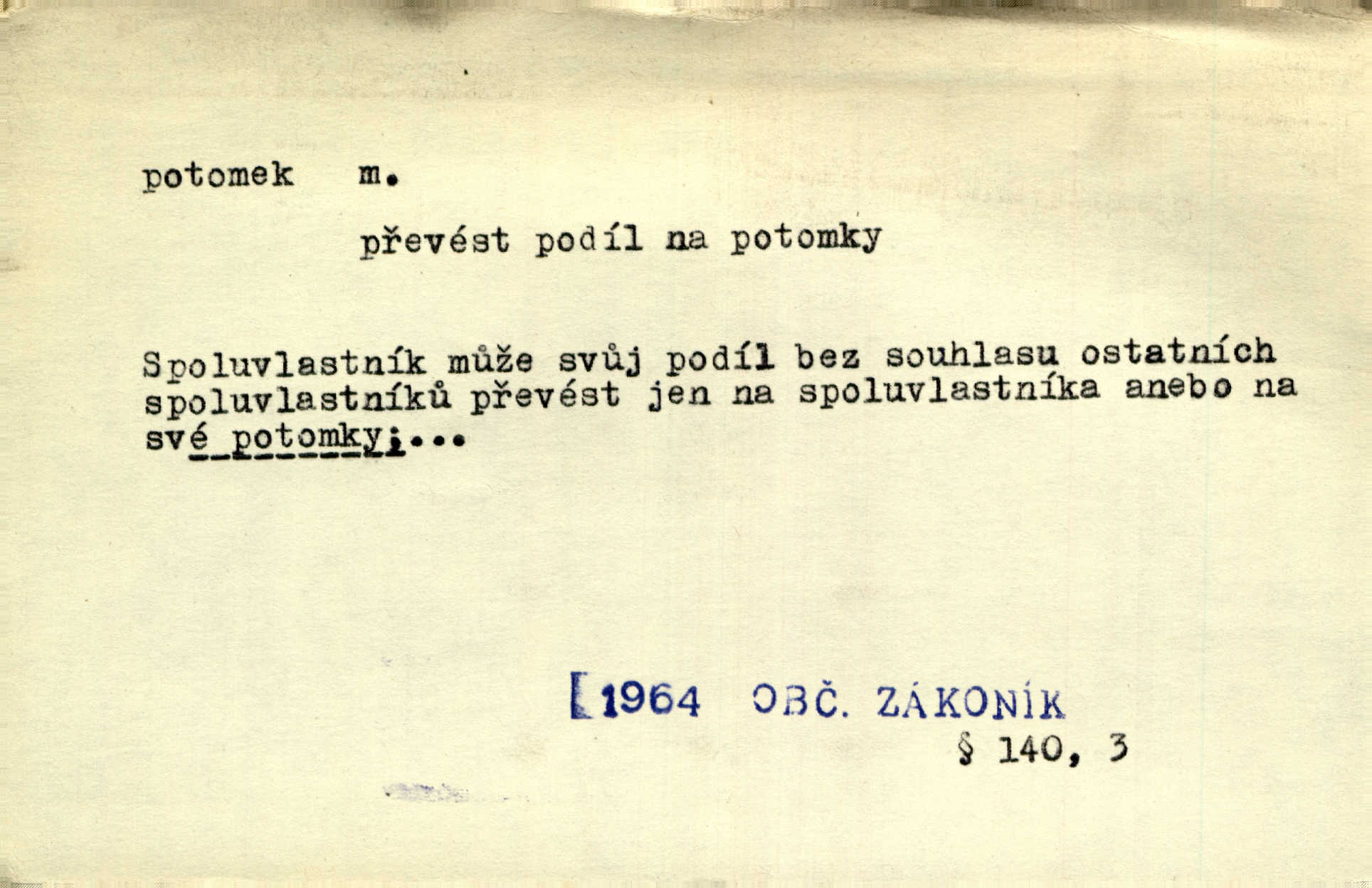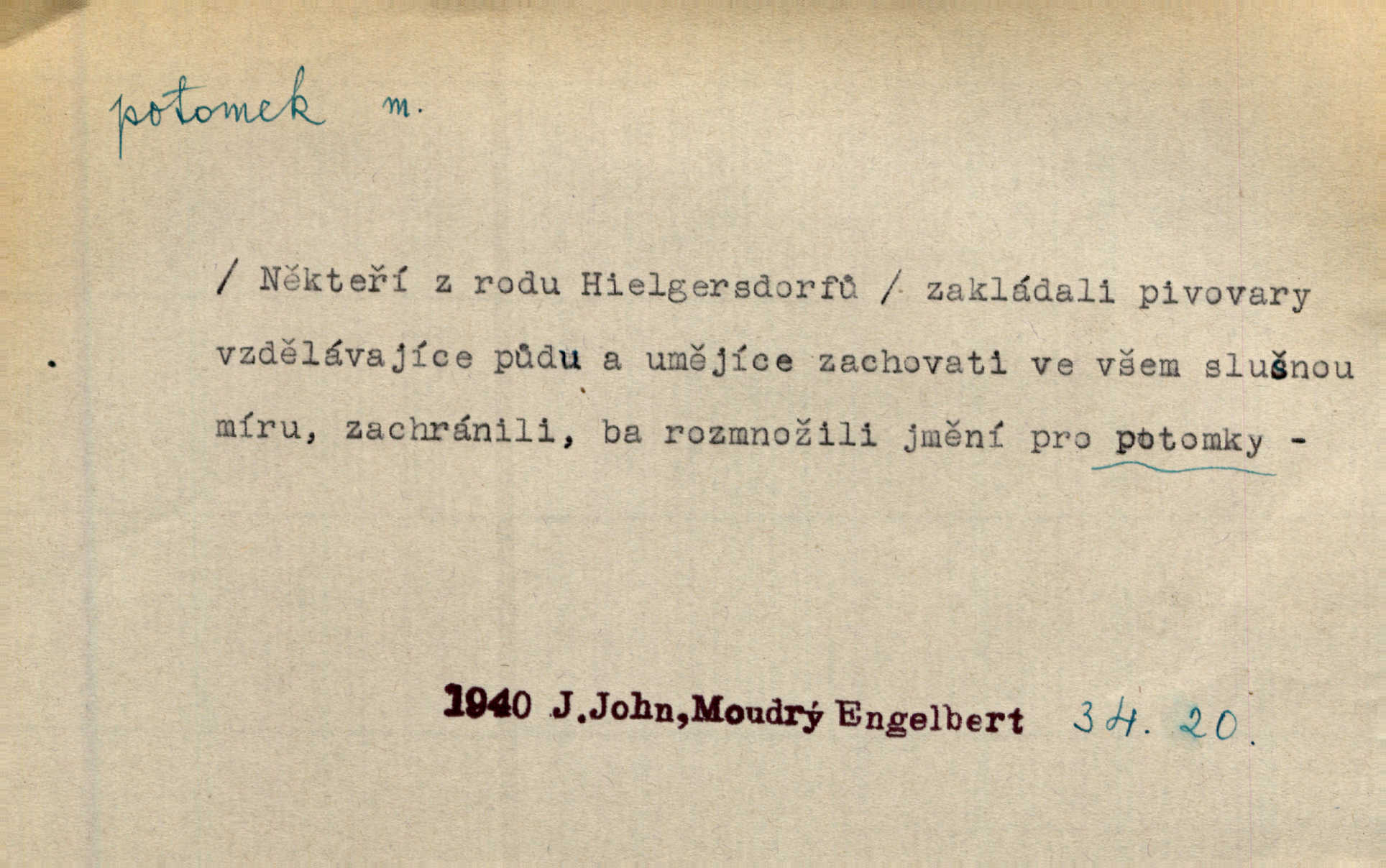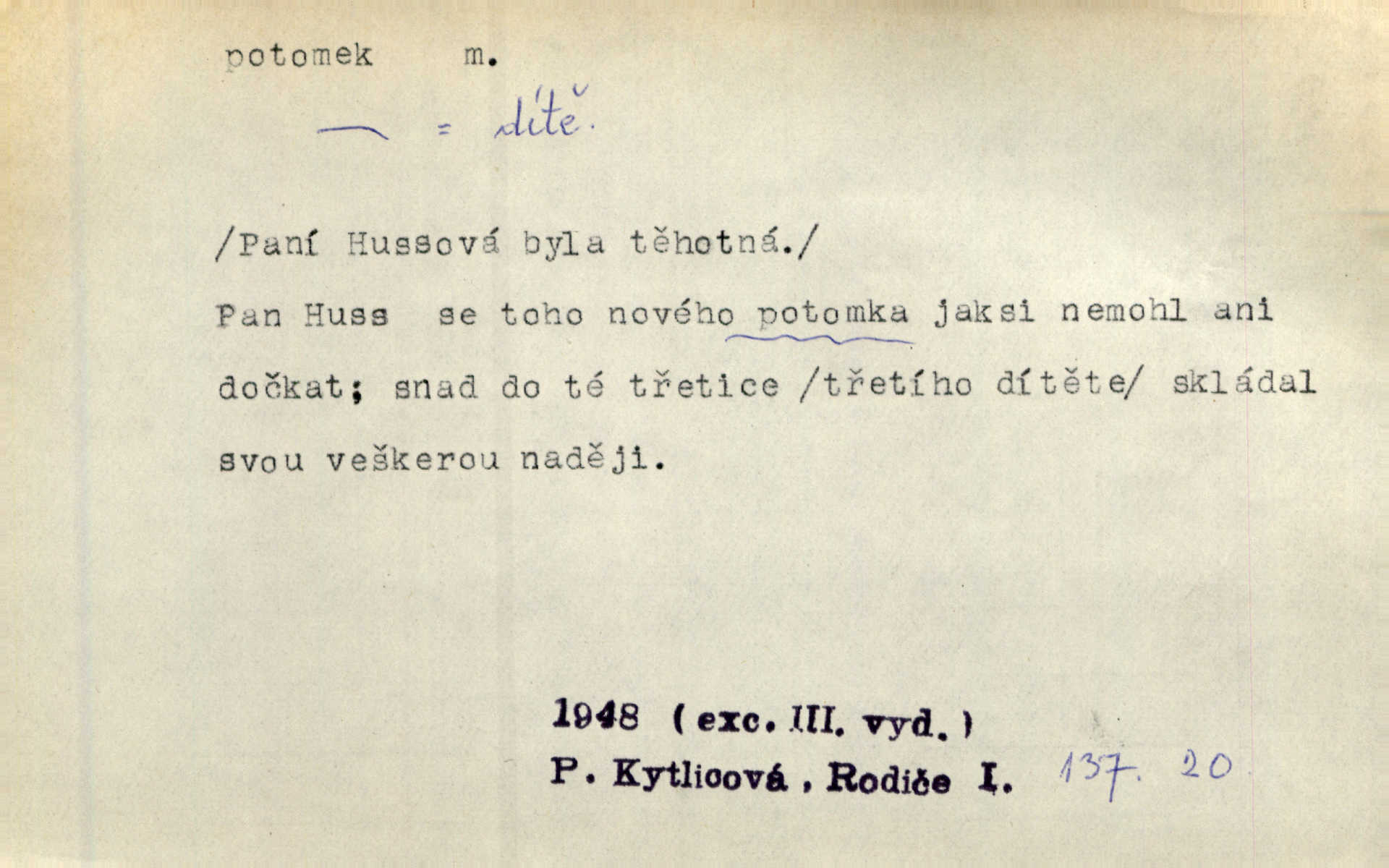 - potomek, -mka m. kdo z někoho přímo n. nepřímo pochází, syn, vnuk atd. Všichni vespolek mají sobě pomáhati, čeho předkové začali, aby potomci jejich dokonali. Tomek. Poslední potomek starého rodu po meči náhle skončil svůj život. Hlad. „A není žádných dědicův?“ „Ani potomkův ani příbuzných.“ Jir. Ve voze je paní s nejmladším svým potomkem na klíně. Prav. Přen. Učiněn pokus, zdali by nebylo možno dopátrati se přímých potomkův oněch keřů, jichž vlastnosti byly tak vynikající. Her. D člen pozdější generace. Klar dobyl si lidumilým působením vděčného uznání souvěkých a památky u potomkův. Zel. Co se mne týče, hlasuju pro a tvrdím, že je to jediná cesta, kterou může potomek Husův nastoupit. Kop. Bratří Čeští, potomci Husovi, od cizincův po celé století nazýváni byli „bratřími Valdenskými“. Pal. Romantism, svým původem buržoasní a revoluční, zplodí radikální subjektivism symbolistů, estétů, Baudelaira, Verlaina, Rimbauda a potomků. Šal.